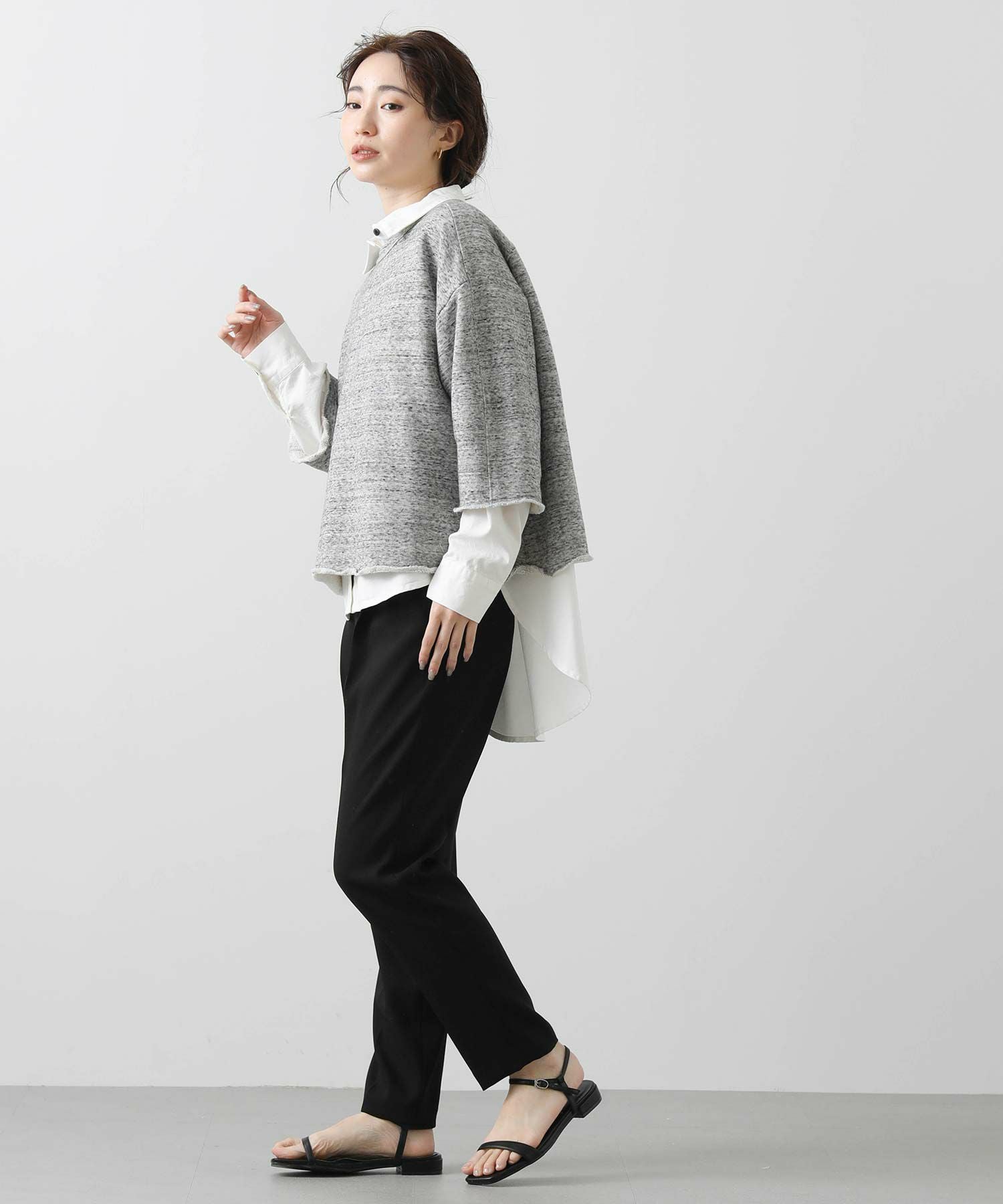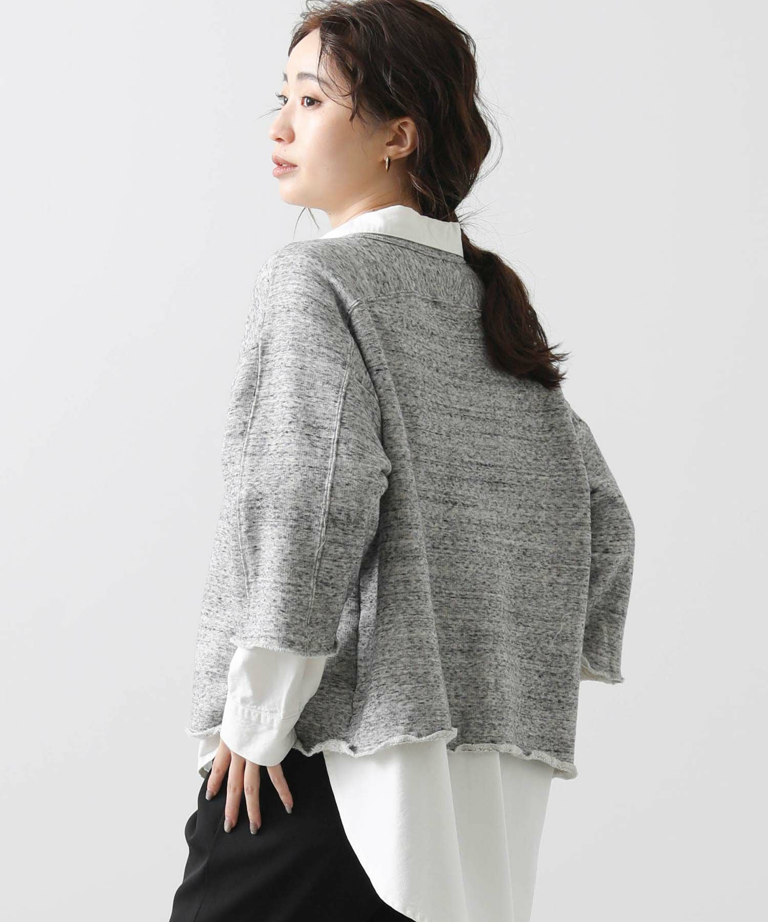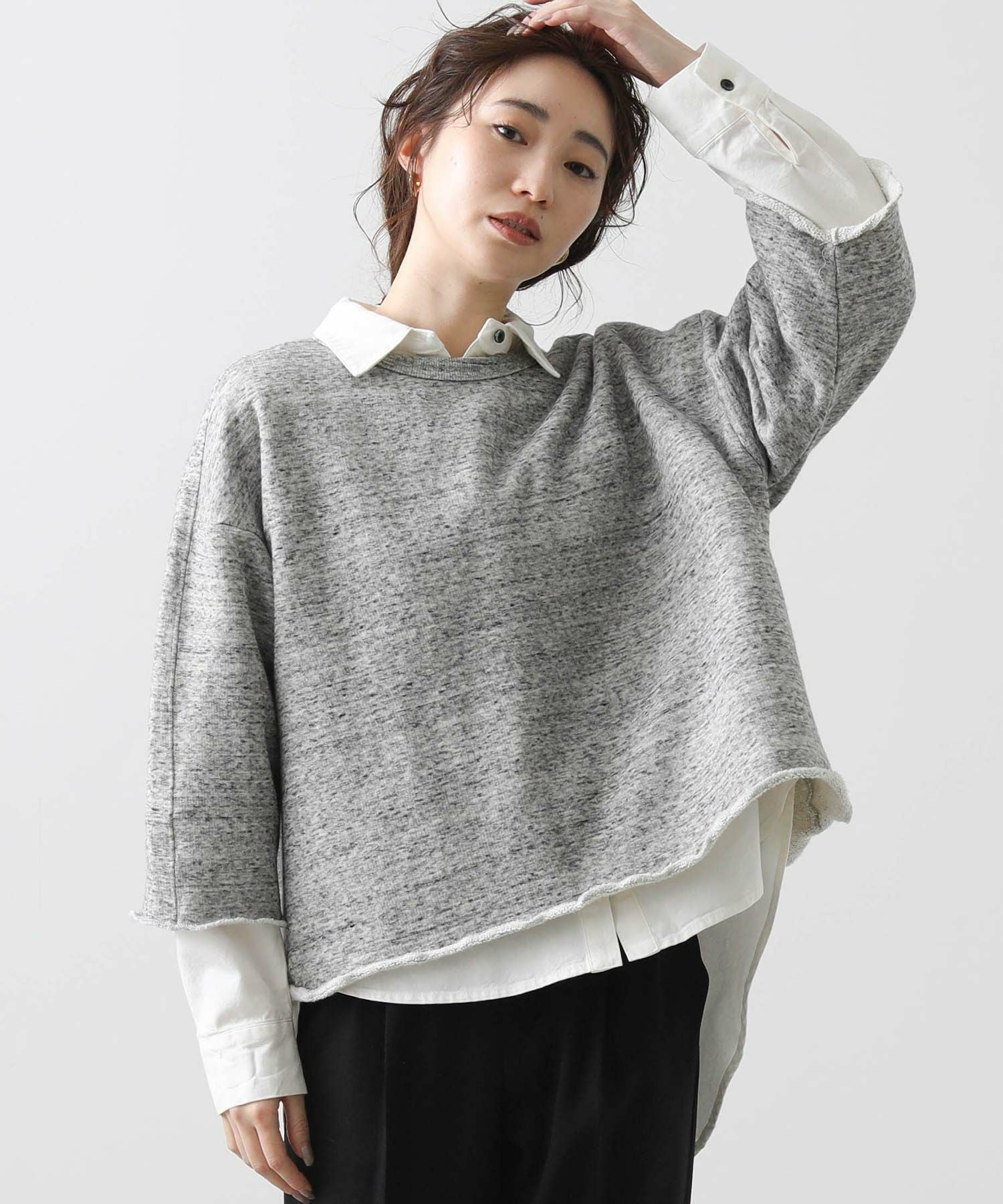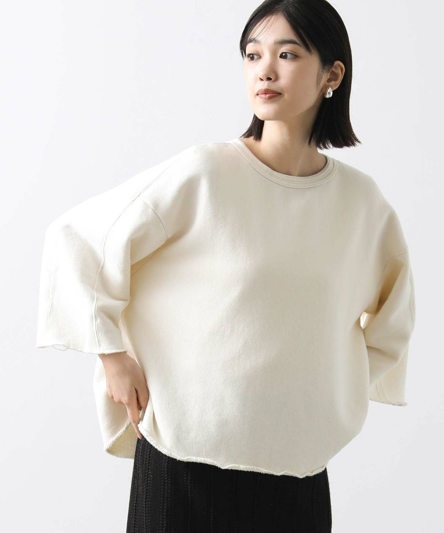 リヨセル・コットンの粗挽き杢を表面に使用した裏毛を使用。ざっくり感のあるワイドスウェットです。