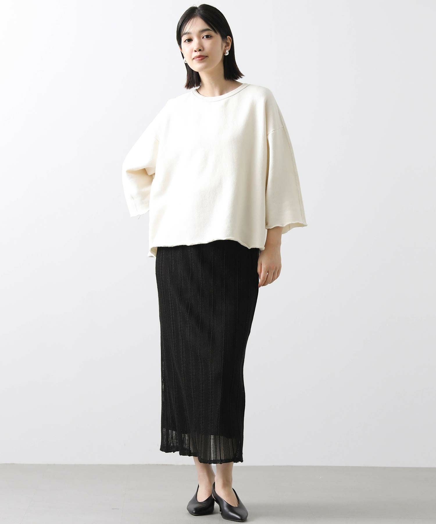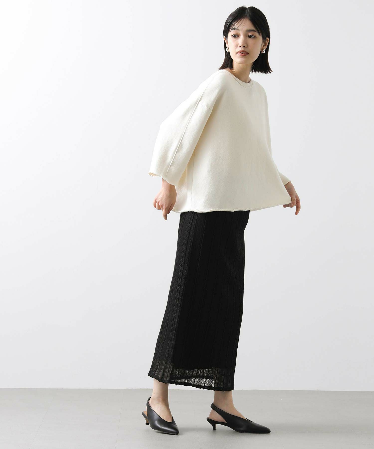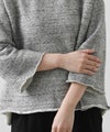 リヨセルらしい糸の持つ膨らみや柔らかさが活きるよう、比較的ローゲージで編み立てています。ボリュームボトムも、インナー裾だしもバランスの取りやすいコンパクトな着丈です。