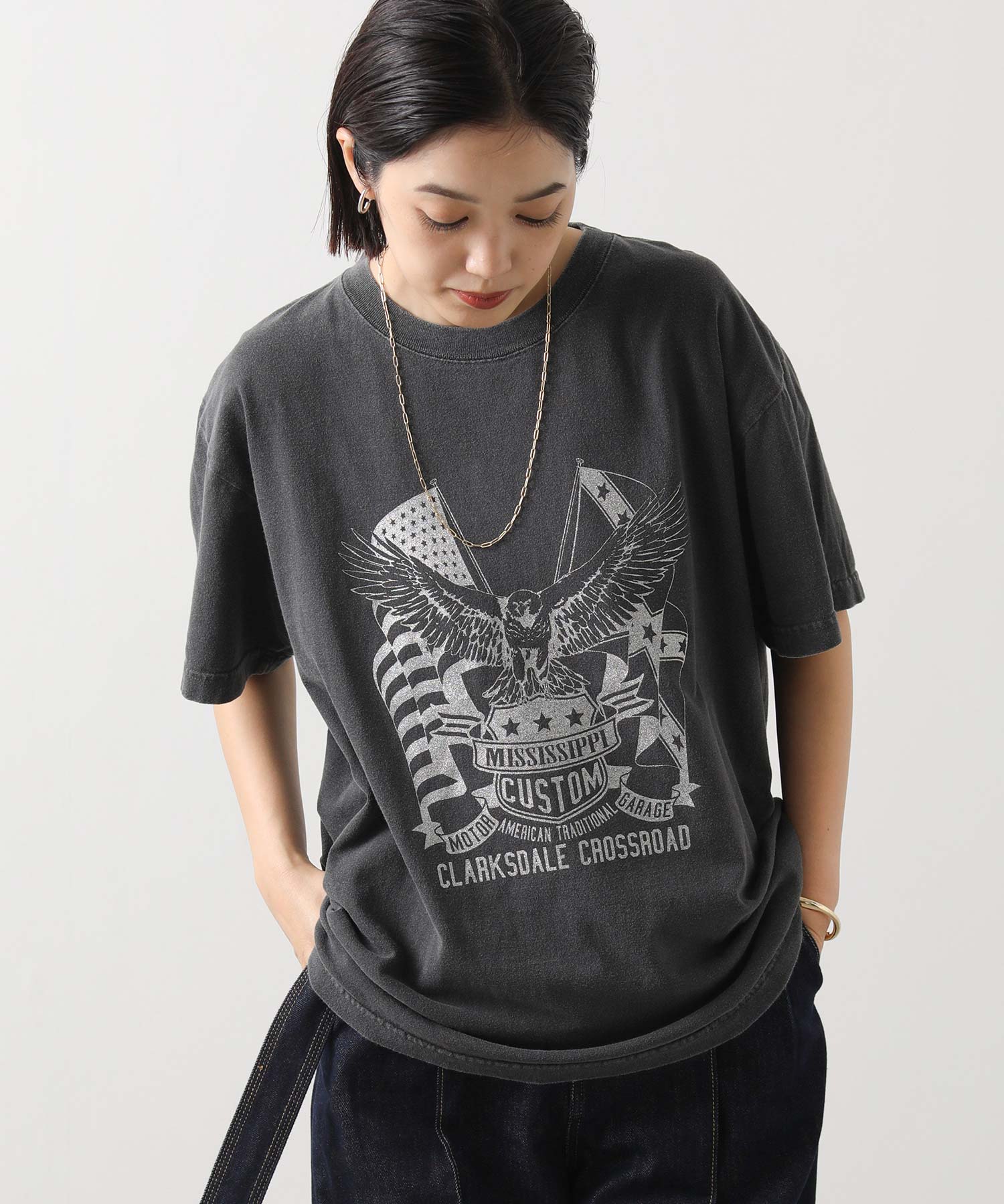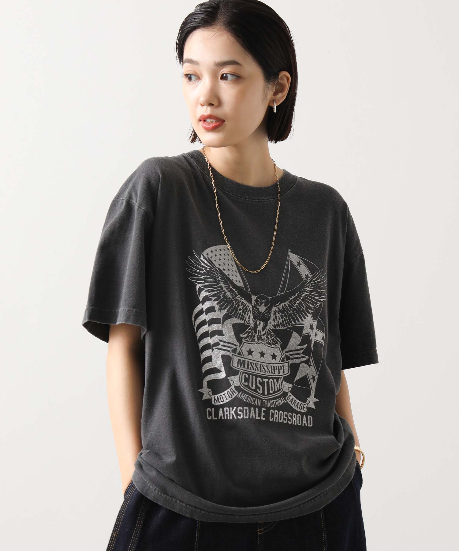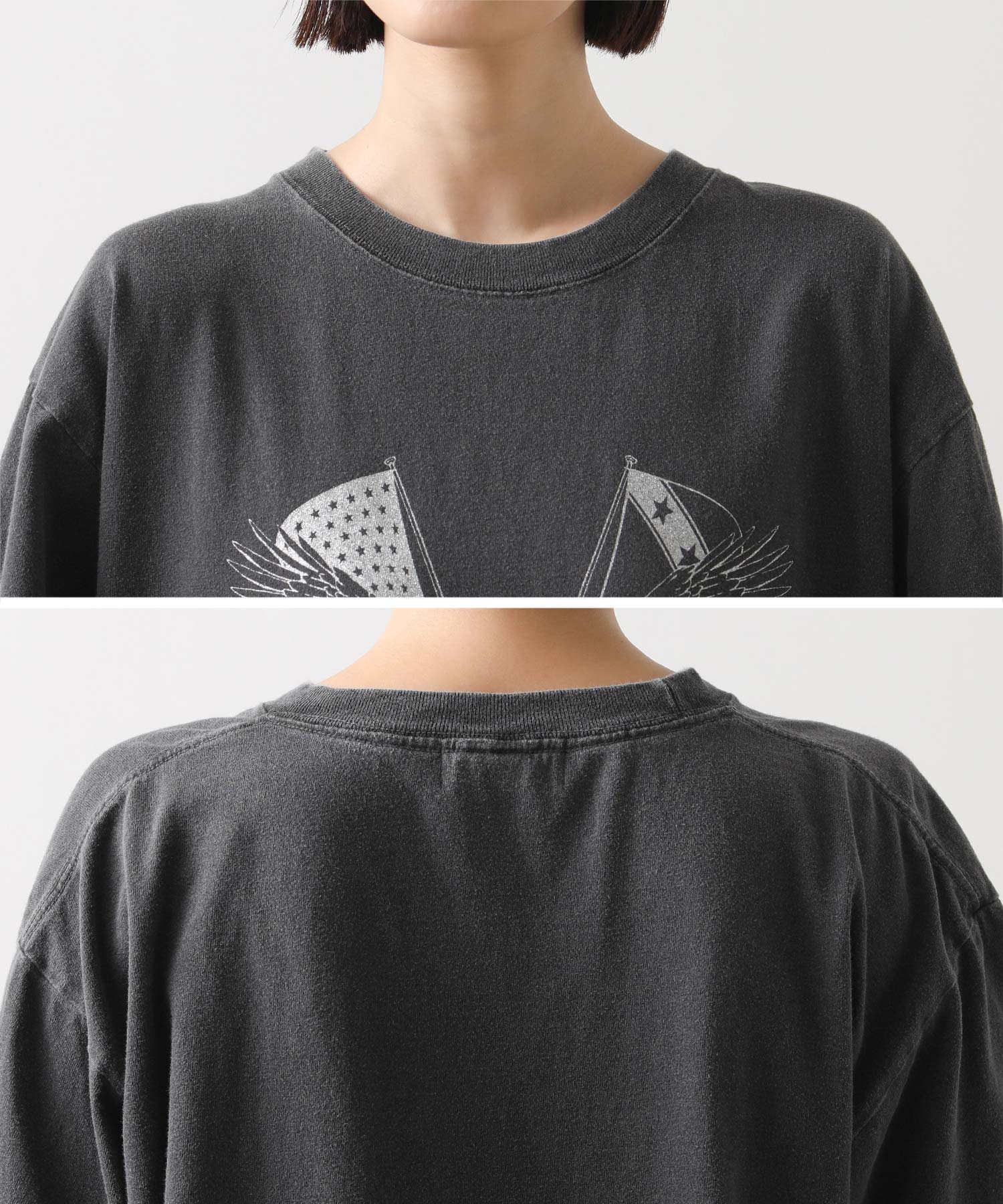 大胆なイーグルプリントがコーデのアクセントに。グリッタープリントを用いて、上品かつ華やかな印象に仕上げています。