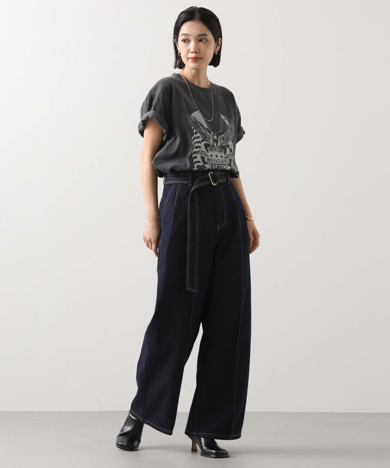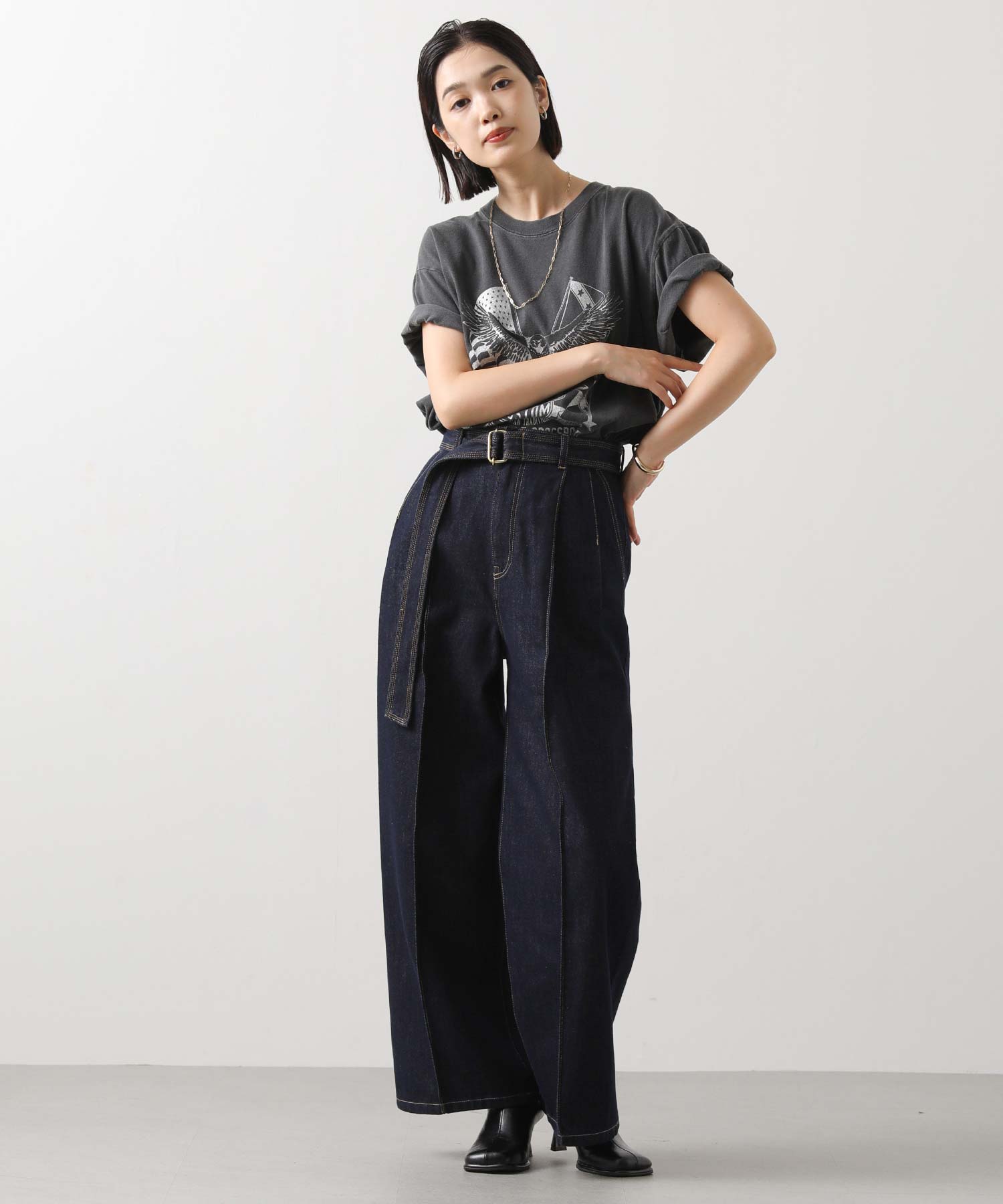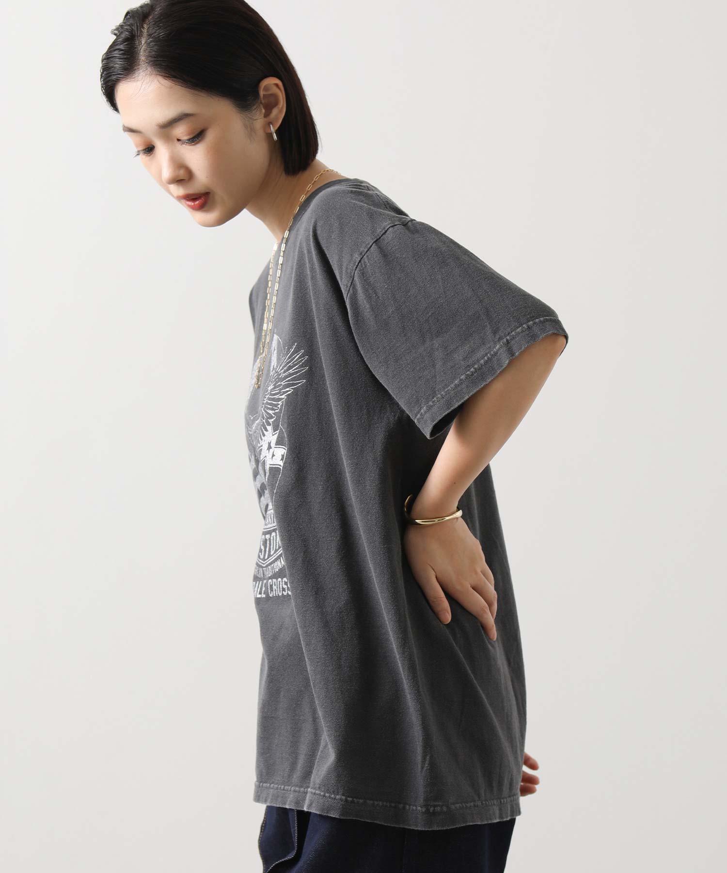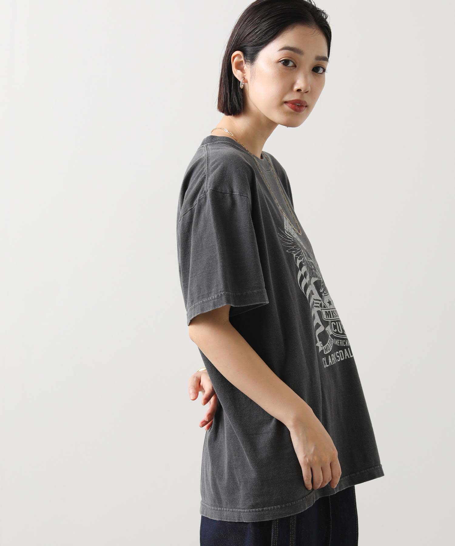 大胆なイーグルプリントがコーデのアクセントに。グリッタープリントを用いて、上品かつ華やかな印象に仕上げています。