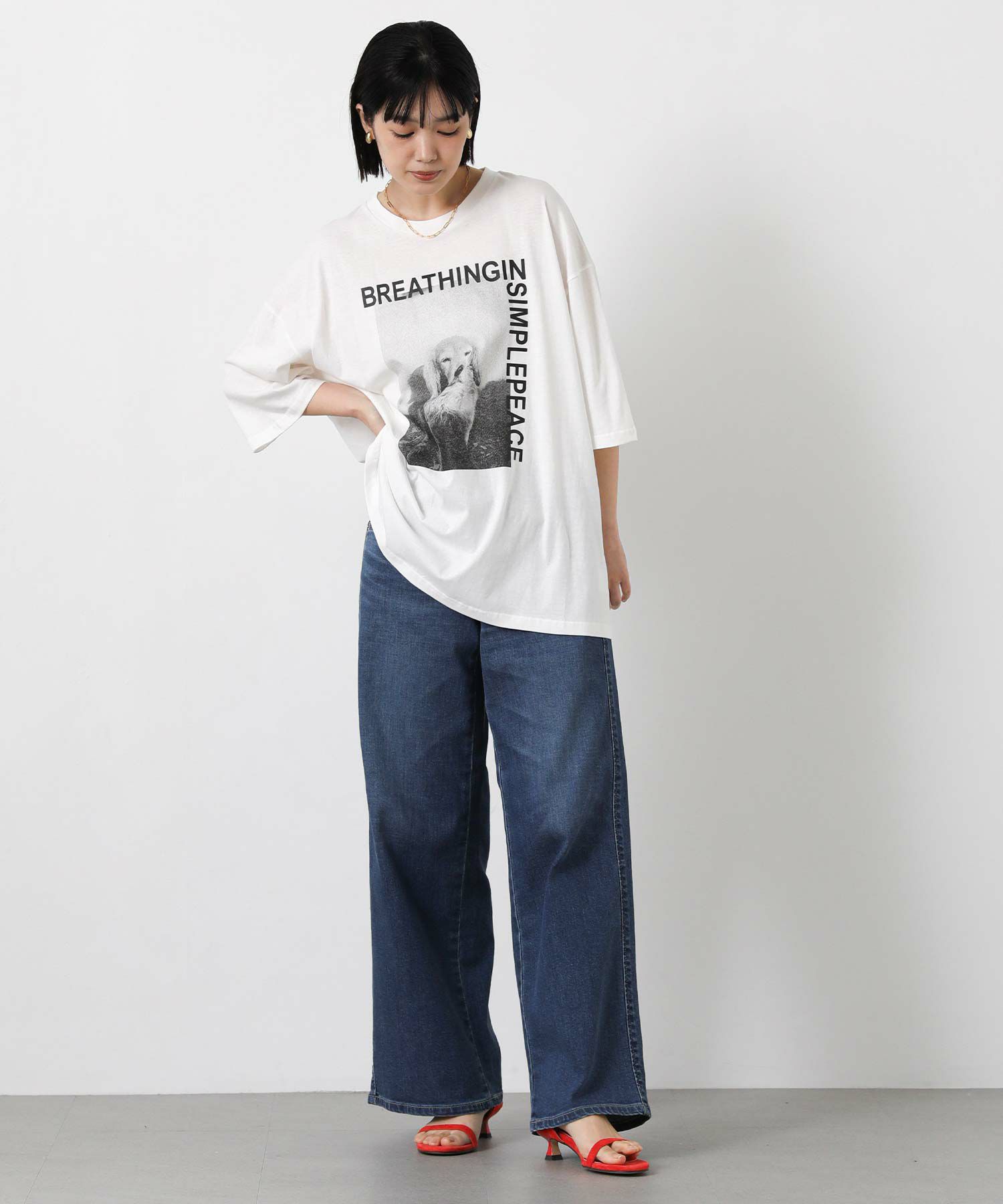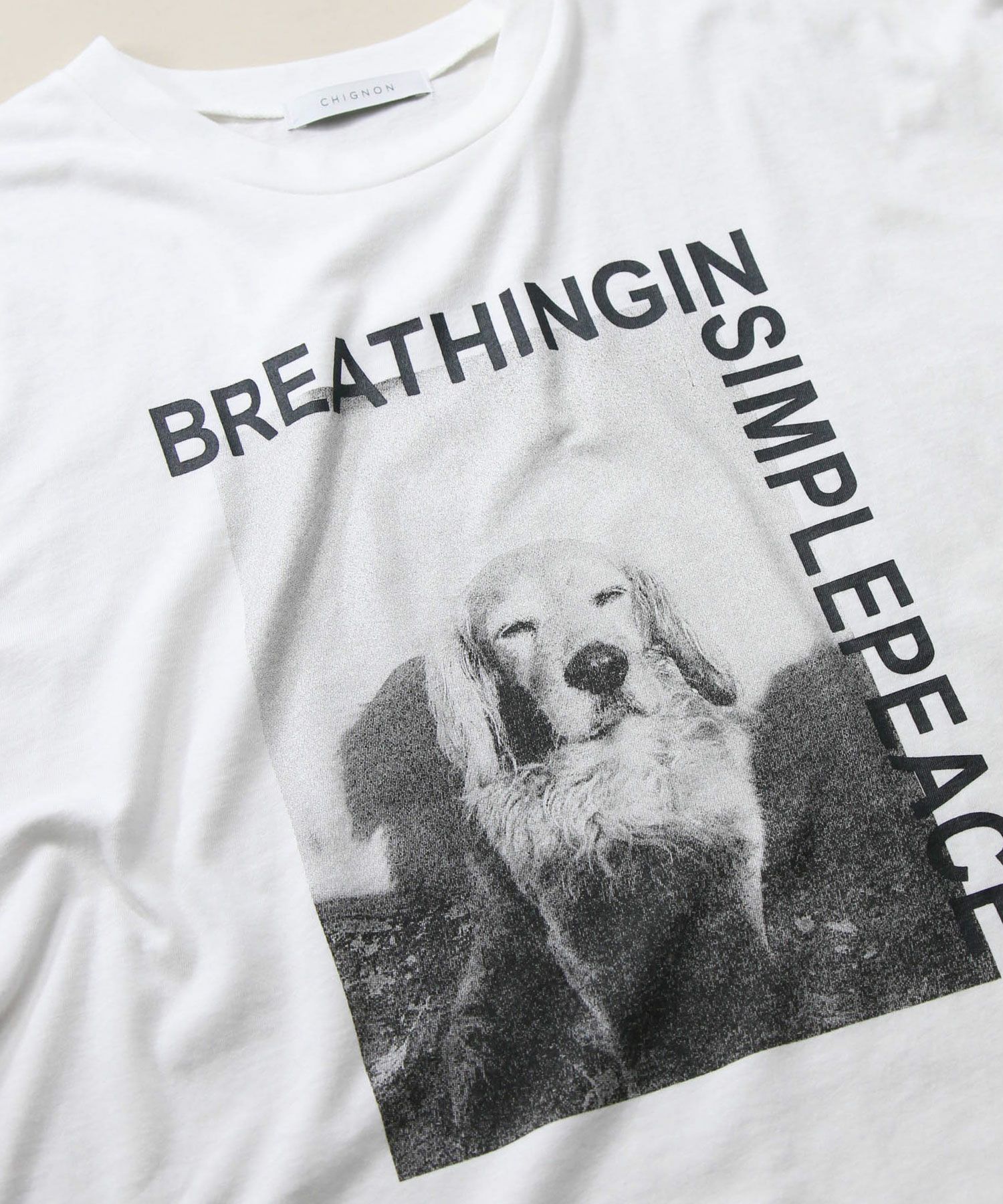 「BREATHINGINSIMPLEPEACE(穏かな平和を深く吸い込む)」というロゴと、愛くるしい犬のフォトプリントが特徴。