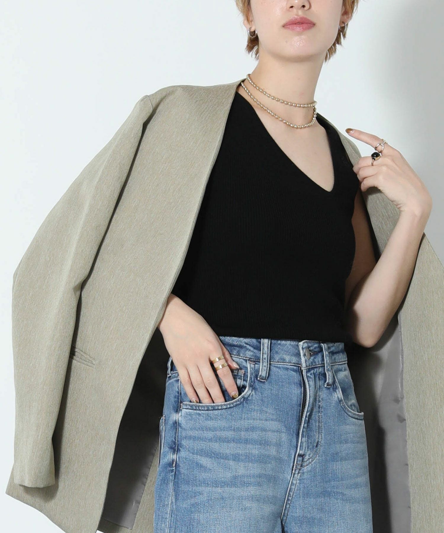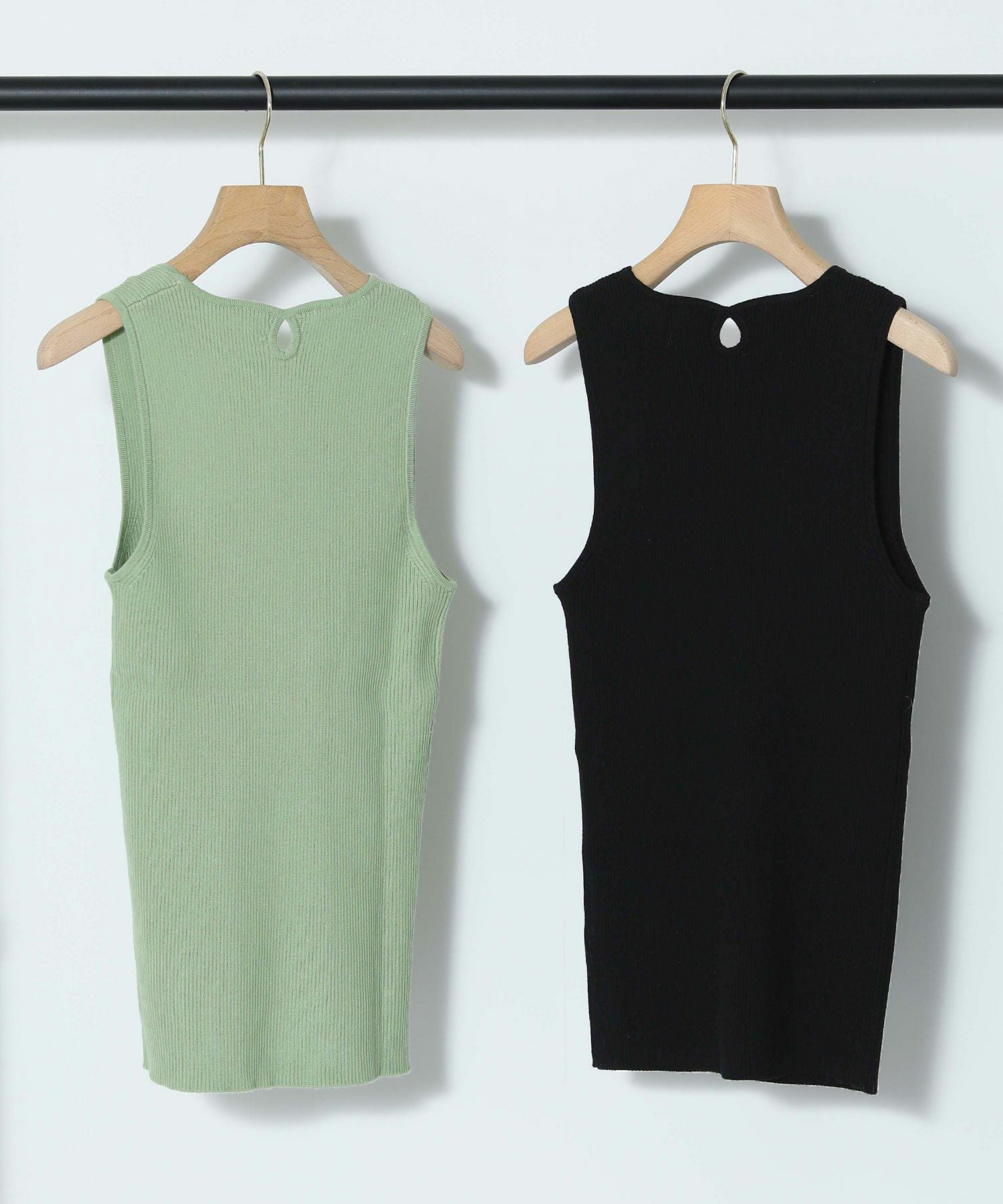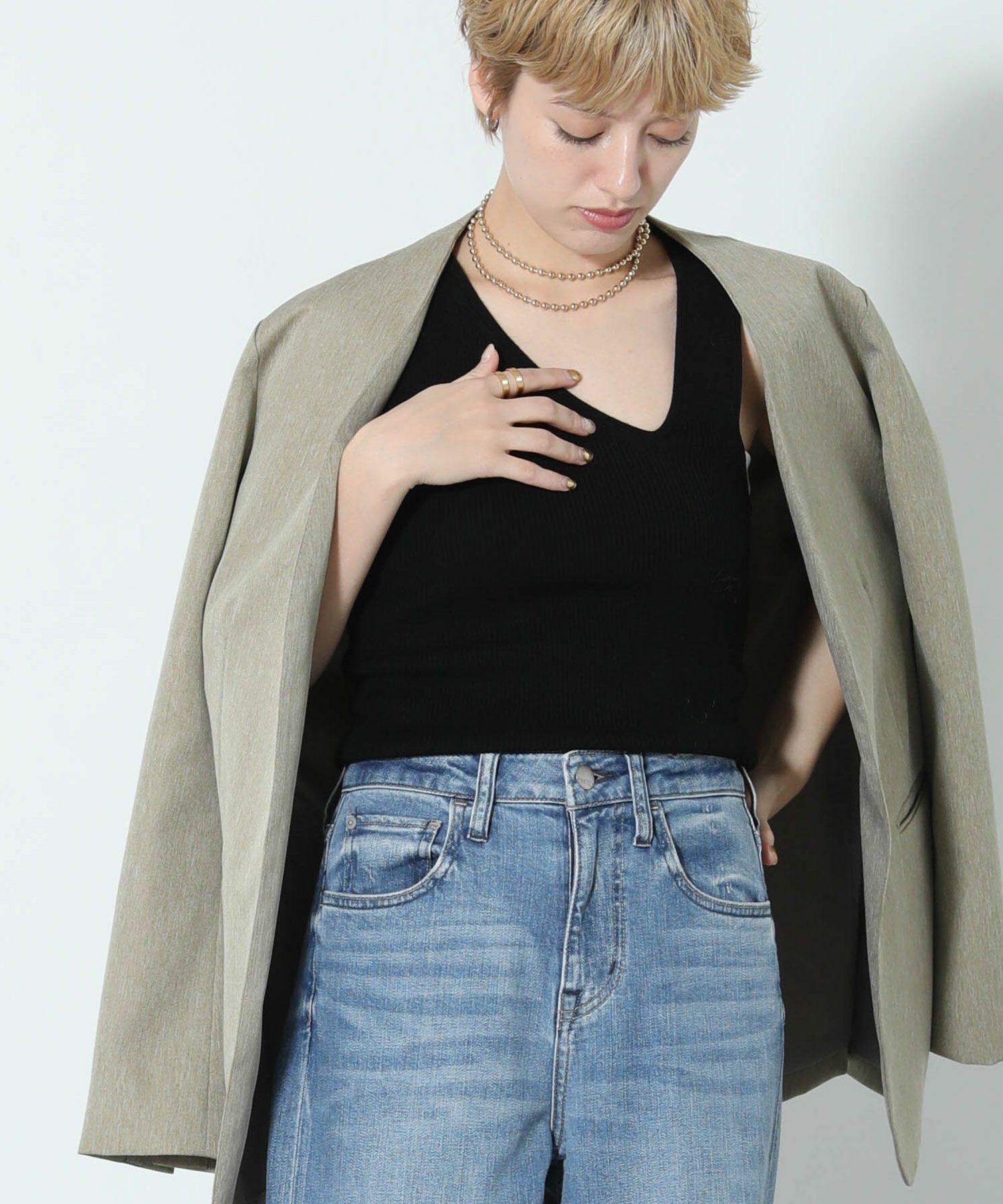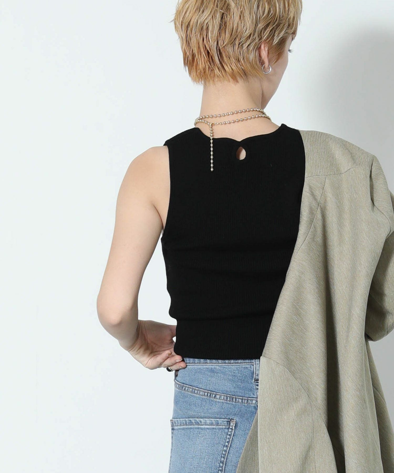 斜めにカッティングされたネックラインが印象的なタンクトップ。