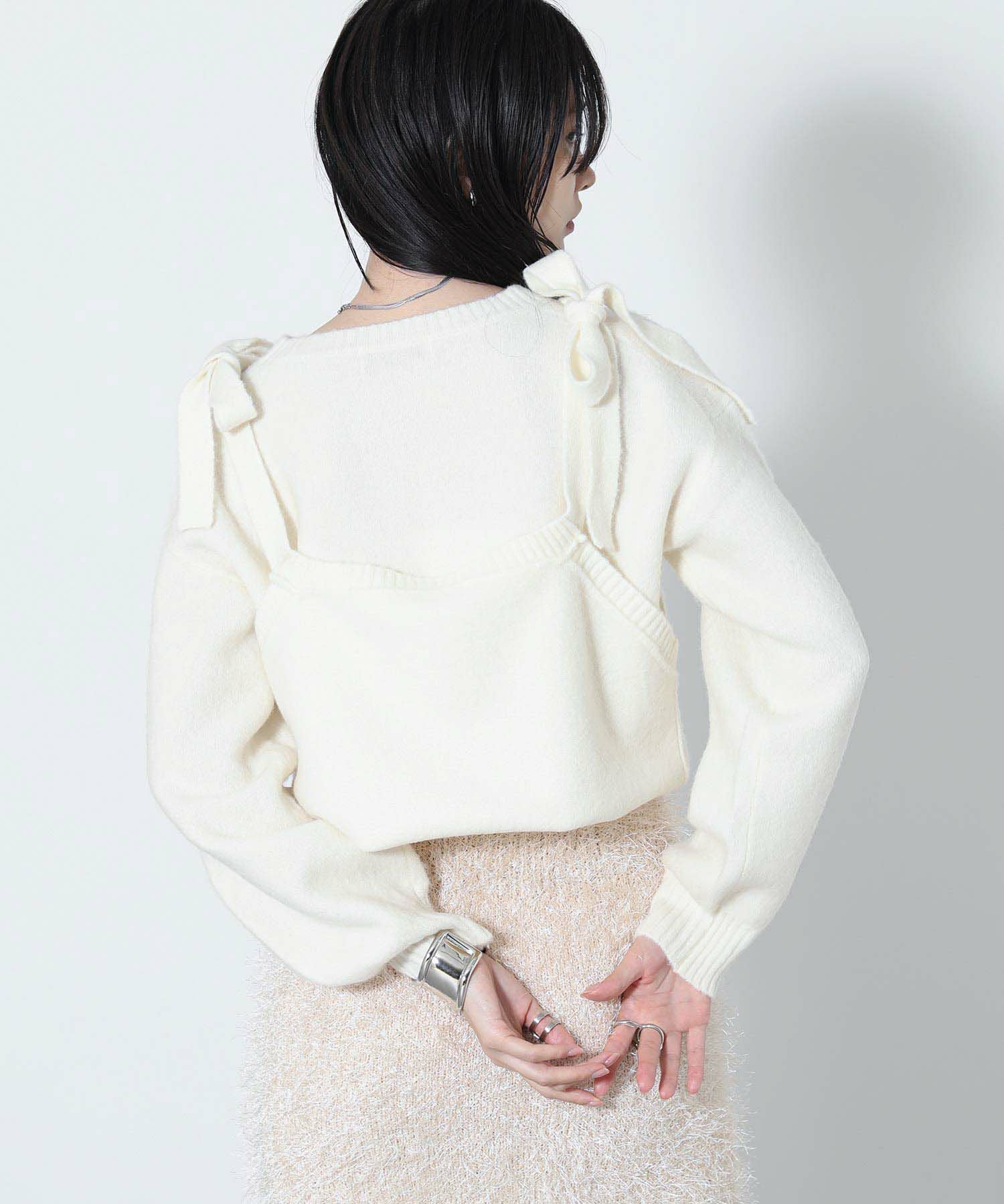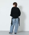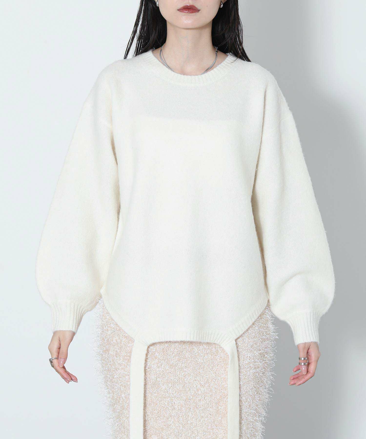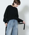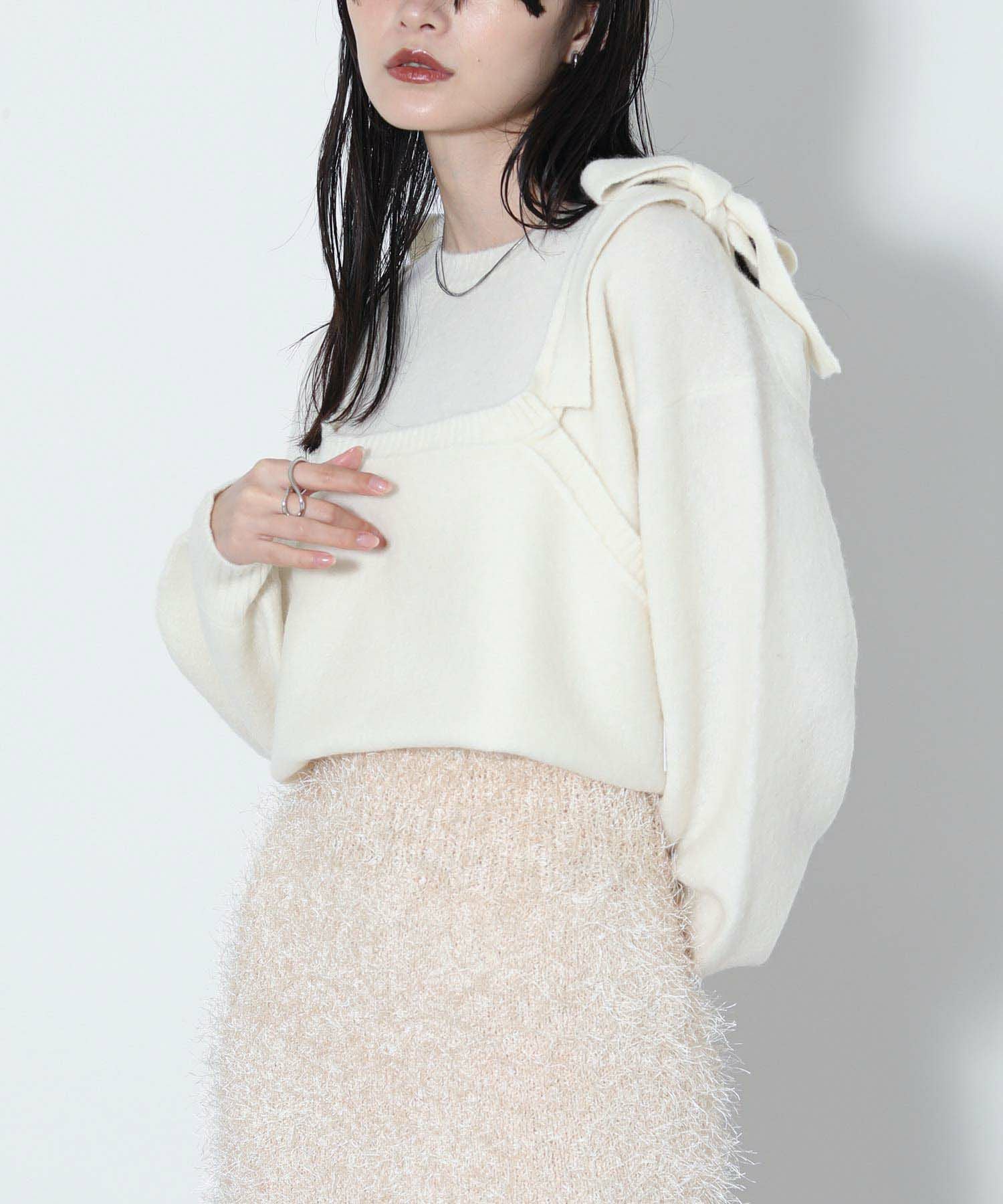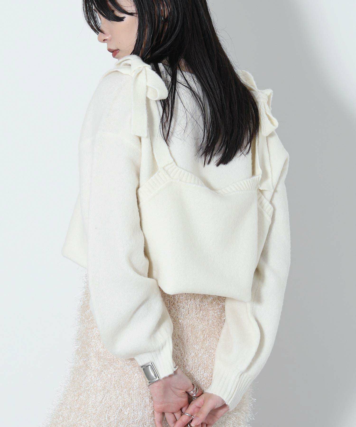 もっちりと弾力のあるストレッチの効いたウールブレンド糸を使用しています。ふんわりと空気を含んでいるためエアリーで軽く着心地も快適です。裾を折り返し、肩でリボンを結ぶとビスチェをレイヤードしたようなスタイルでも着用可能です。ニットならではのテクニックが光る一着です。
