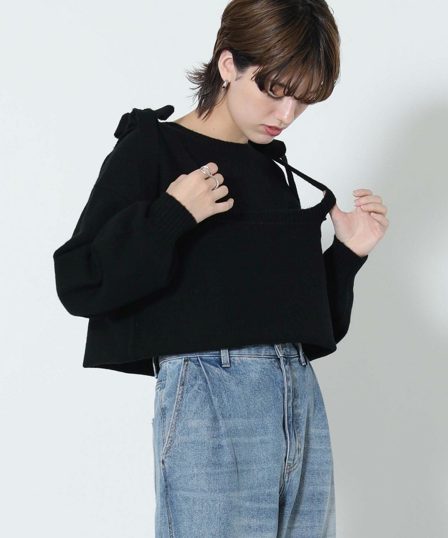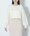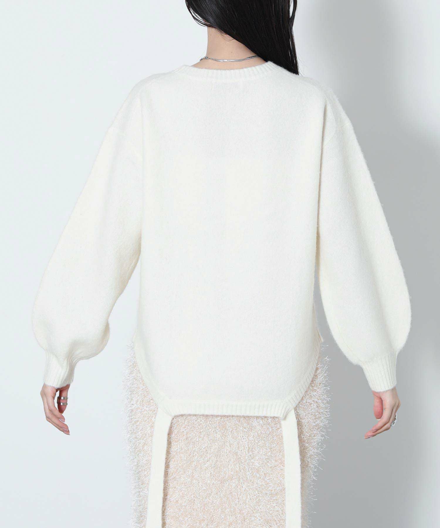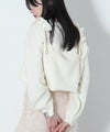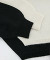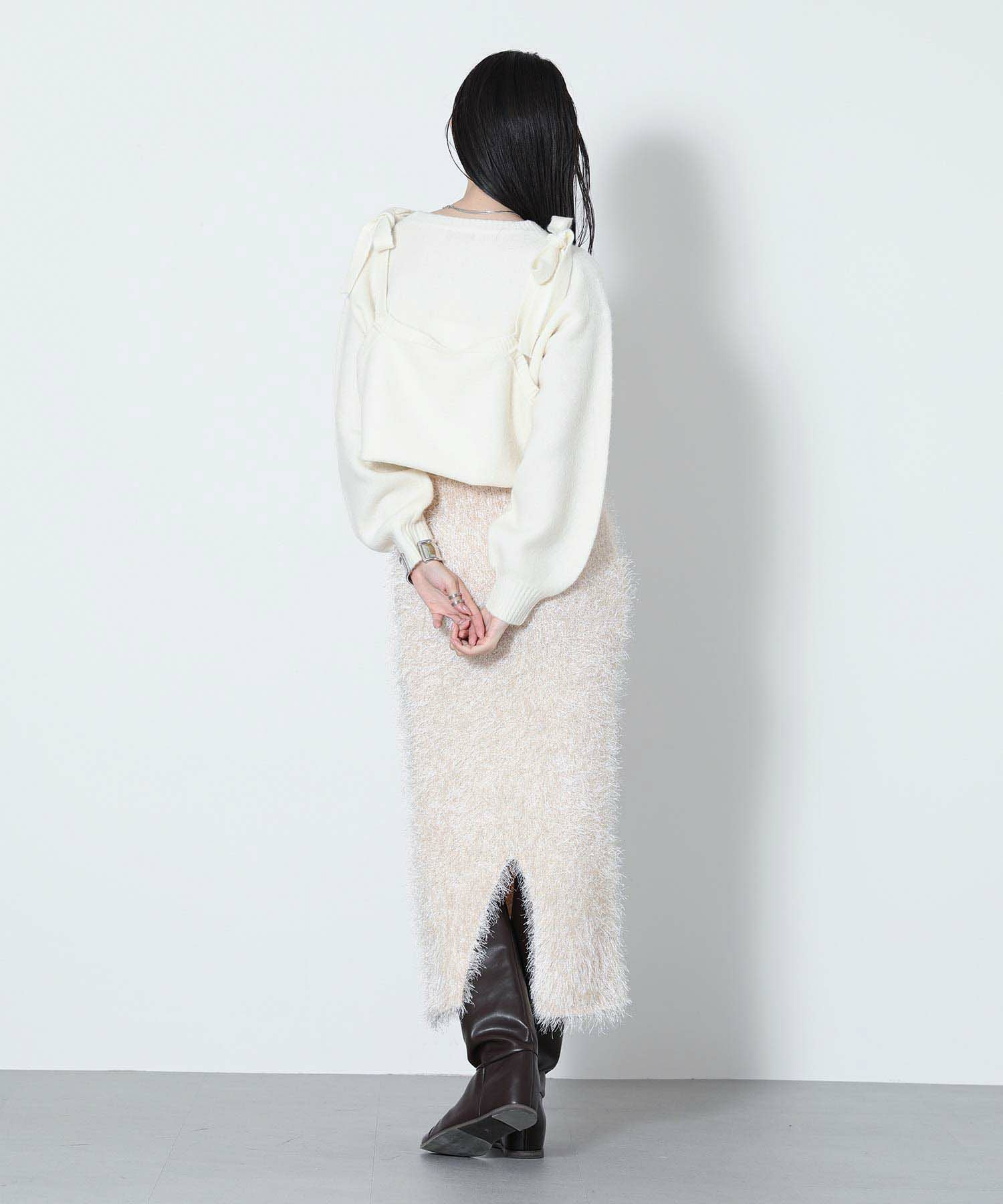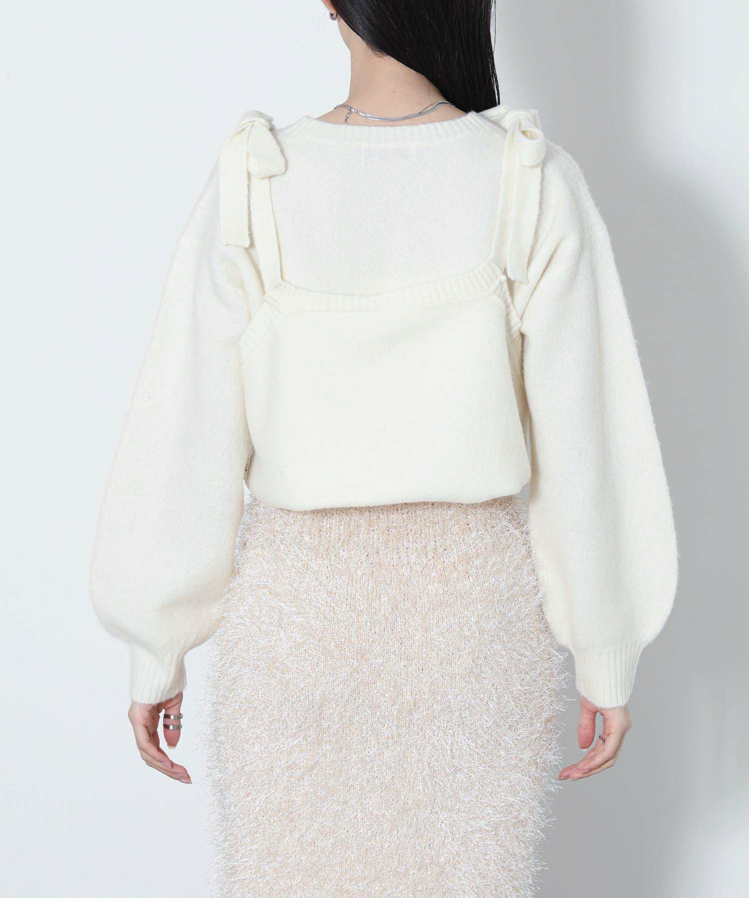 もっちりと弾力のあるストレッチの効いたウールブレンド糸を使用しています。ふんわりと空気を含んでいるためエアリーで軽く着心地も快適です。裾を折り返し、肩でリボンを結ぶとビスチェをレイヤードしたようなスタイルでも着用可能です。ニットならではのテクニックが光る一着です。