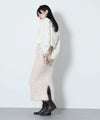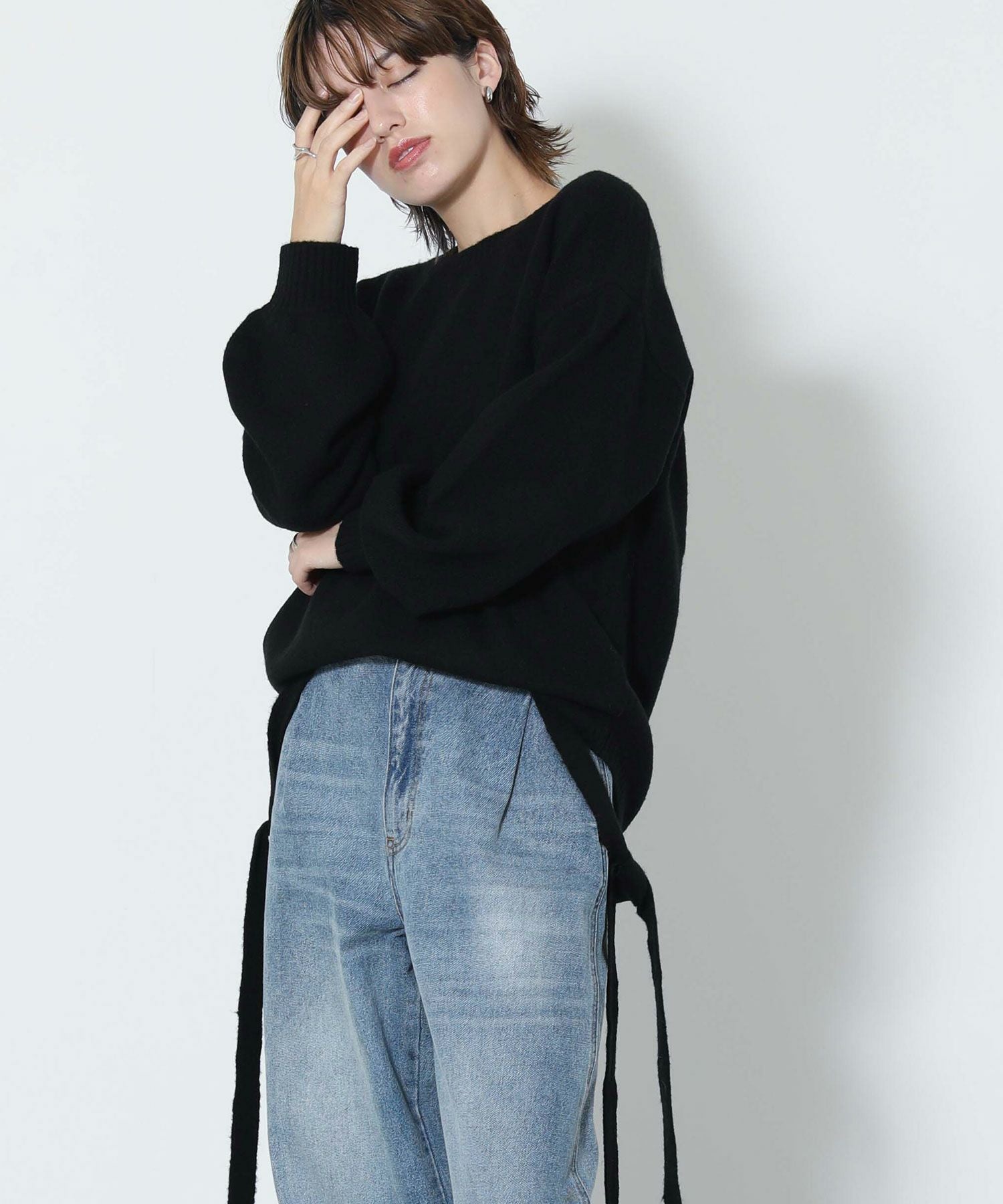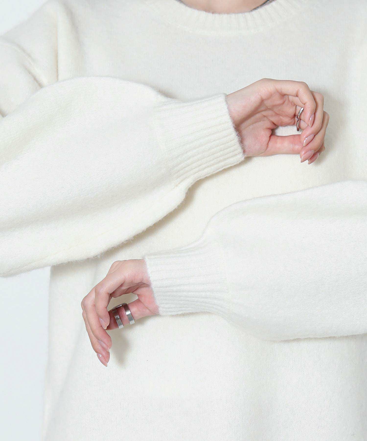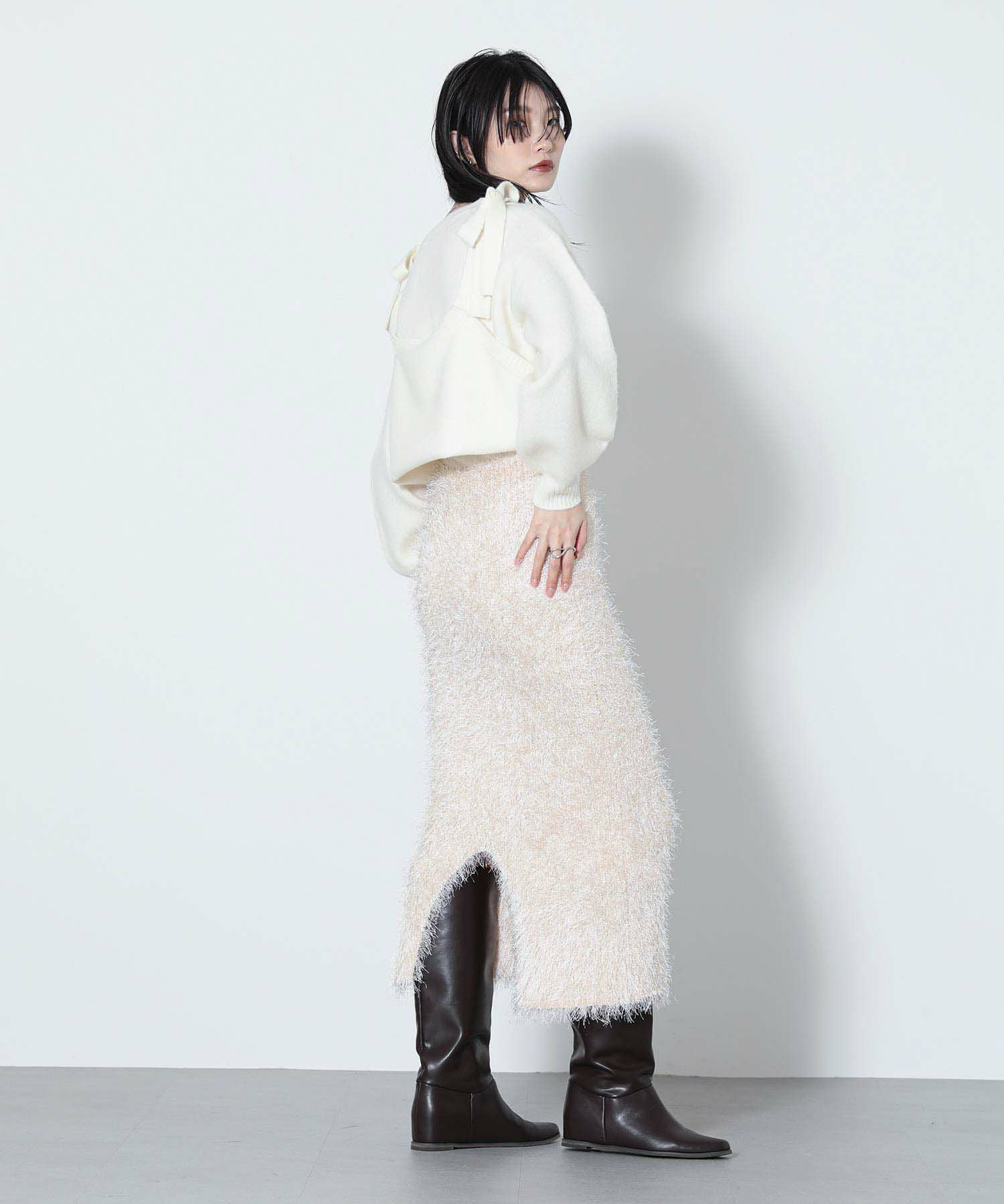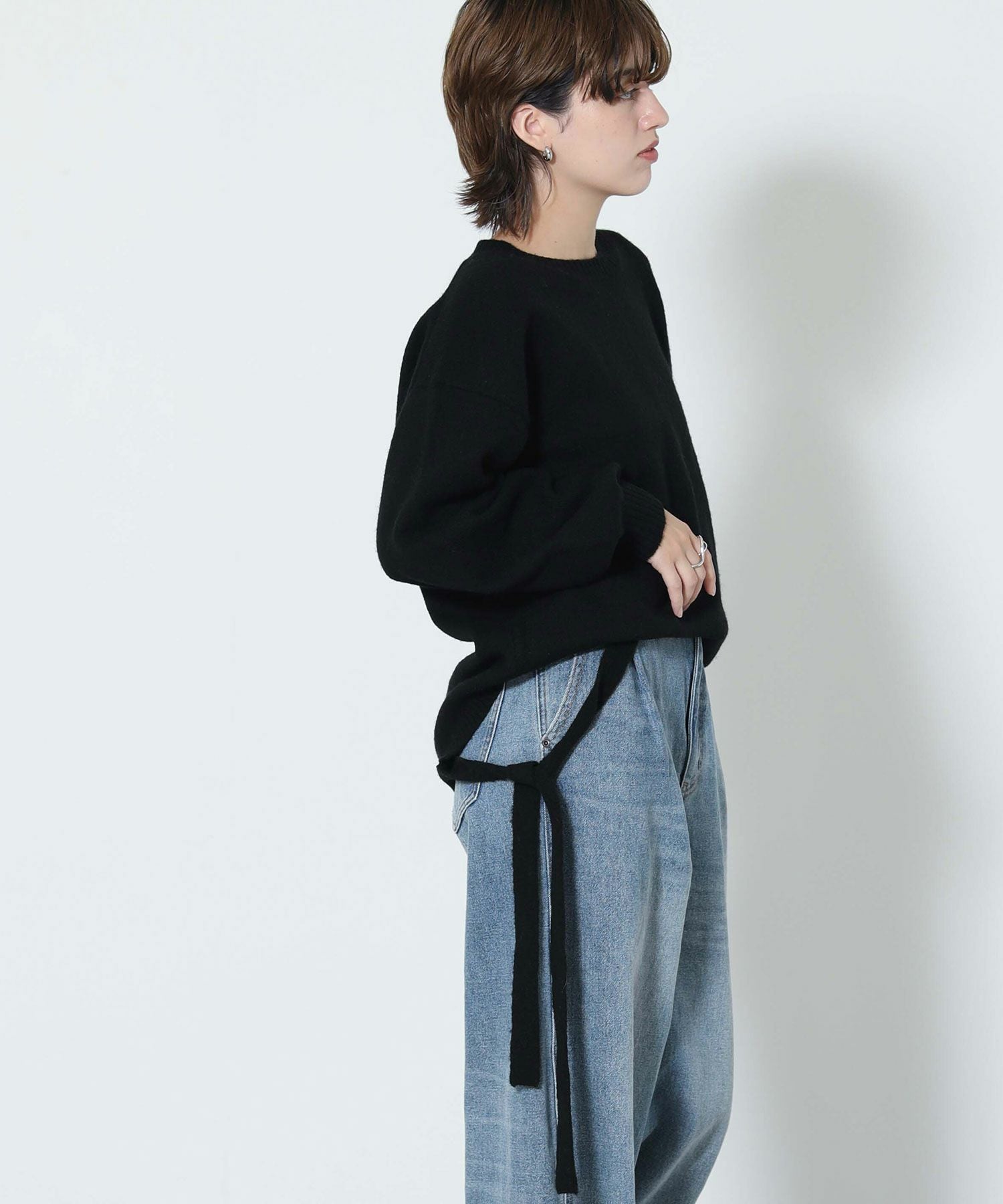 もっちりと弾力のあるストレッチの効いたウールブレンド糸を使用しています。ふんわりと空気を含んでいるためエアリーで軽く着心地も快適です。裾を折り返し、肩でリボンを結ぶとビスチェをレイヤードしたようなスタイルでも着用可能です。ニットならではのテクニックが光る一着です。