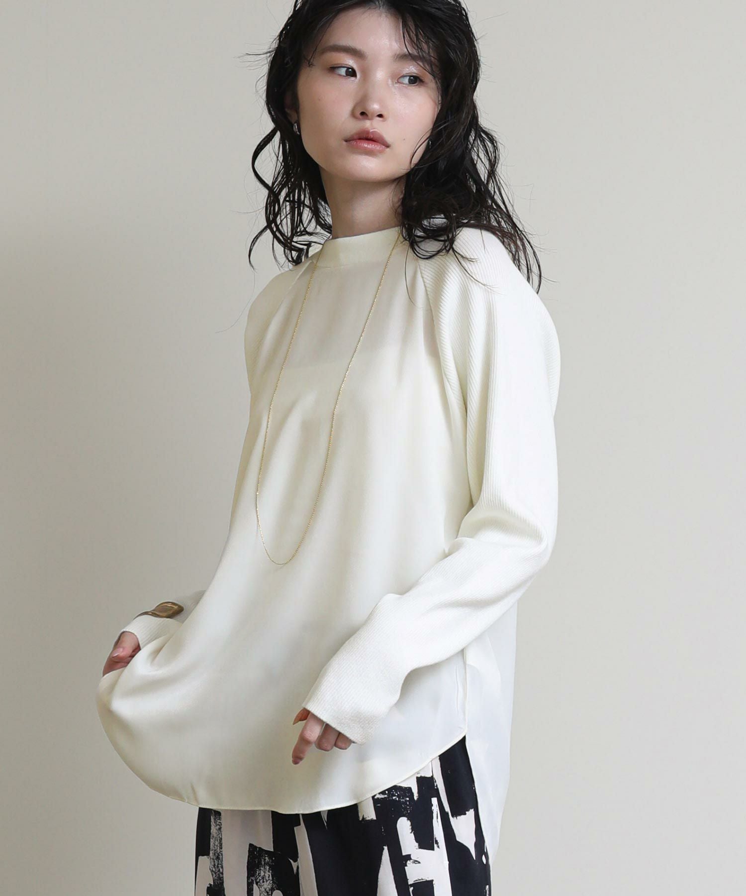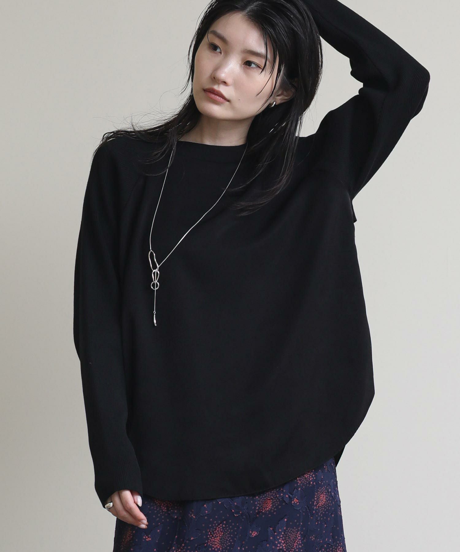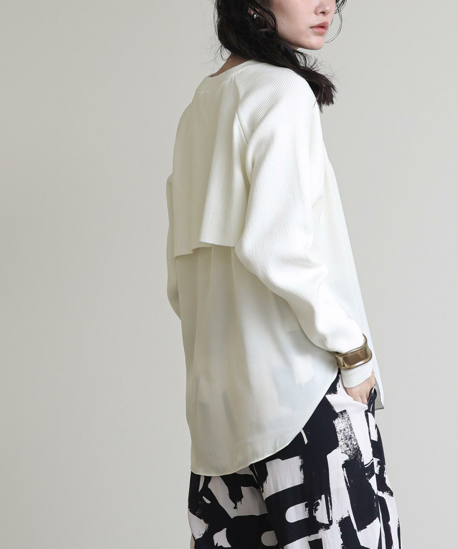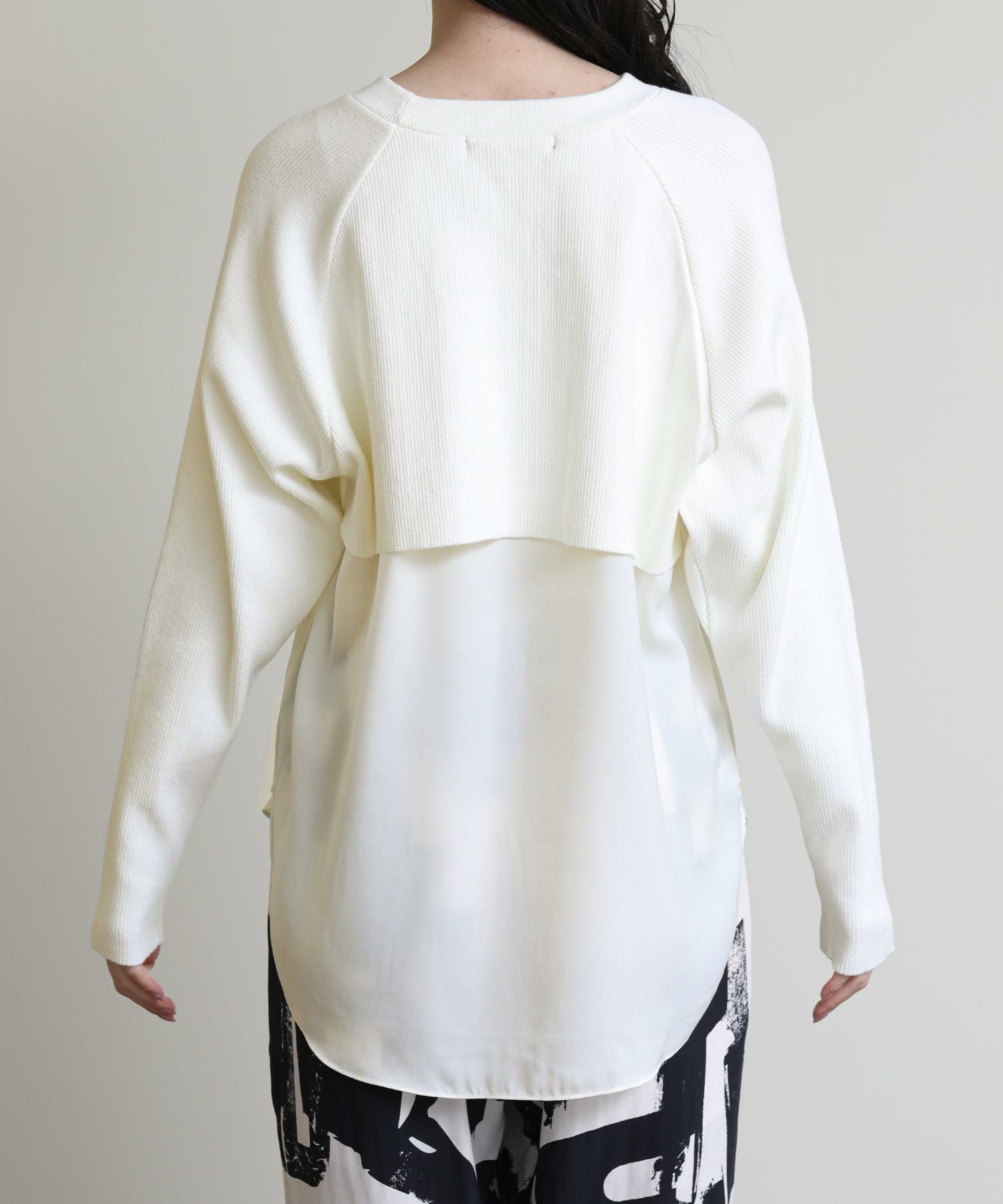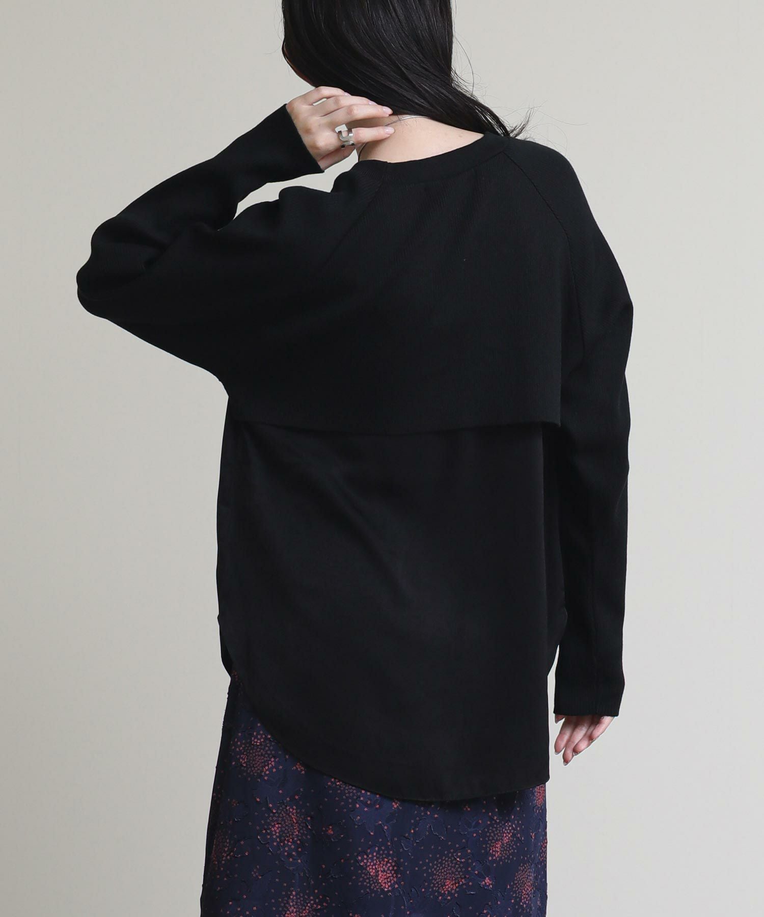 フロントはシンプルなラグランの切替えで、カジュアルな印象に。バックスタイルは、ブラウスにニットをレイヤードさせたようなデザインに仕上げました。一枚でこなれ感のある大人スタイルが完成します。