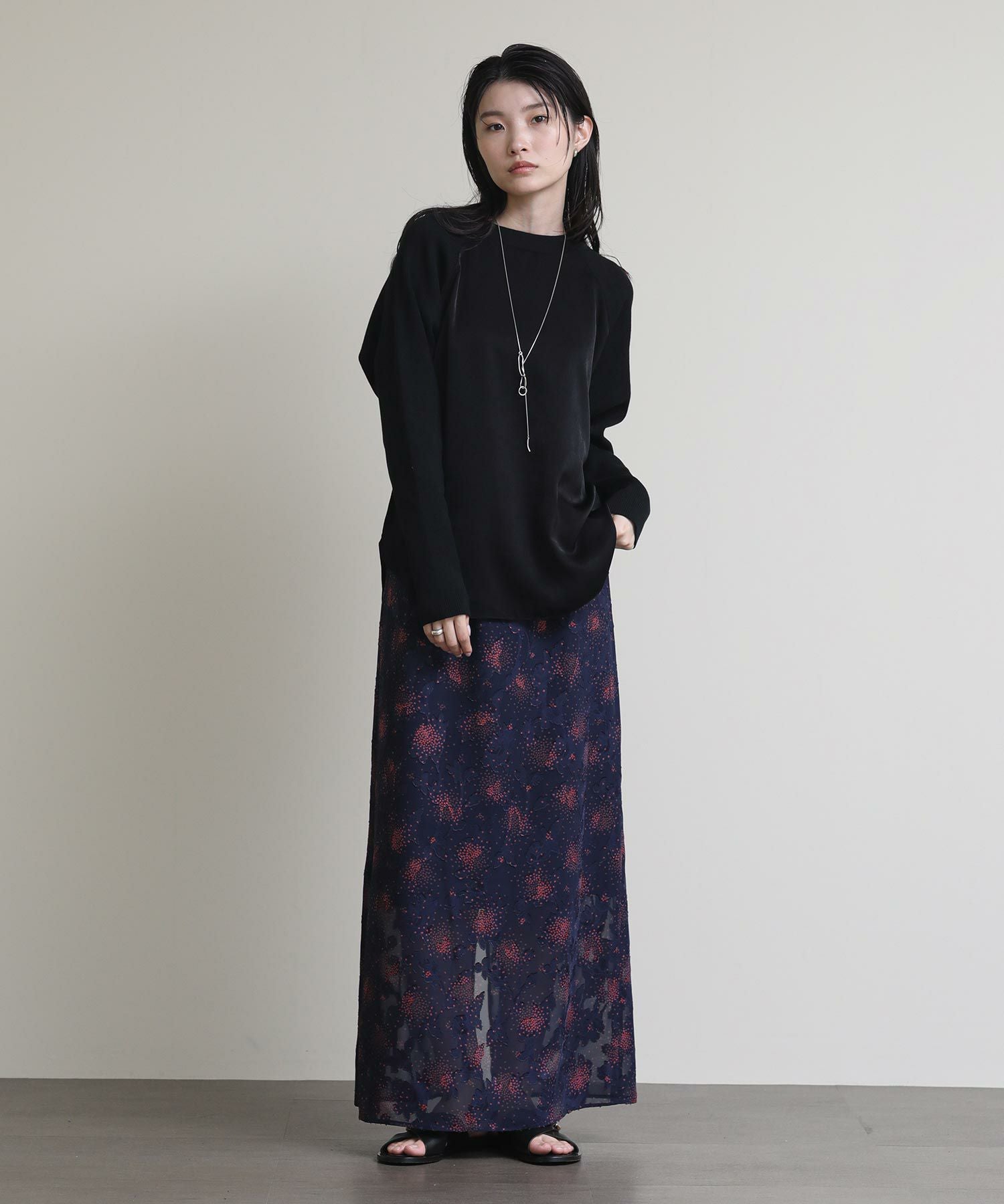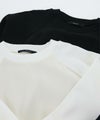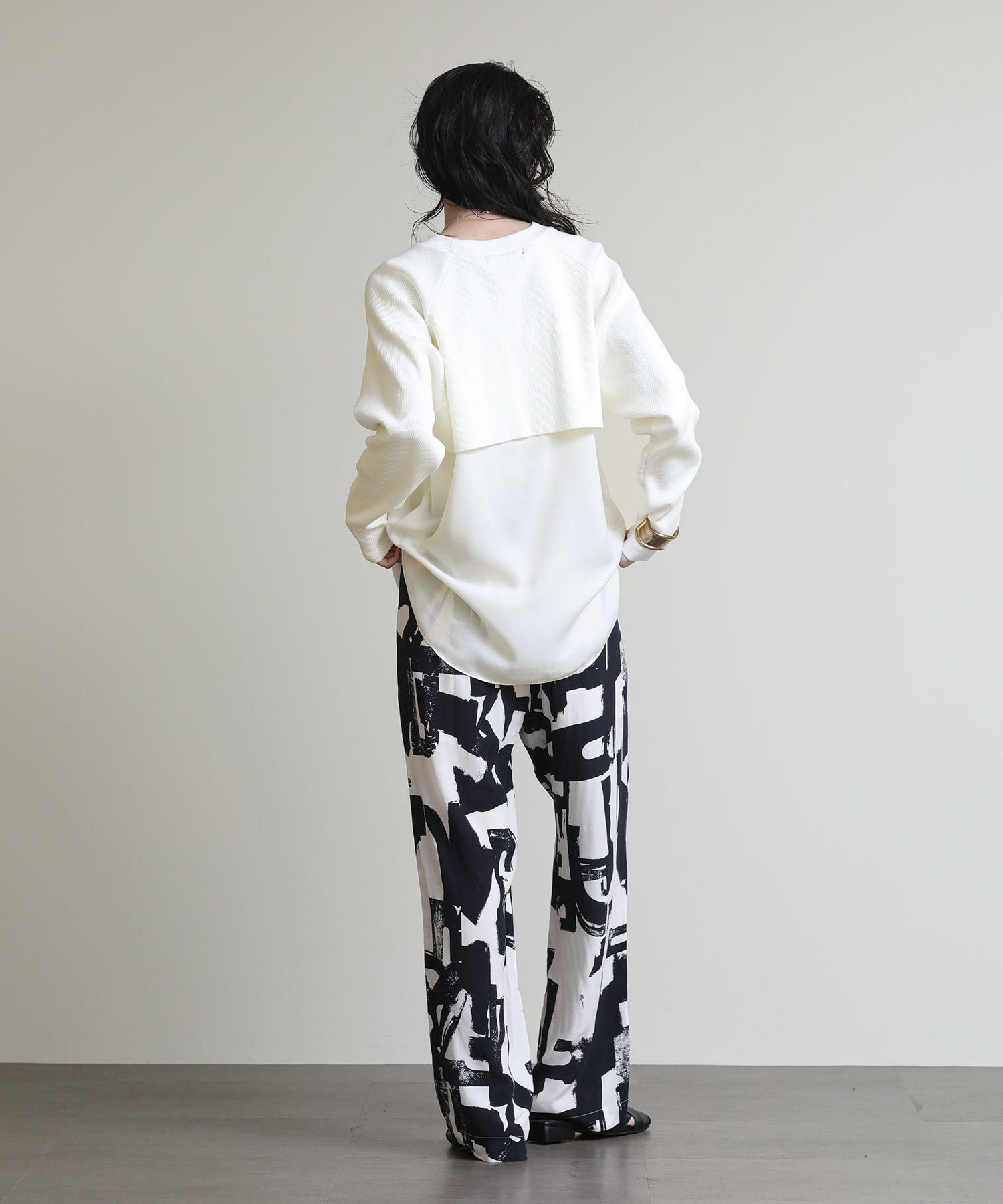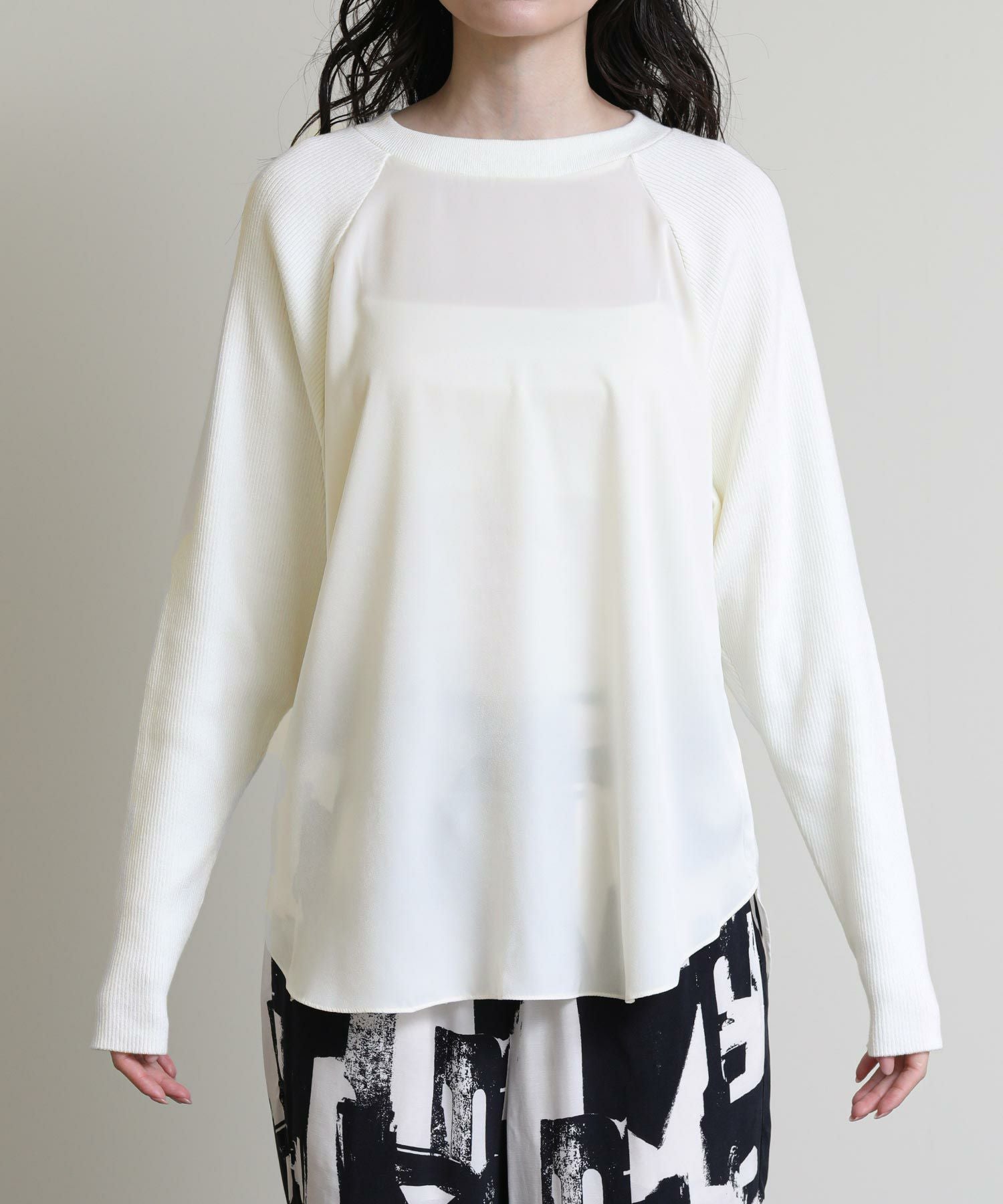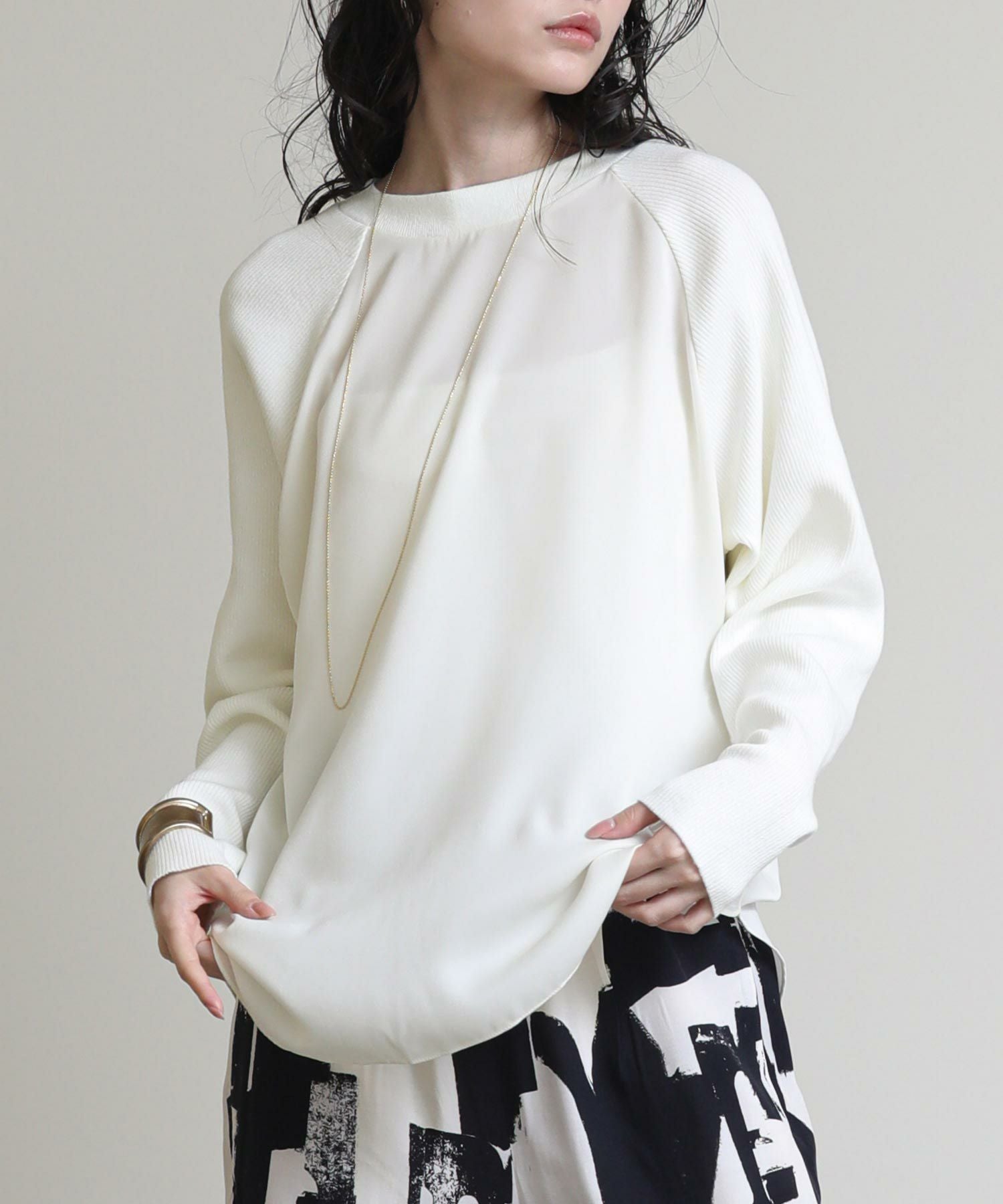 フロントはシンプルなラグランの切替えで、カジュアルな印象に。バックスタイルは、ブラウスにニットをレイヤードさせたようなデザインに仕上げました。一枚でこなれ感のある大人スタイルが完成します。