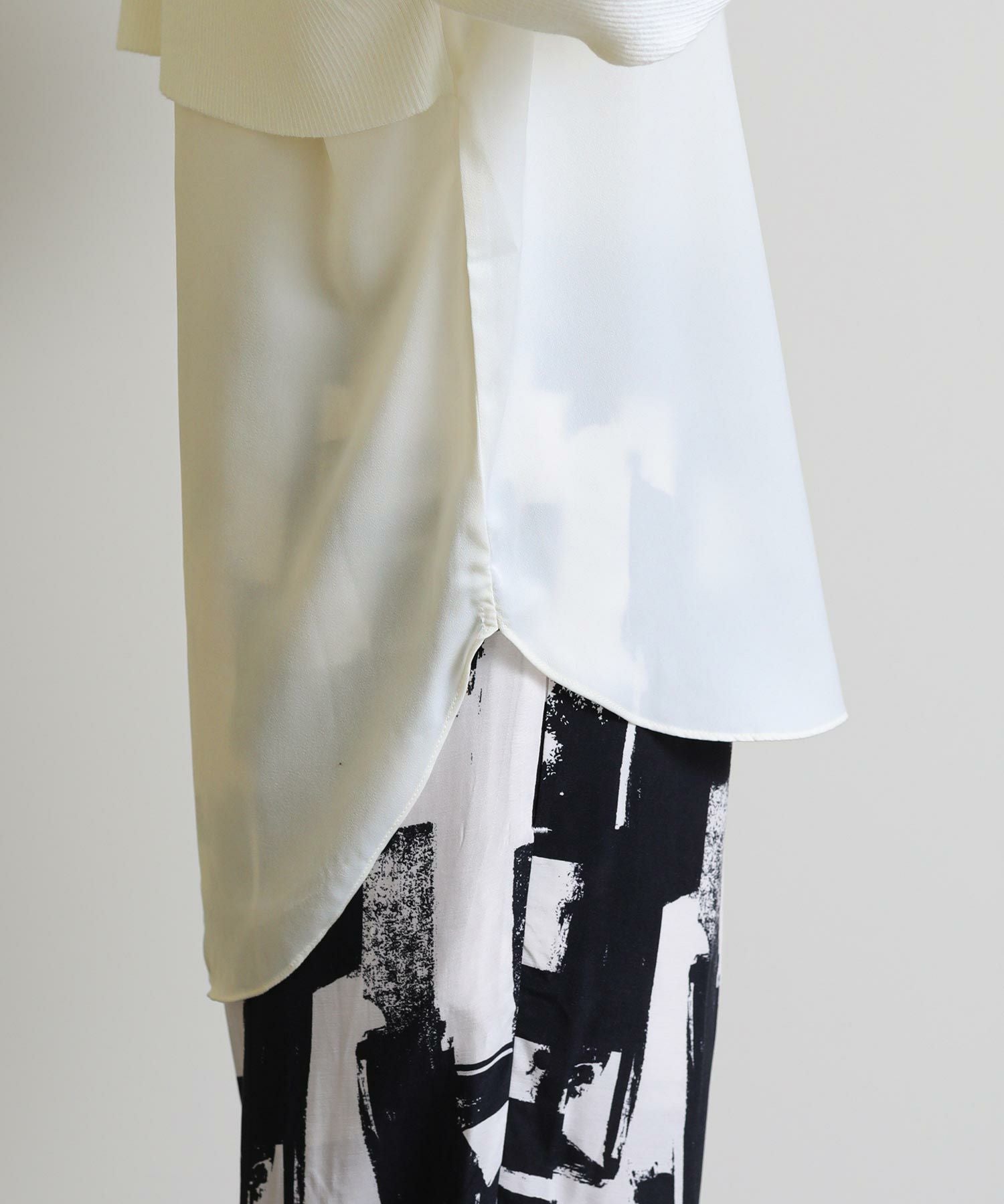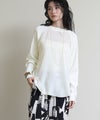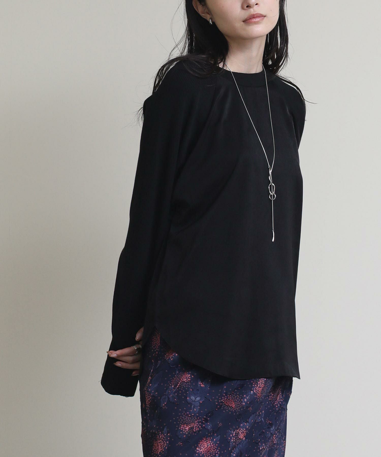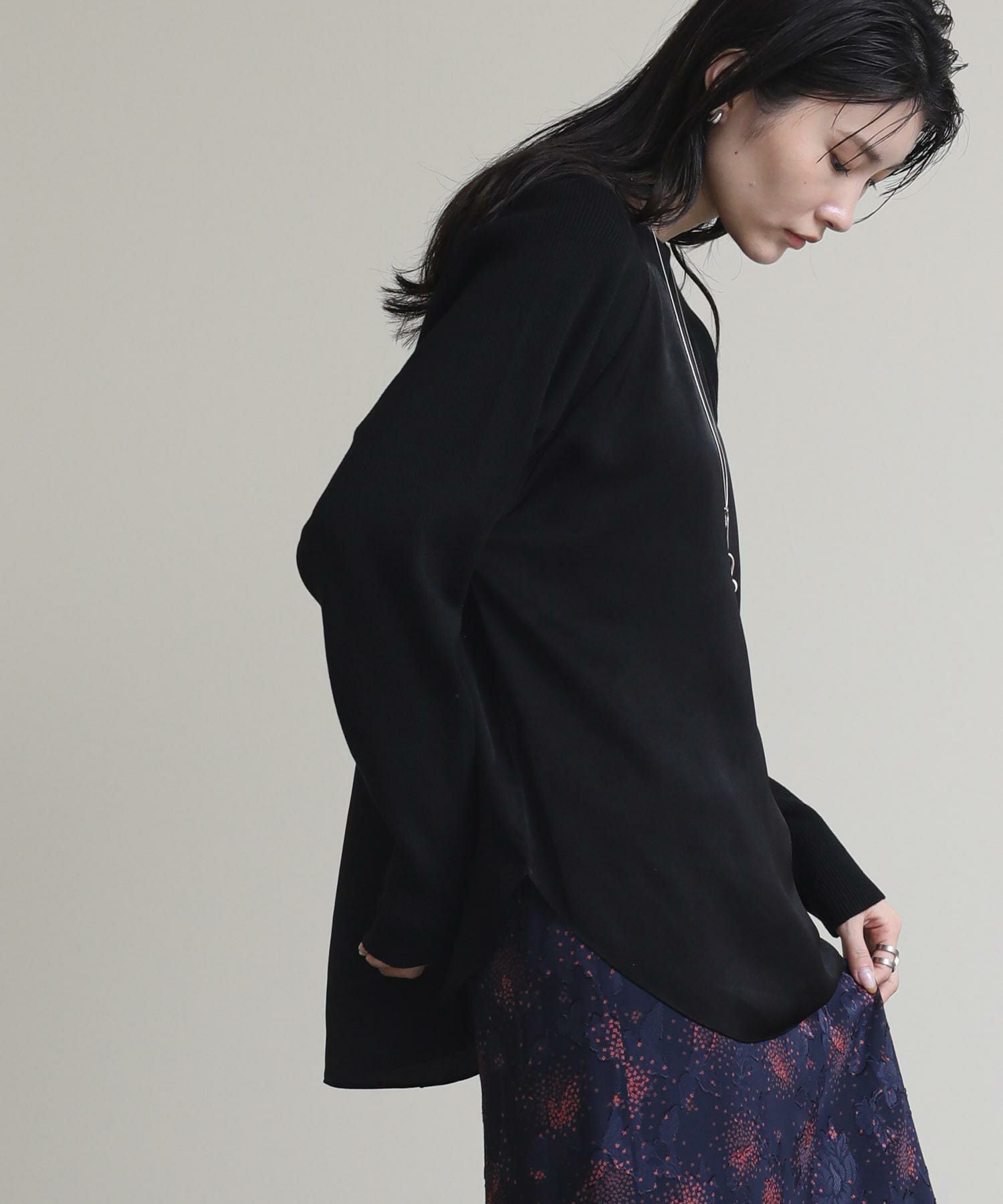 "艶感のあるサテンとニットをドッキングさせたデザインプルオーバー。