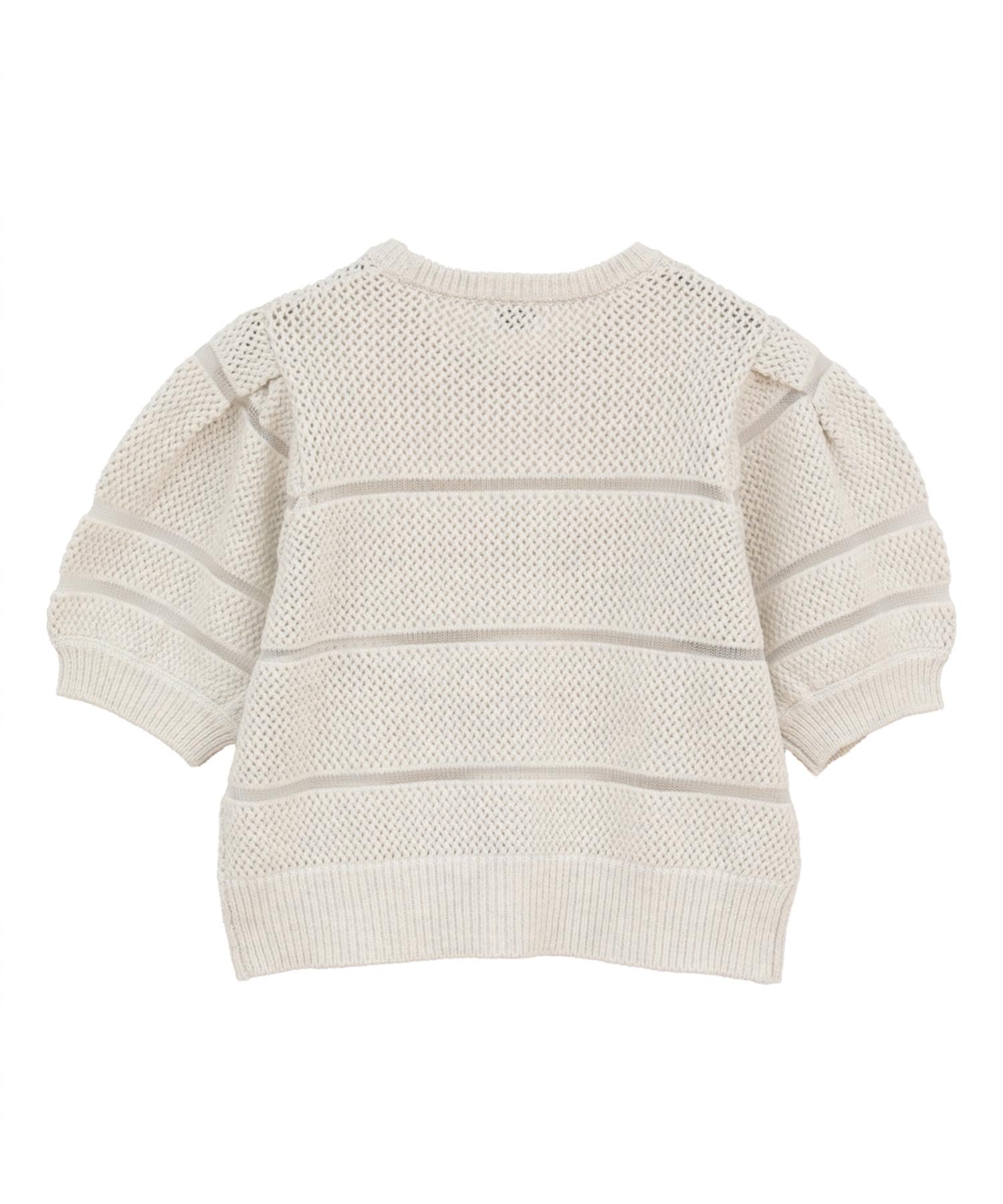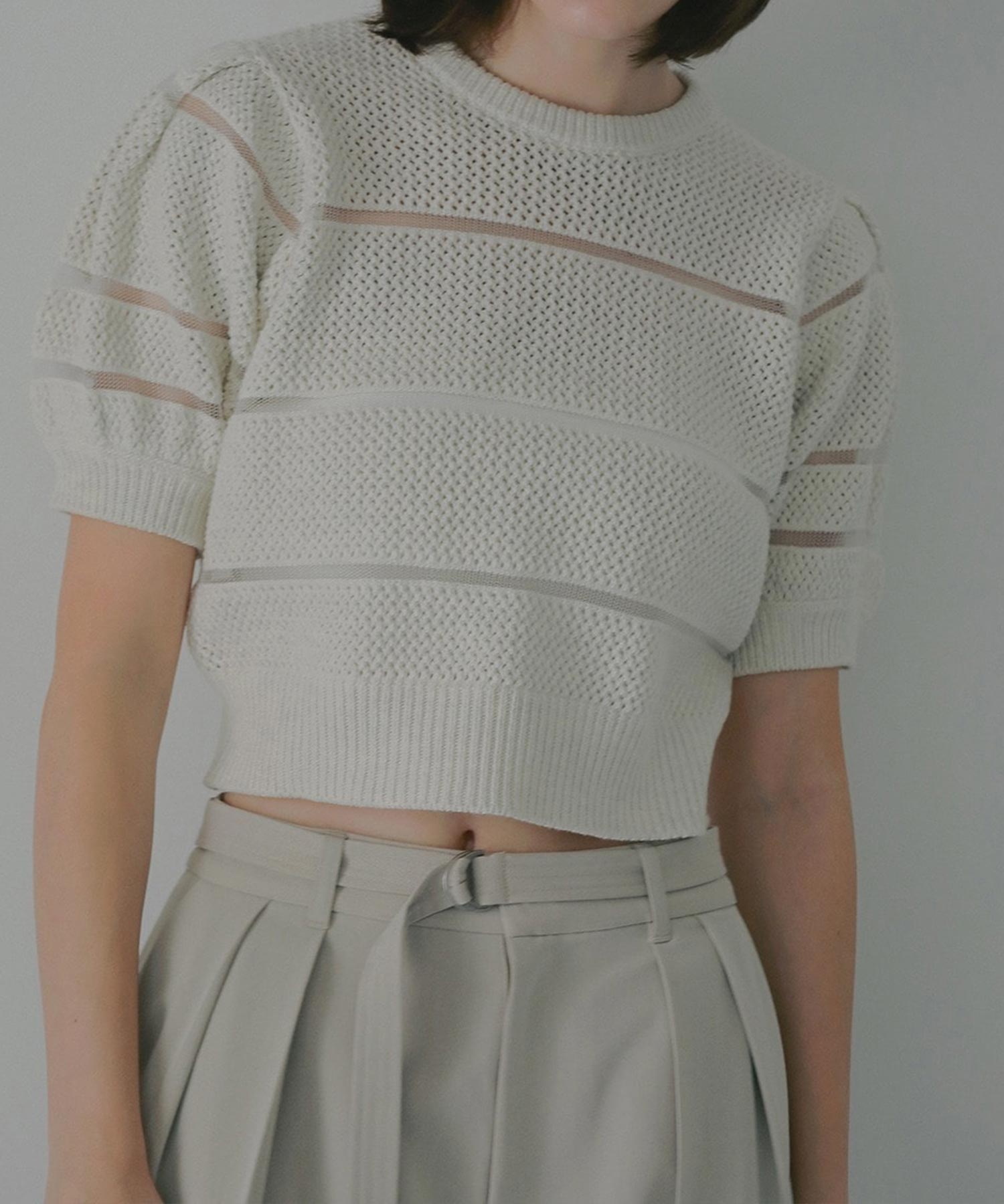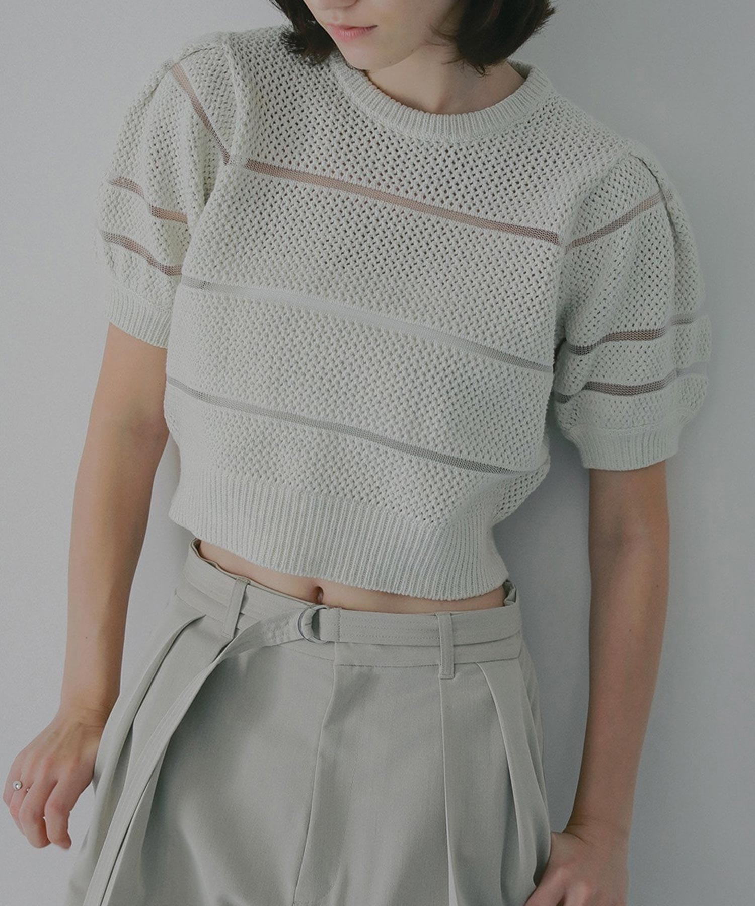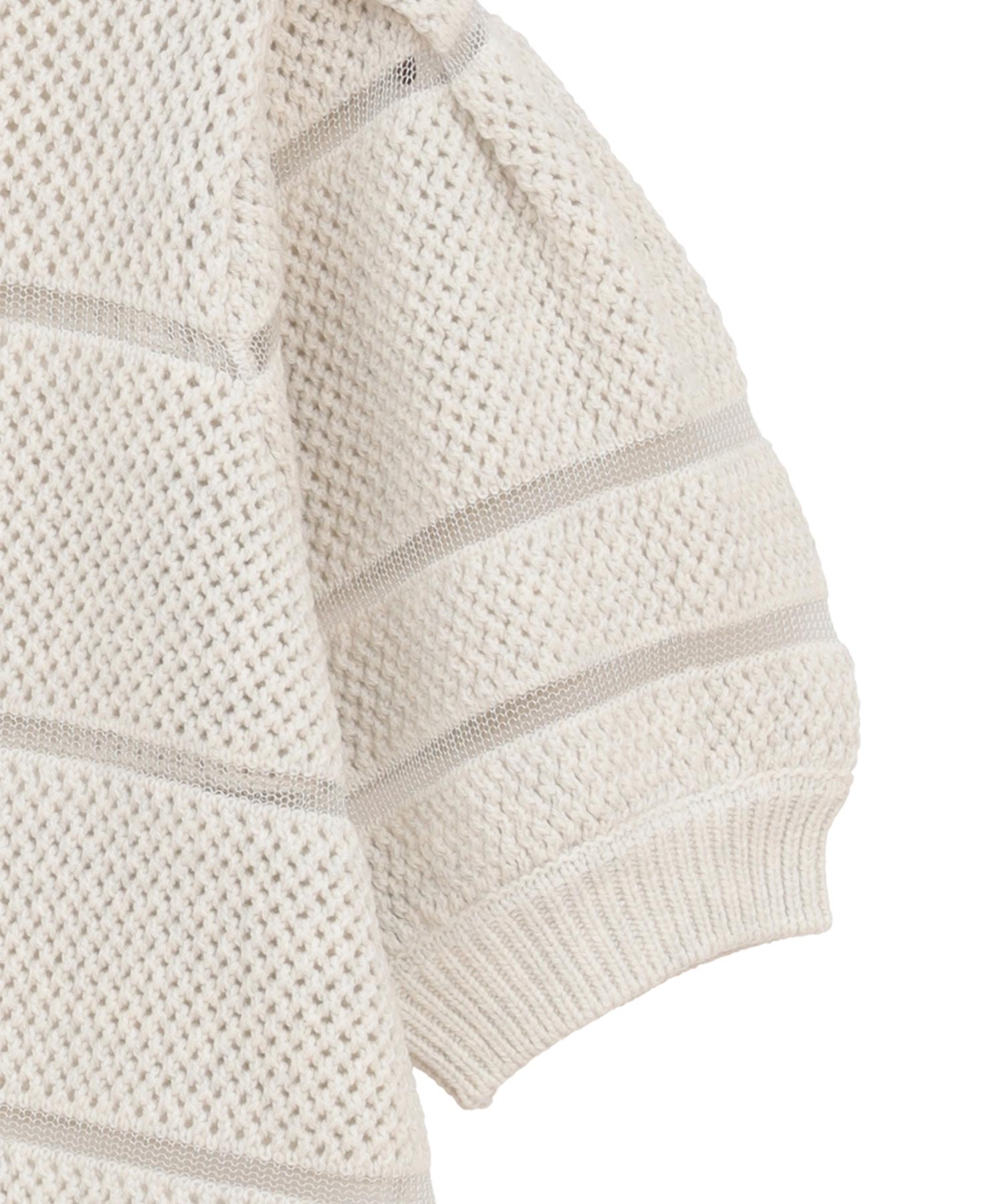 透かし編みにシアー切り替えのボーダーを加えた、軽やかなショート丈ニットトップス。