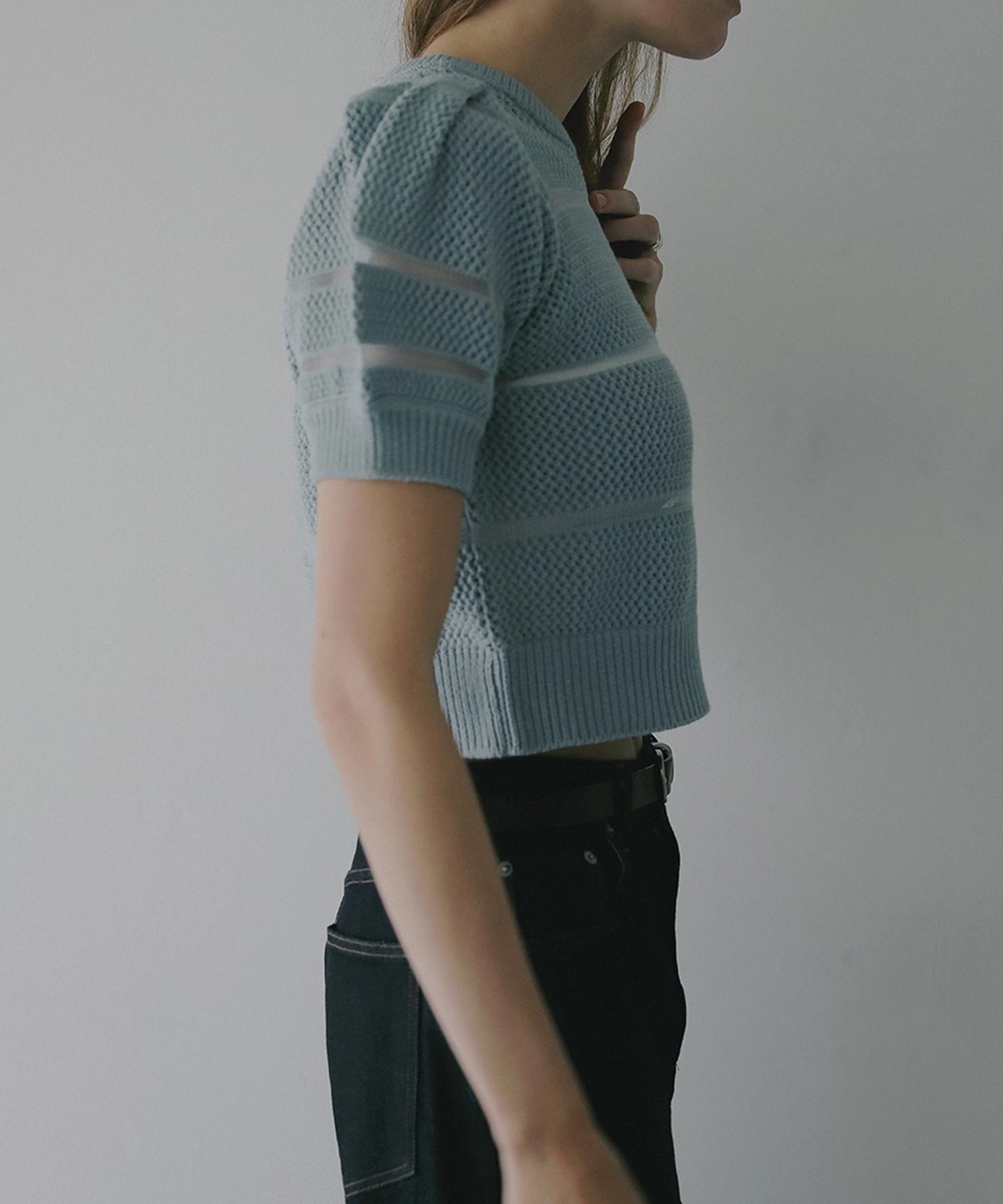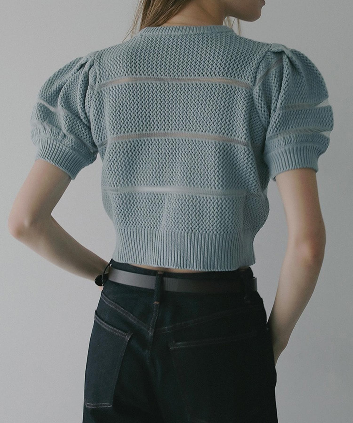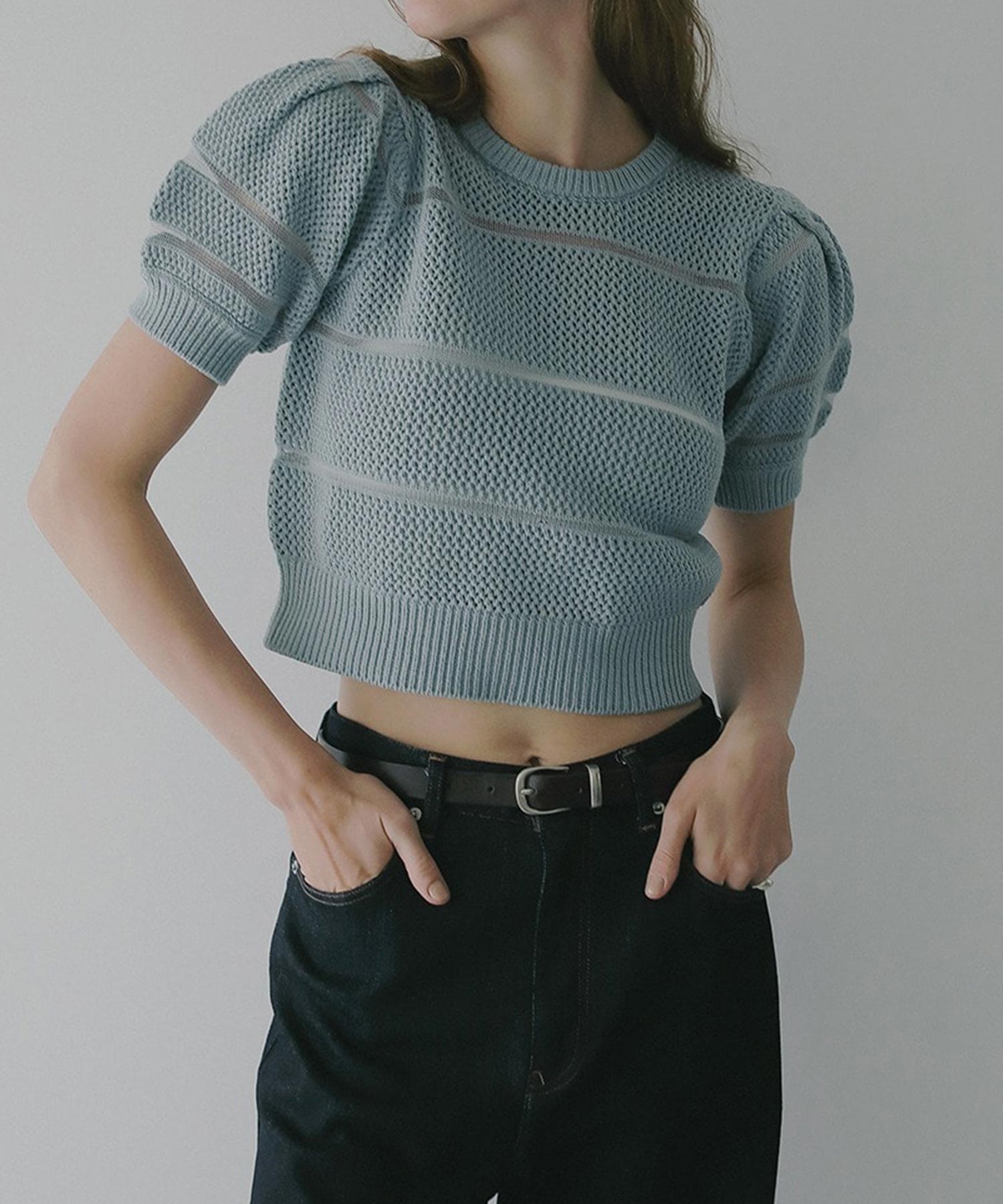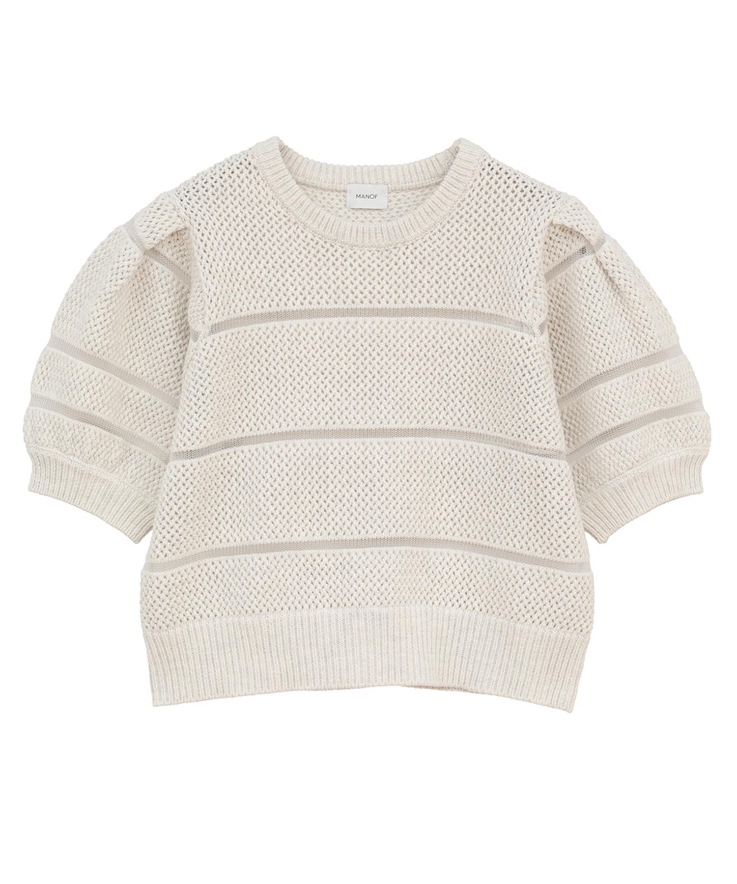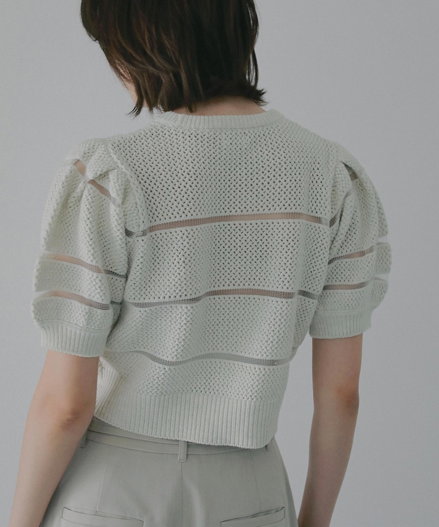 透かし編みにシアー切り替えのボーダーを加えた、軽やかなショート丈ニットトップス。