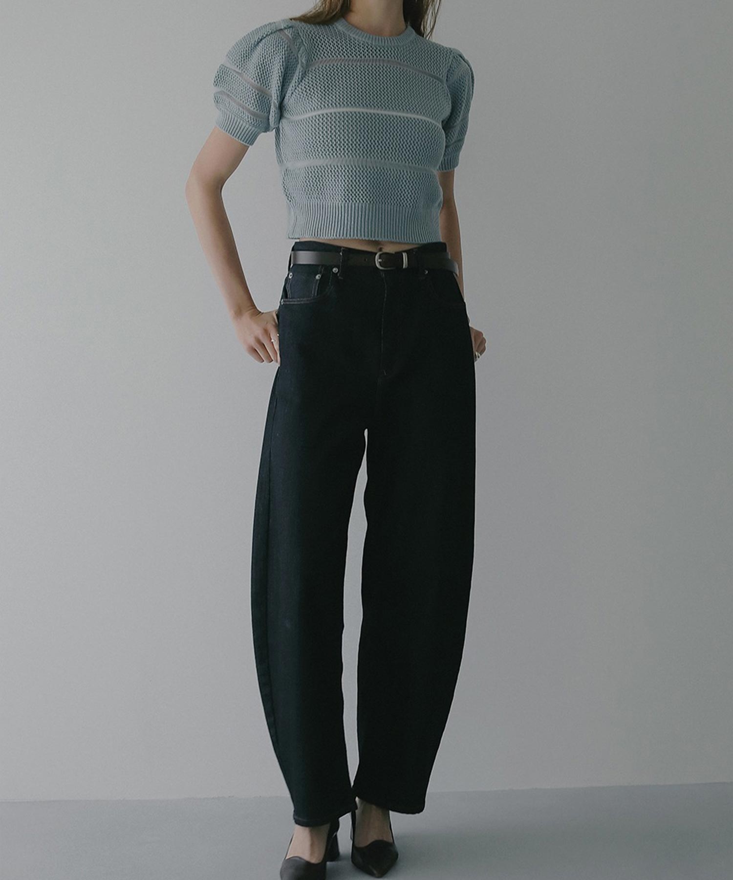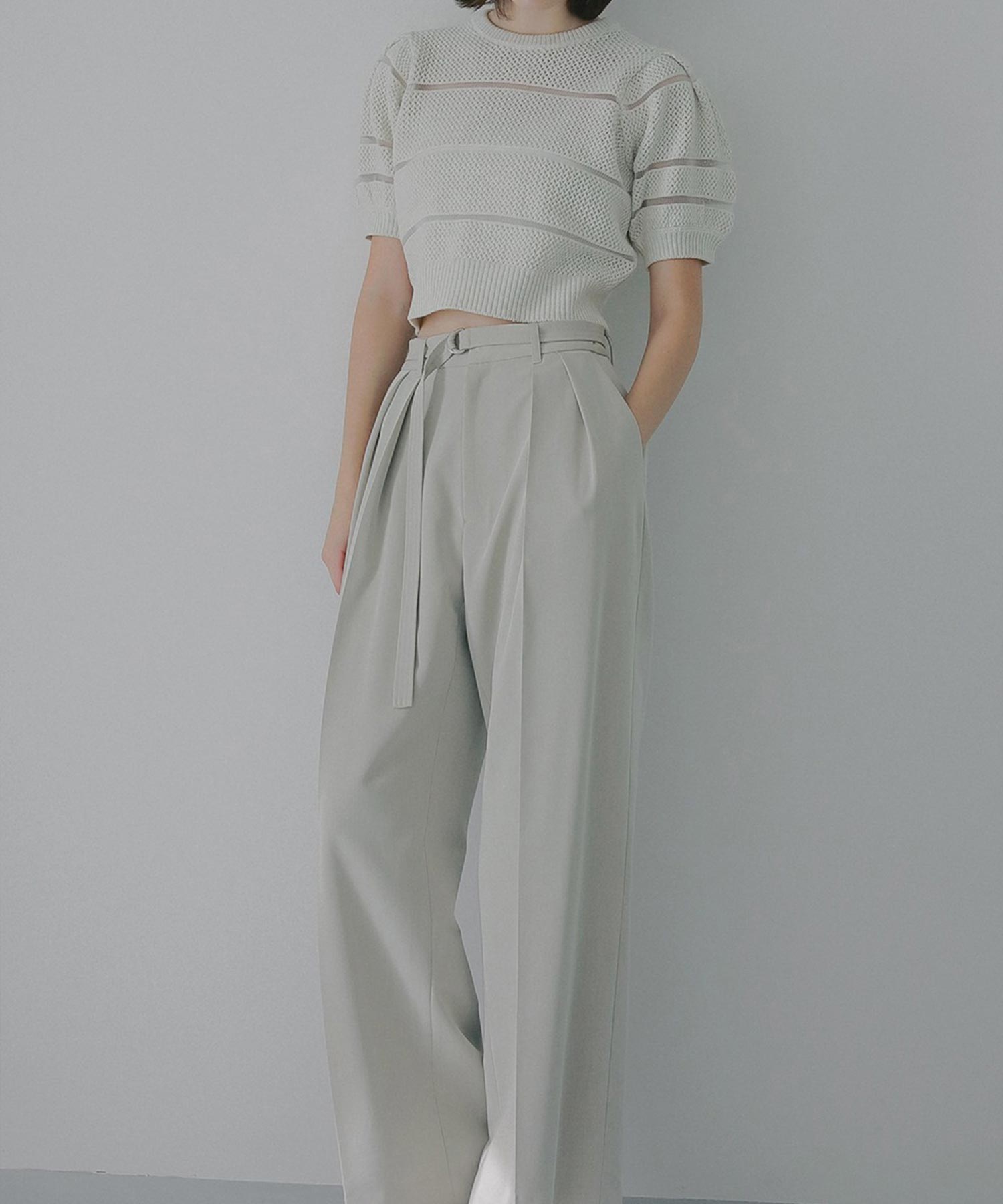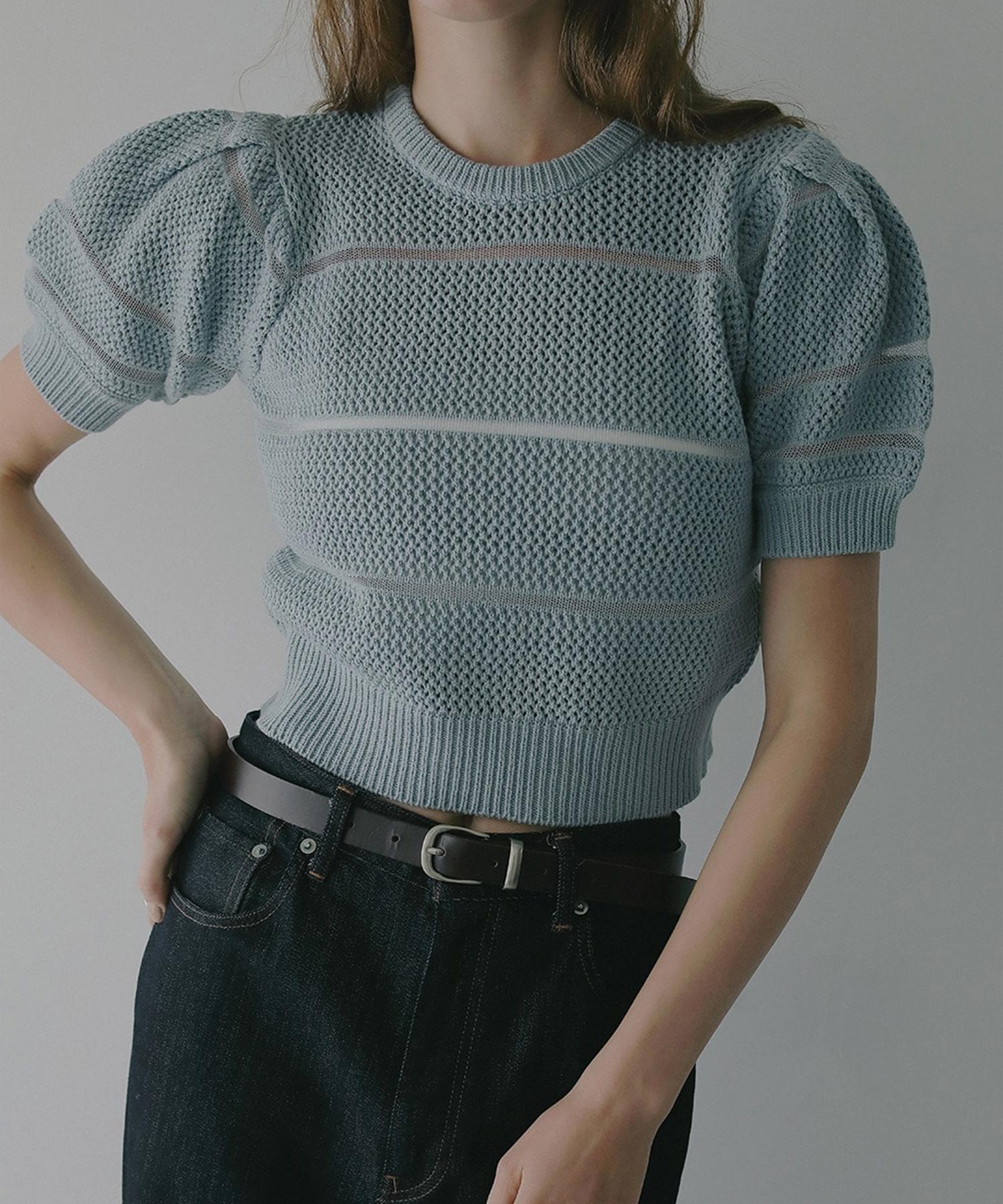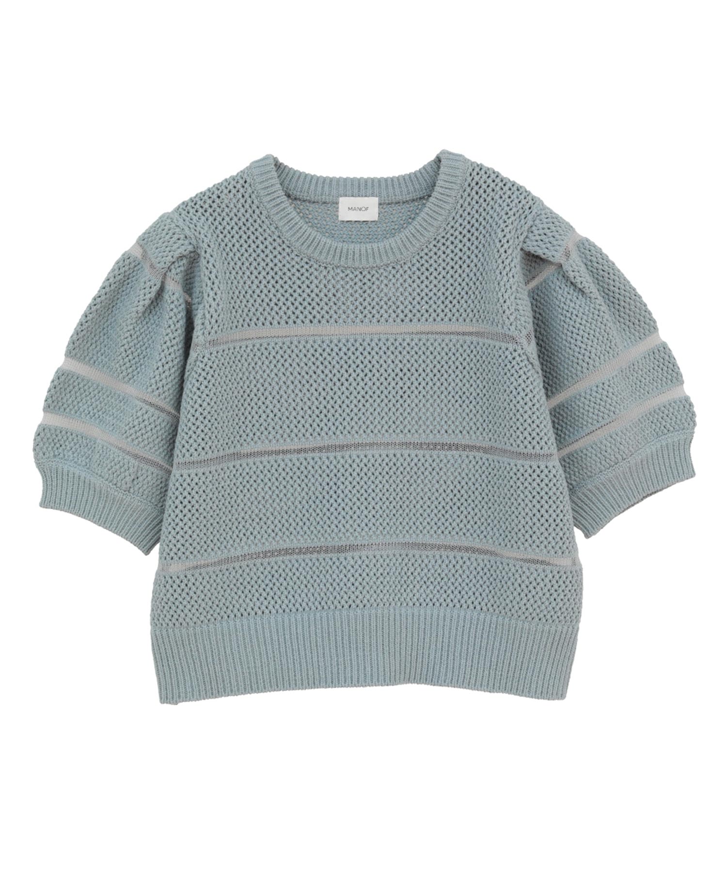 透かし編みにシアー切り替えのボーダーを加えた、軽やかなショート丈ニットトップス。