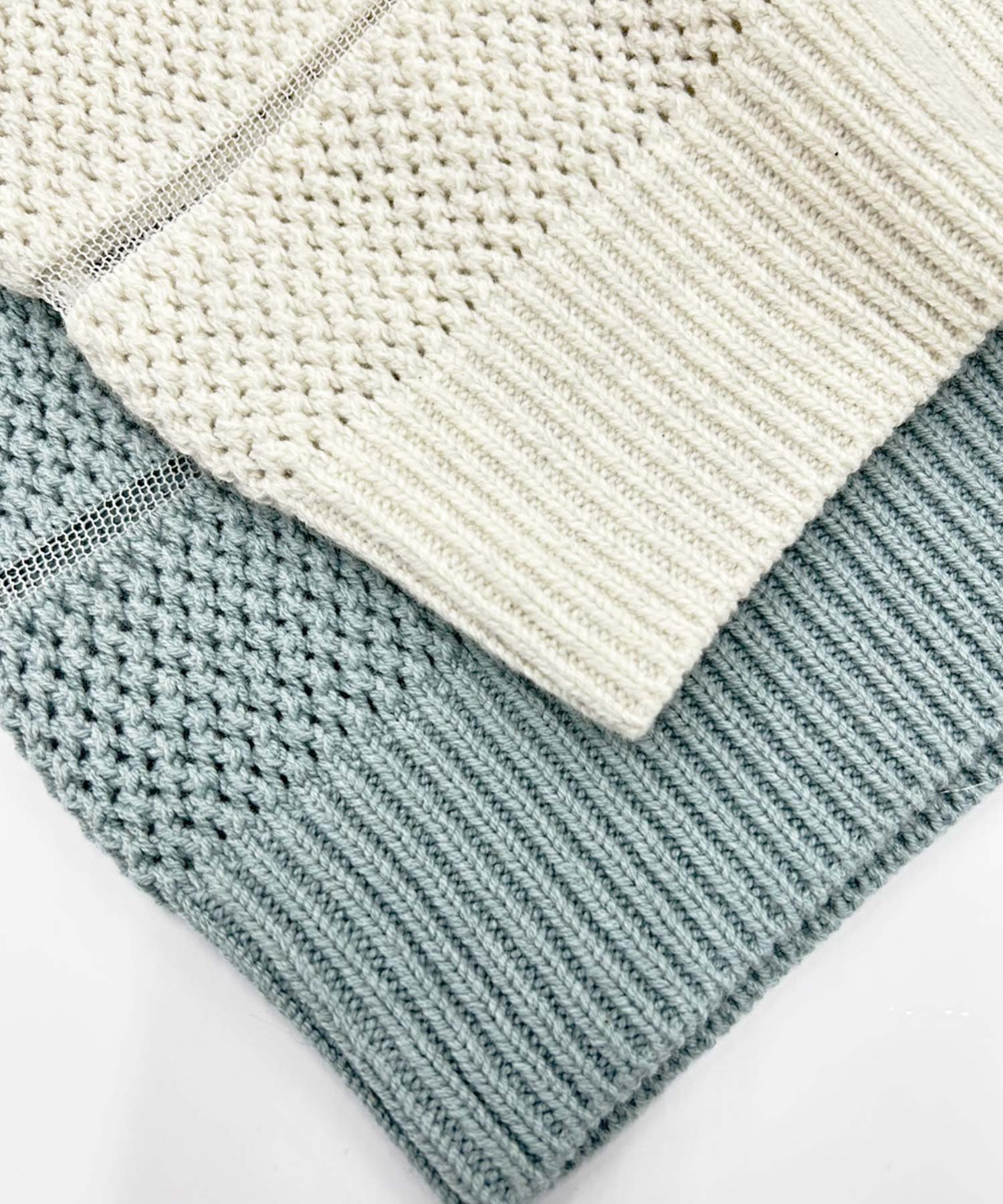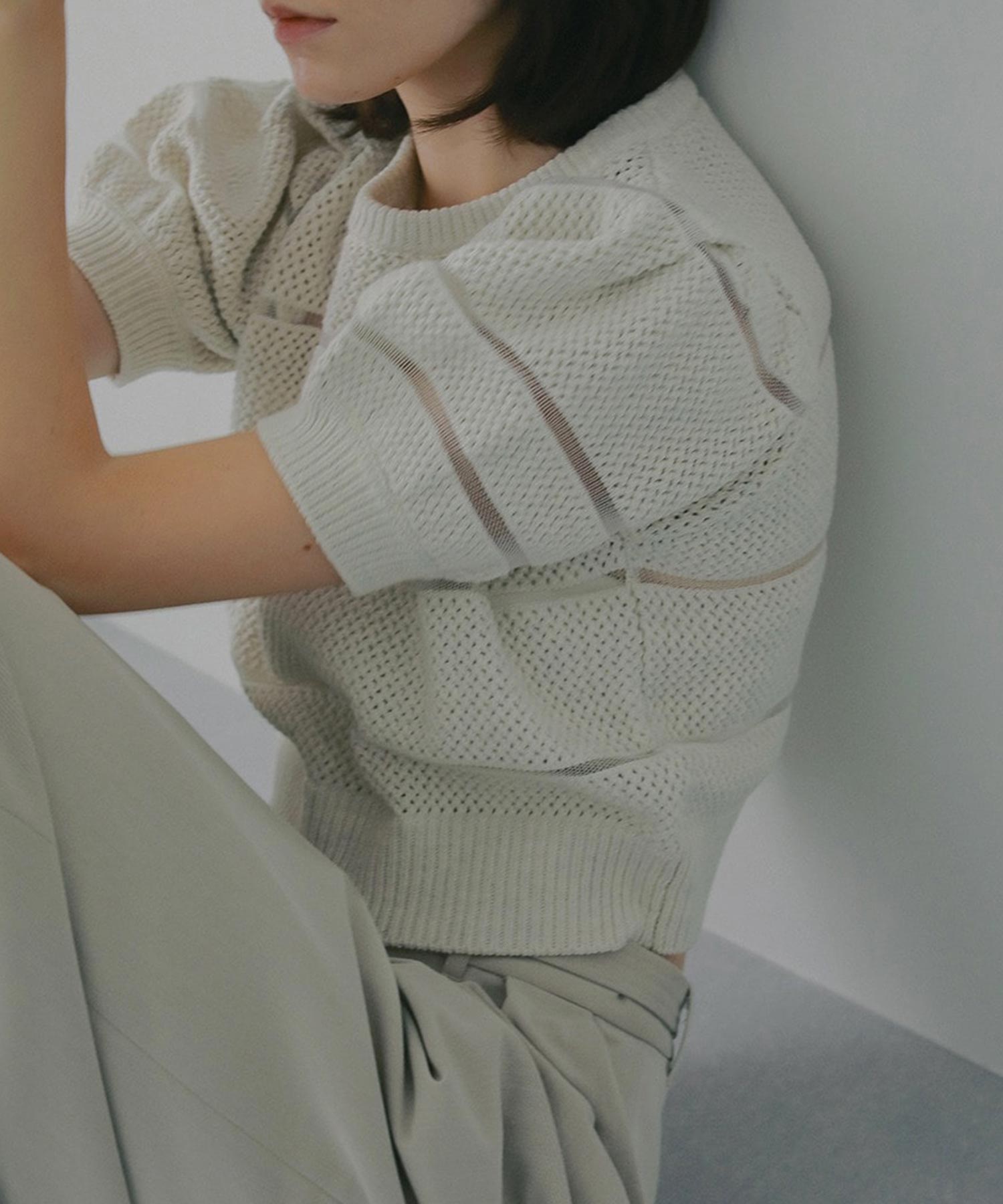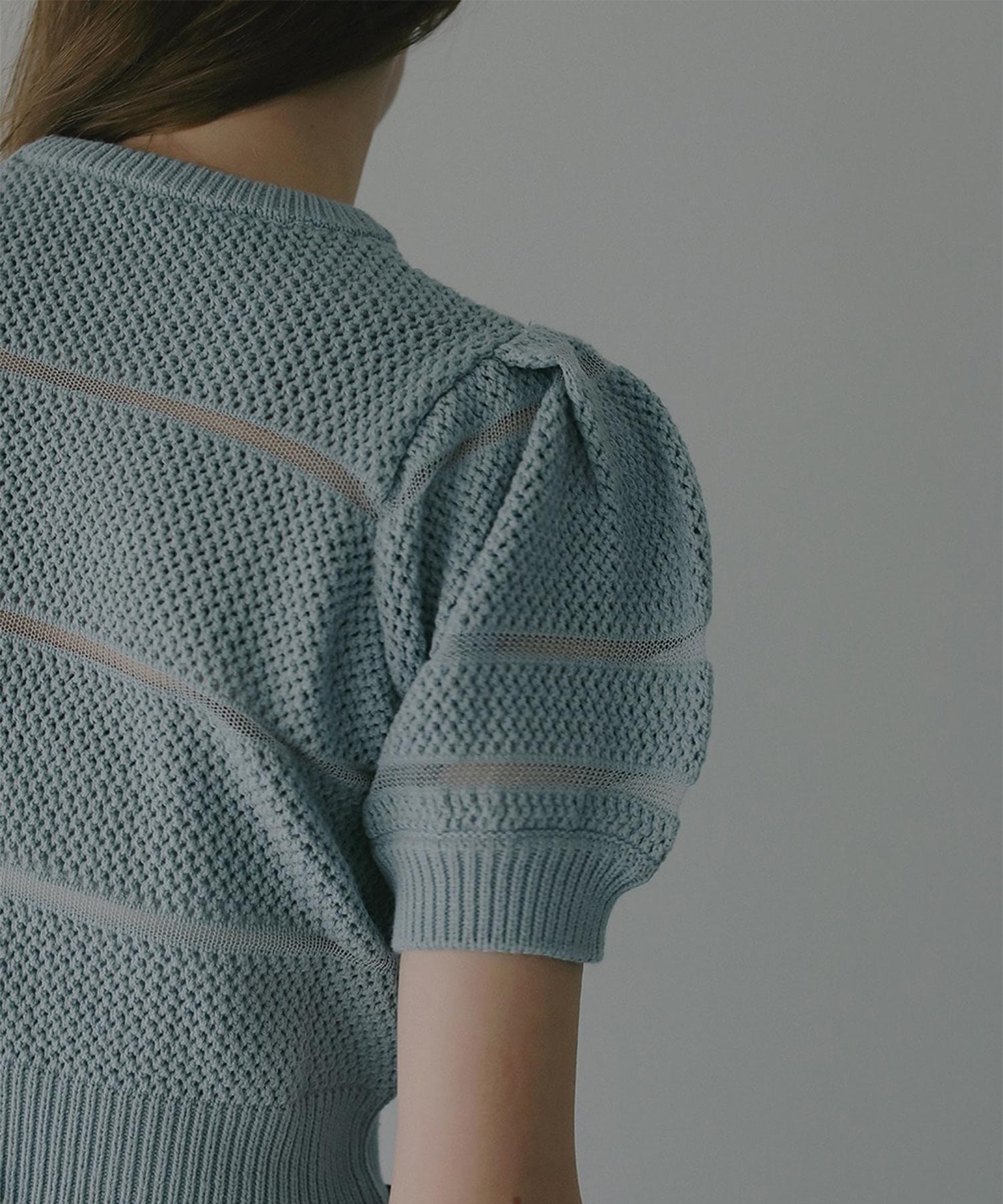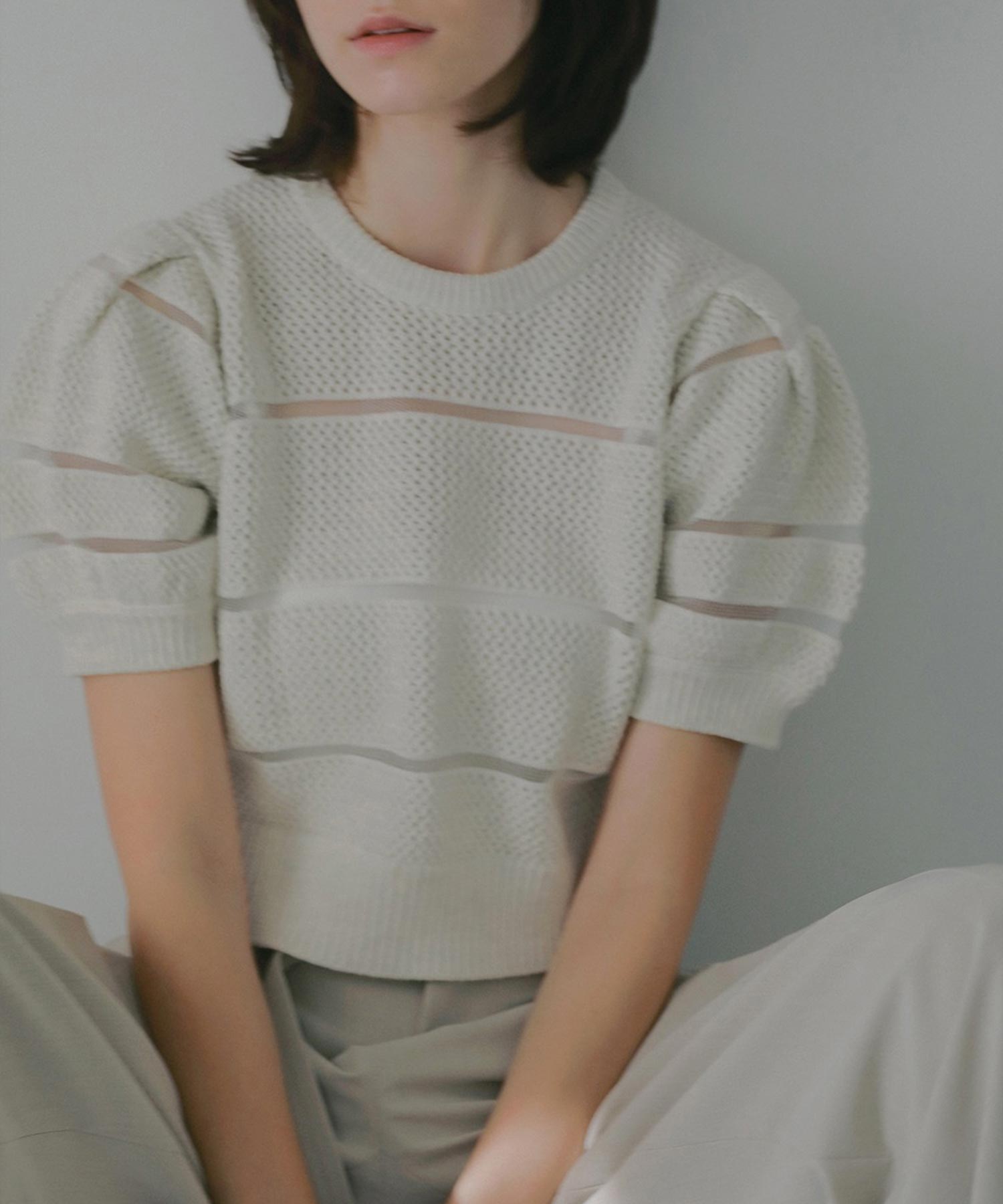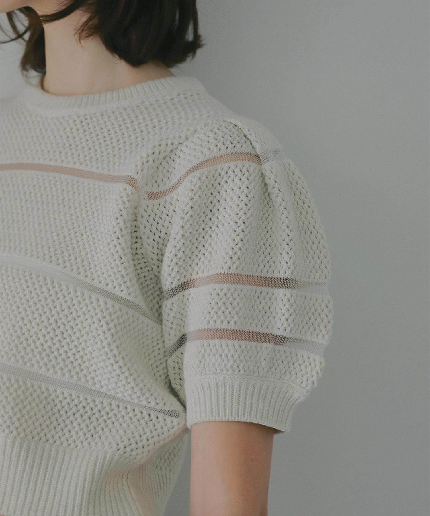 ニット部分はコットン混のしっかりとした編み地で、シアー部分とメリハリある印象に。