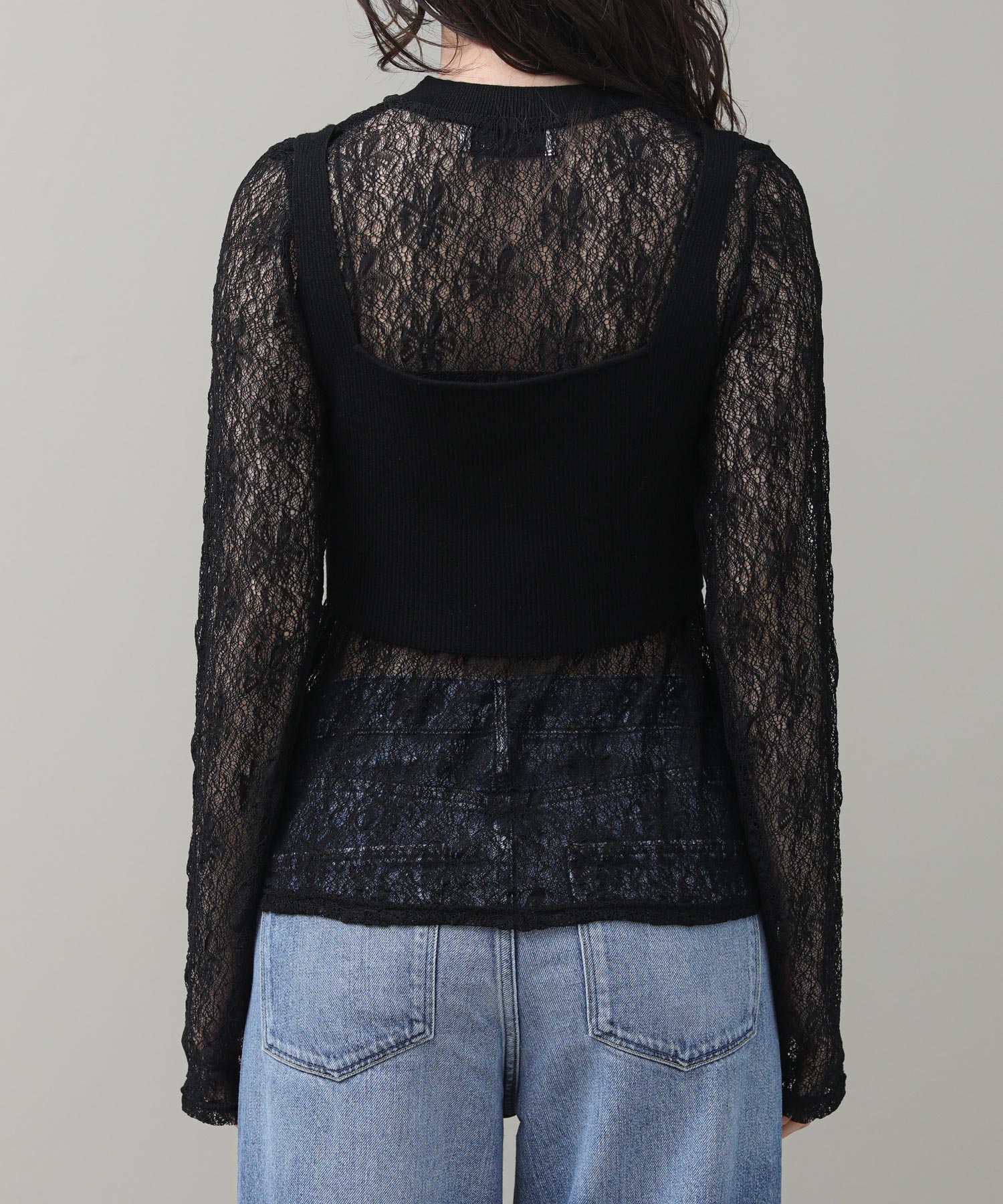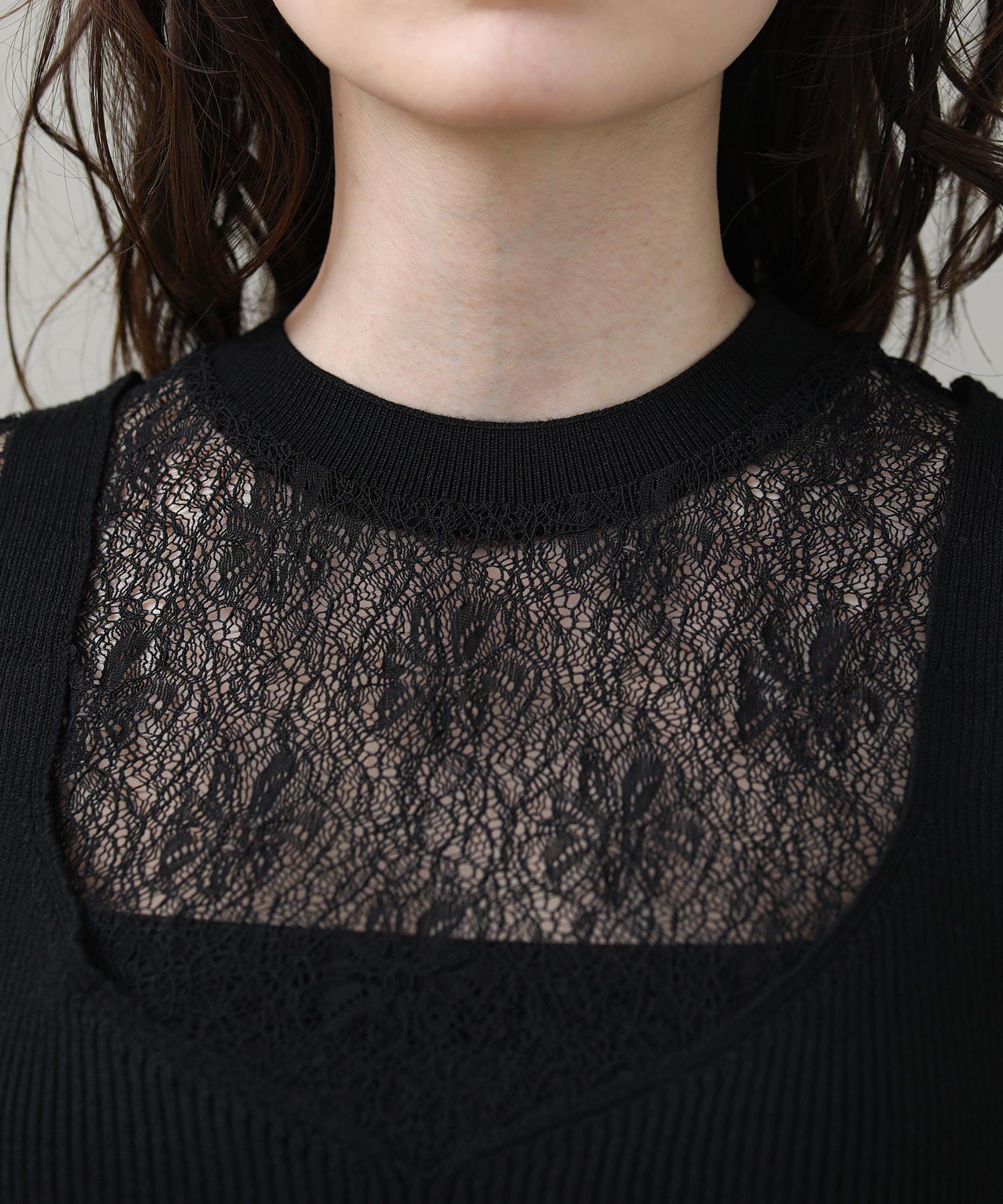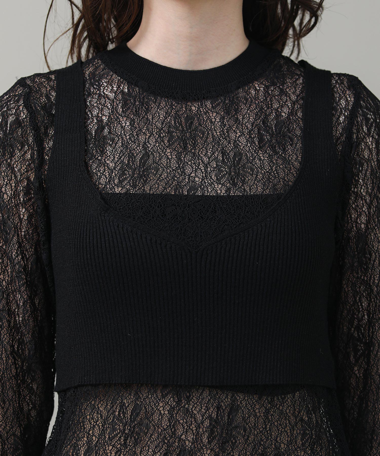 重ねて着用することで、ニットの隙間から覗くレースが奥行きのある立体感とセンシュアルな透け感を演出します。それぞれ単体でも使いやすく、その日の気分やシーンに合わせて幅広い表情を楽しめる、汎用性に優れた一着です。