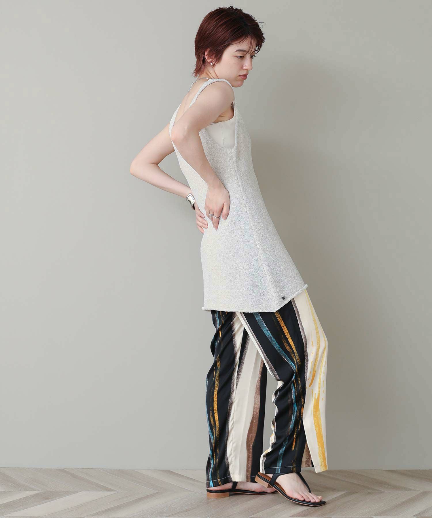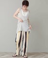 前後、深く開いたネックラインでレイヤードスタイルを楽しめます。こなれ感のあるナチュラルなカラー展開もポイント。イージーパンツでリゾート風の着こなしもおすすめ◎