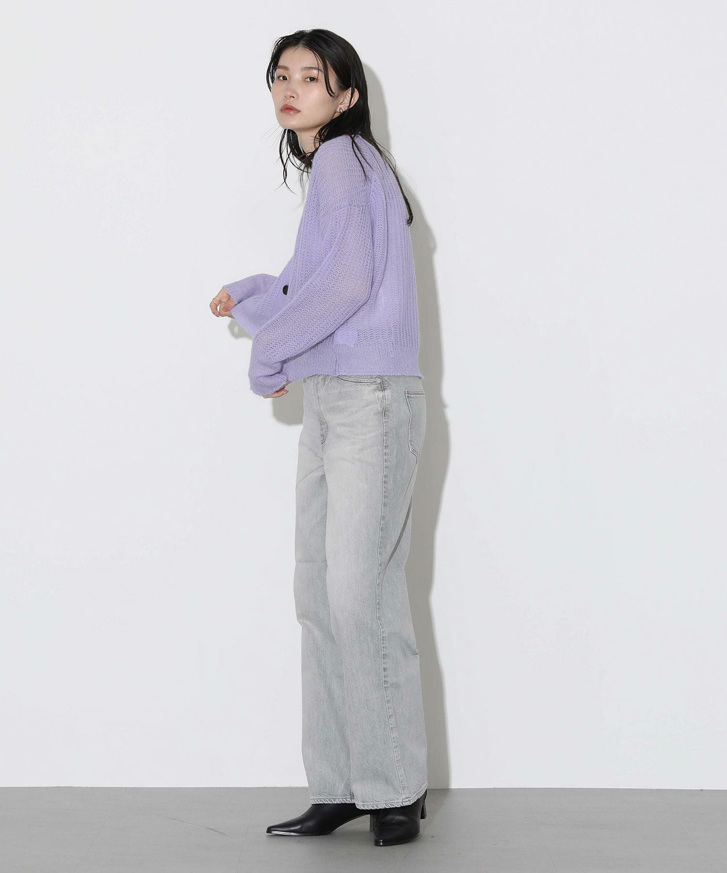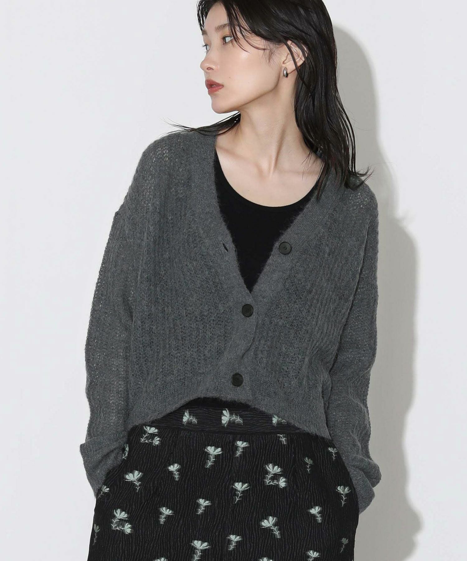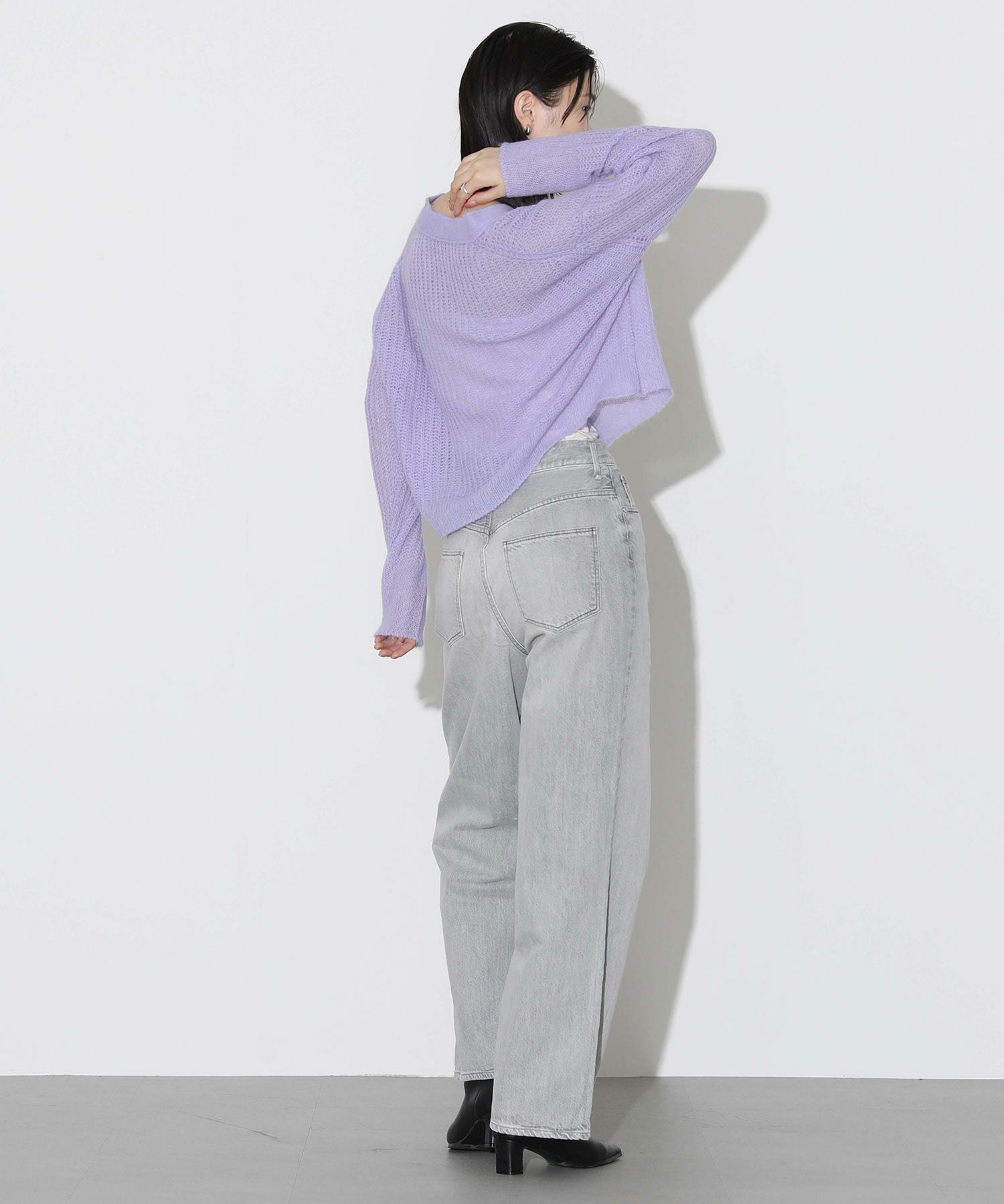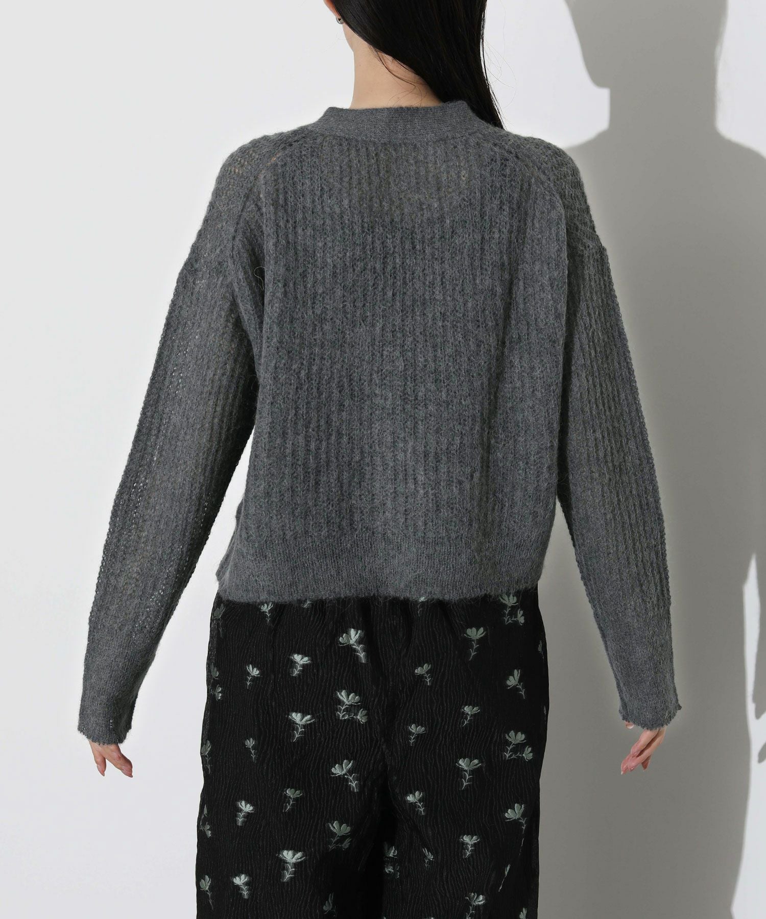 希少なスーリーアルパカを使用した贅沢な1枚です。通常のアルパカより光沢感があり洗練された女性らしさを演出します。度甘で編立たシアー感が優しい表情。気温が高い時期はタンクトップをインナーにして透け感を楽しむのもおすすめ。季節が進めば長袖やタートルネックでレイヤードスタイルに。長く愛用できるアイテムです。