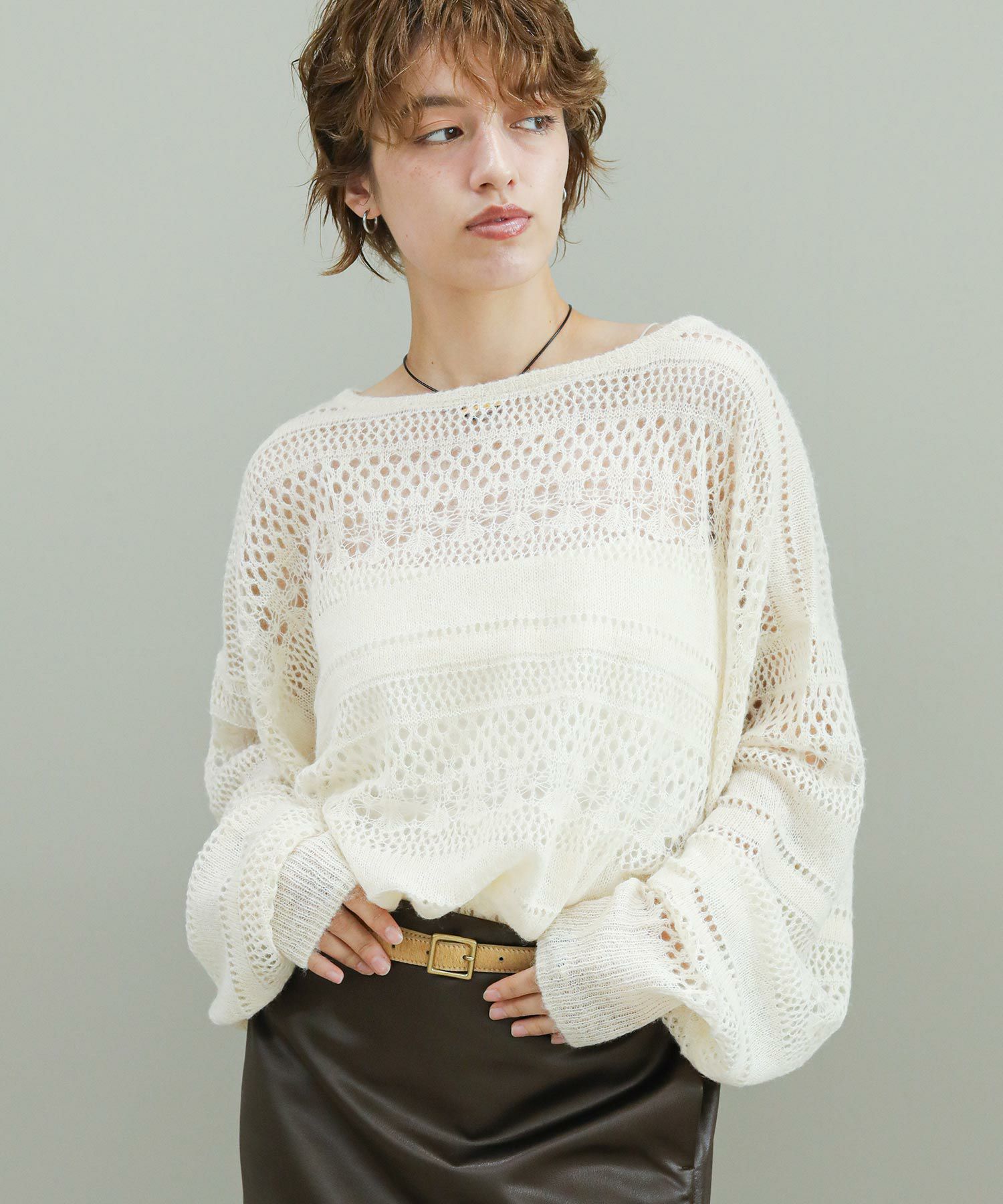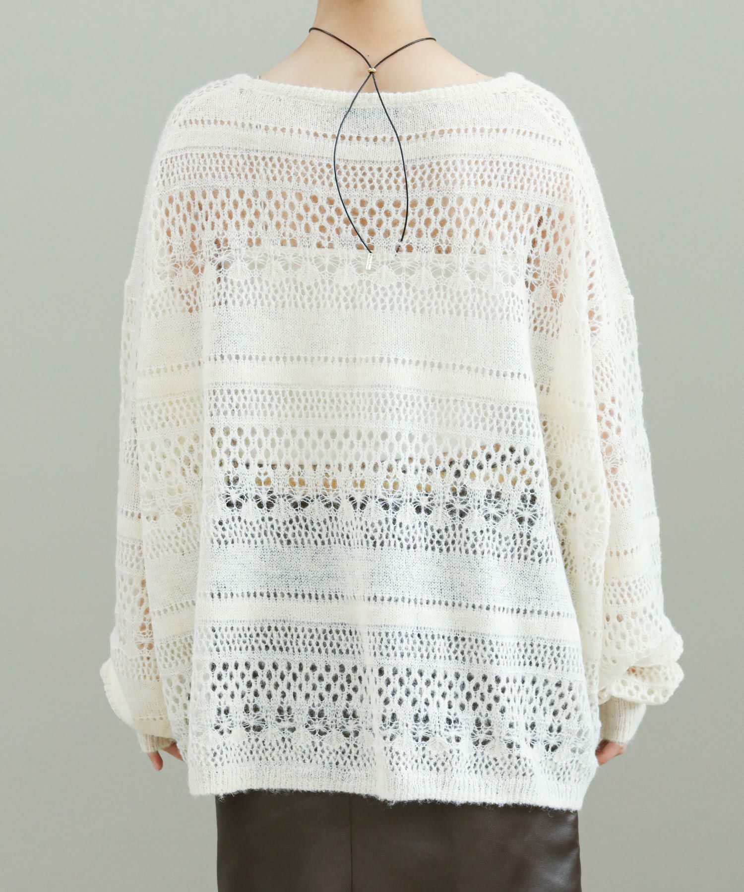 Tシャツやシャツとレイヤードスタイルを楽しめます。繊細なすかし柄が女性らしい雰囲気でデニムスウェットなどカジュアルボトムとも好相性。デコルテをきれいに見せてくれる衿の開きもポイントです。
