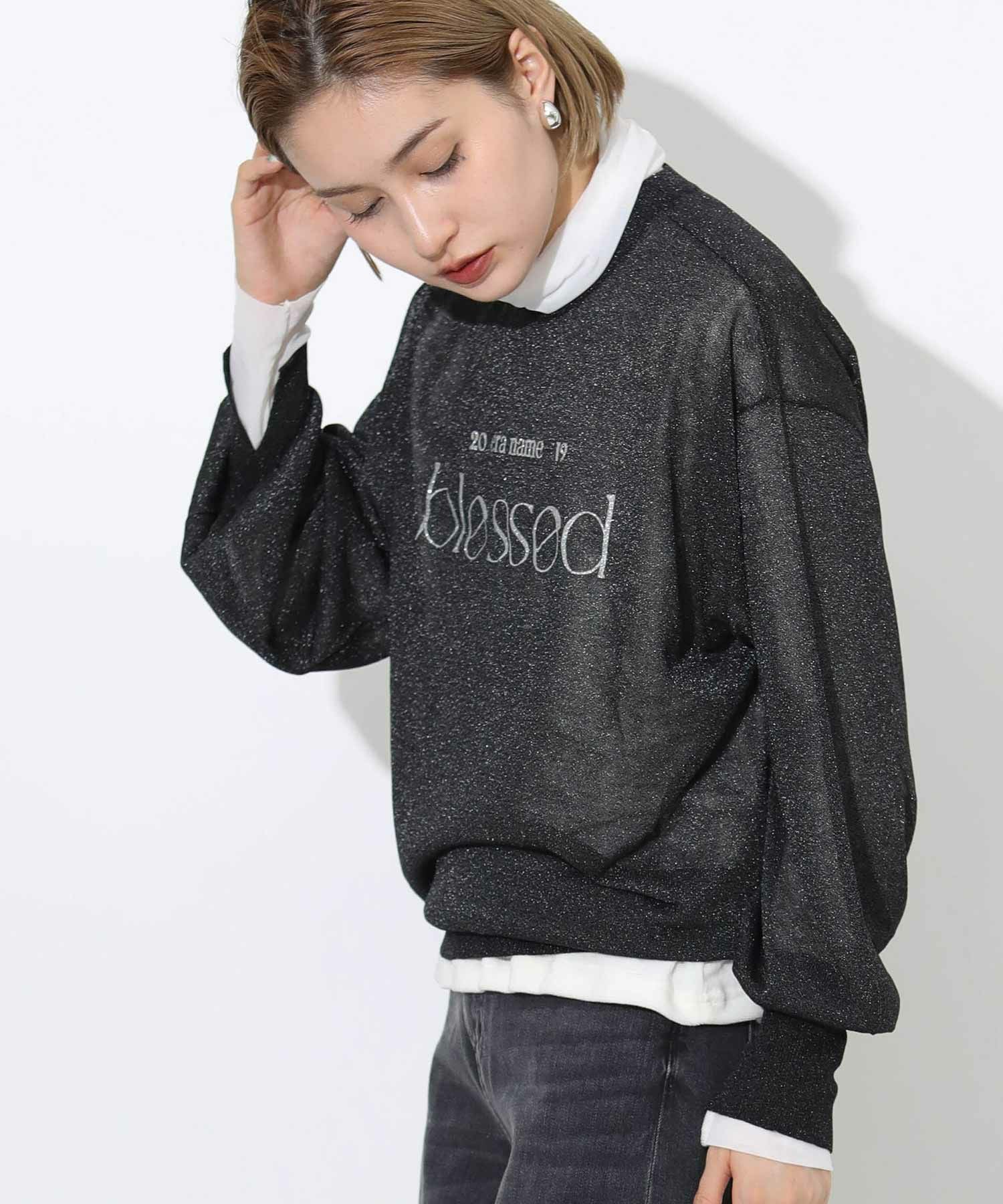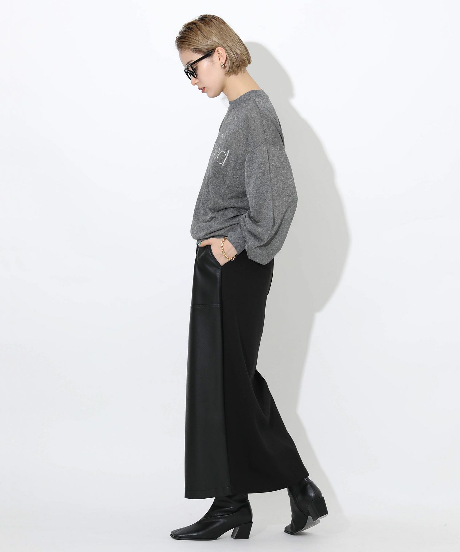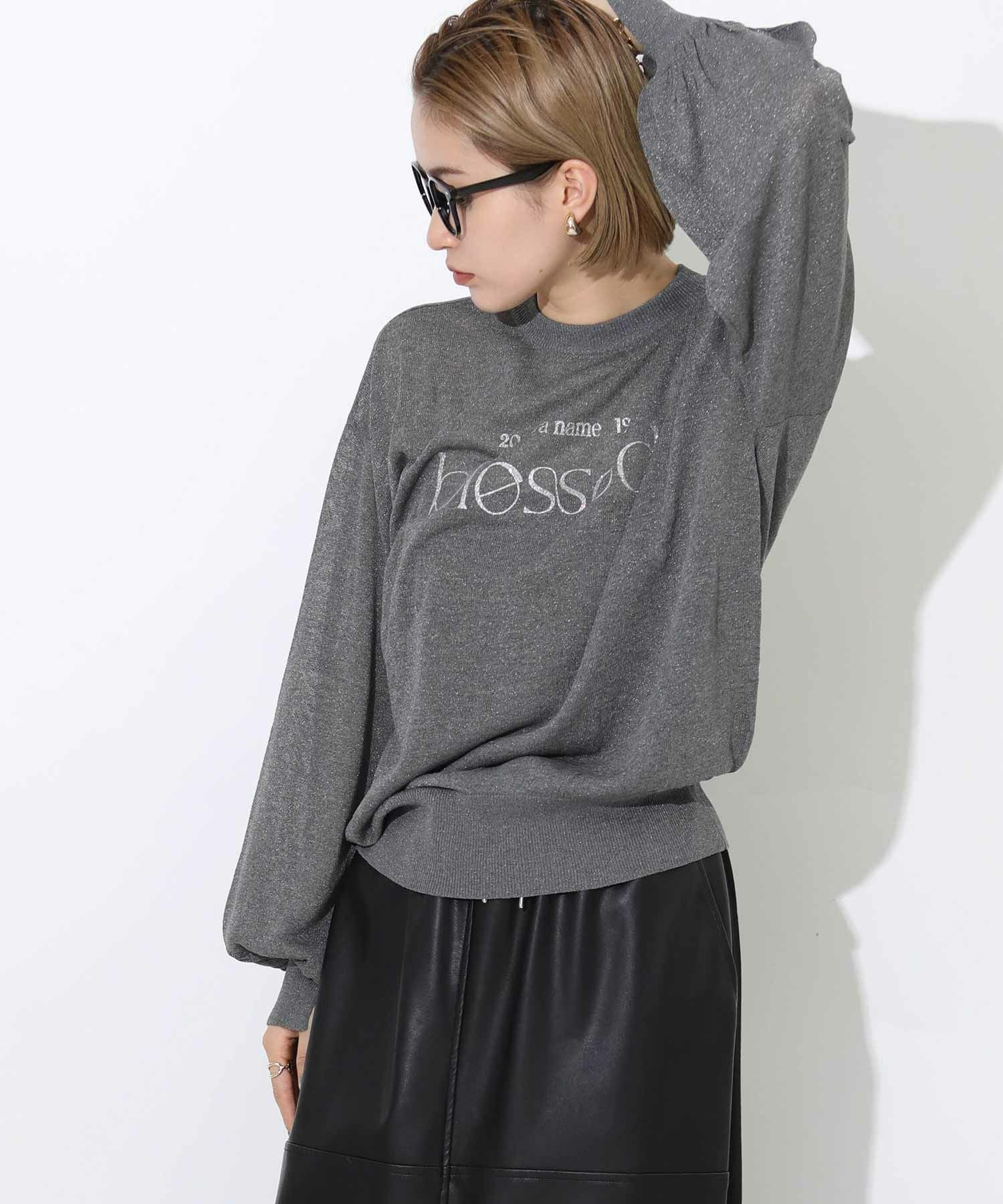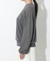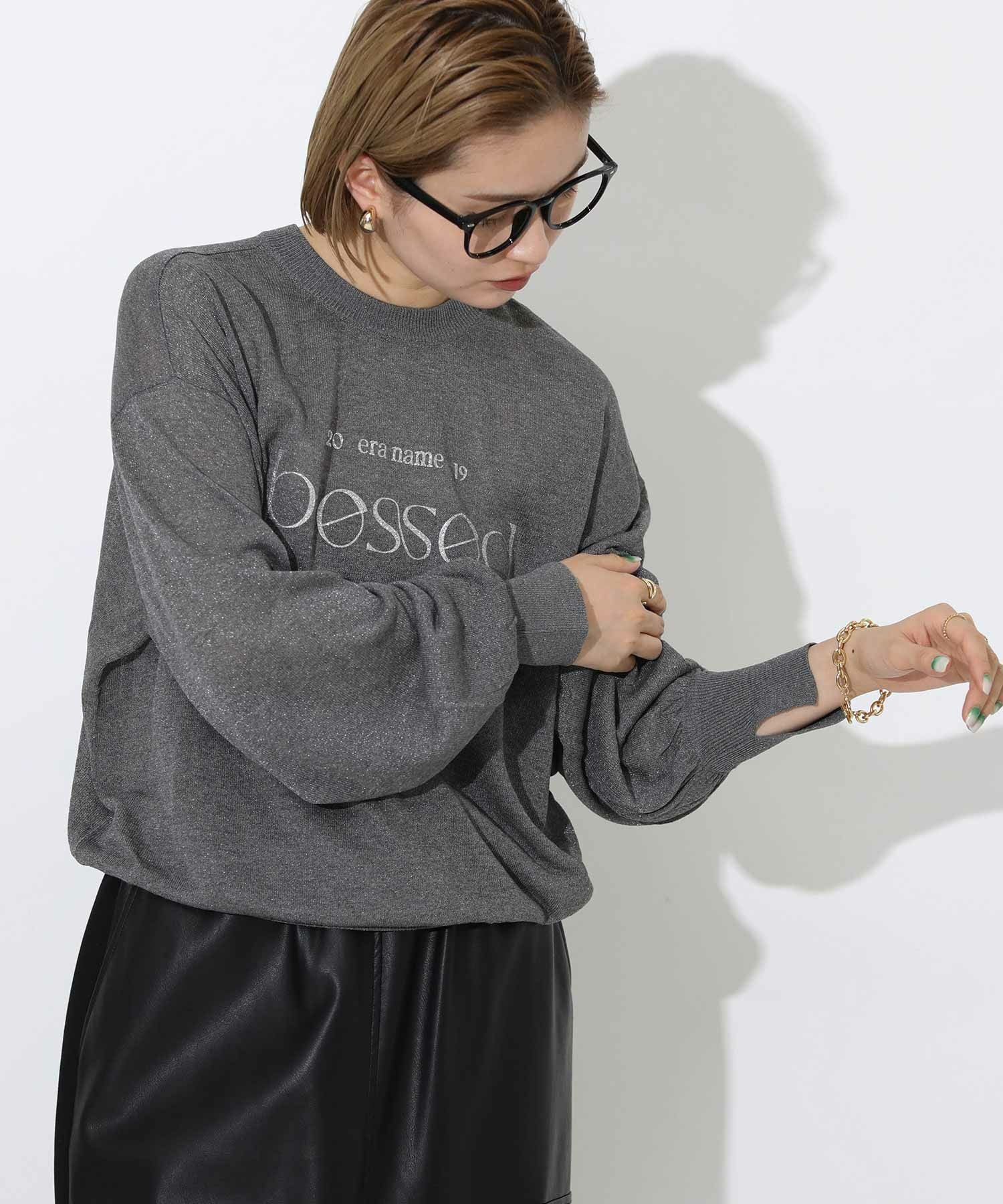 袖のボリューム感がトレンドライクなデザイン。袖口と裾のリブを幅広にすることでメリハリのあるシルエットに。袖口のスリットがさりげないポイント。前後2wayで着られて、シルバーの箔プリントが目を惹きます。