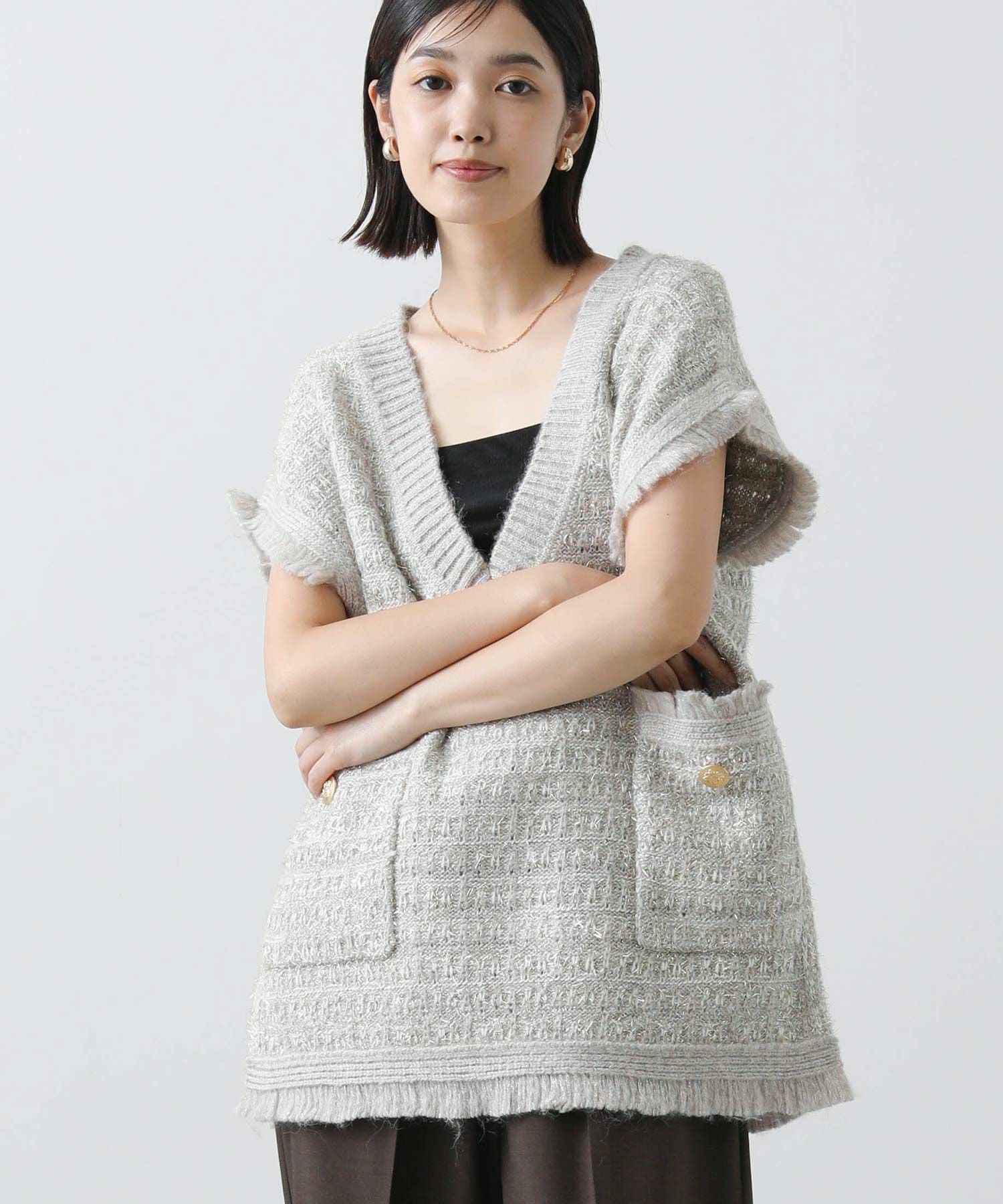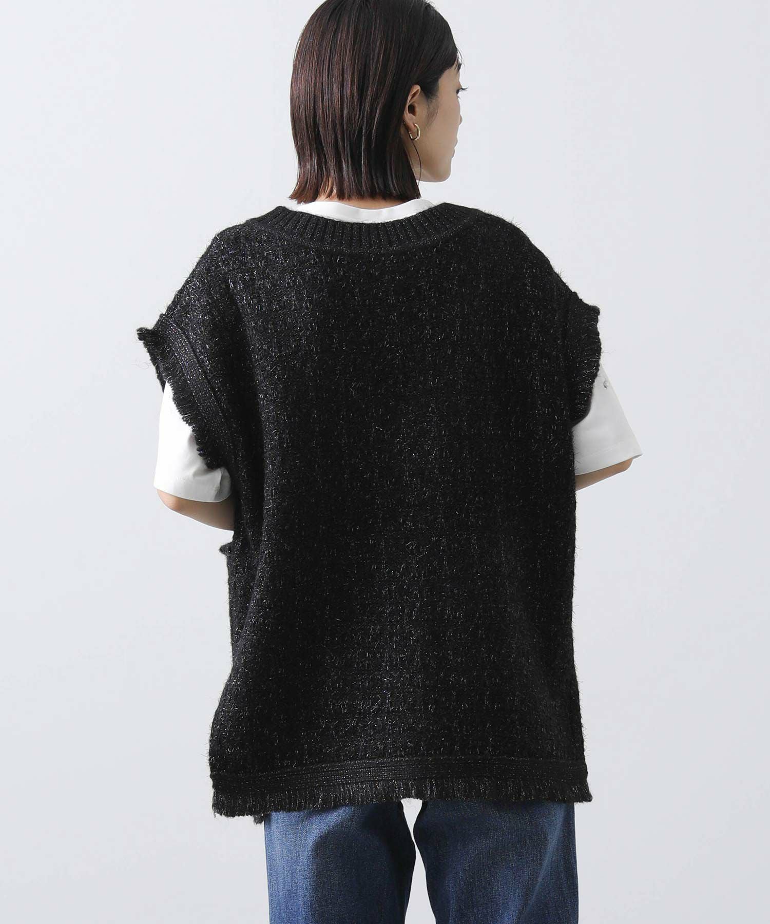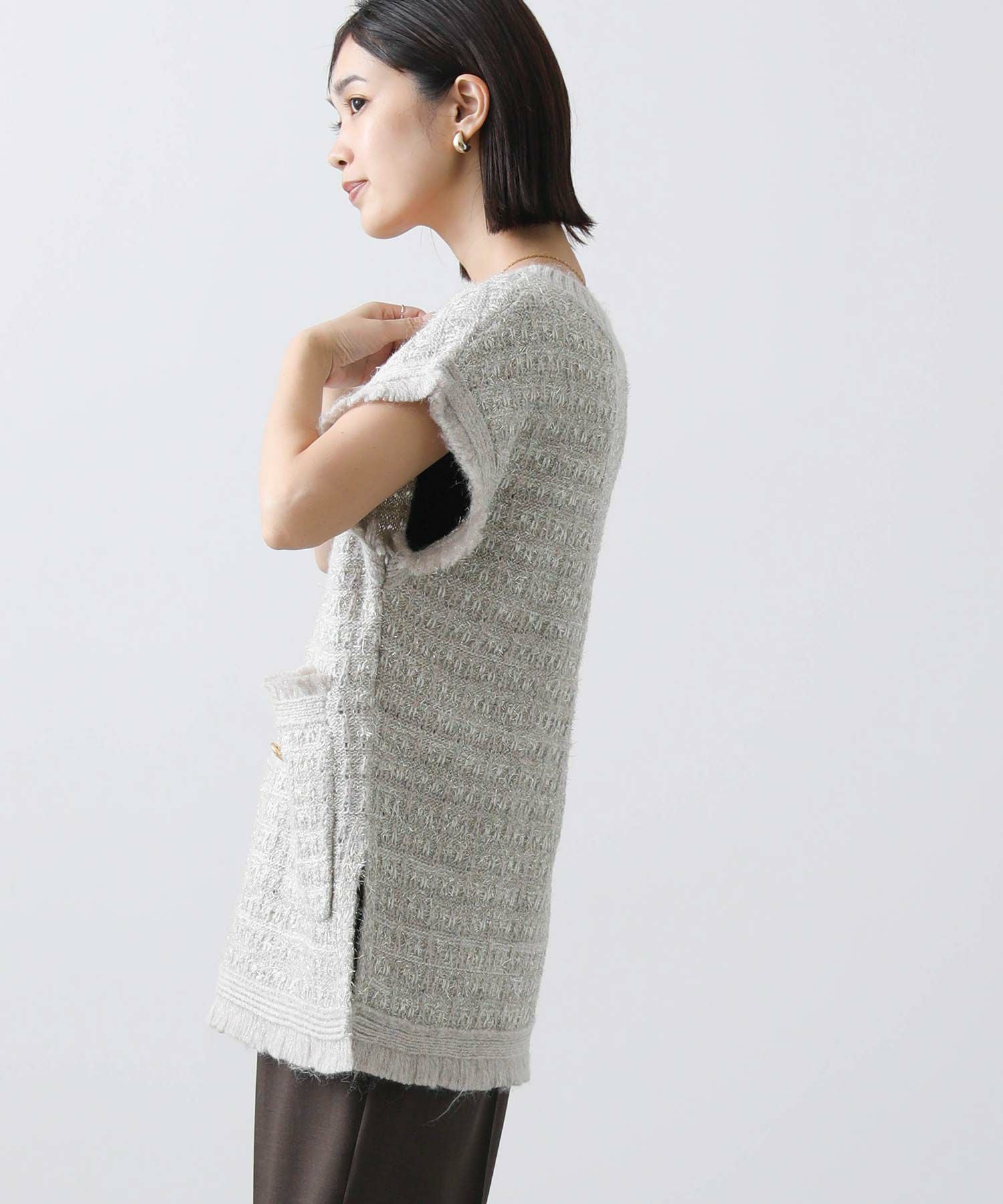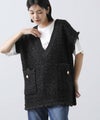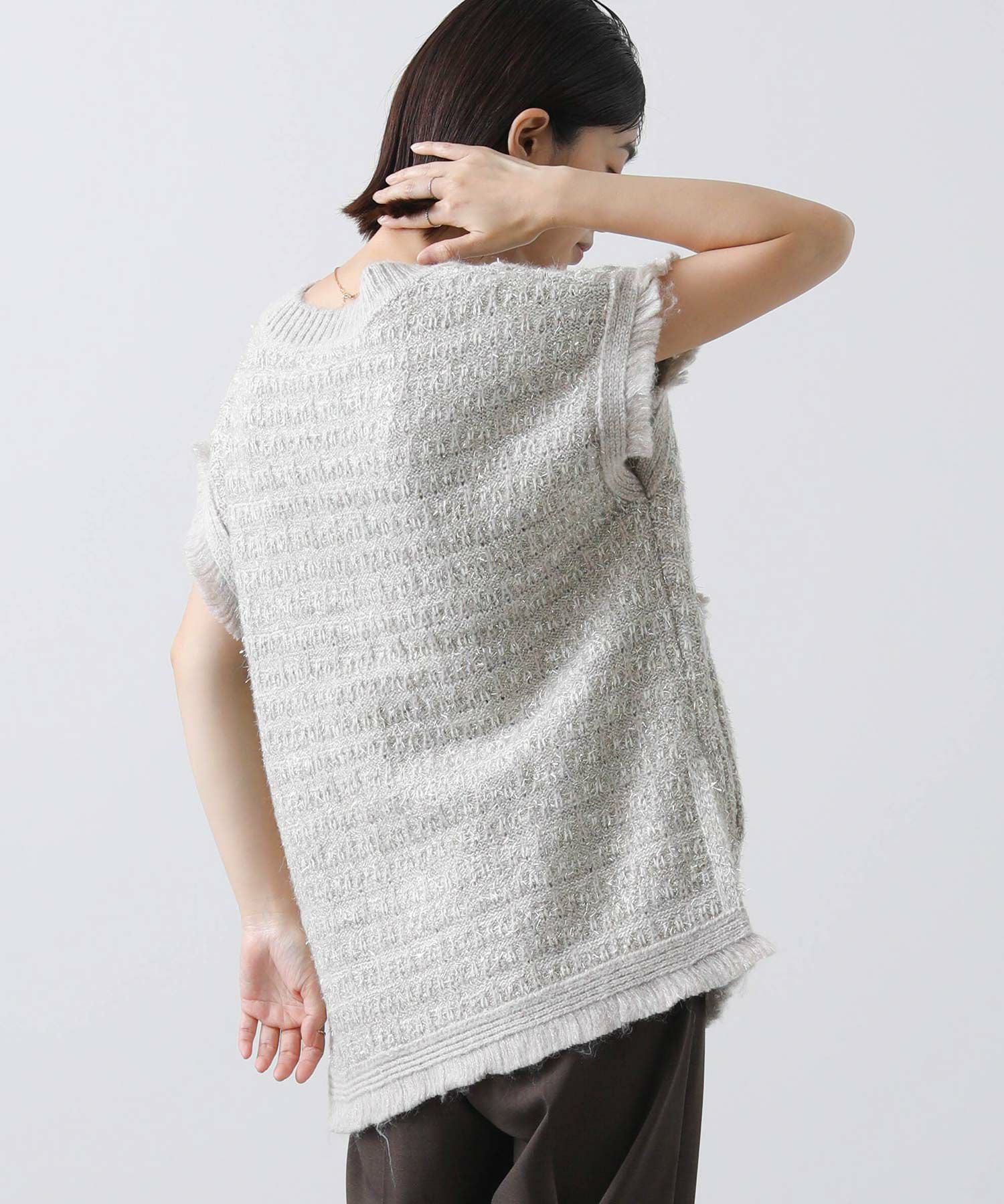 意匠糸を使用し、ツイード見えするよう編み上げ、ゆったりとしたシルエットで、レイヤードしやすいサイズ感がポイント。