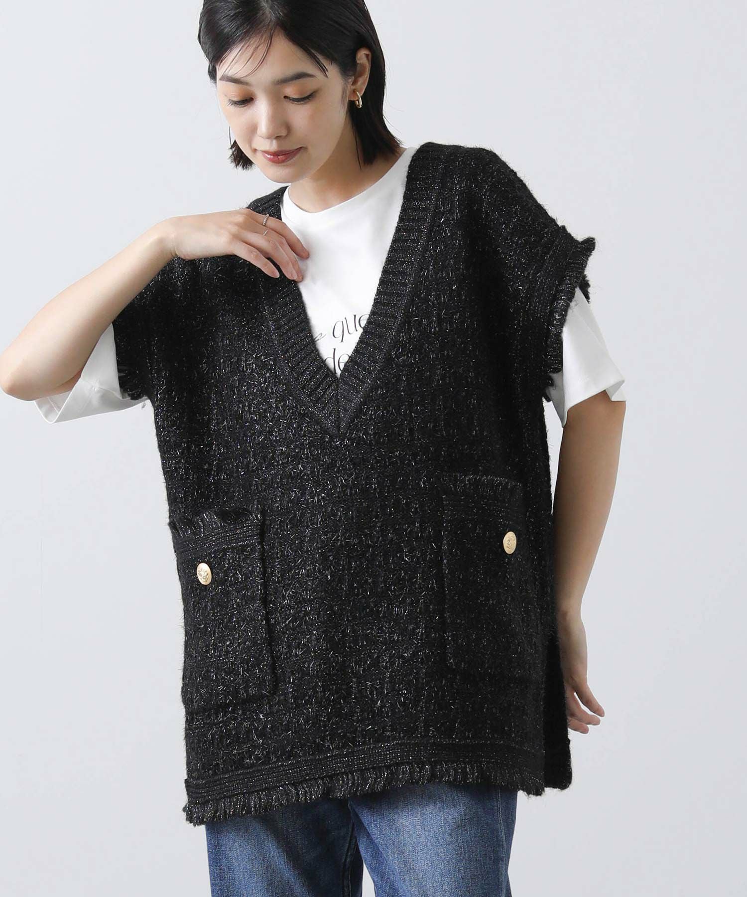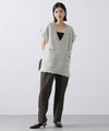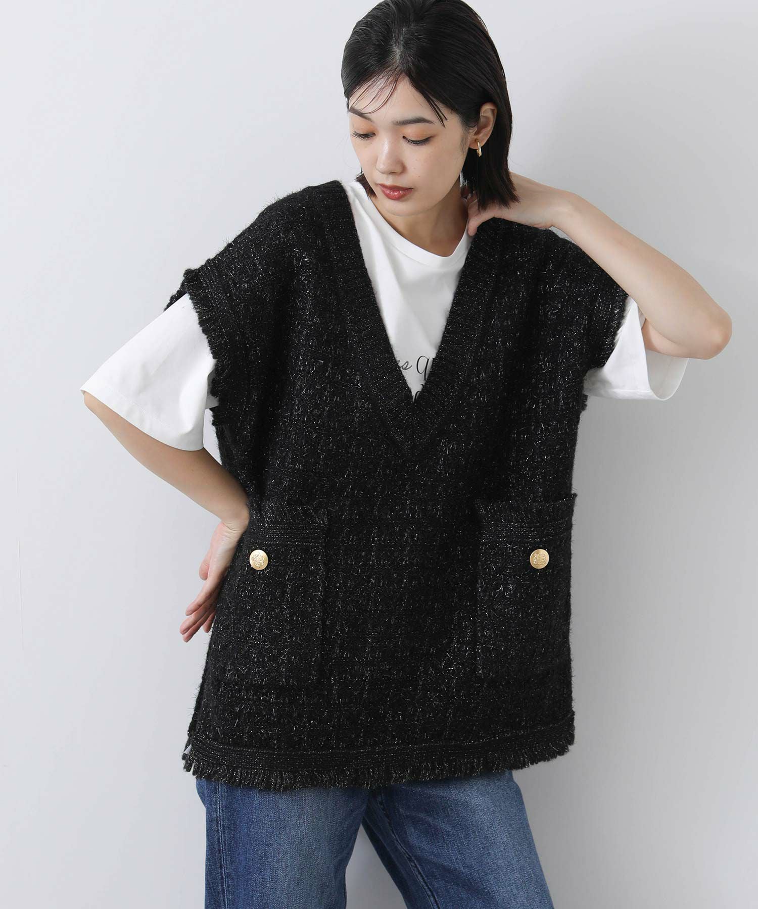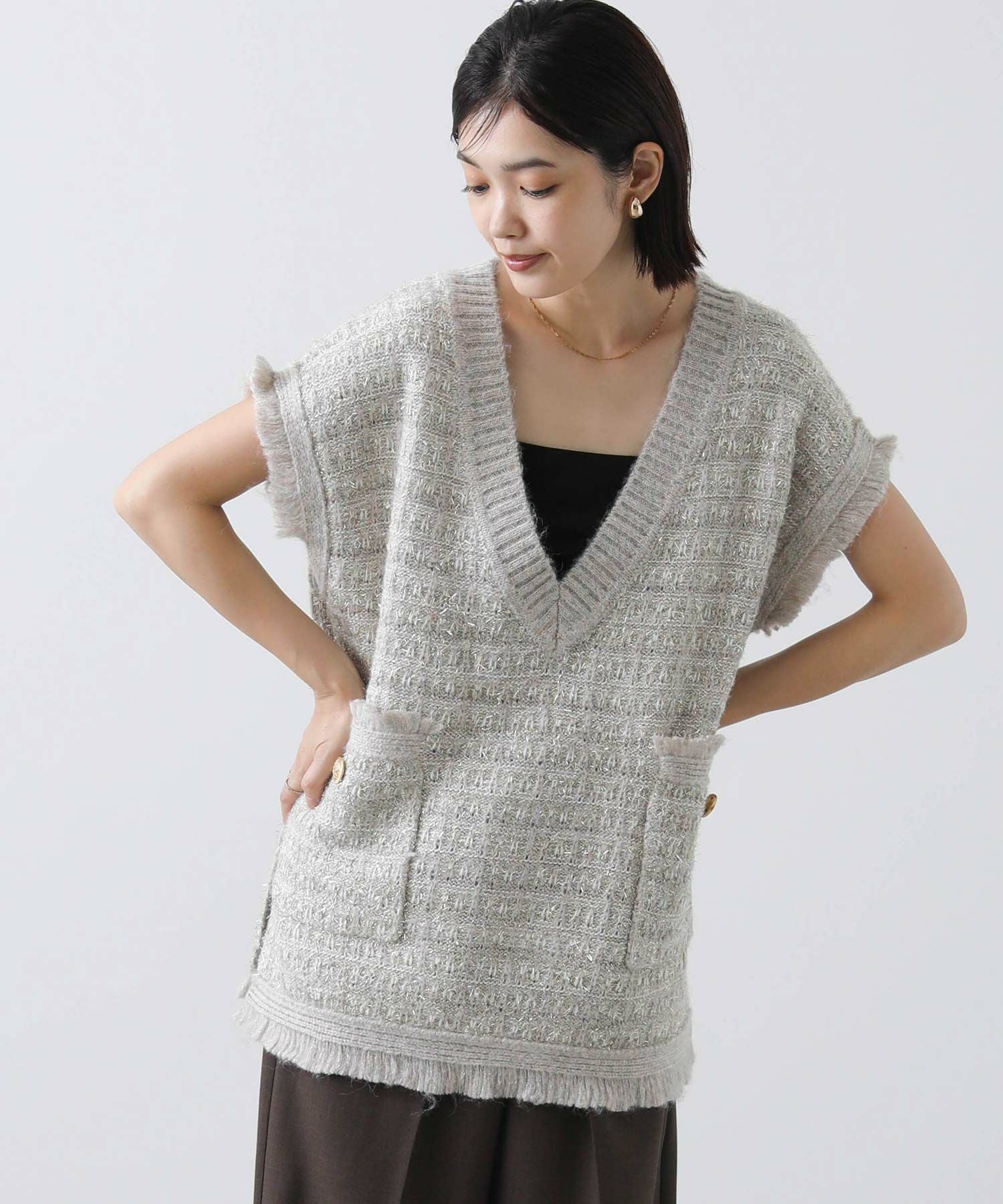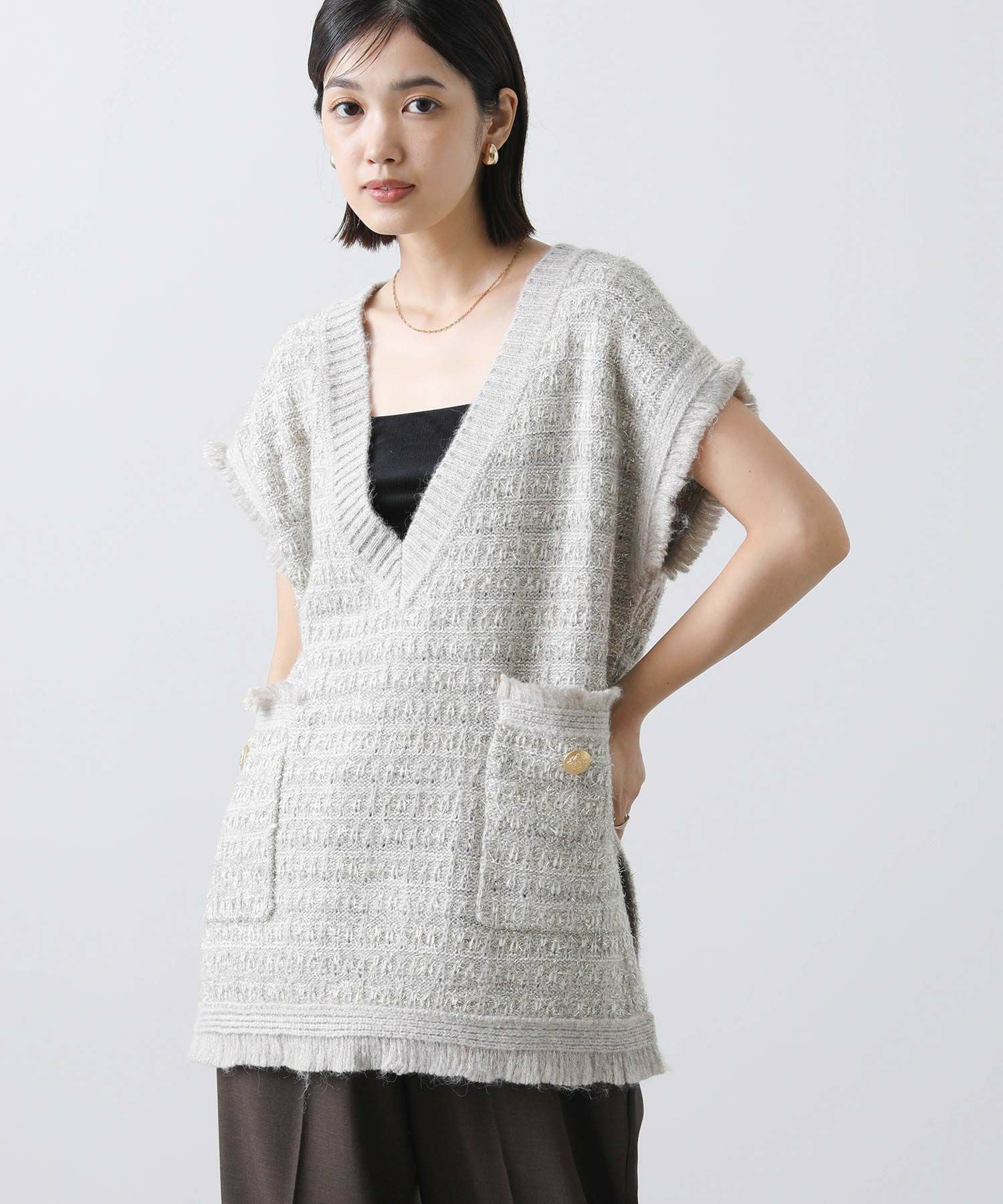 意匠糸を使用し、ツイード見えするよう編み上げ、ゆったりとしたシルエットで、レイヤードしやすいサイズ感がポイント。