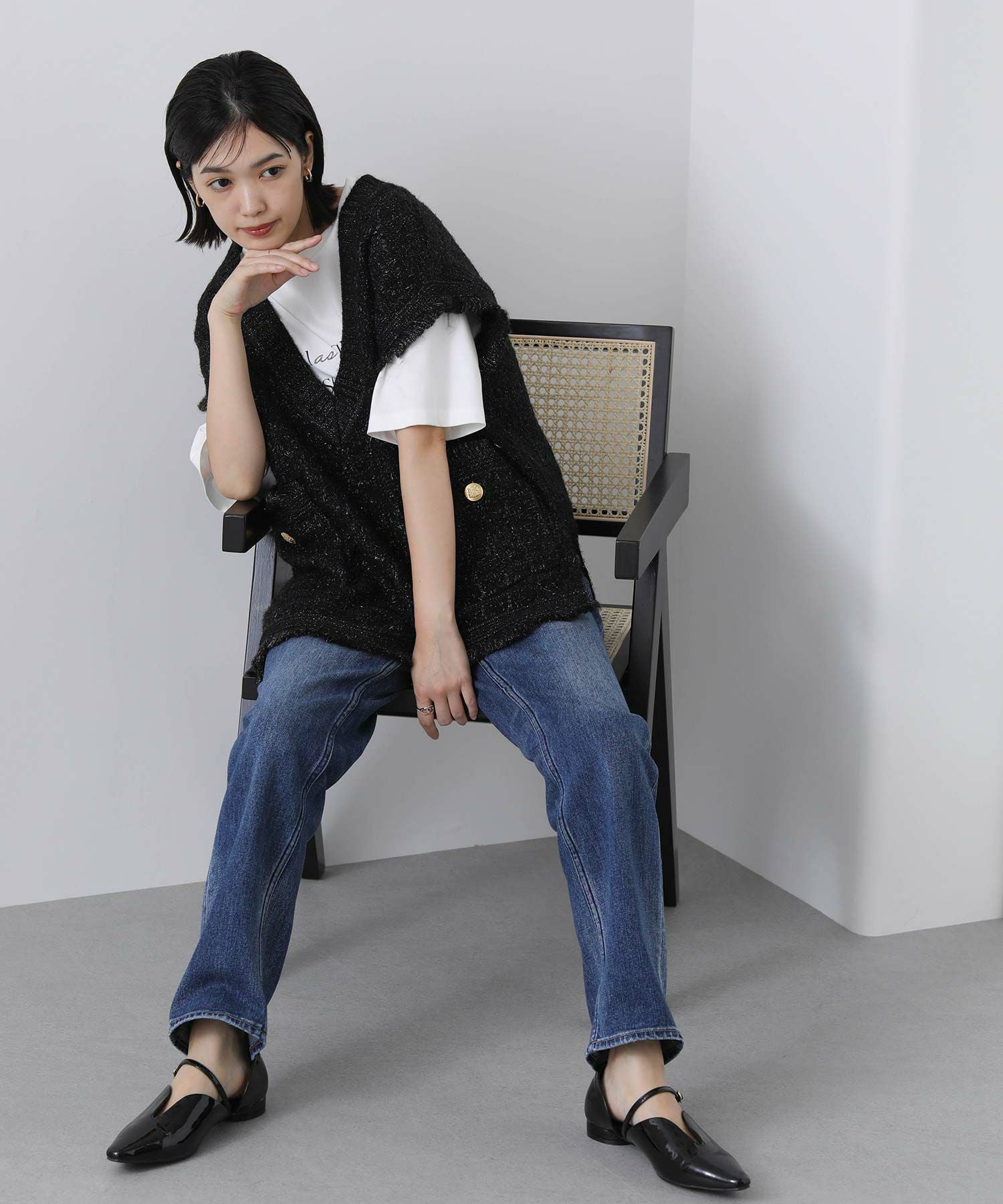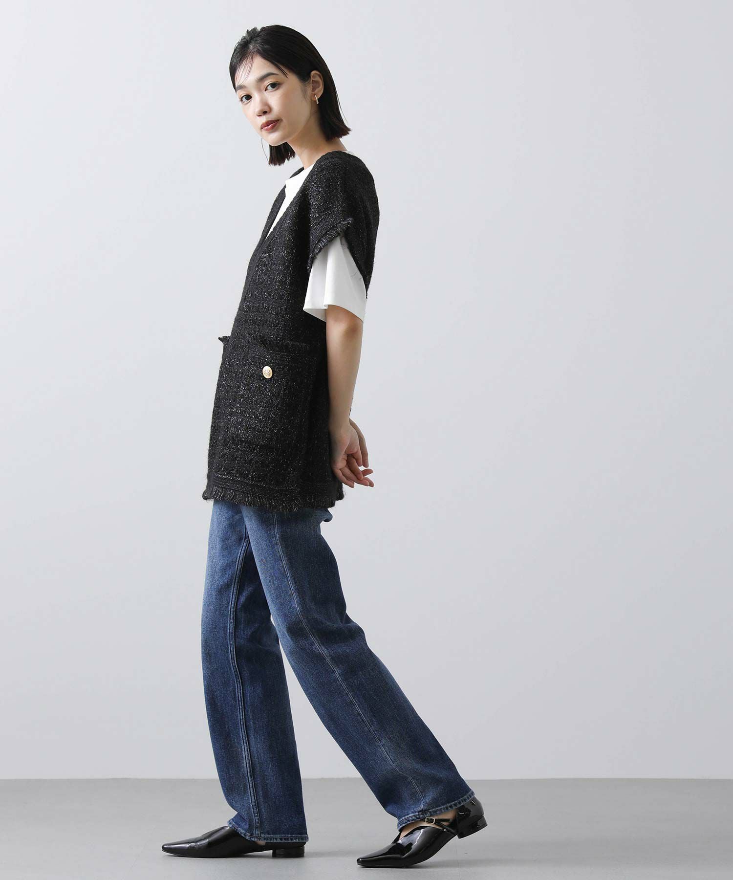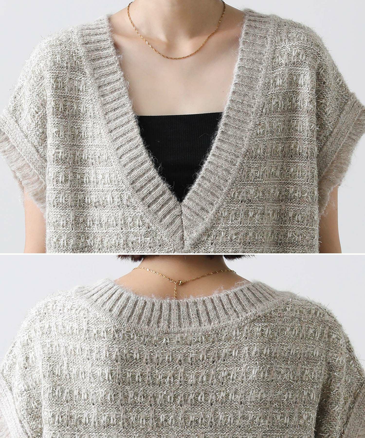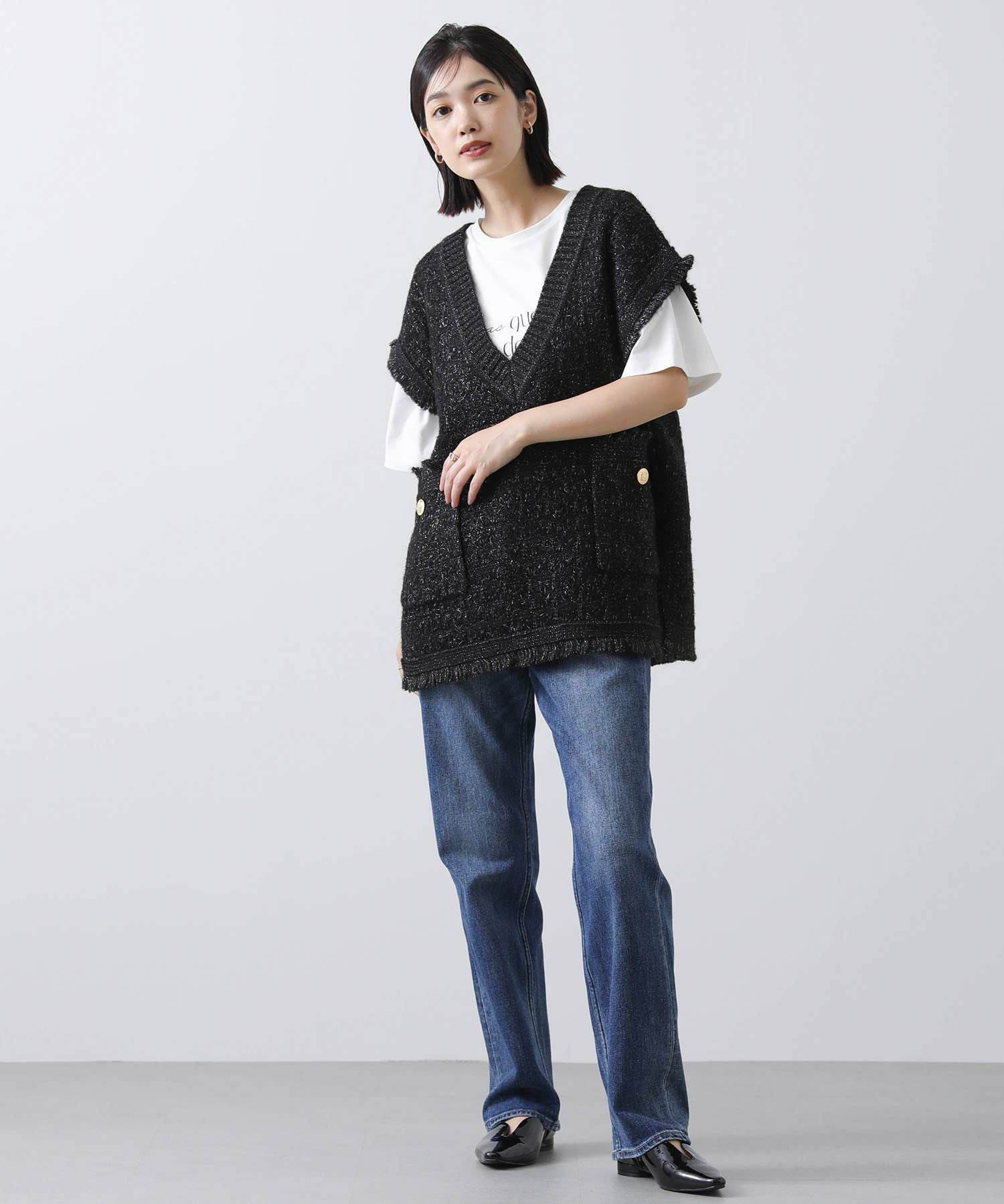 意匠糸を使用し、ツイード見えするよう編み上げ、ゆったりとしたシルエットで、レイヤードしやすいサイズ感がポイント。