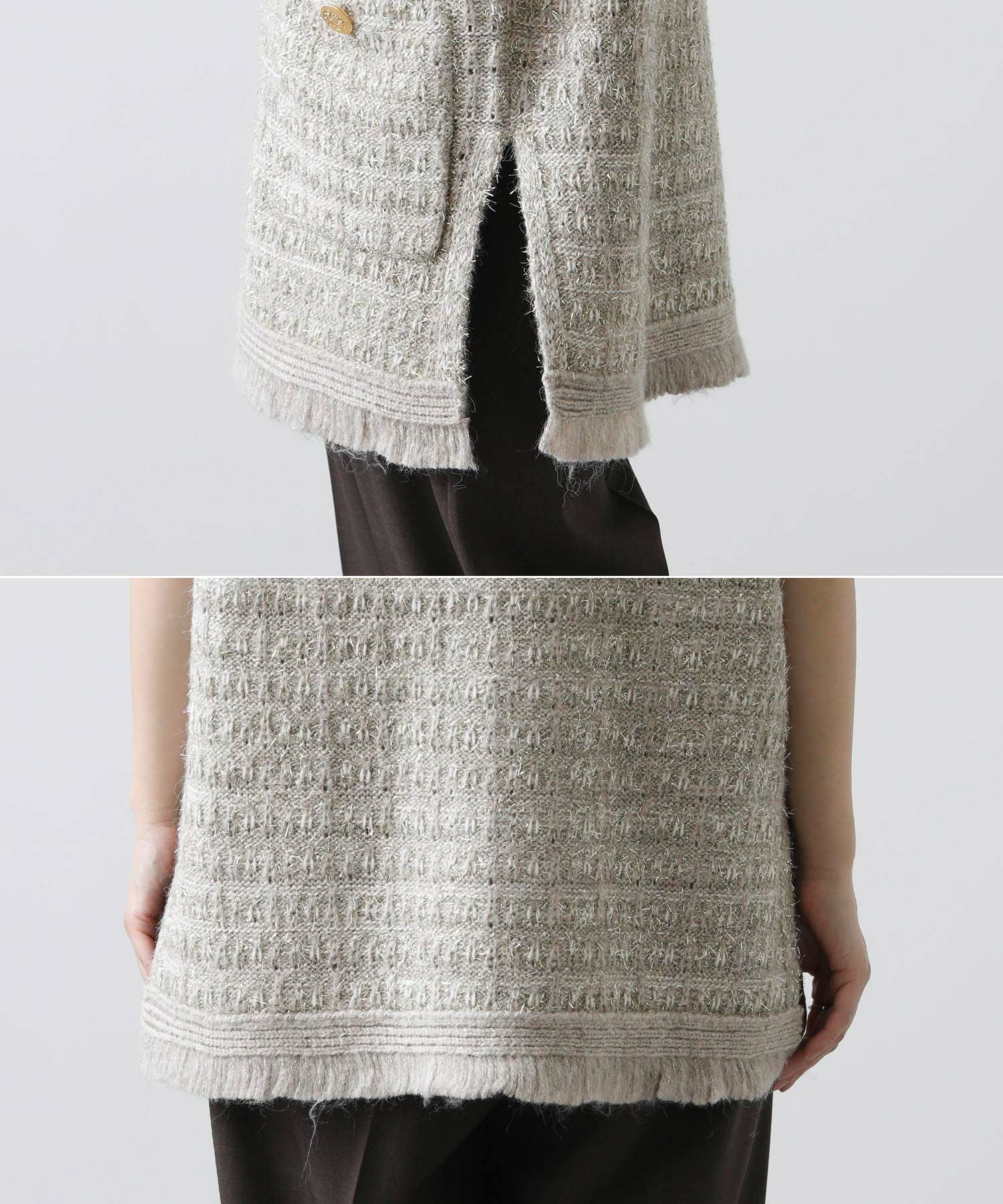 袖口や裾にあしらったフリンジディテールが華やかで、存在感あるベスト。