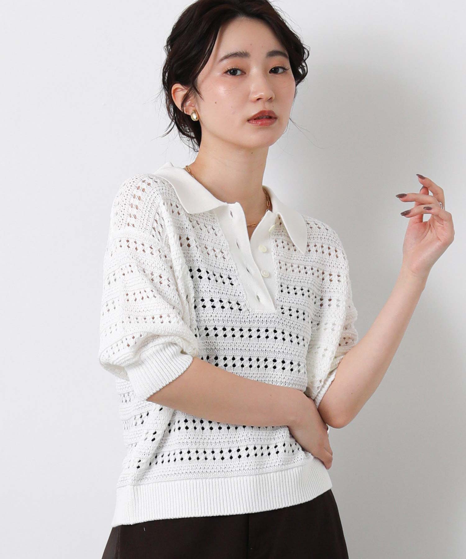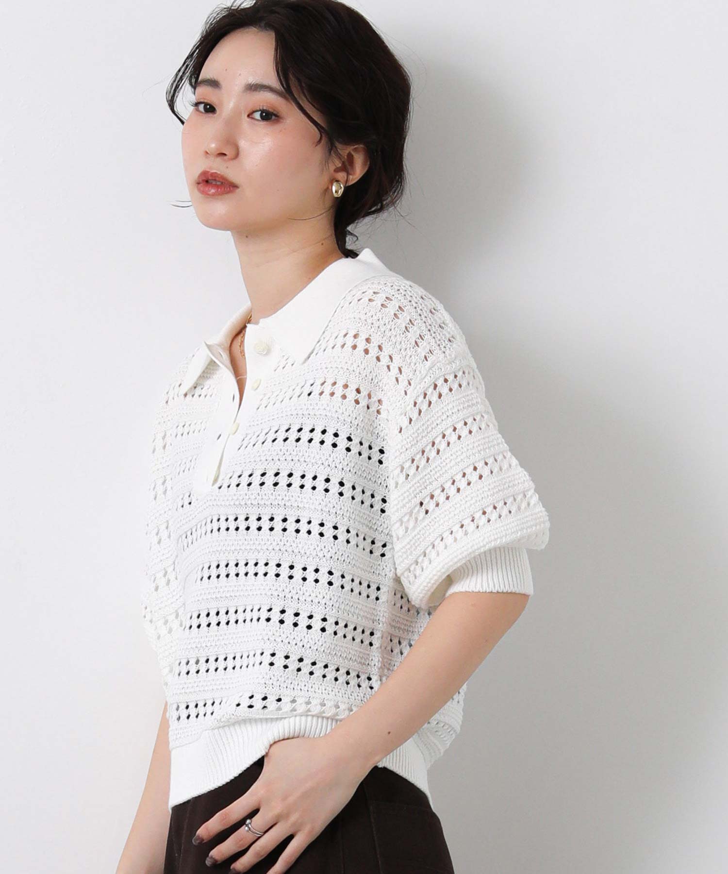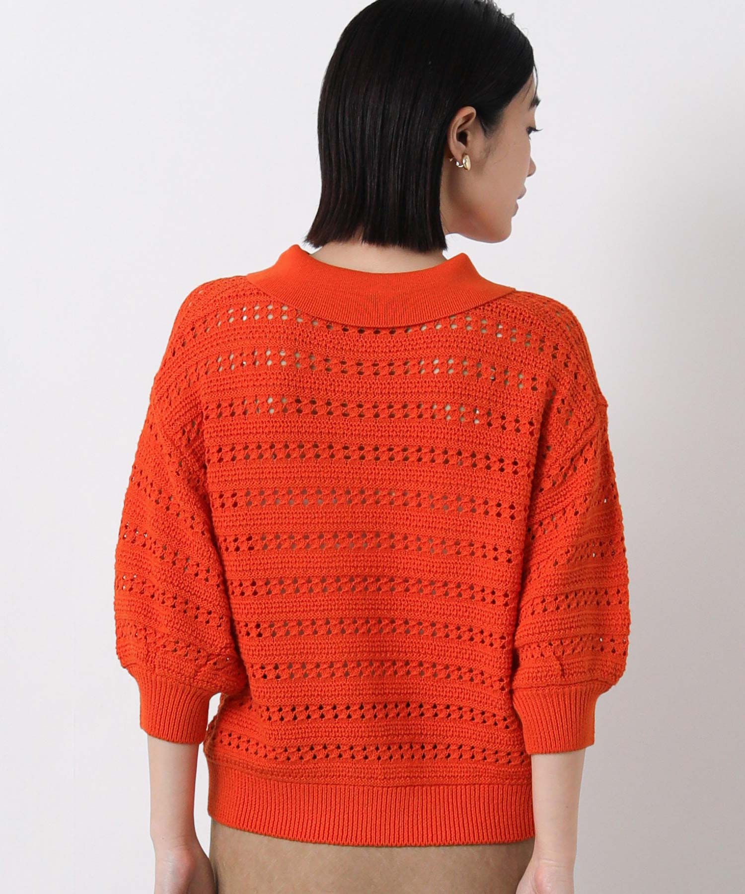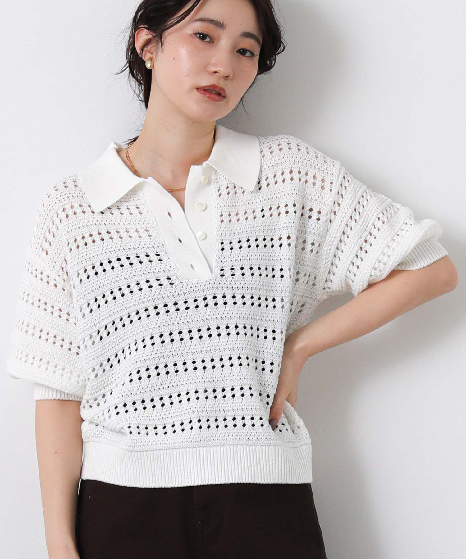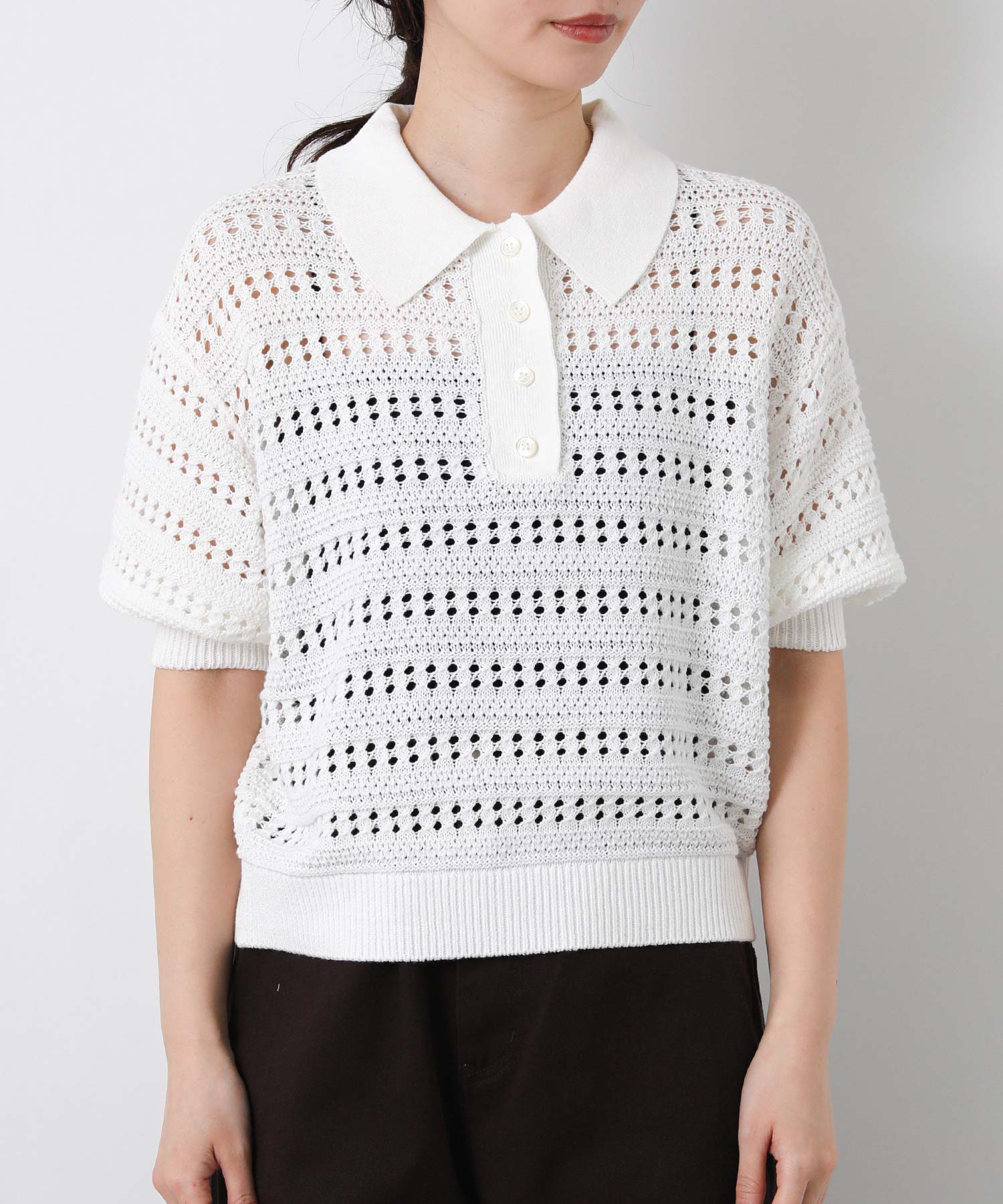 すかし柄5分袖ポロニット