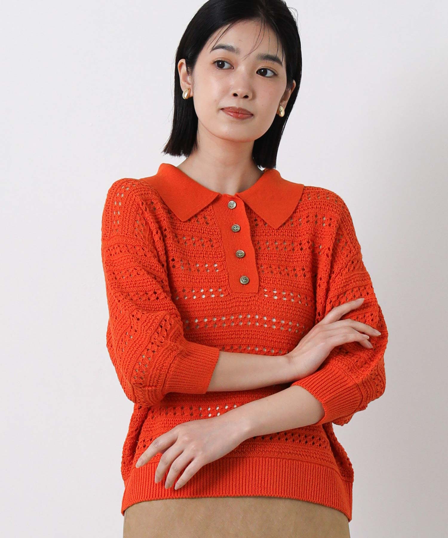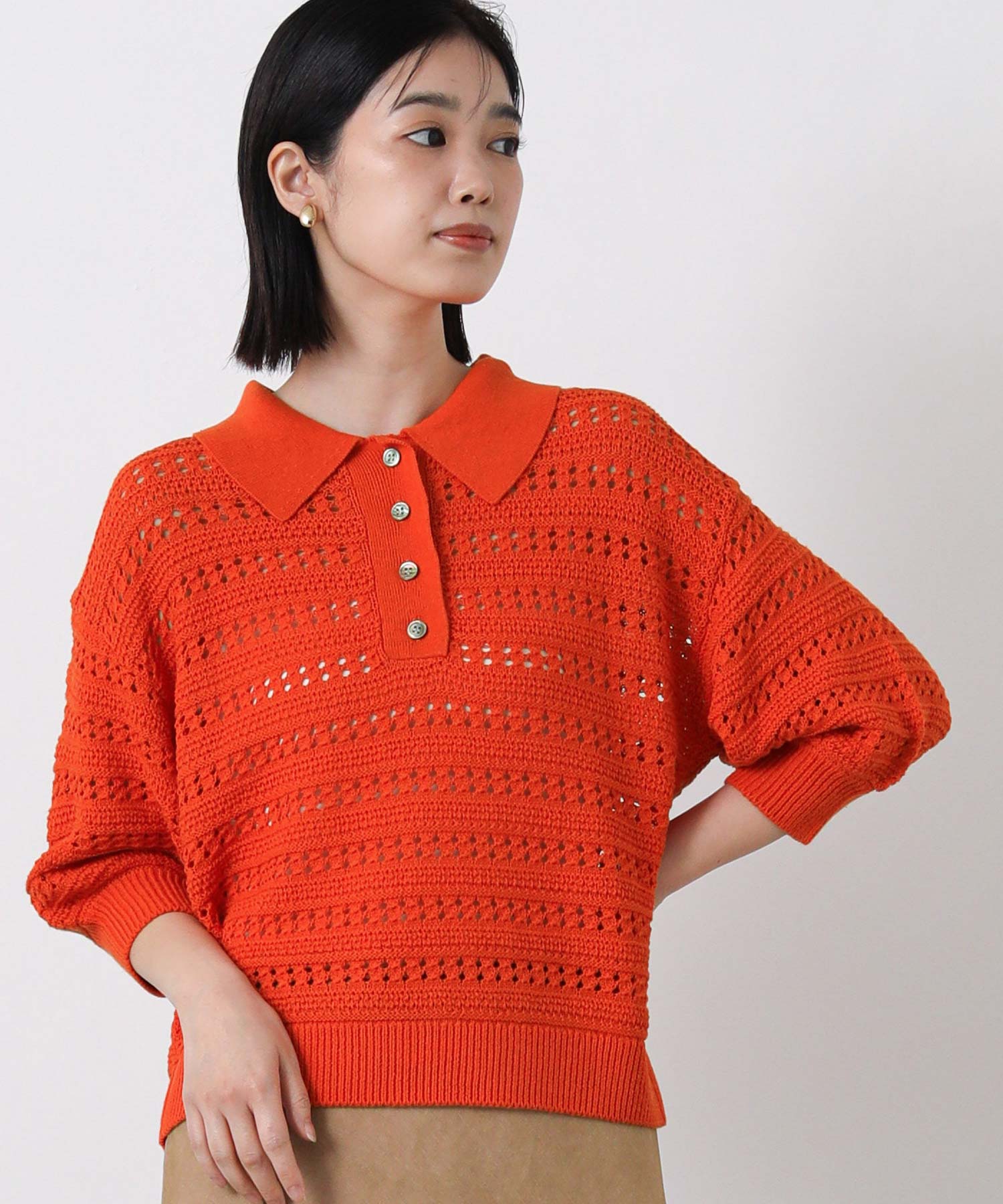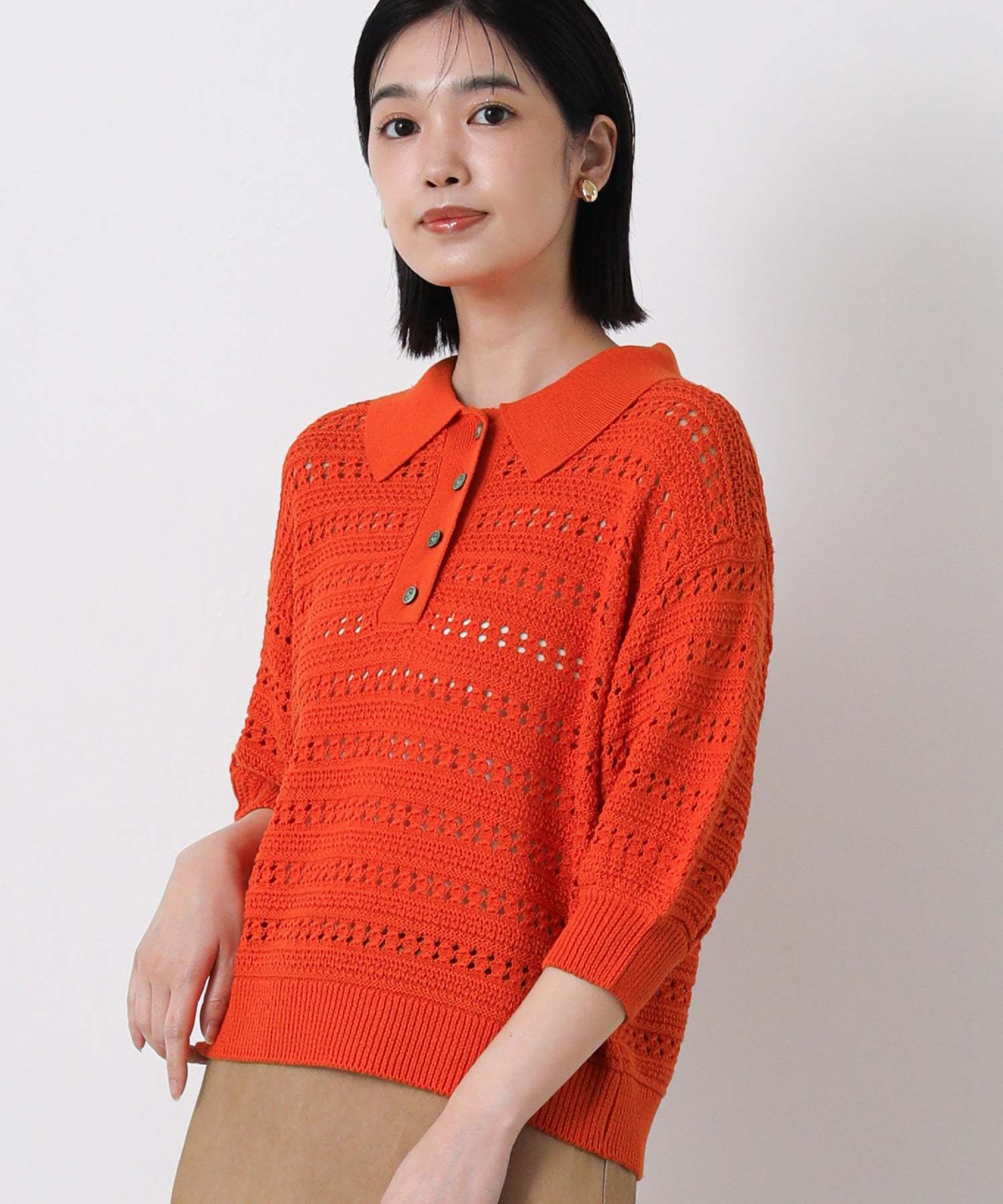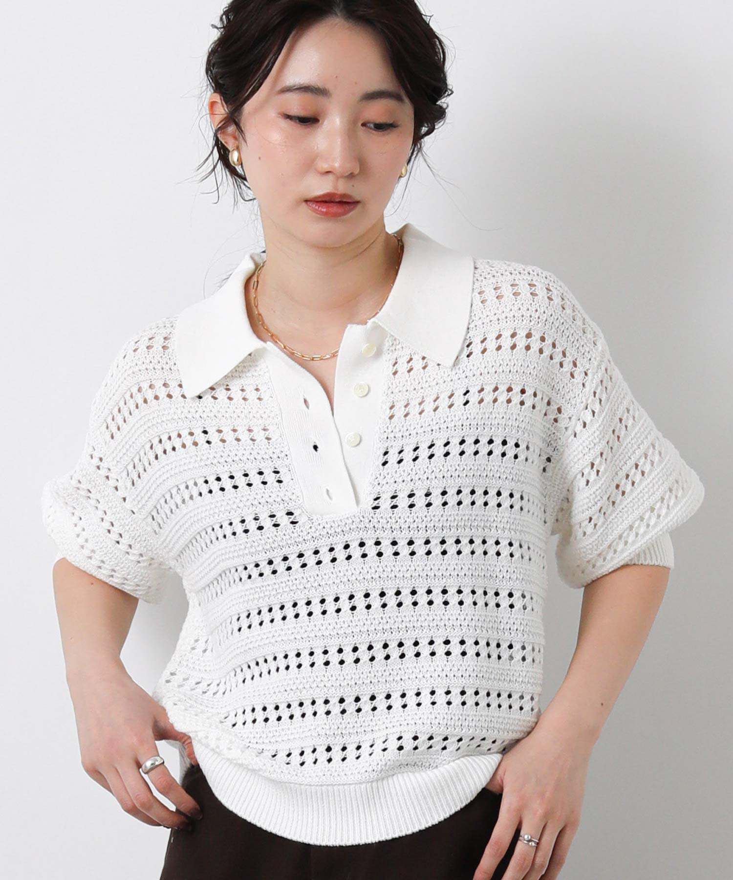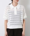 すかし柄5分袖ポロニット