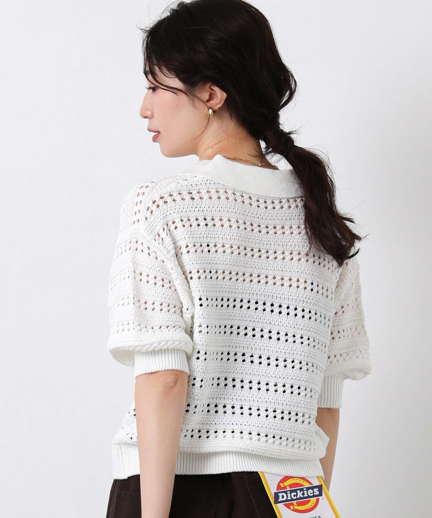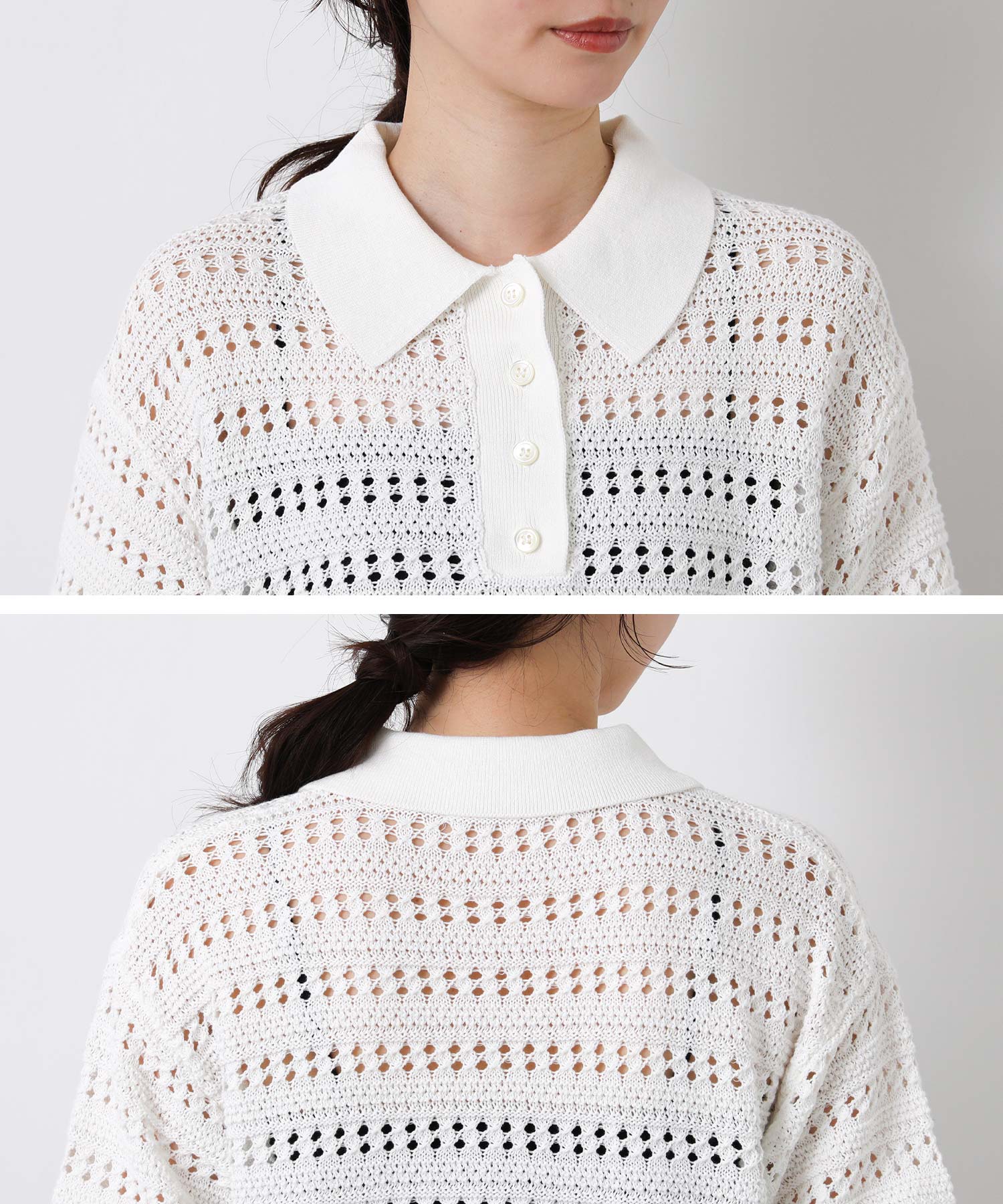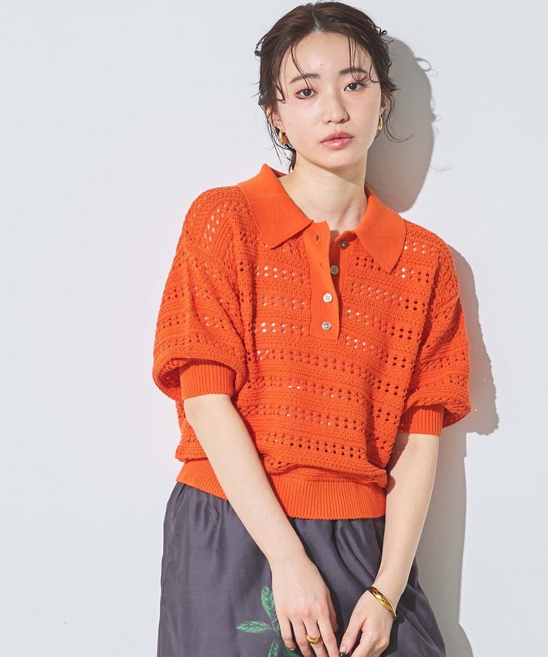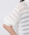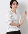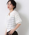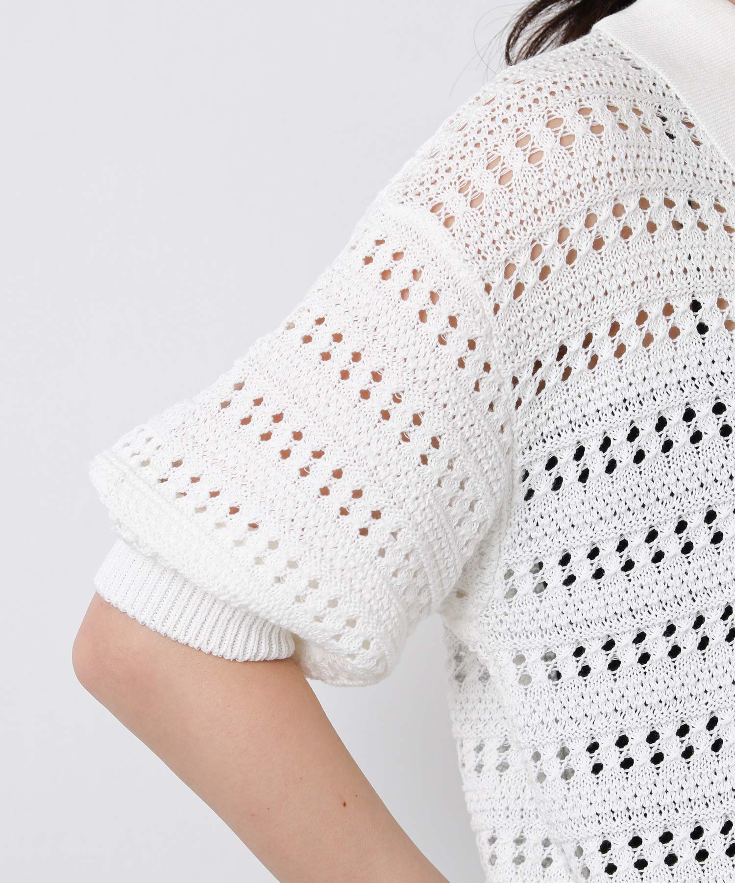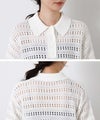 襟付きでありながら、レース調の透かし編みとパフスリーブでフェミニンな雰囲気に。