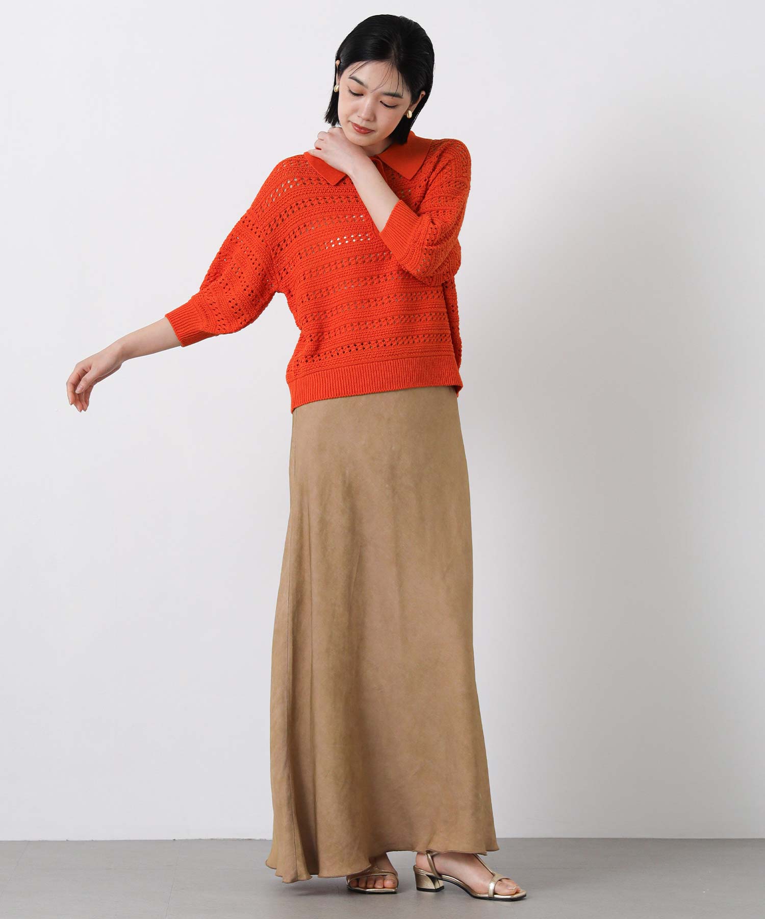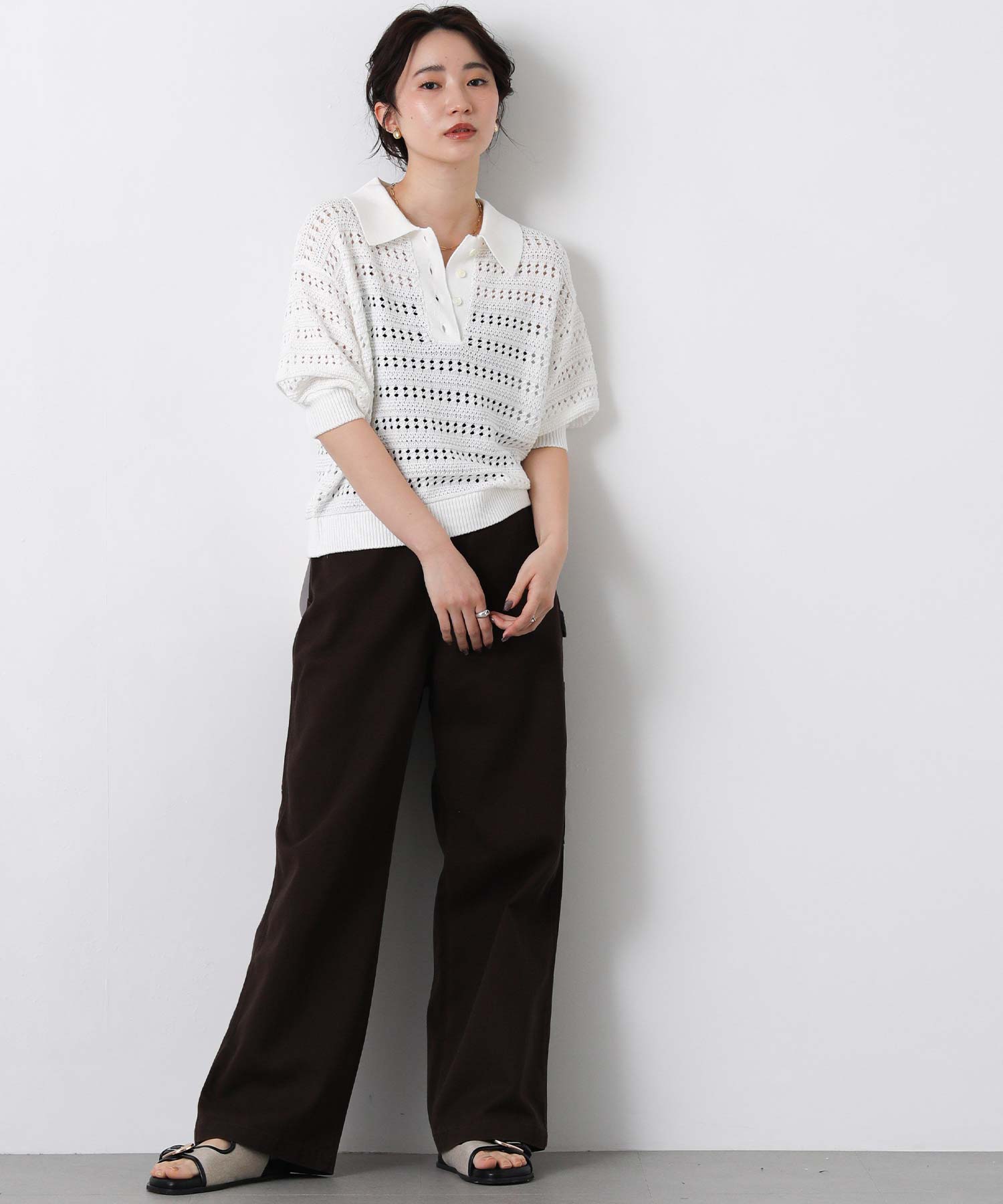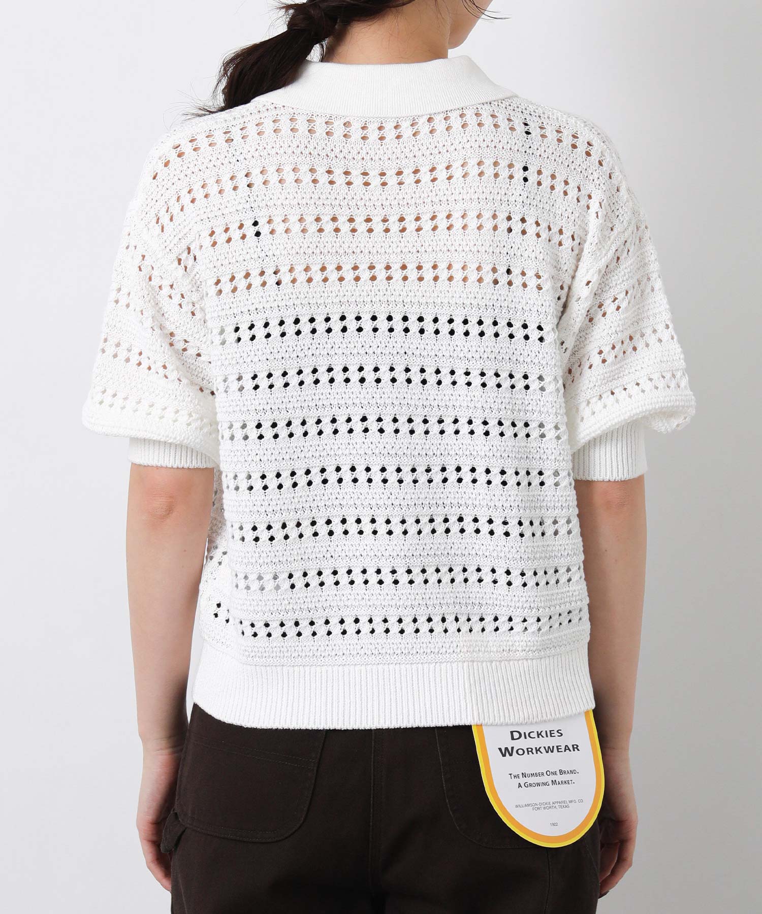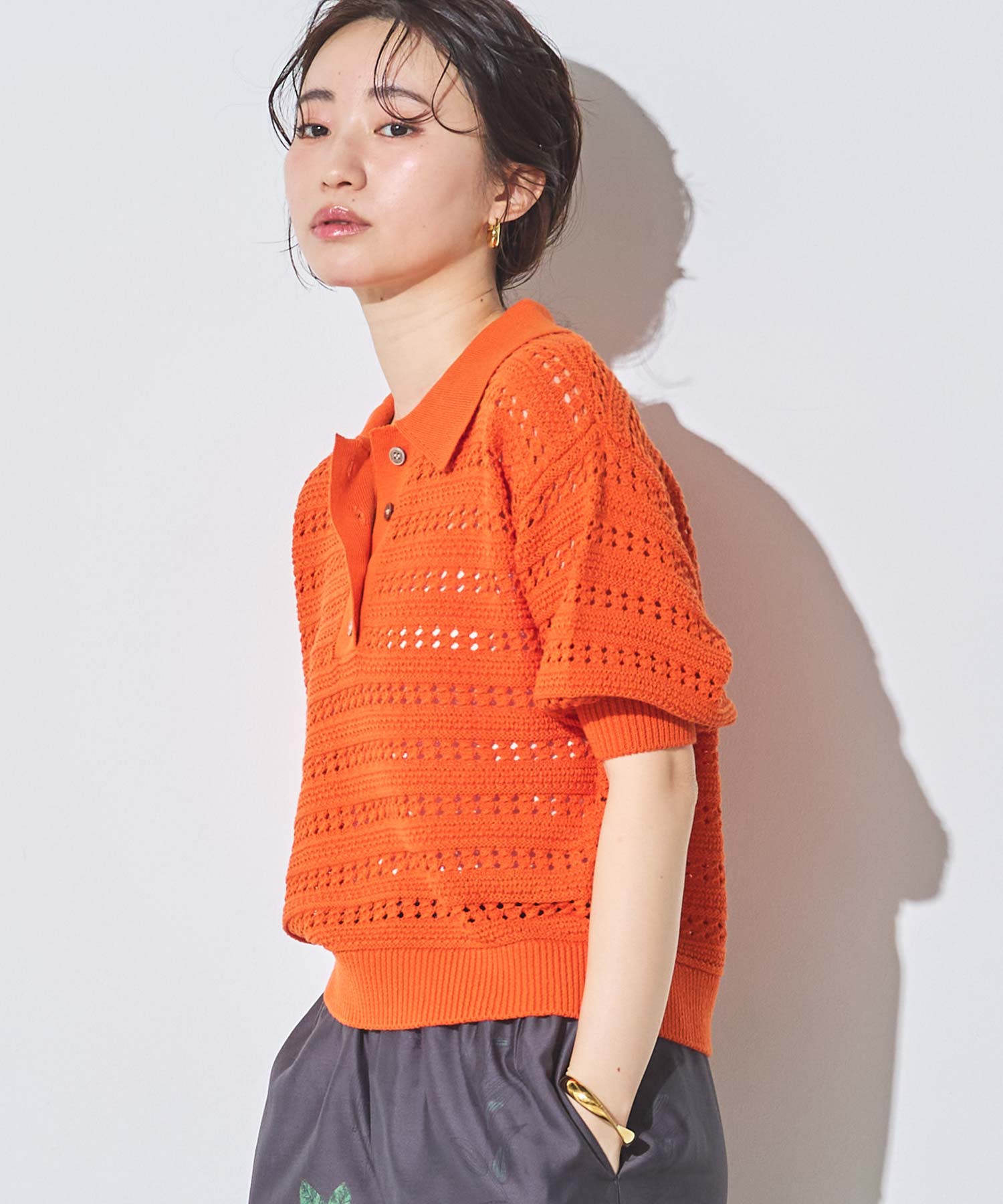 襟付きでありながら、レース調の透かし編みとパフスリーブでフェミニンな雰囲気に。