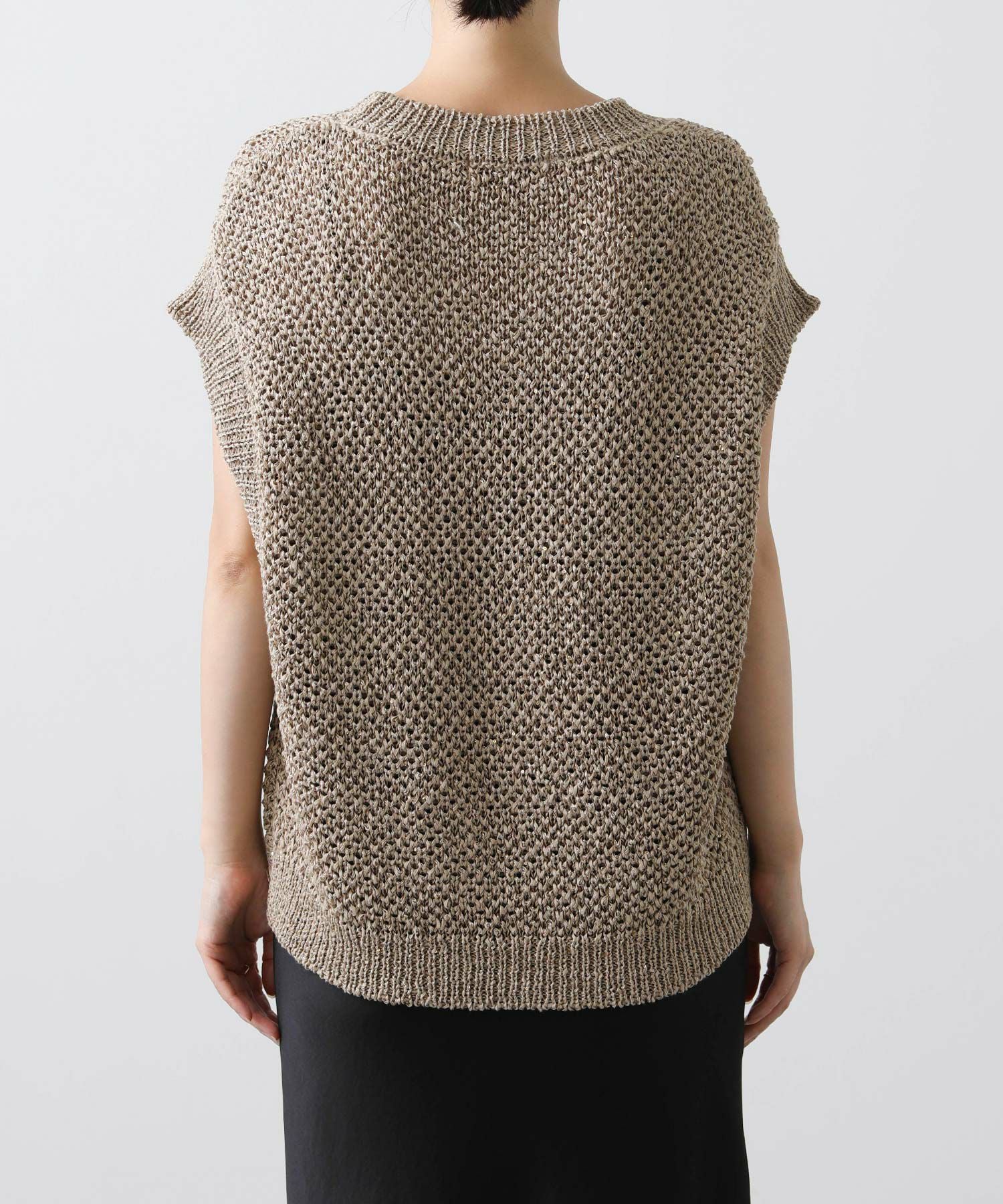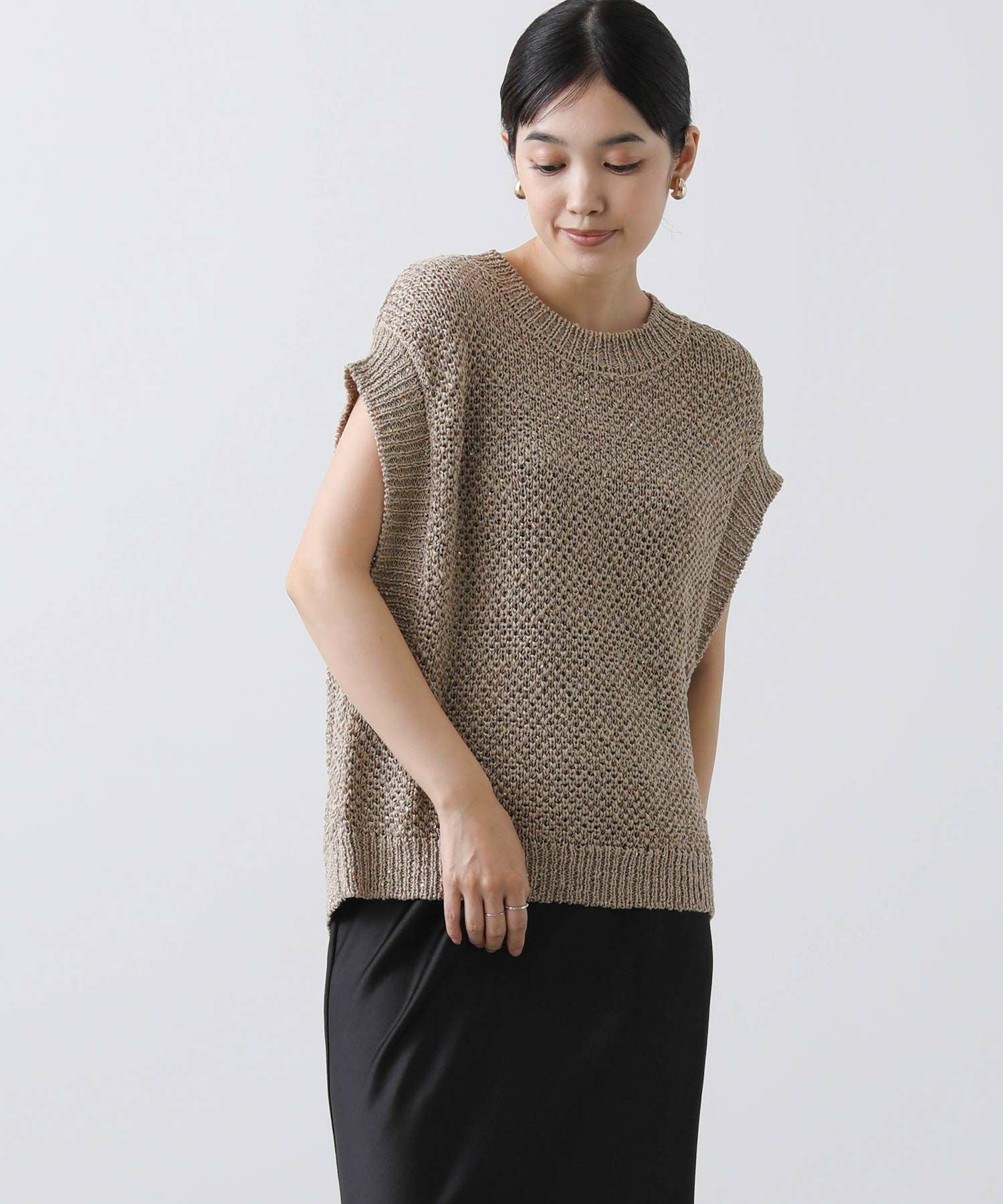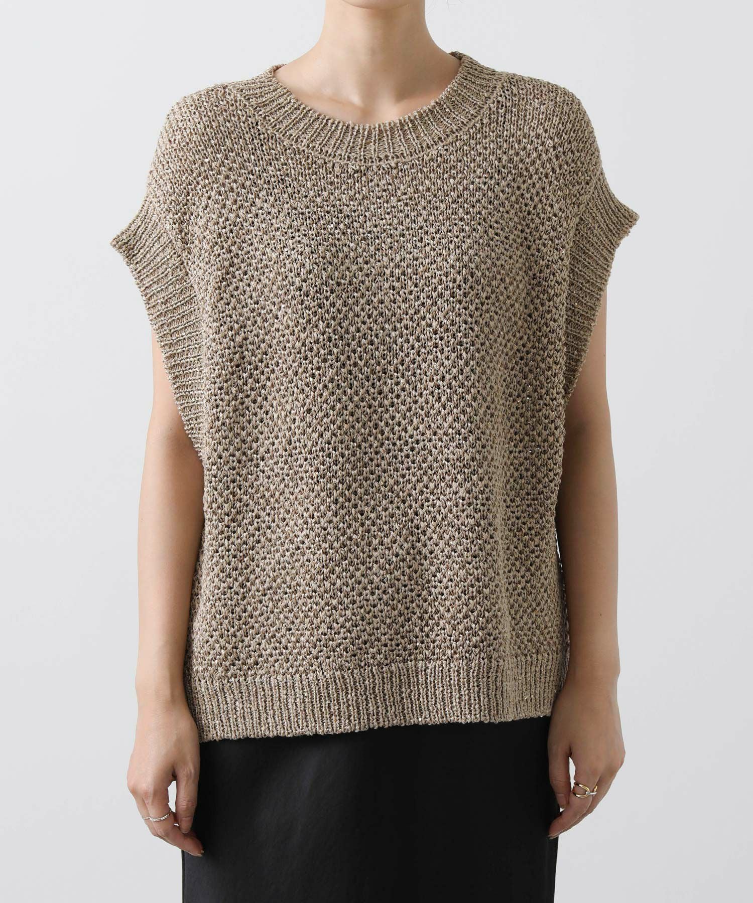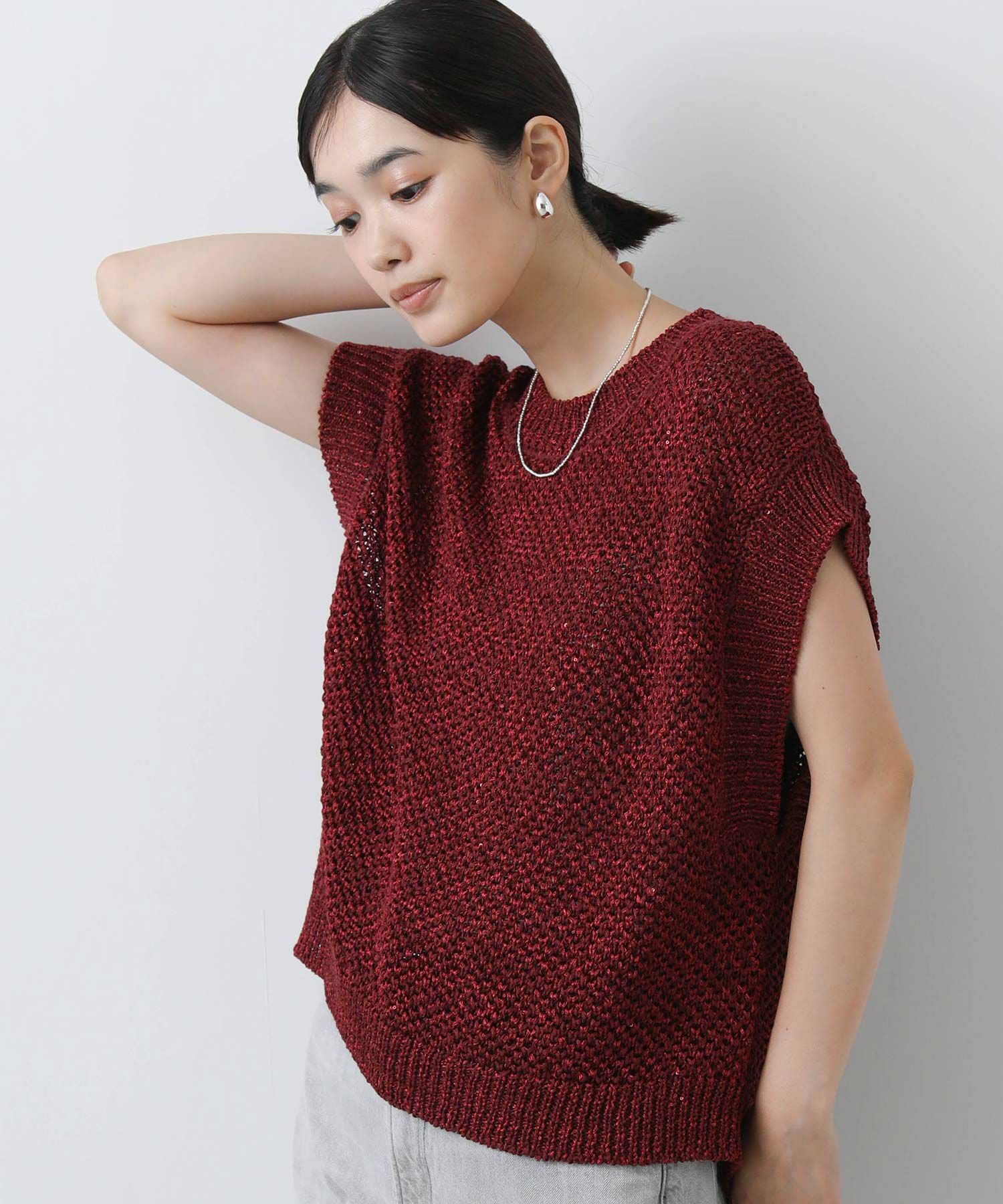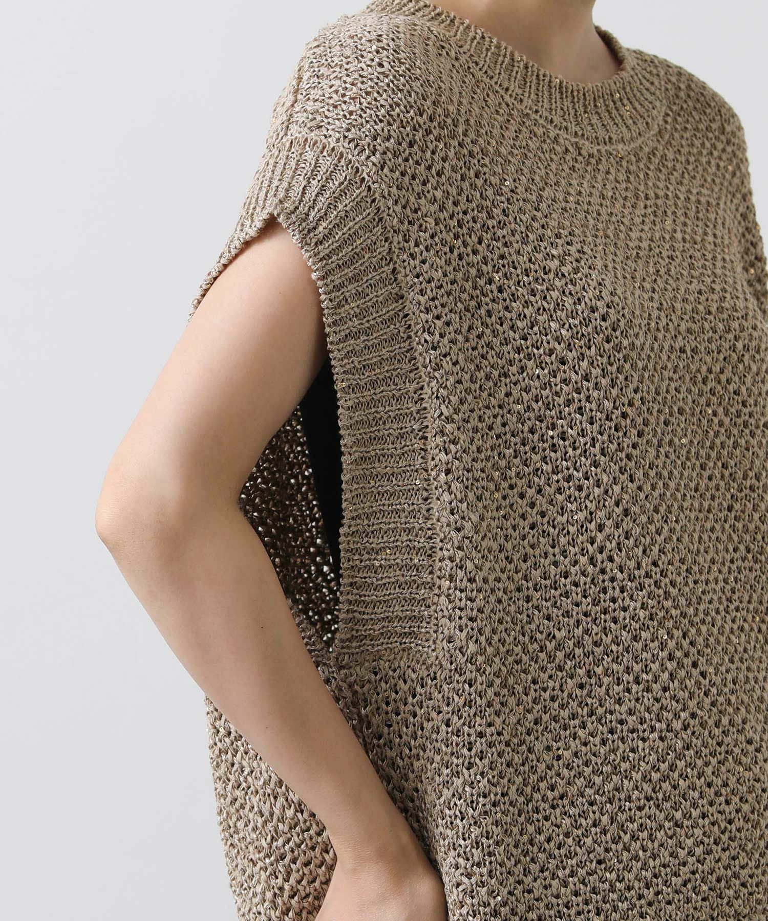 スパンコール付きの糸が編み込まれ、程よい輝きがアクセントになるニット。