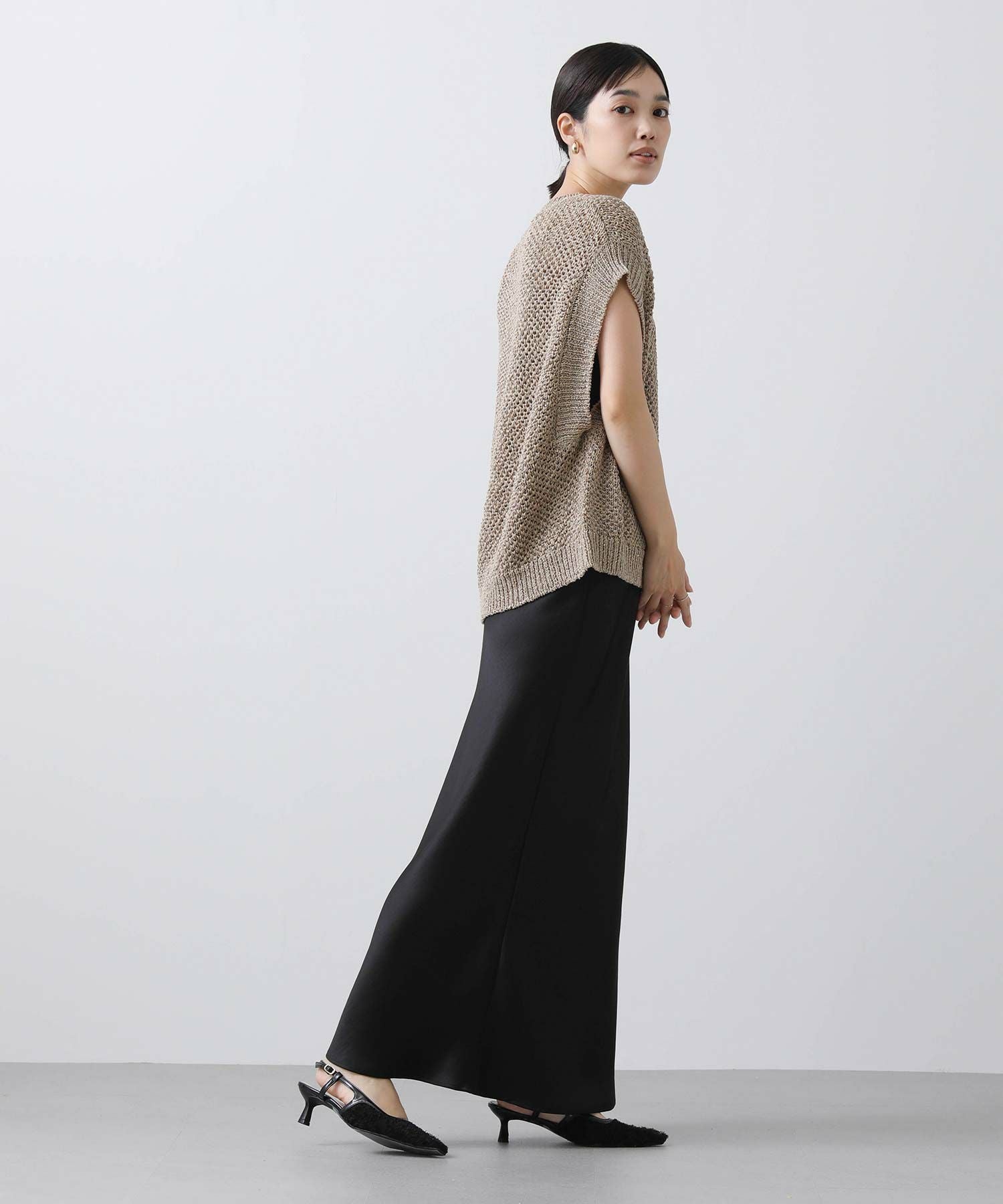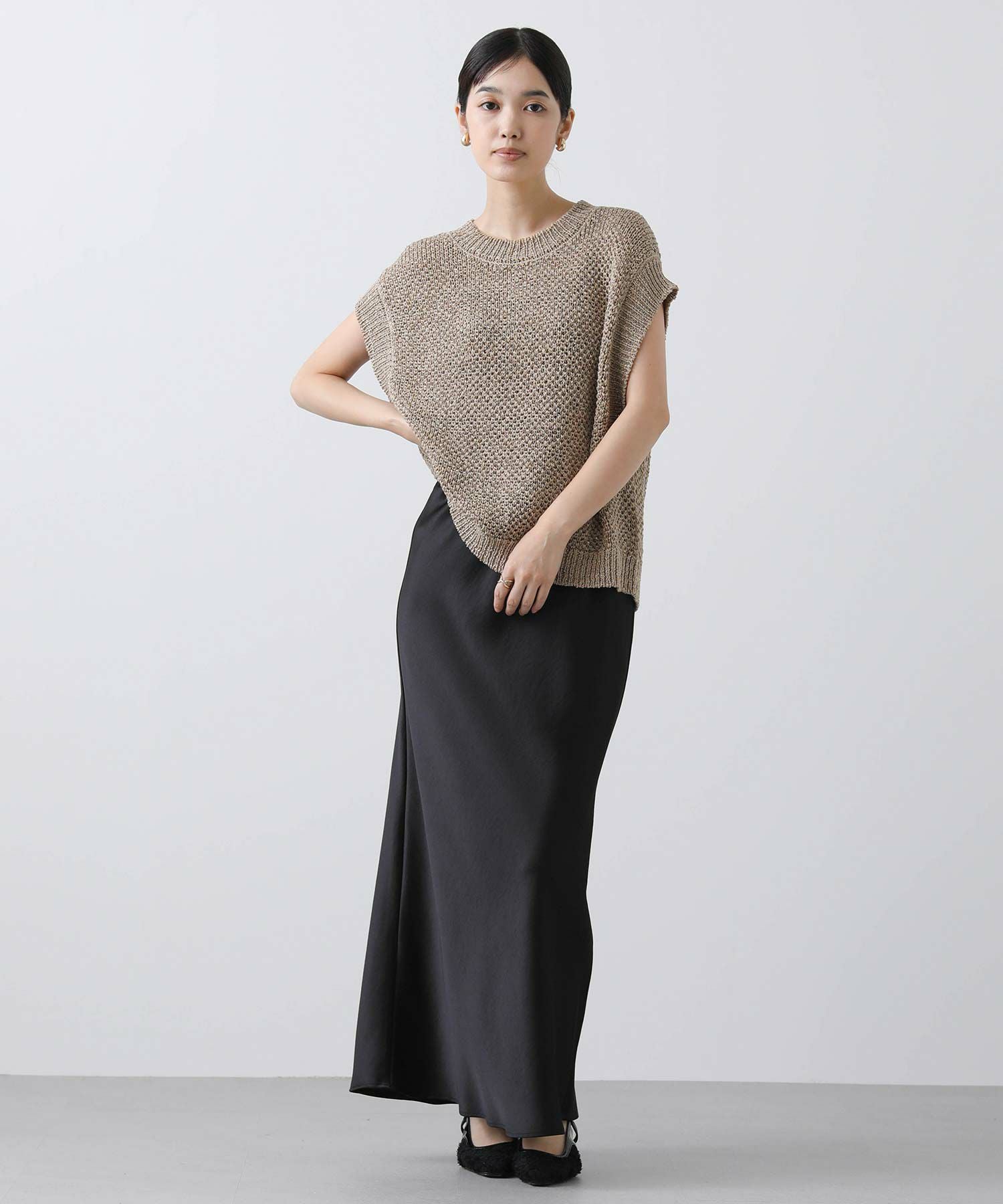 スラックスやデニム、スカートなど、ボトムスを選ばずバランスよく着ていただけます。