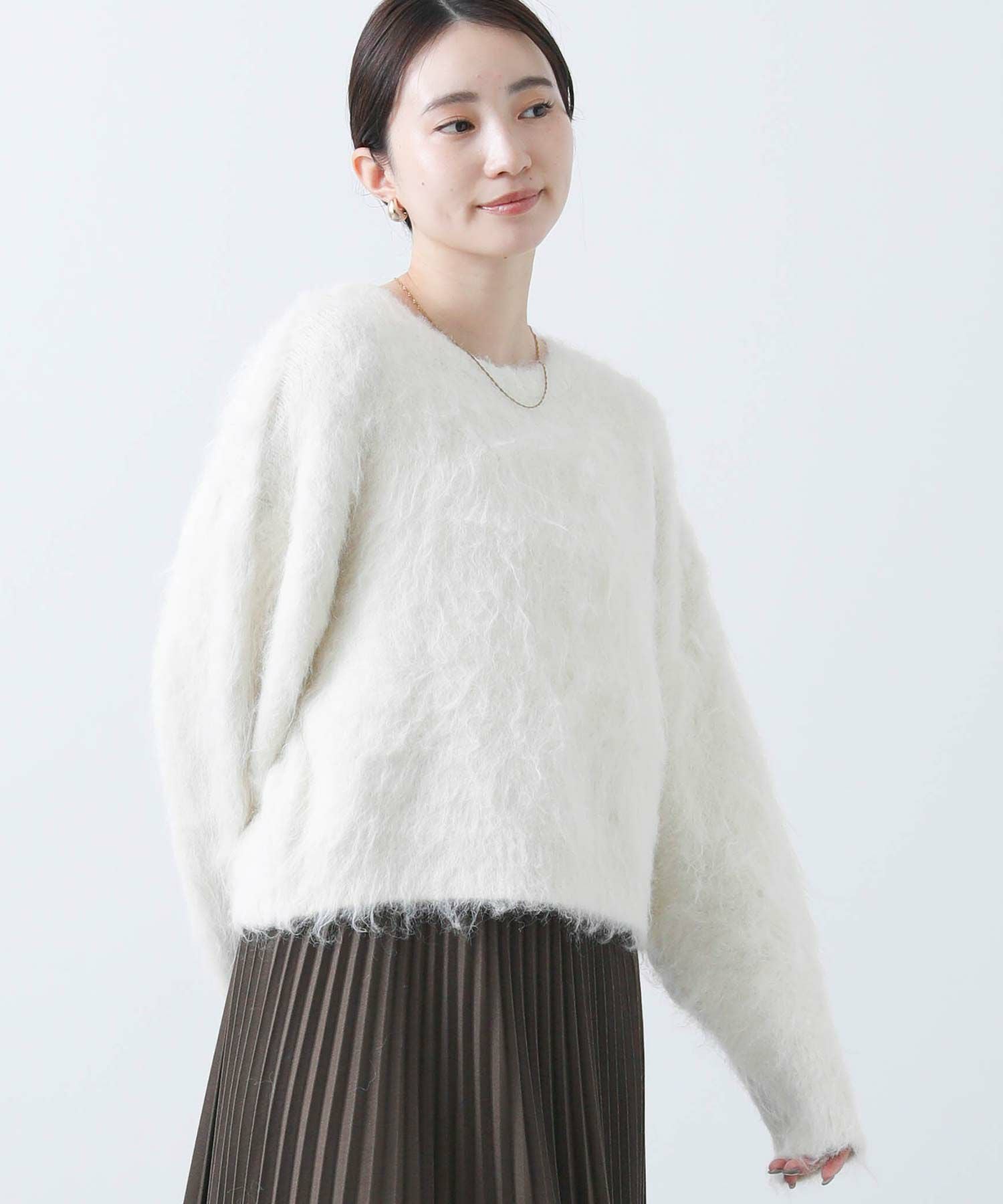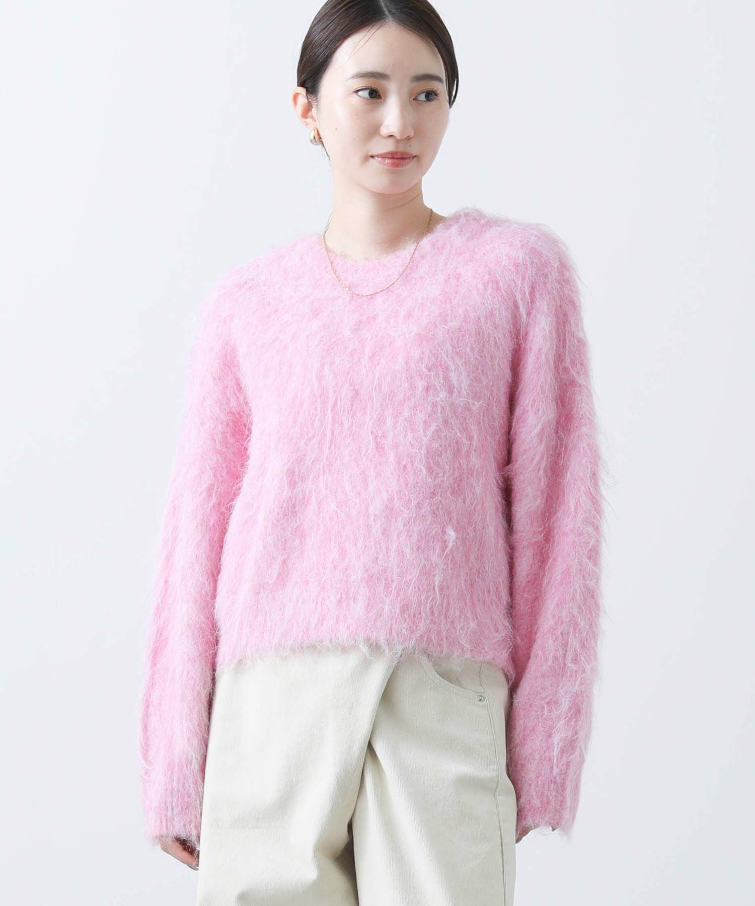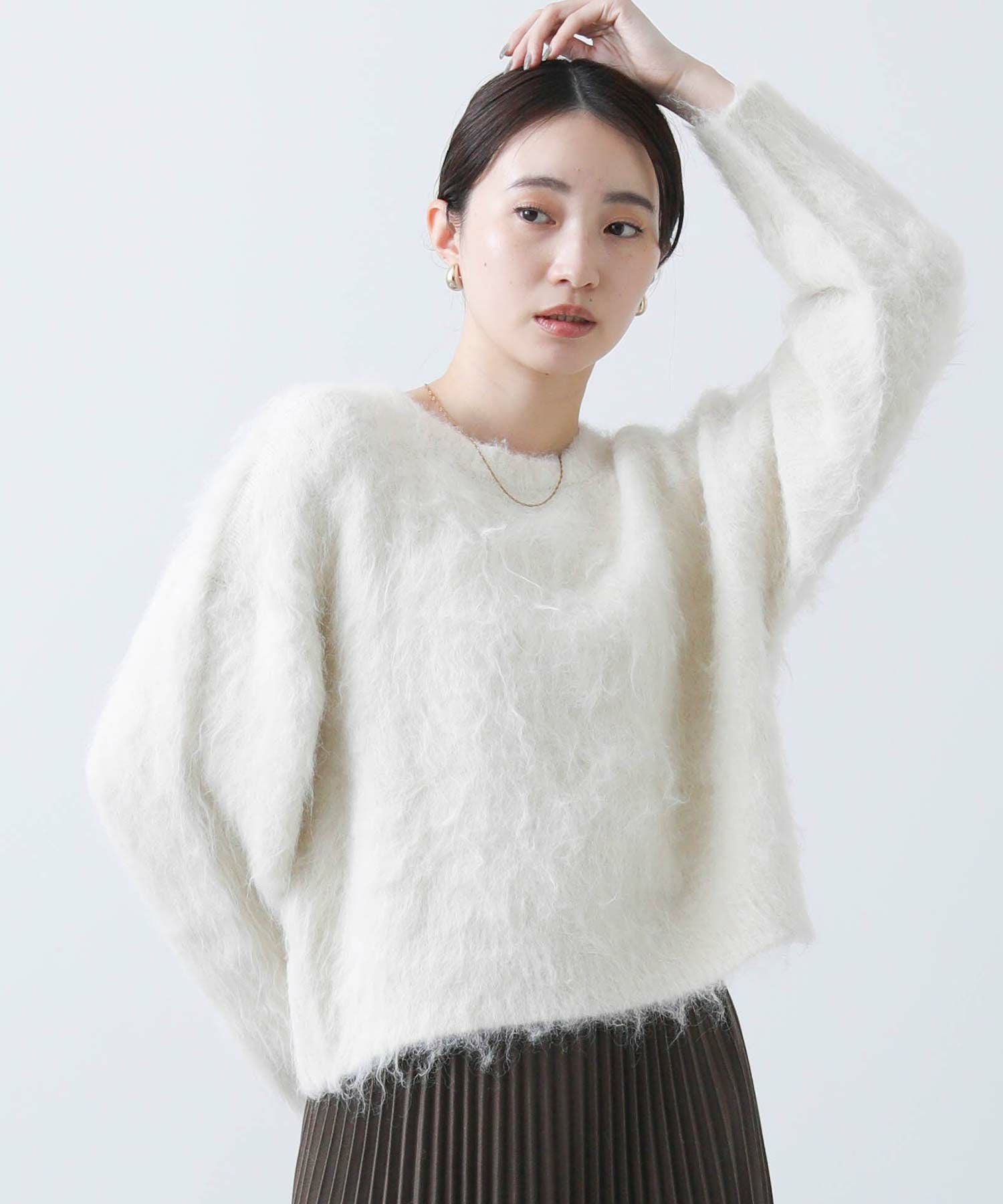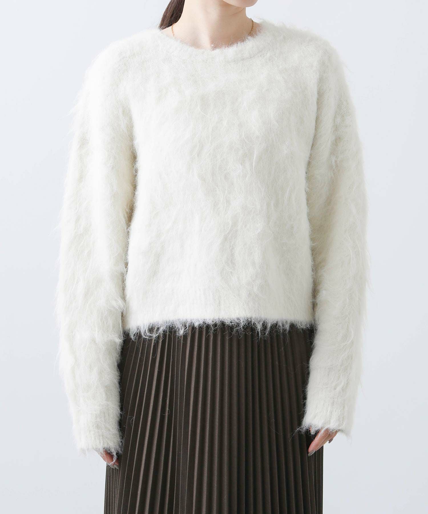 毛足の長いふわふわのシャギーが今年らしい、シンプルながら主役級のニットプルオーバー。