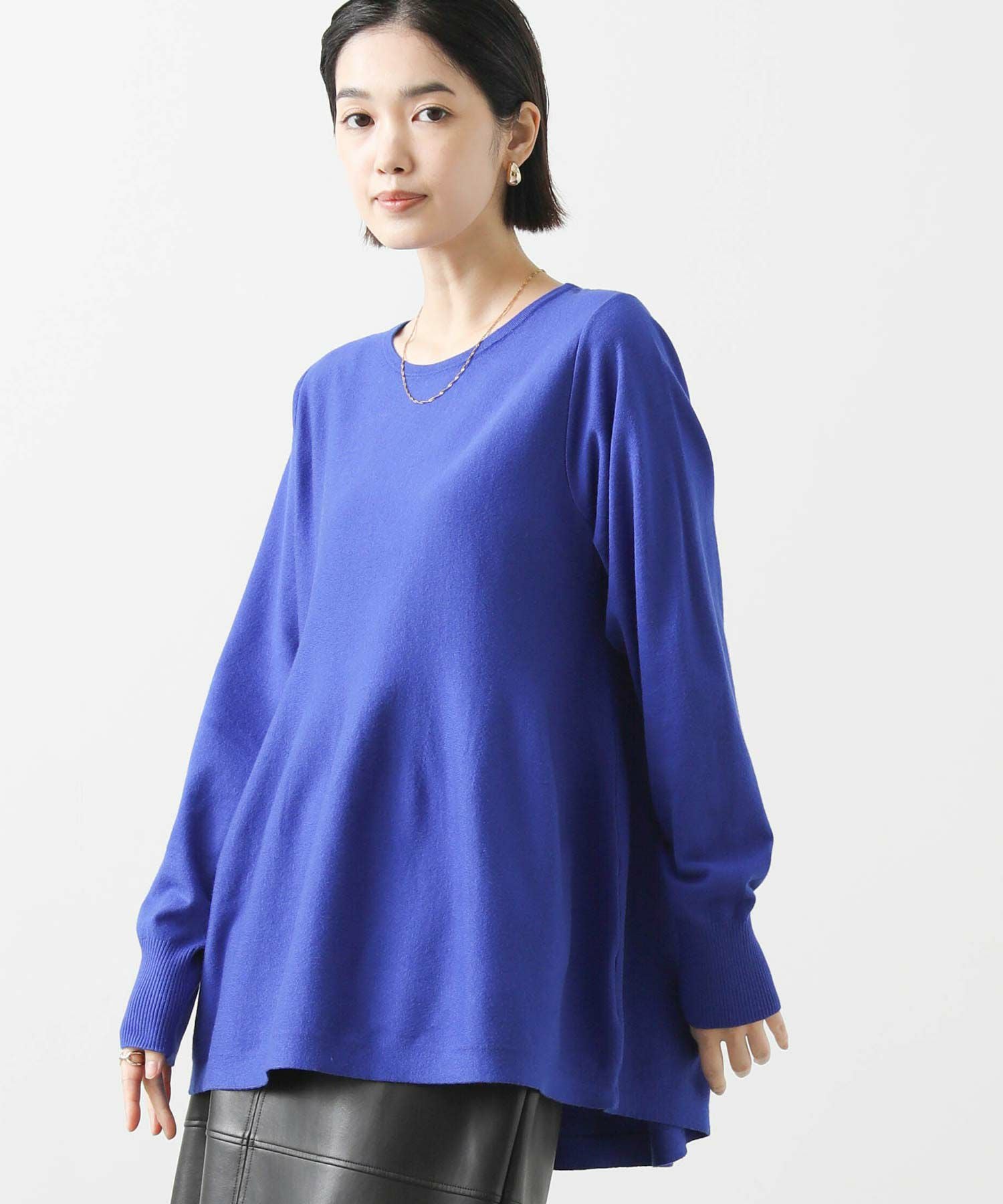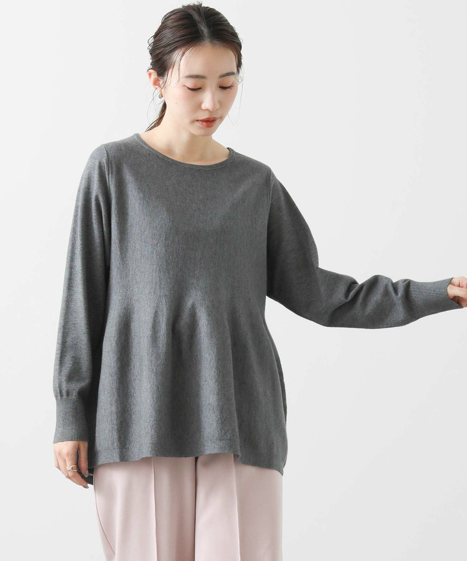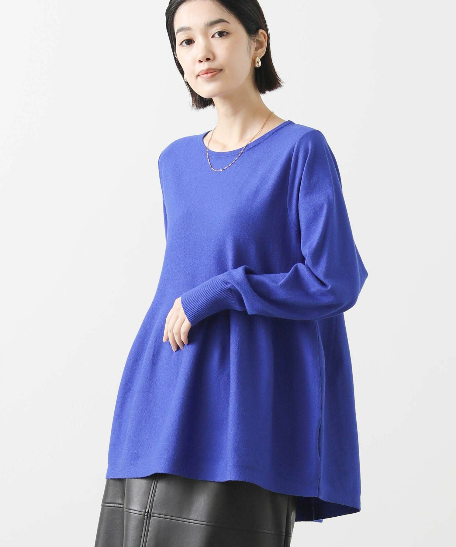 わずかに前後差のある丈と編み方で出す自然に広がるペプラムシルエットが、気になる腰周りをふんわりカバー。スッキリしたシルエットのボトムと好相性です。