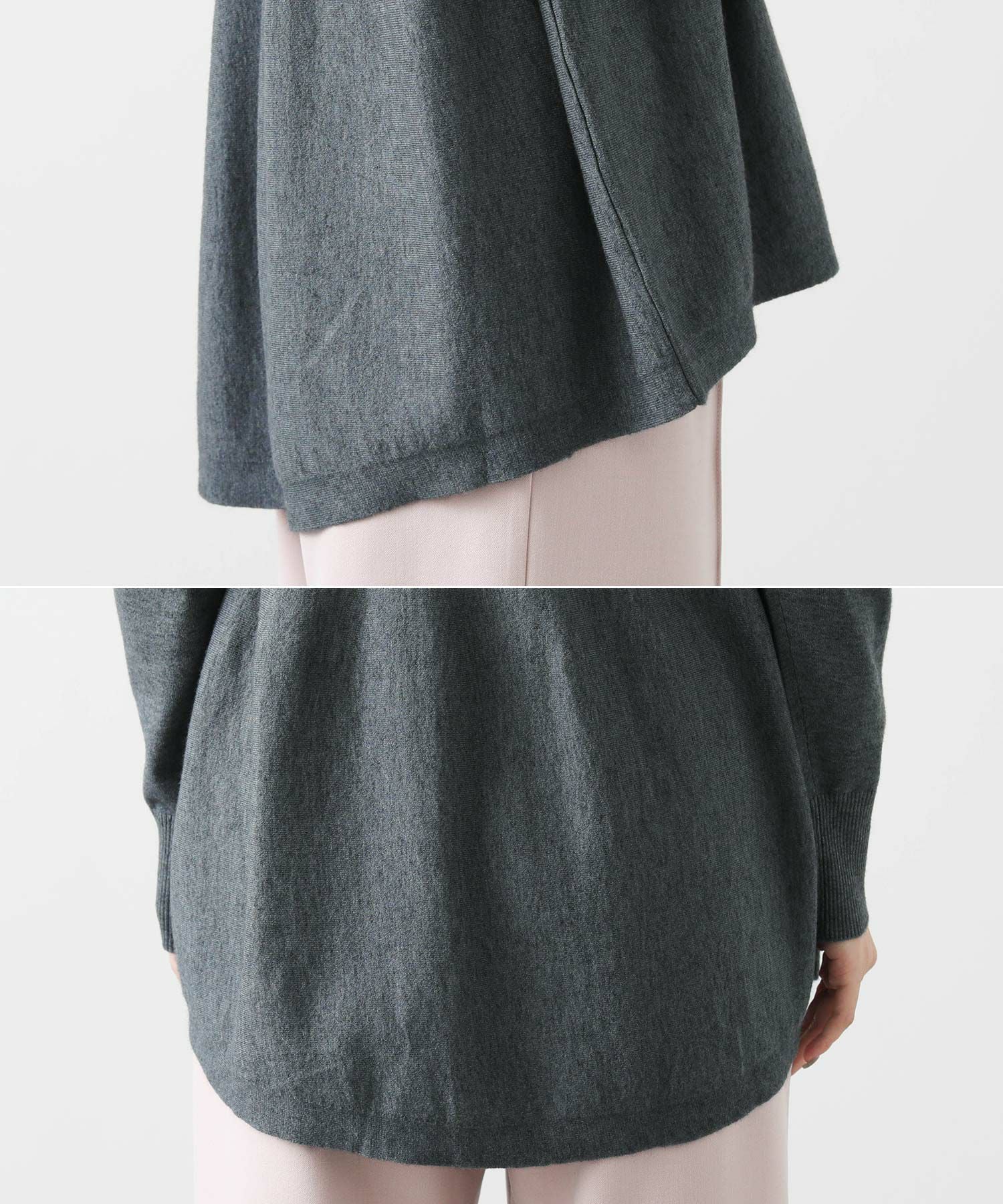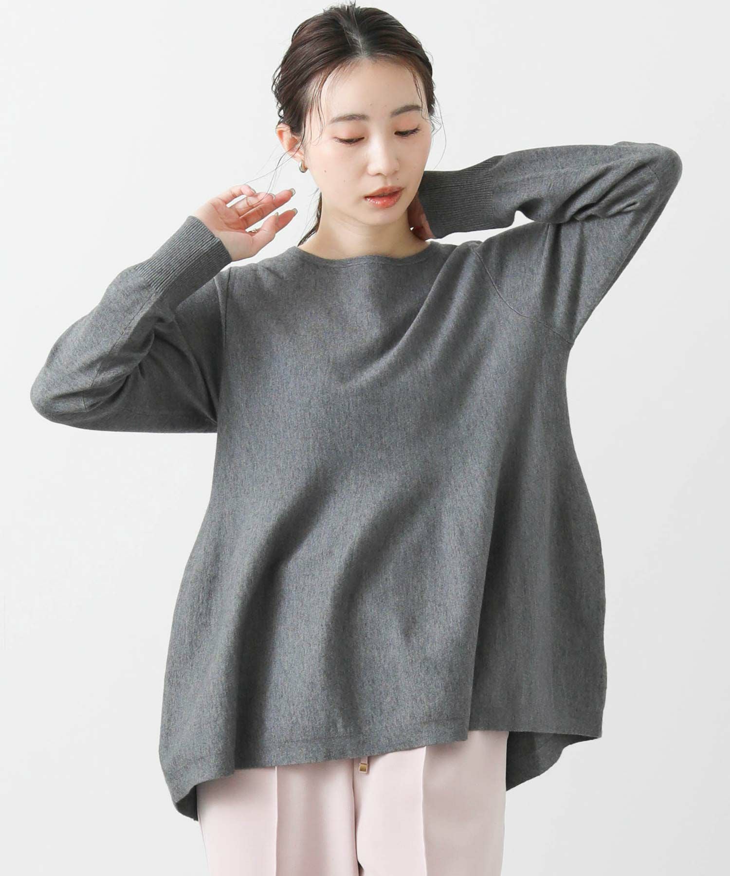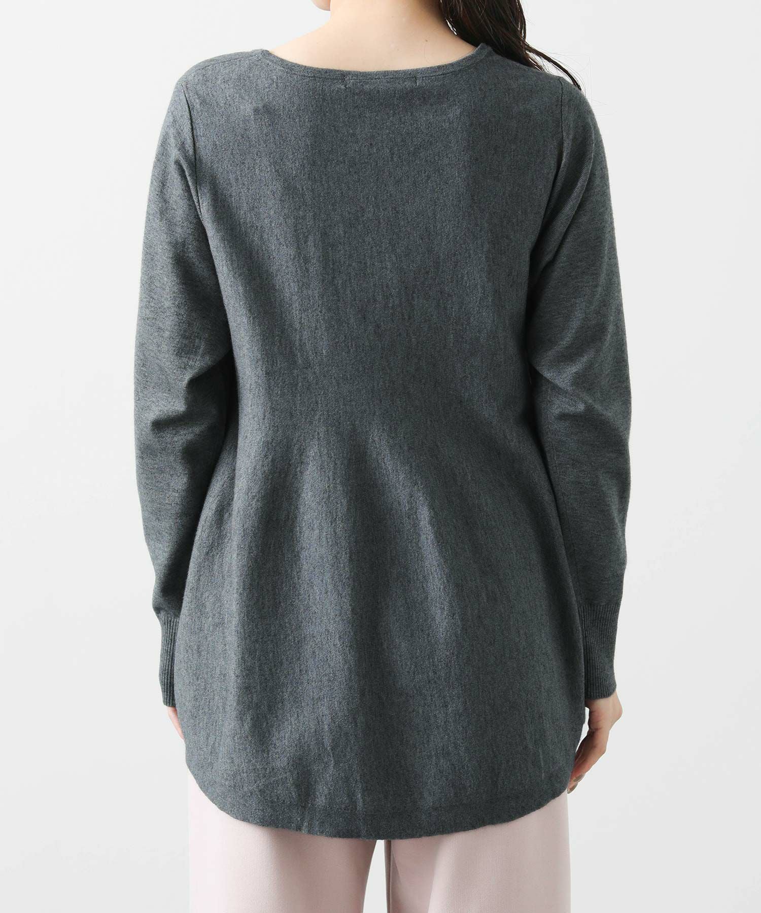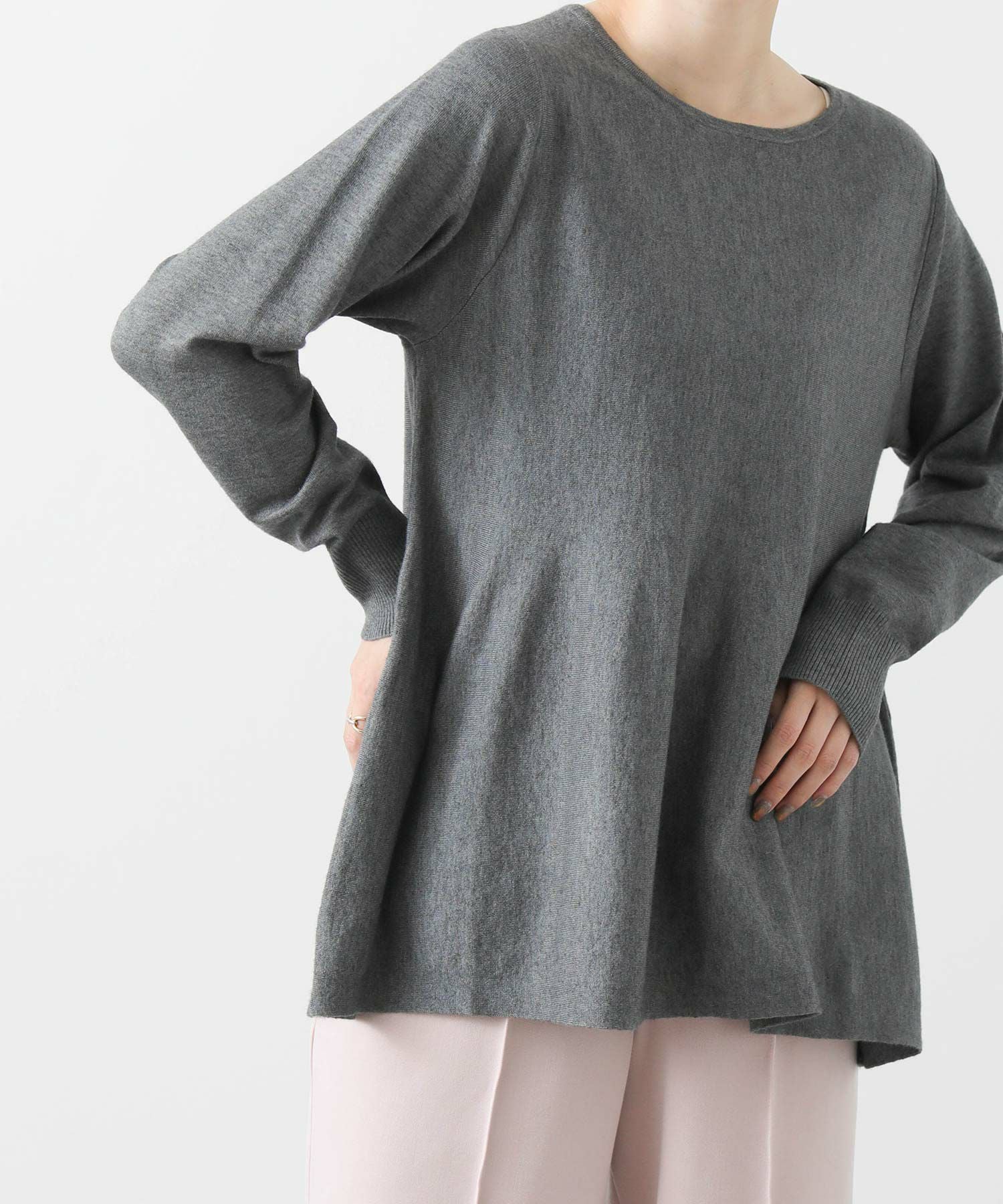 わずかに前後差のある丈と編み方で出す自然に広がるペプラムシルエットが、気になる腰周りをふんわりカバー。スッキリしたシルエットのボトムと好相性です。