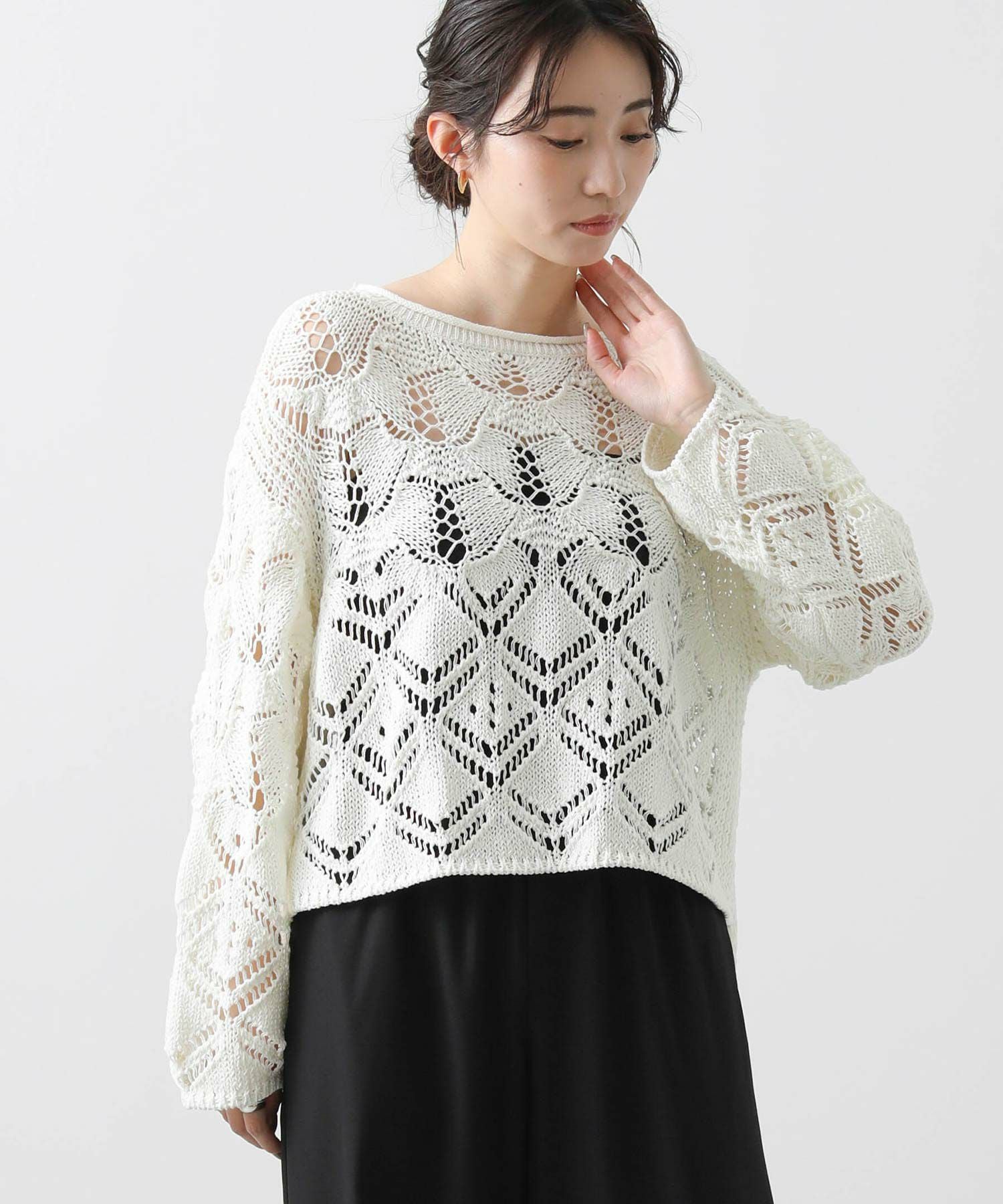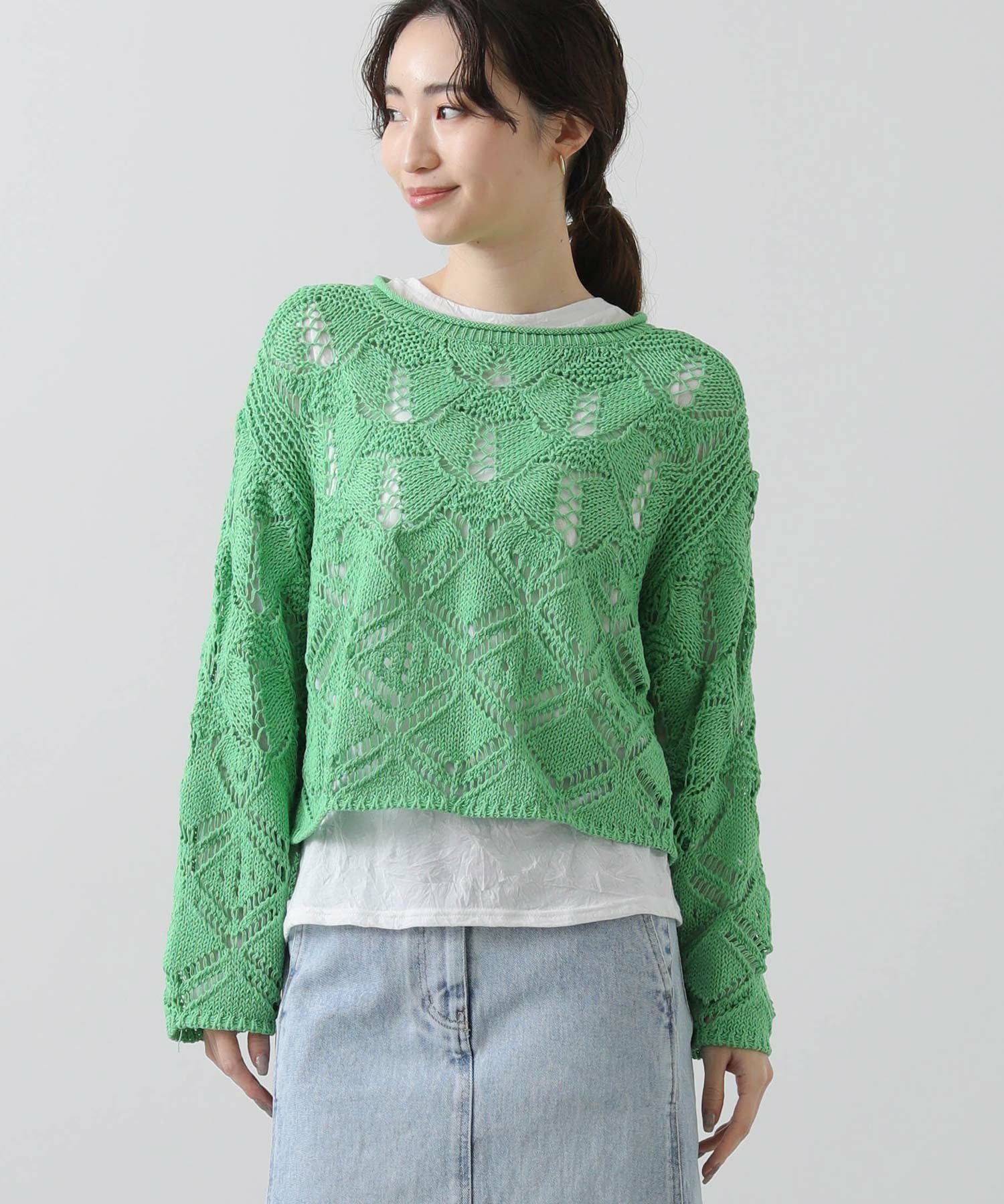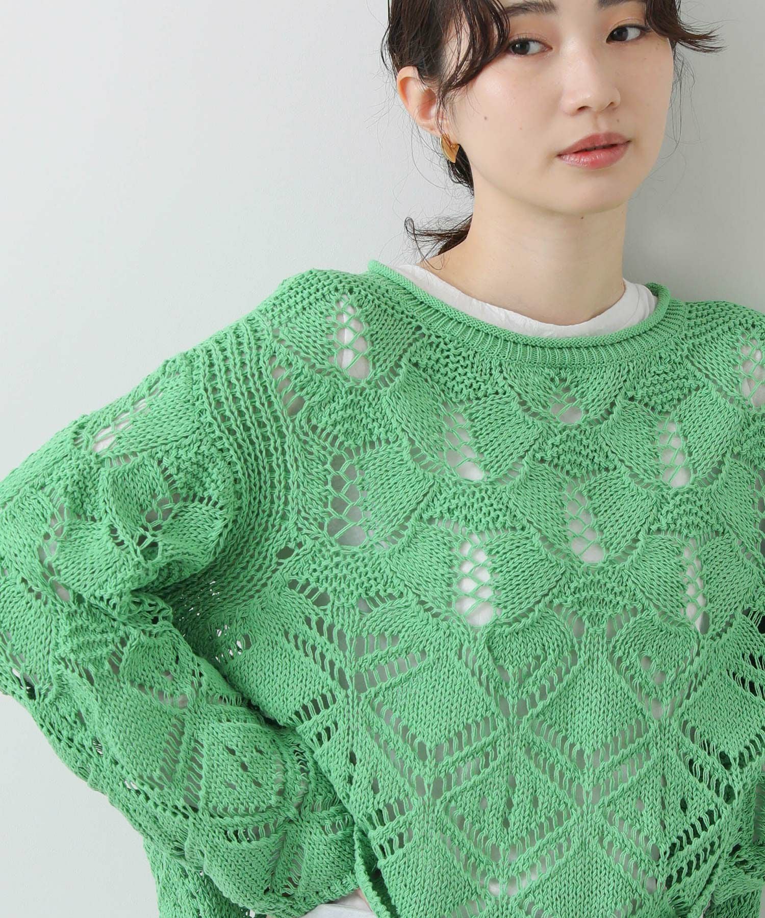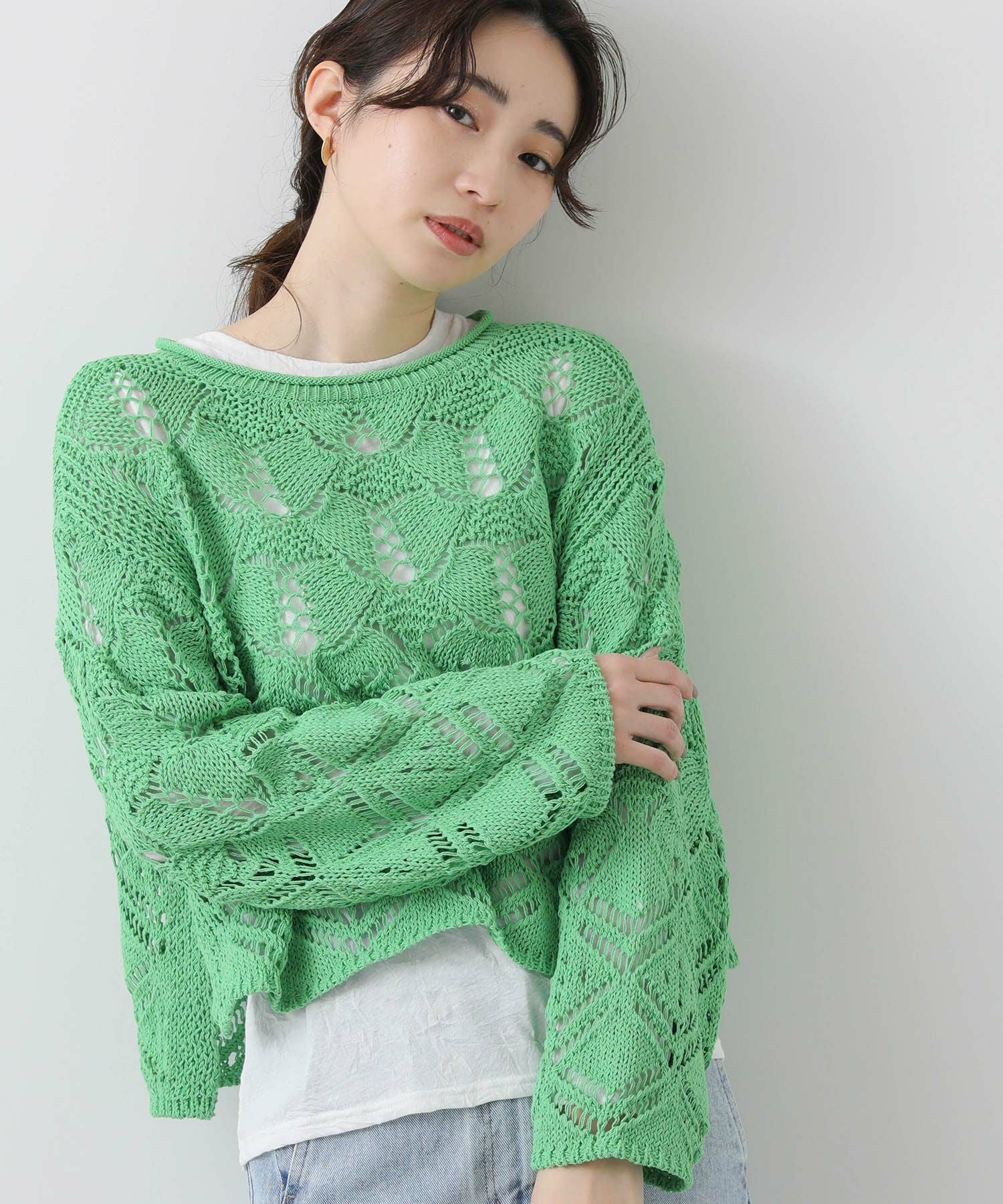 ざっくりとしたサイズ感と程よい厚みがあるので、寒いうちからタートルを合わせたスタイルもおすすめ。季節が進んだら、タンクやキャミなどと合わせて透け感を楽しめます。