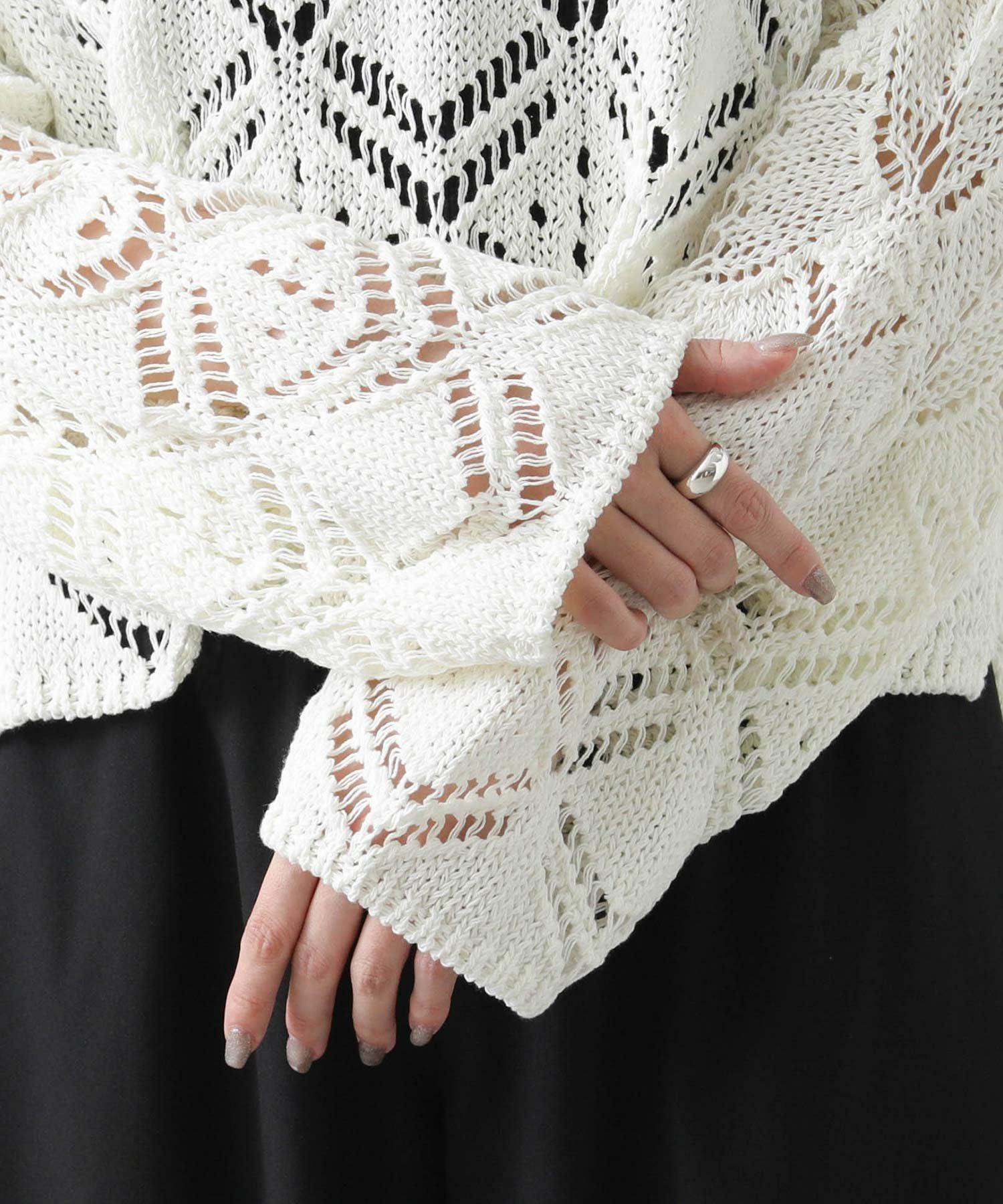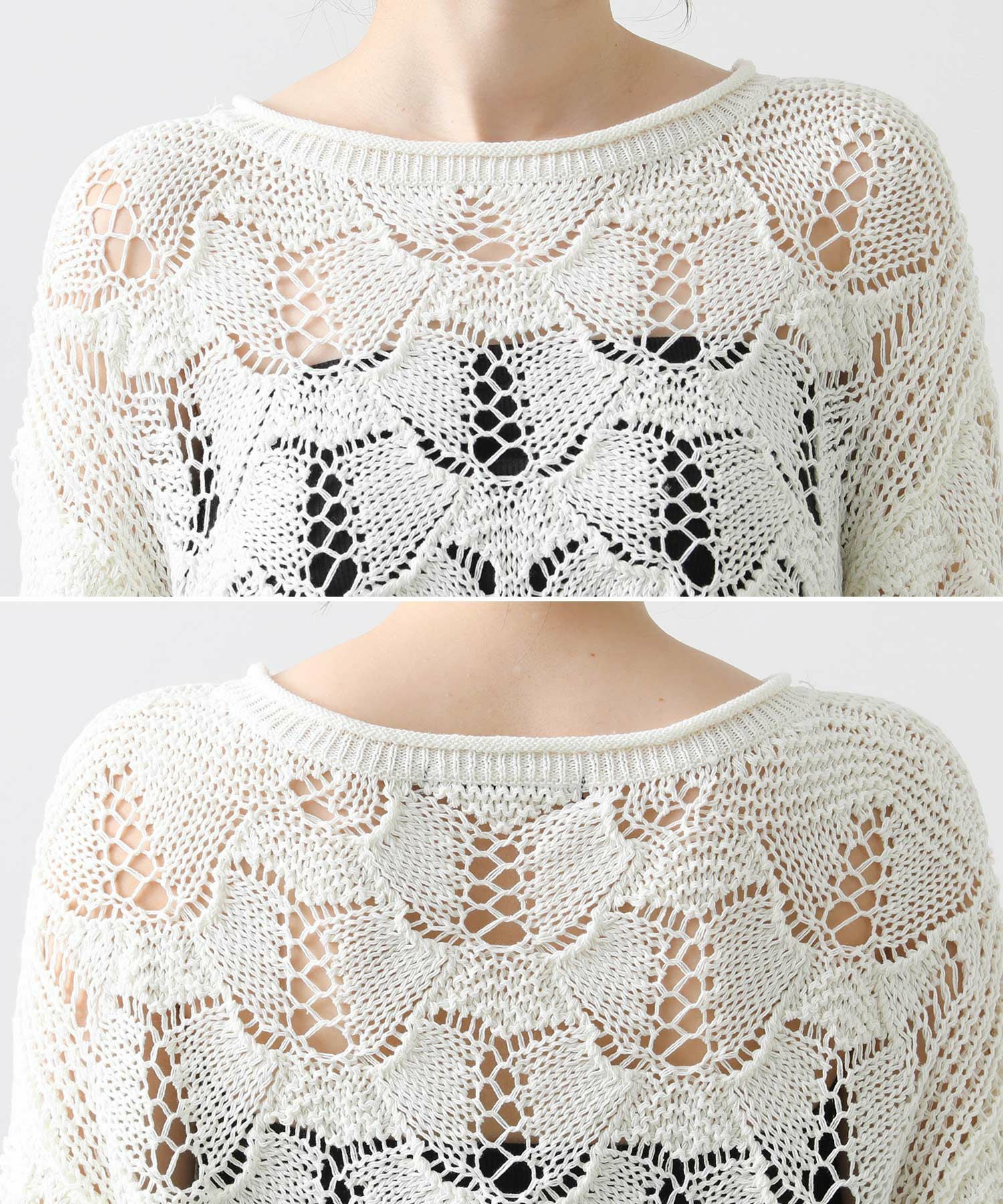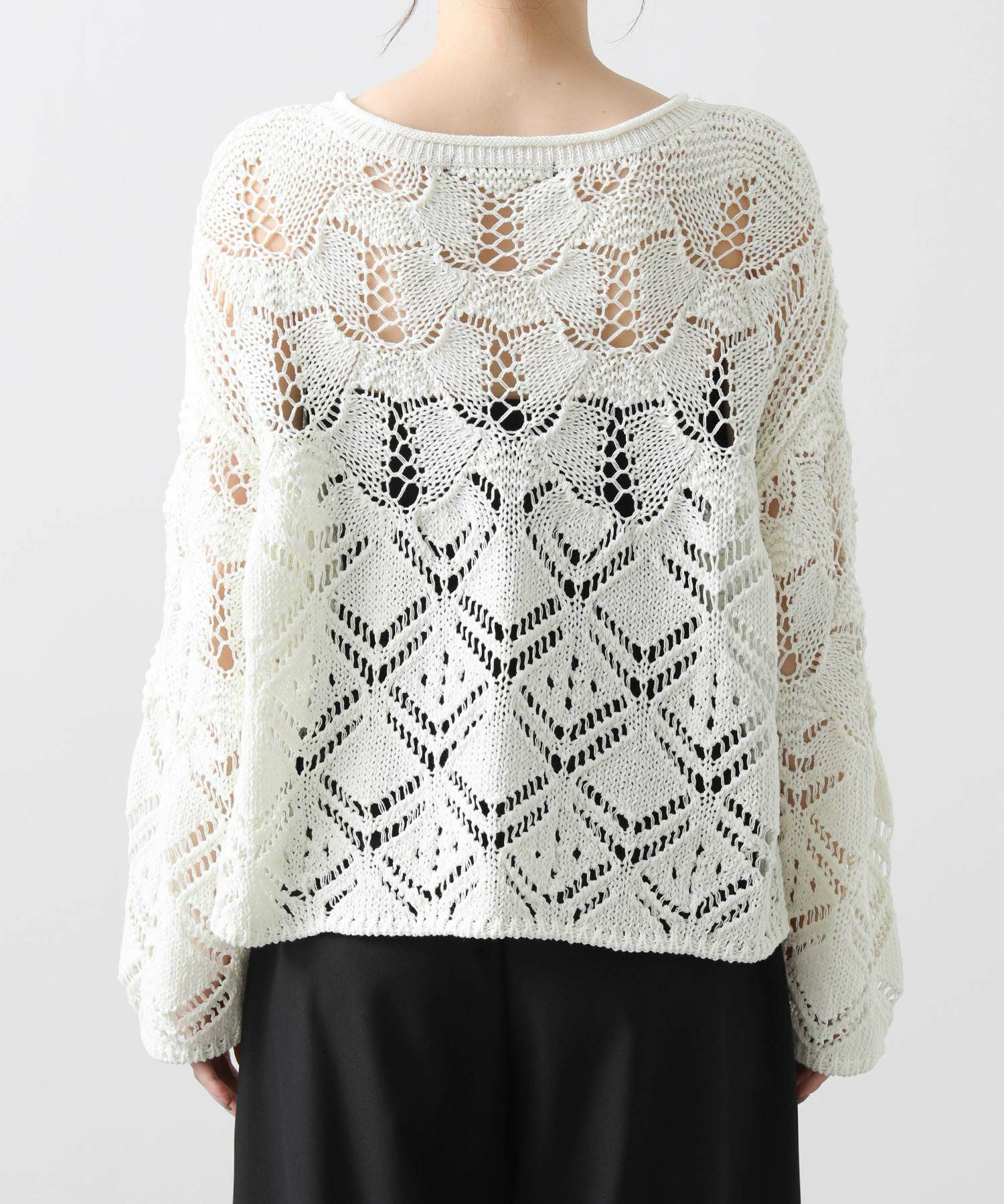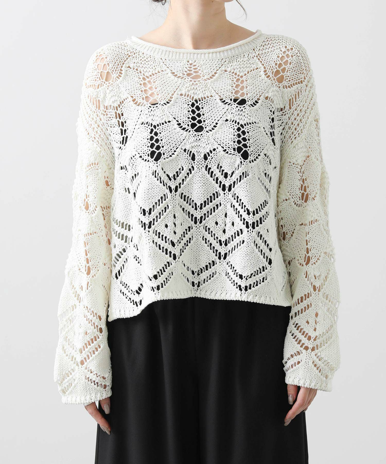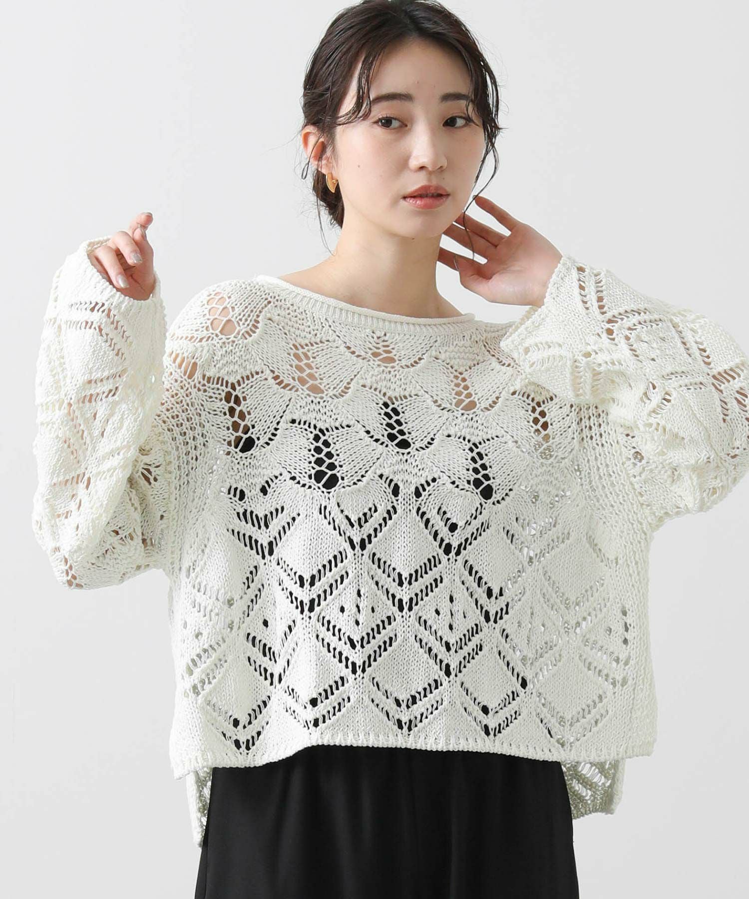 ざっくりとしたサイズ感と程よい厚みがあるので、寒いうちからタートルを合わせたスタイルもおすすめ。季節が進んだら、タンクやキャミなどと合わせて透け感を楽しめます。