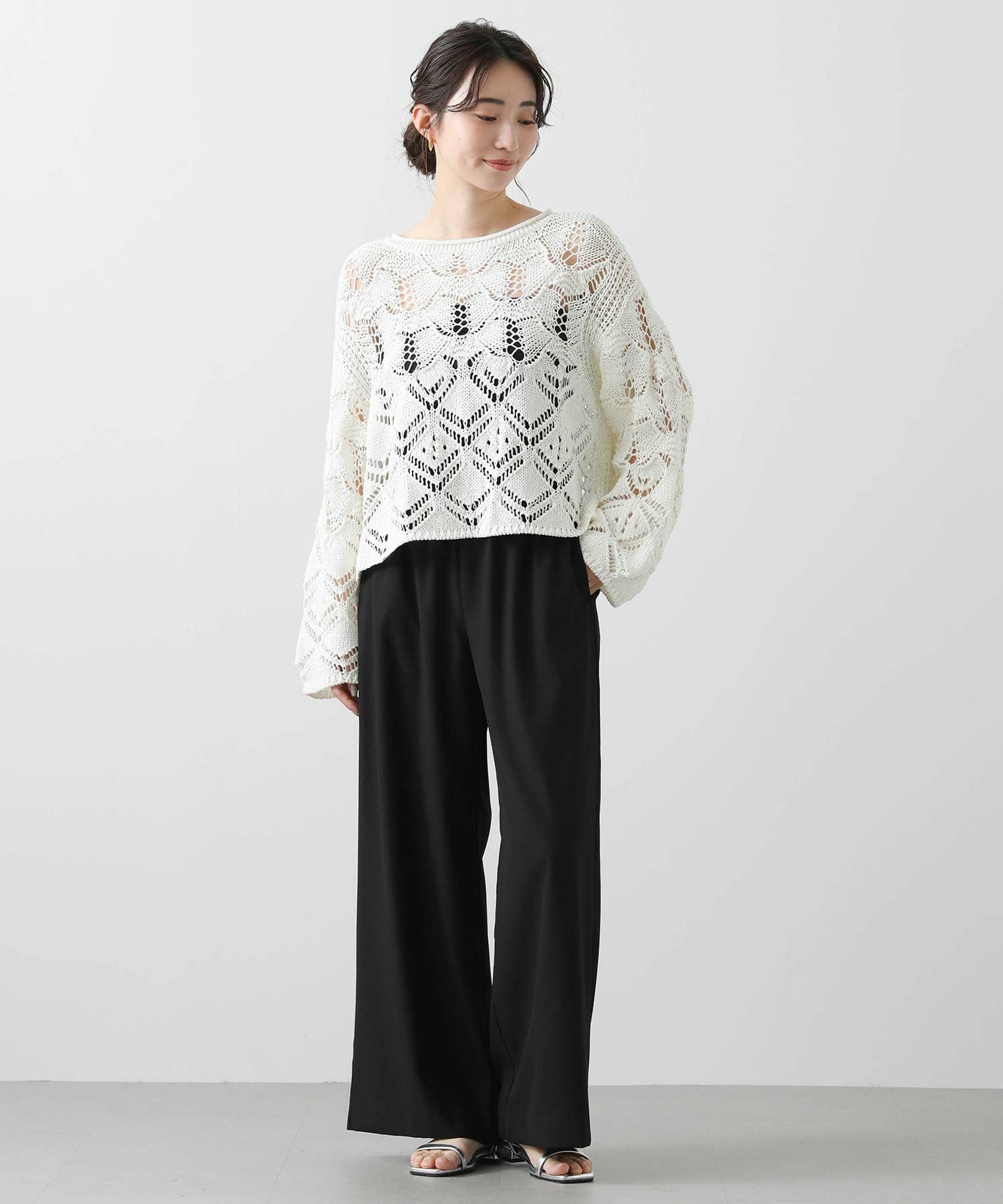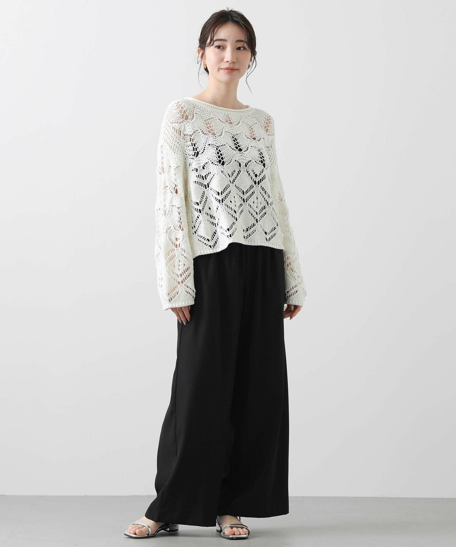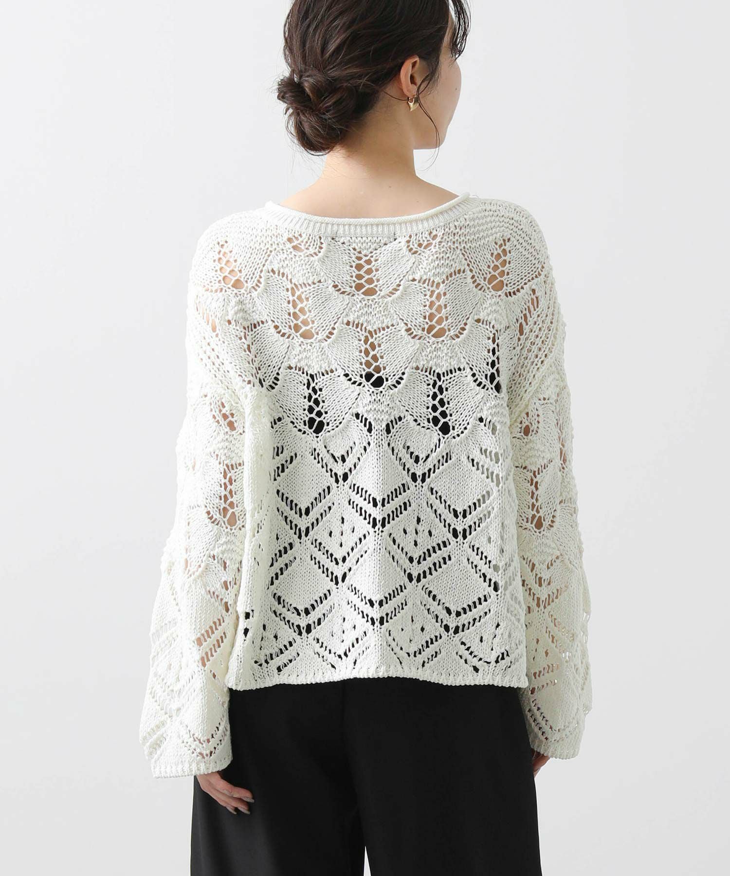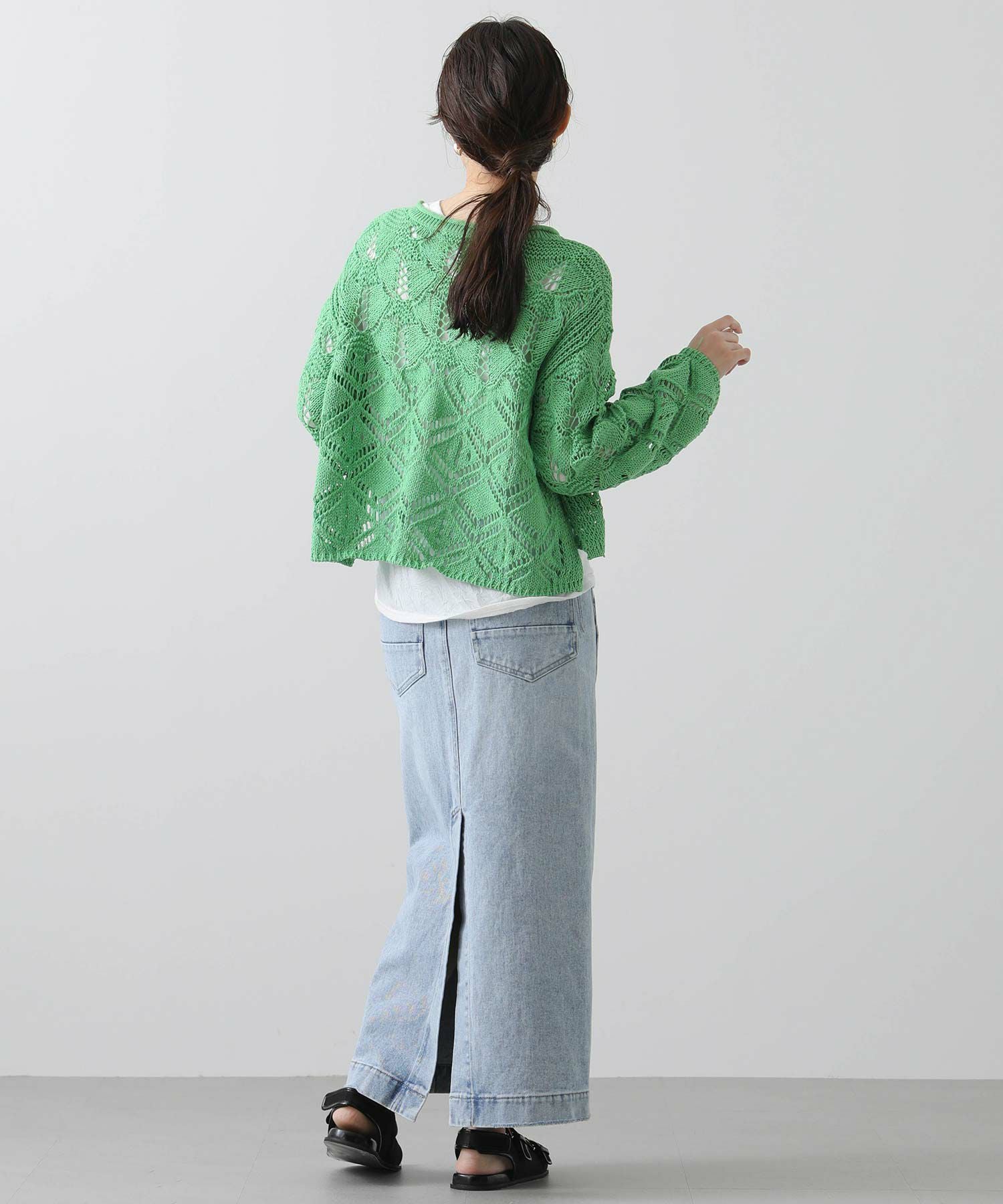 ざっくりとしたサイズ感と程よい厚みがあるので、寒いうちからタートルを合わせたスタイルもおすすめ。季節が進んだら、タンクやキャミなどと合わせて透け感を楽しめます。