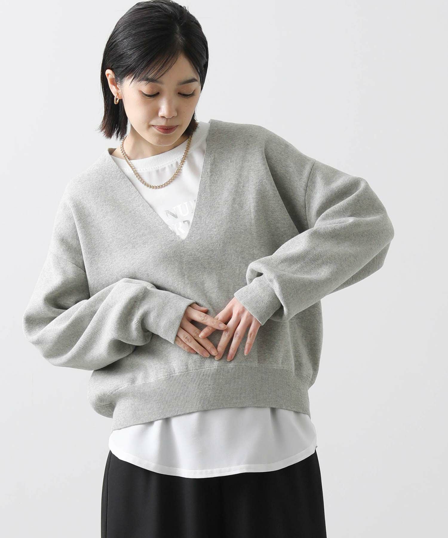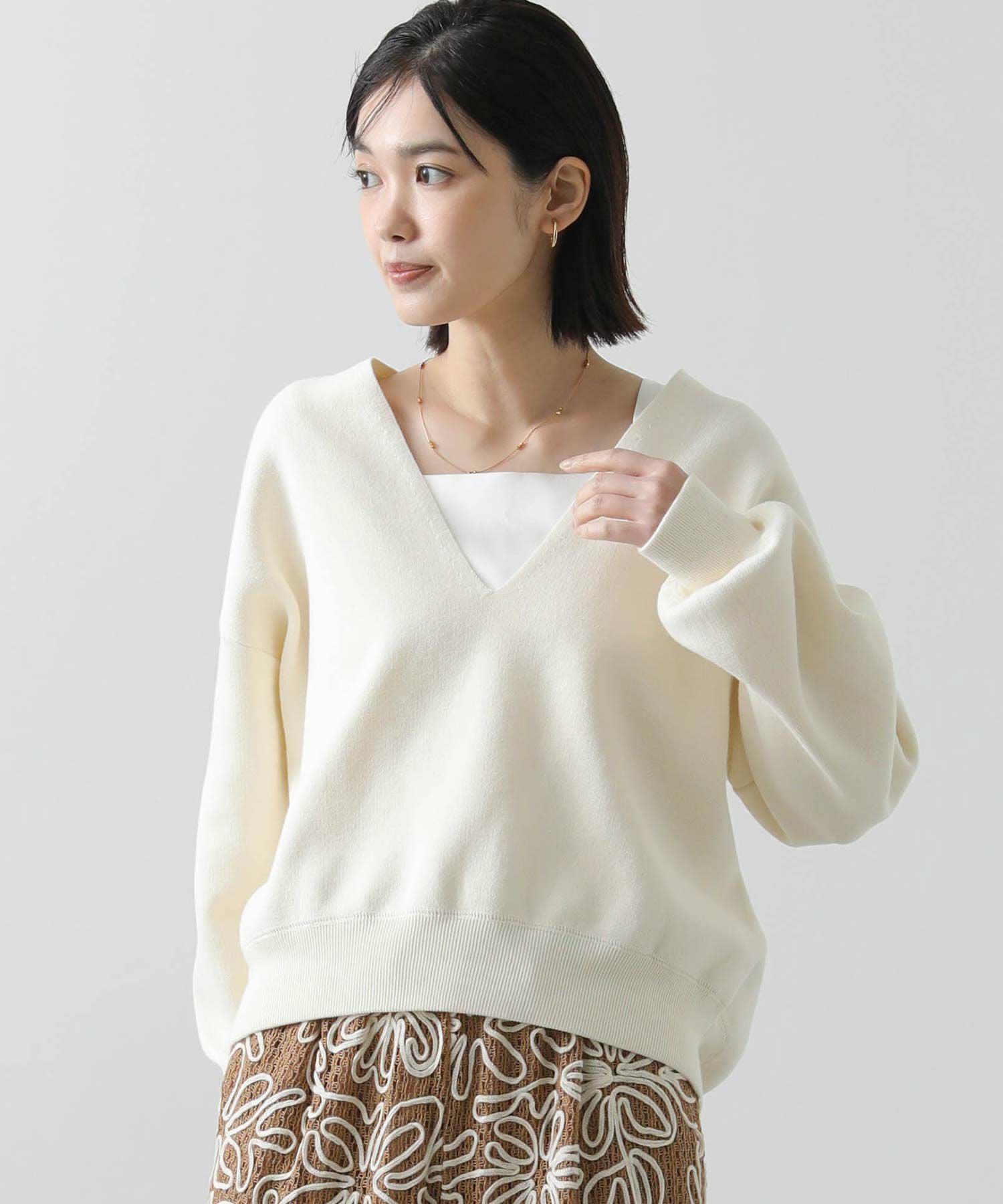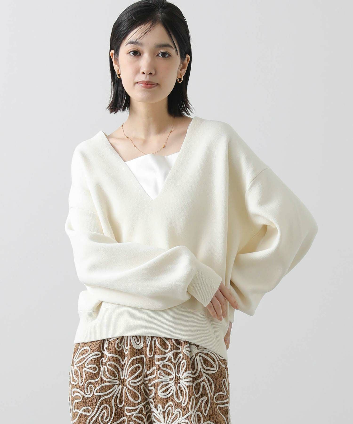 シャープなラインの深いVネックで、小顔&着やせ見えが叶うニットが登場!