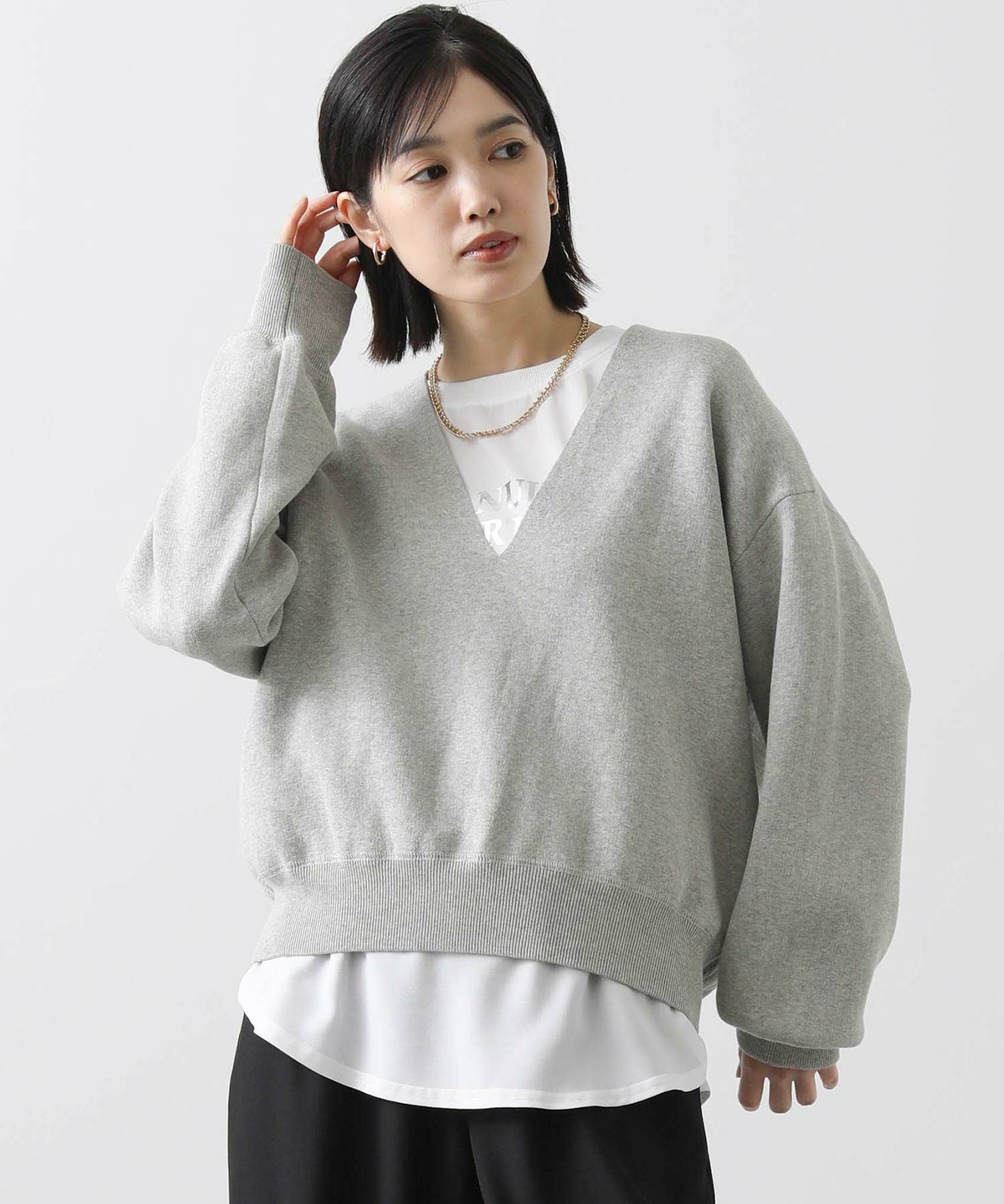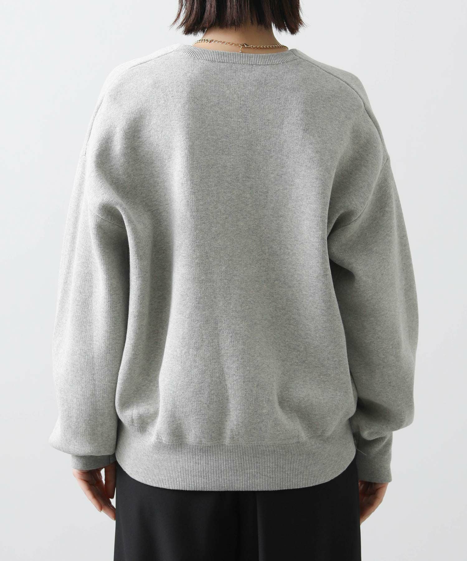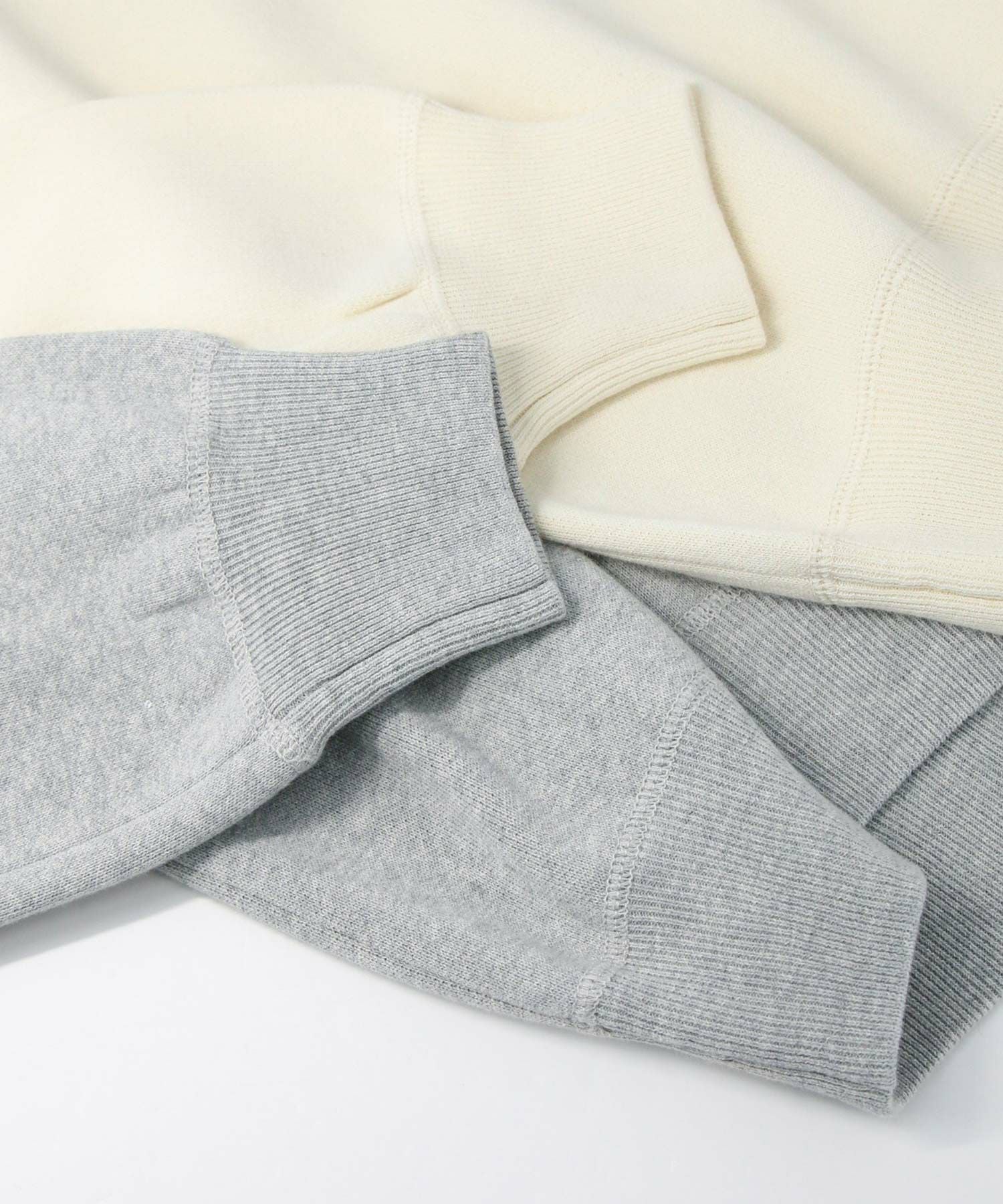 スウェットの様にも見える、しっかりとした程よい厚みのダブルジャガード編みで大人っぽく着こなせます。インナーにはタートルネックやシャツ、ロゴTなど気温に合わせて、ロングシーズン着まわせます。