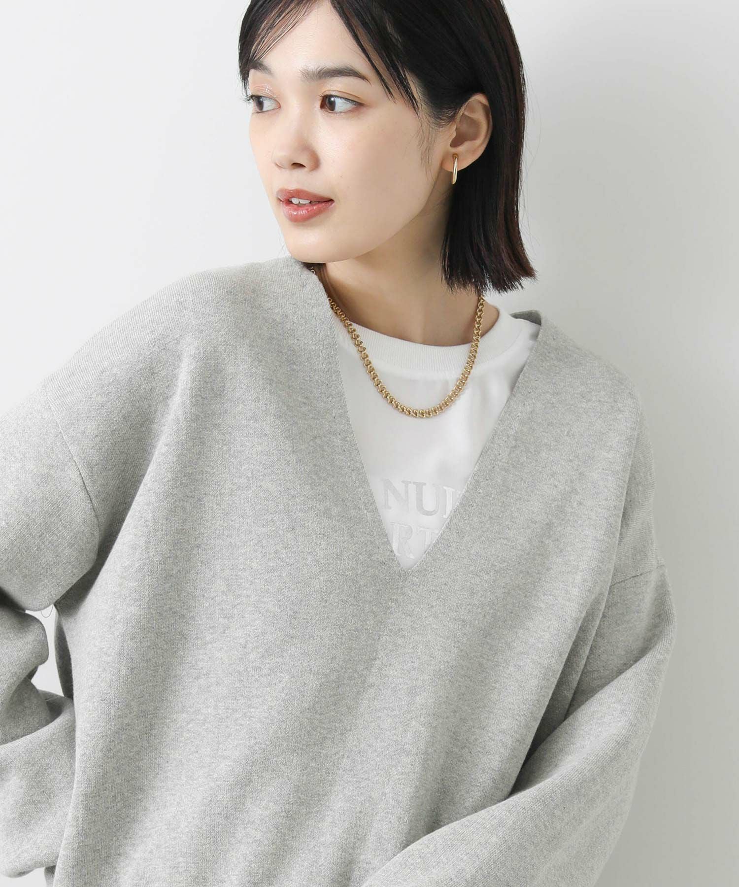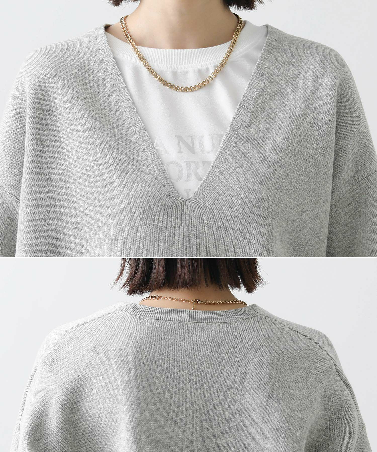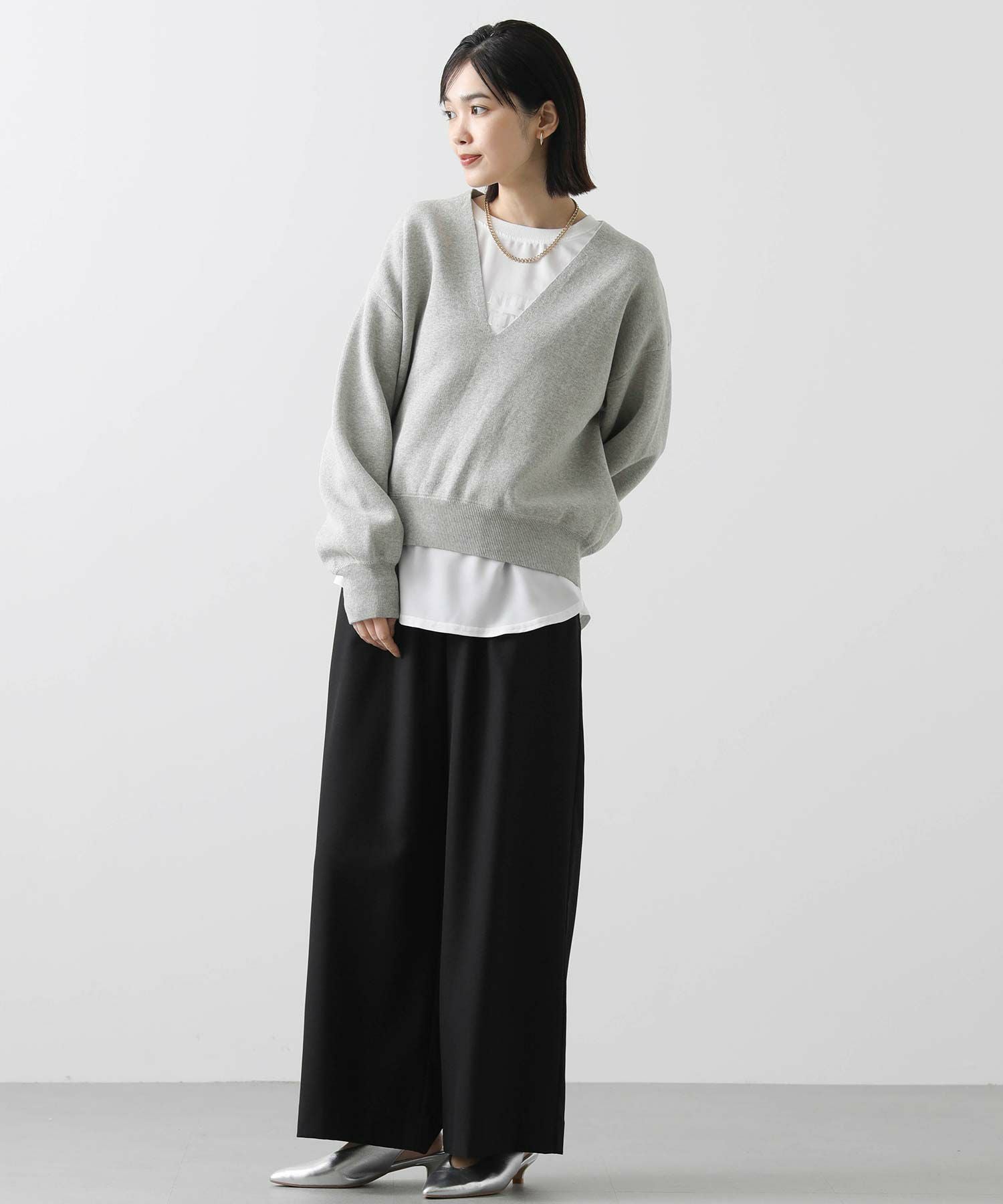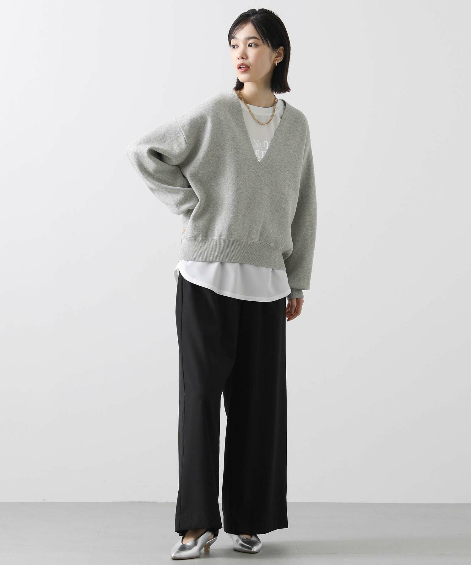 スウェットの様にも見える、しっかりとした程よい厚みのダブルジャガード編みで大人っぽく着こなせます。インナーにはタートルネックやシャツ、ロゴTなど気温に合わせて、ロングシーズン着まわせます。