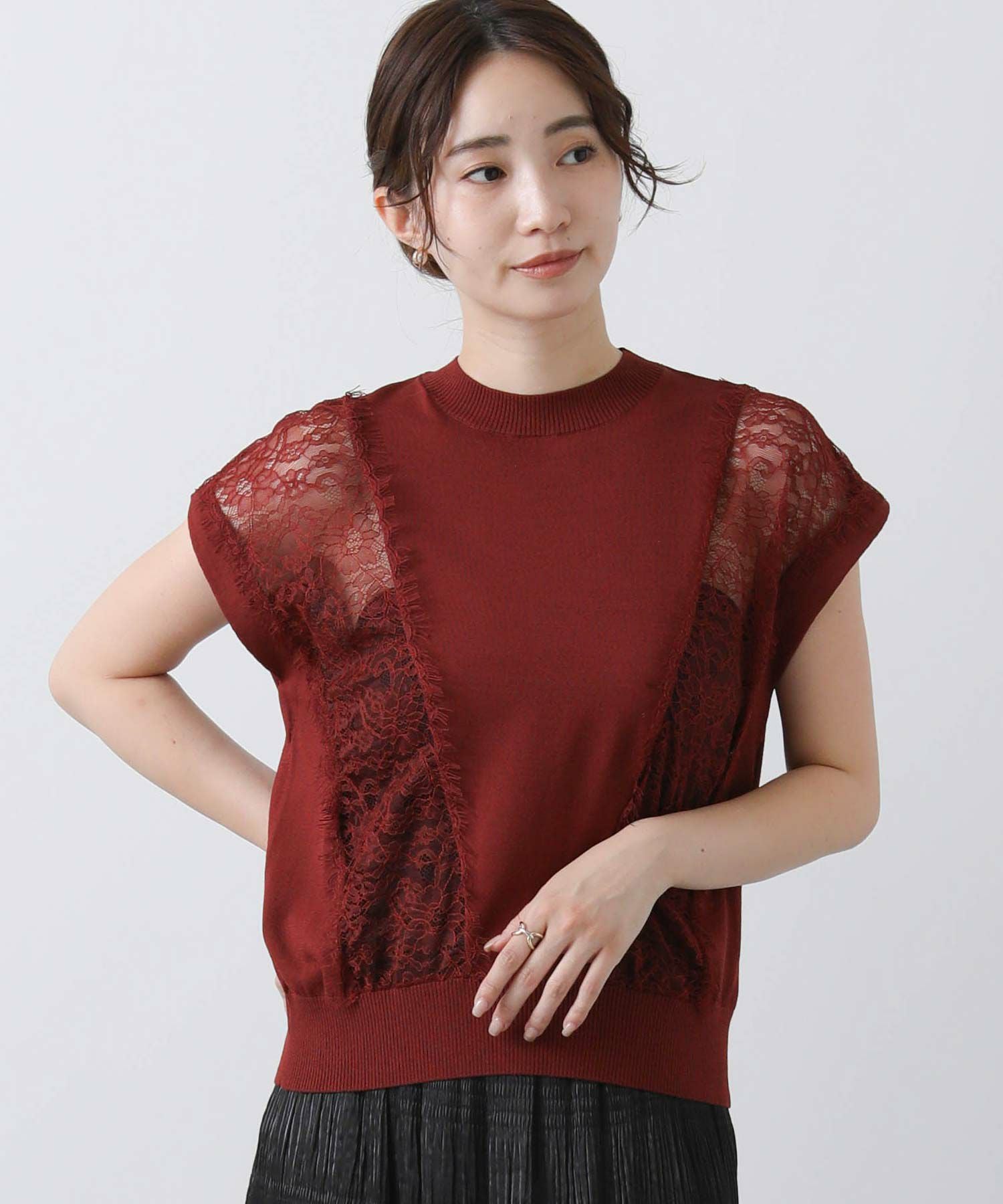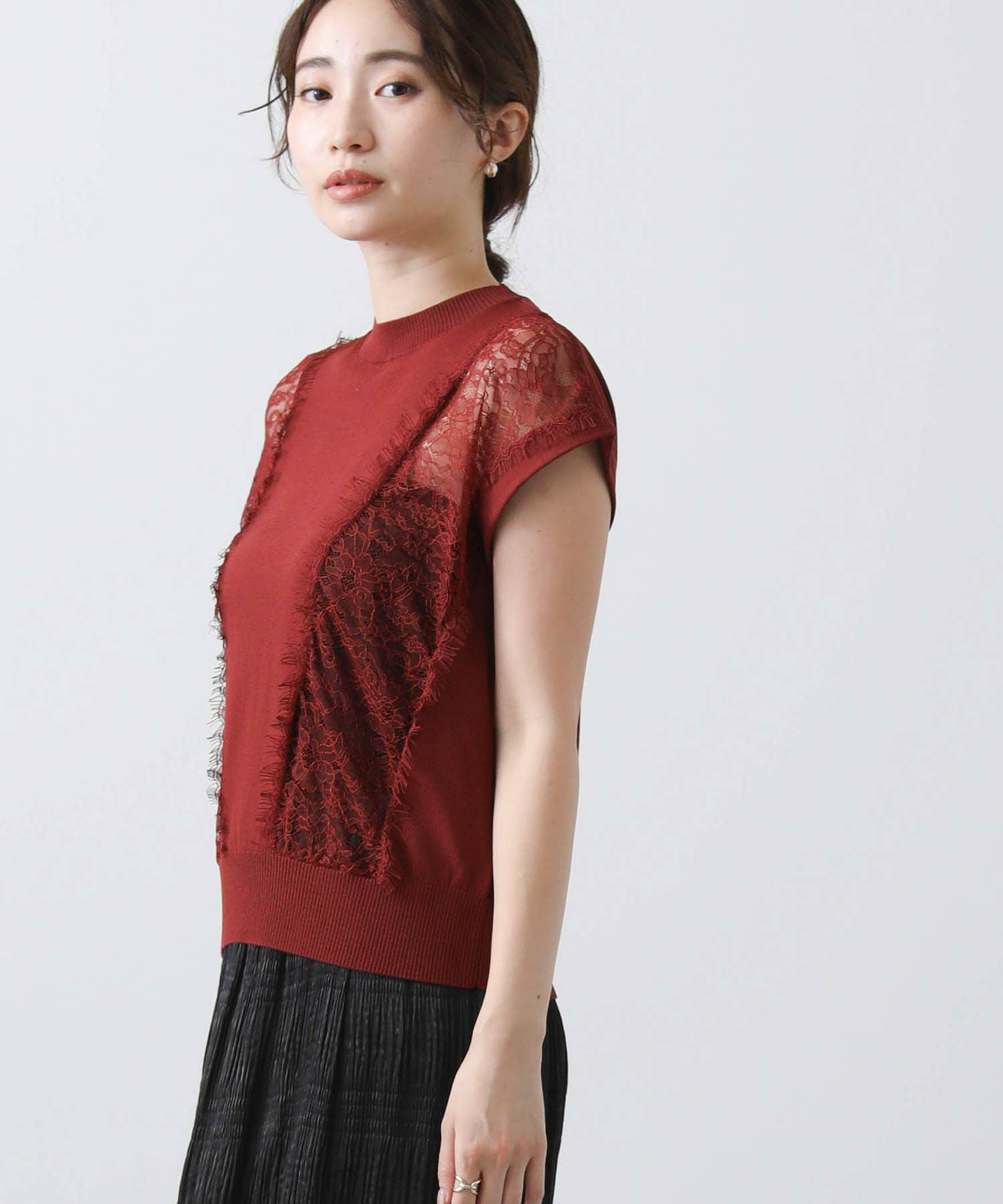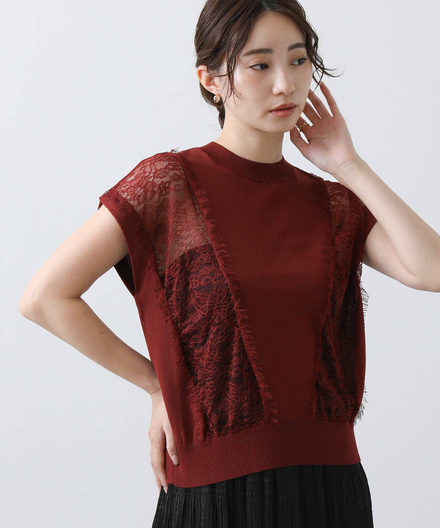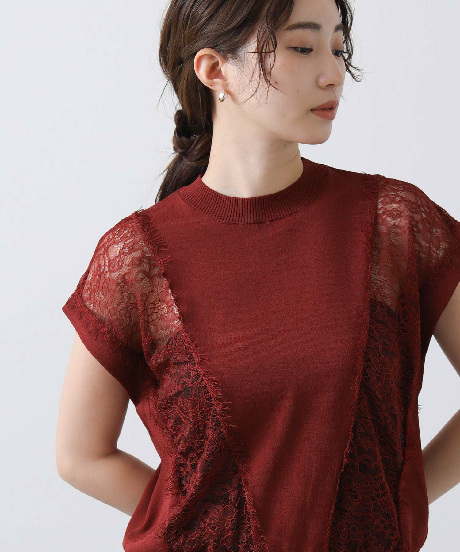 繊細な柄を表現したレースを重ねたニットプルオーバー、シックなカラー展開で色味だけでも秋の先取りコーデが叶う一枚。