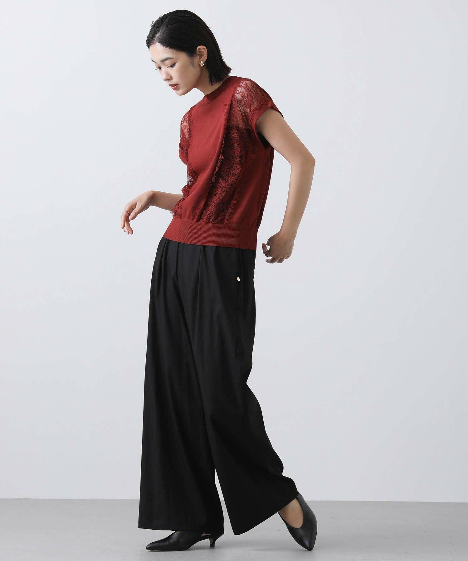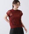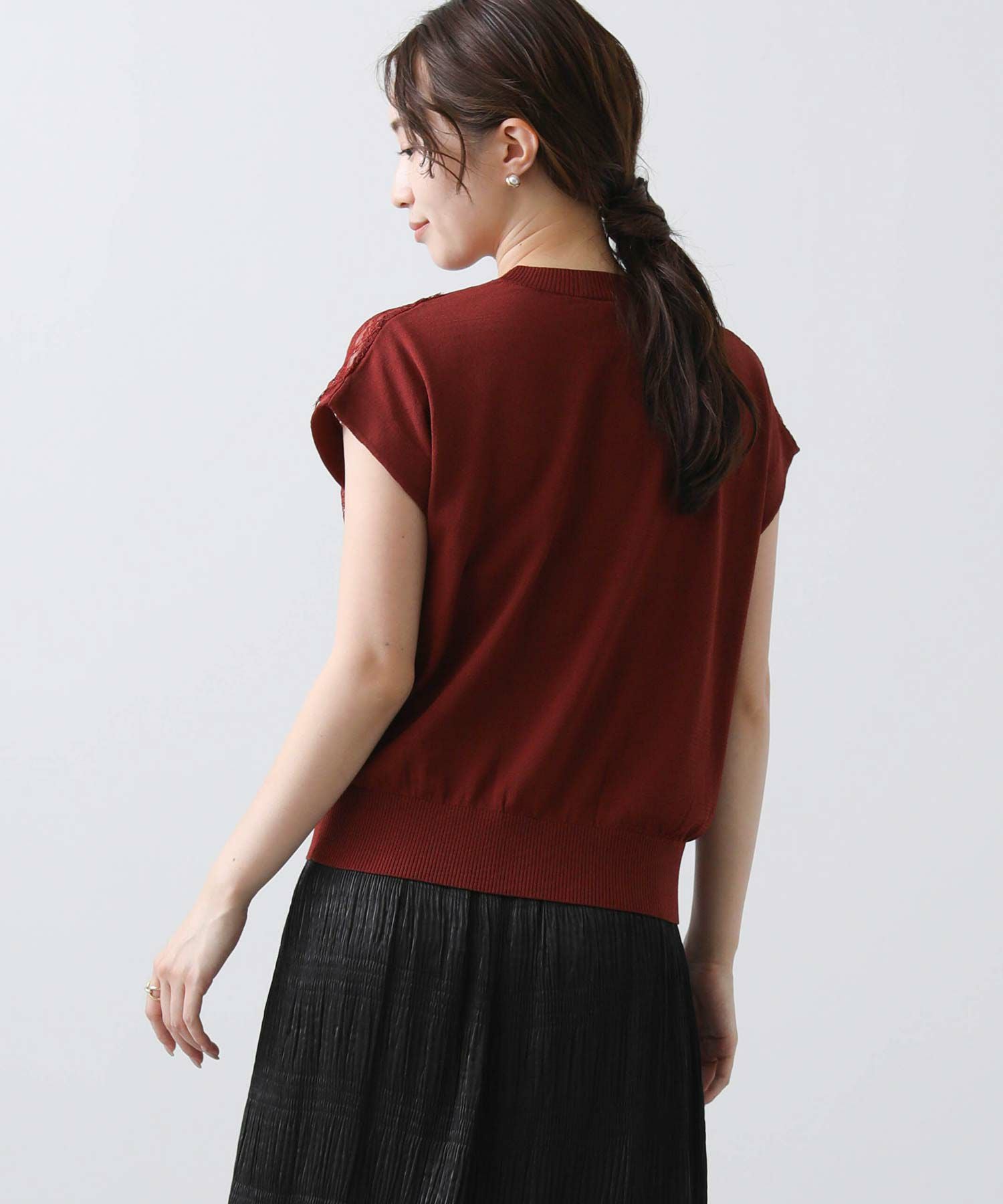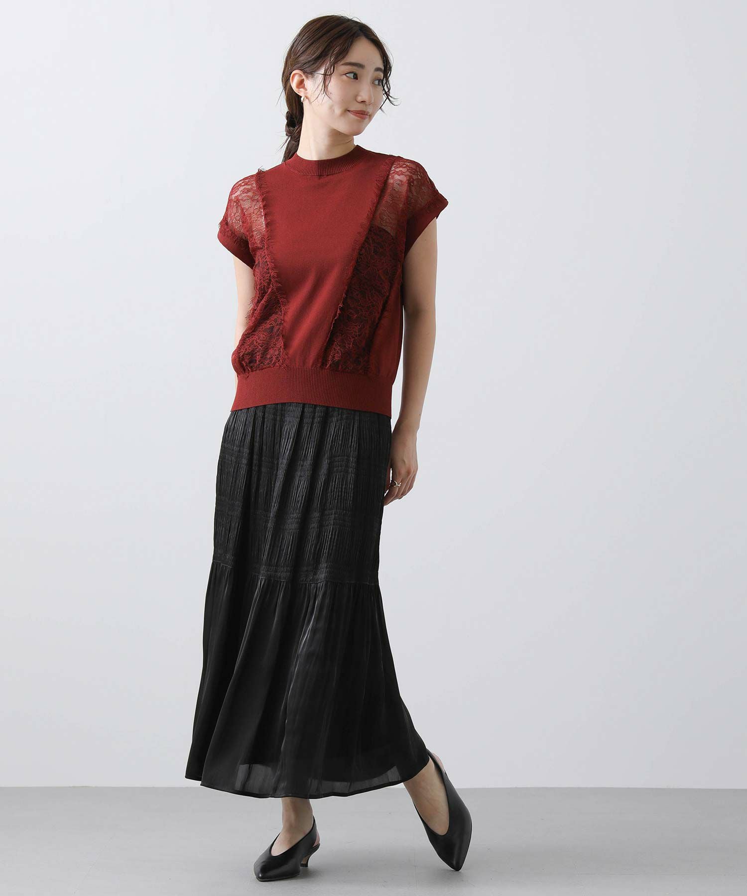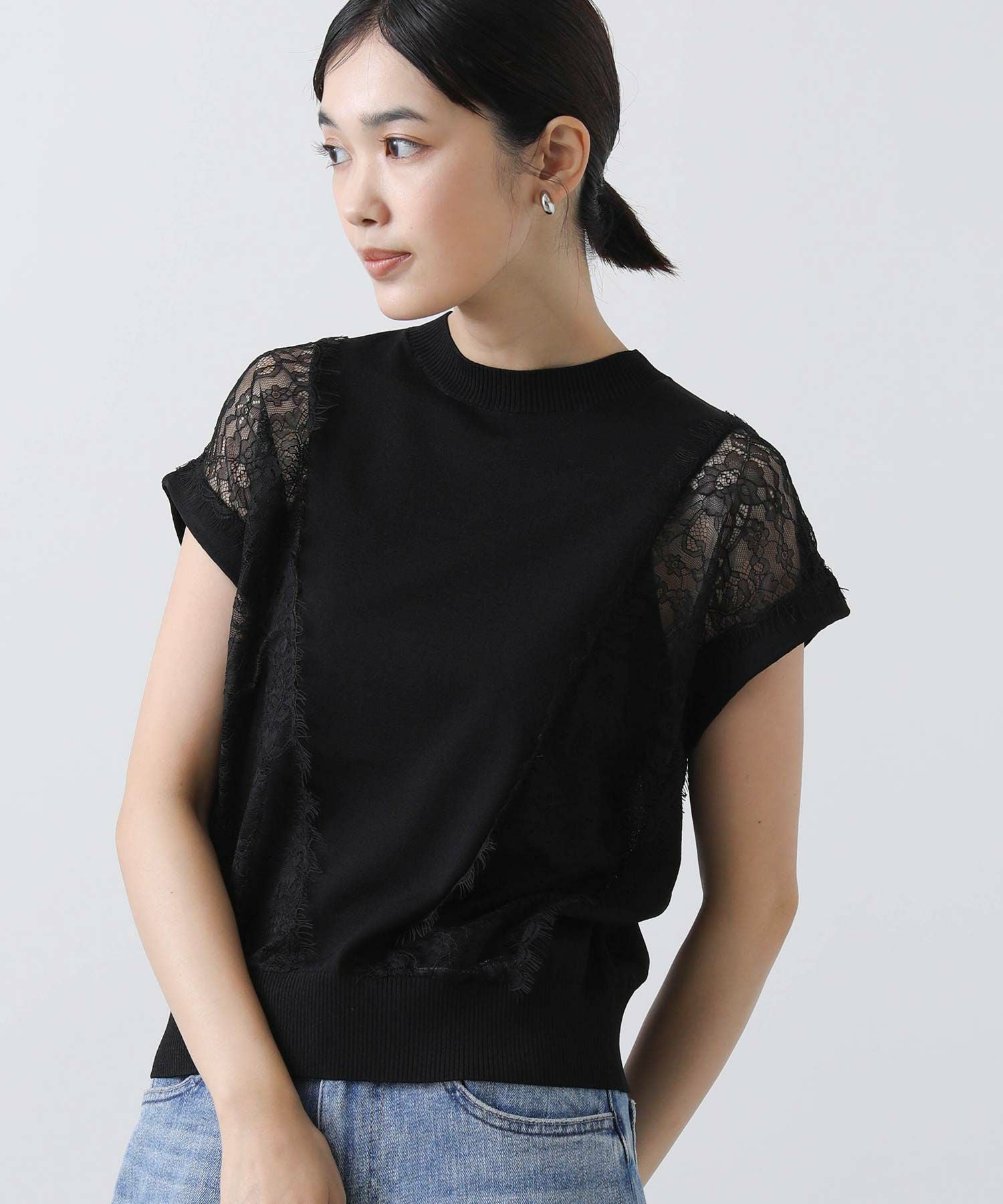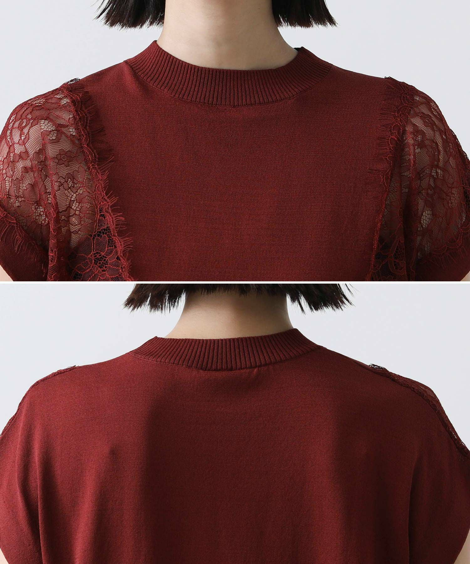 繊細な柄を表現したレースを重ねたニットプルオーバー、シックなカラー展開で色味だけでも秋の先取りコーデが叶う一枚。