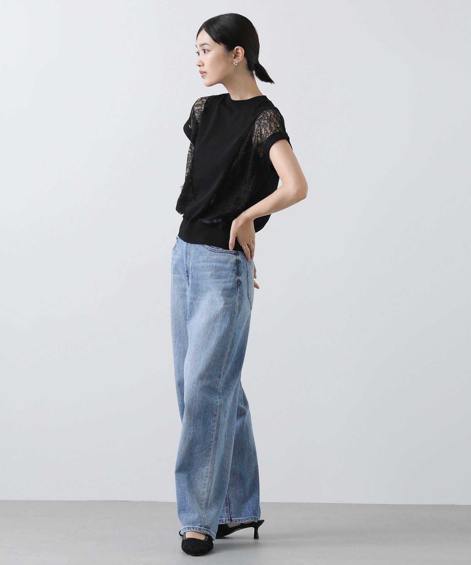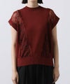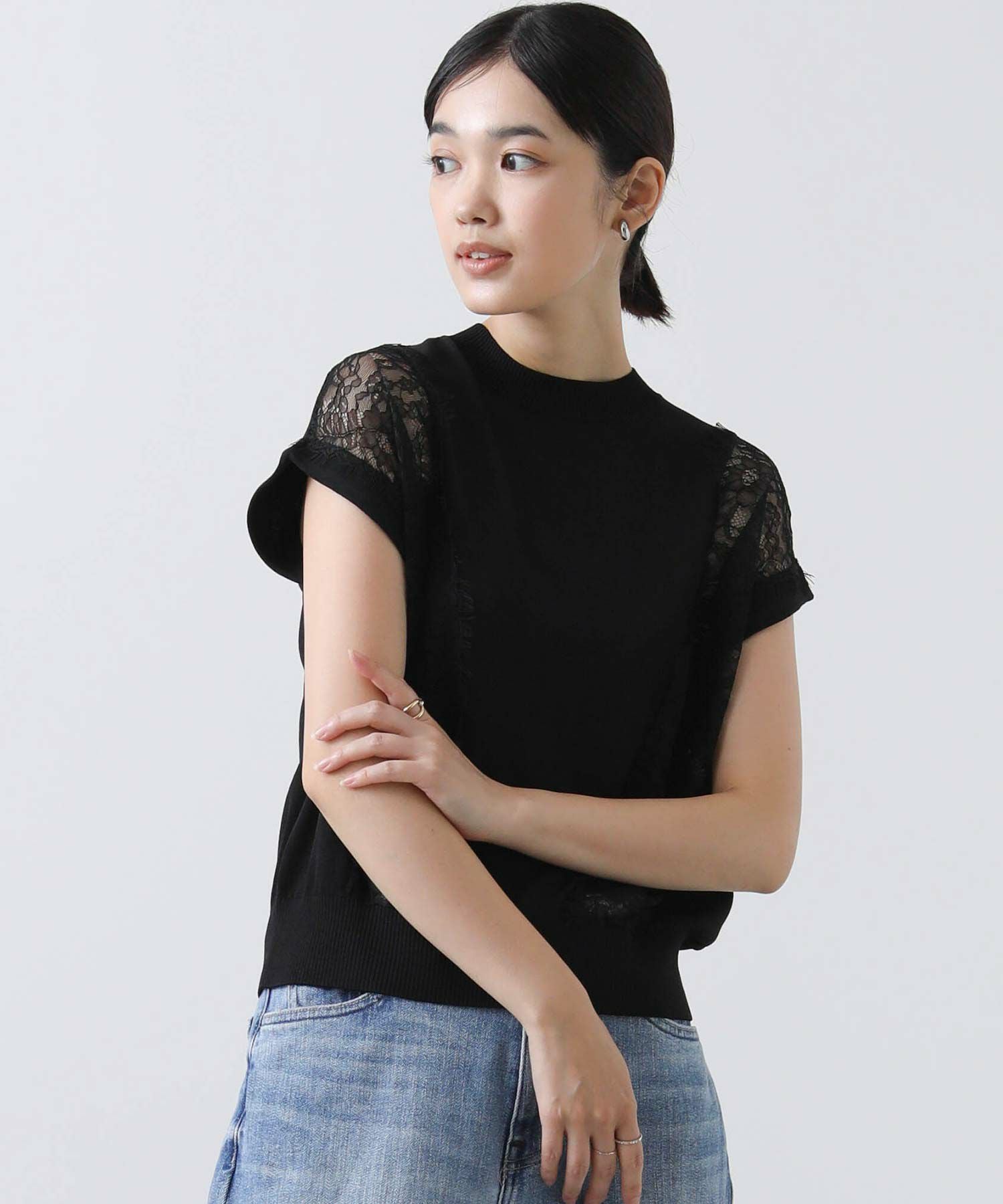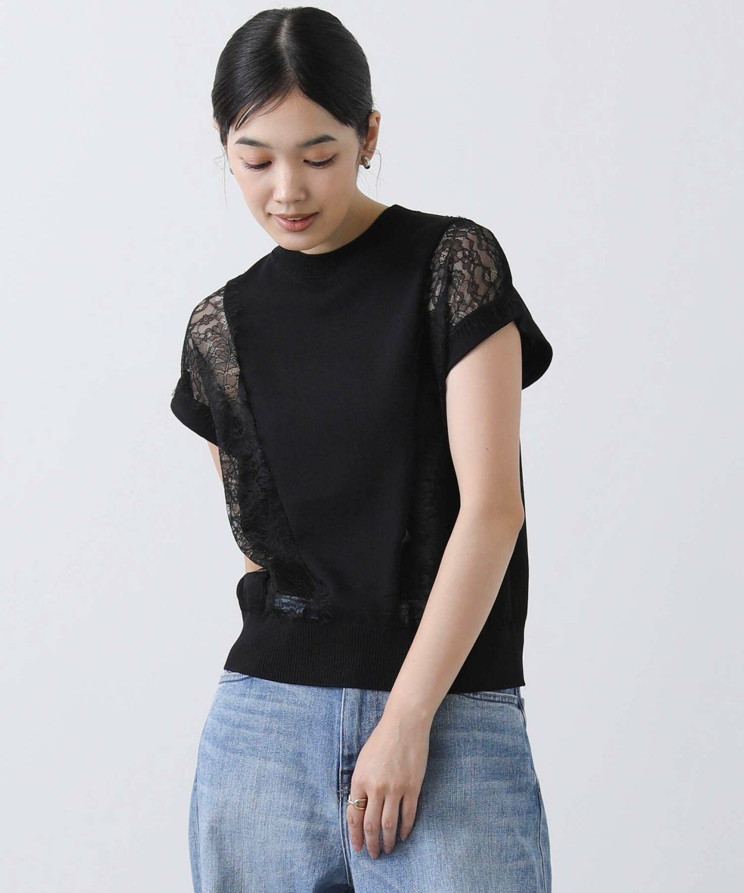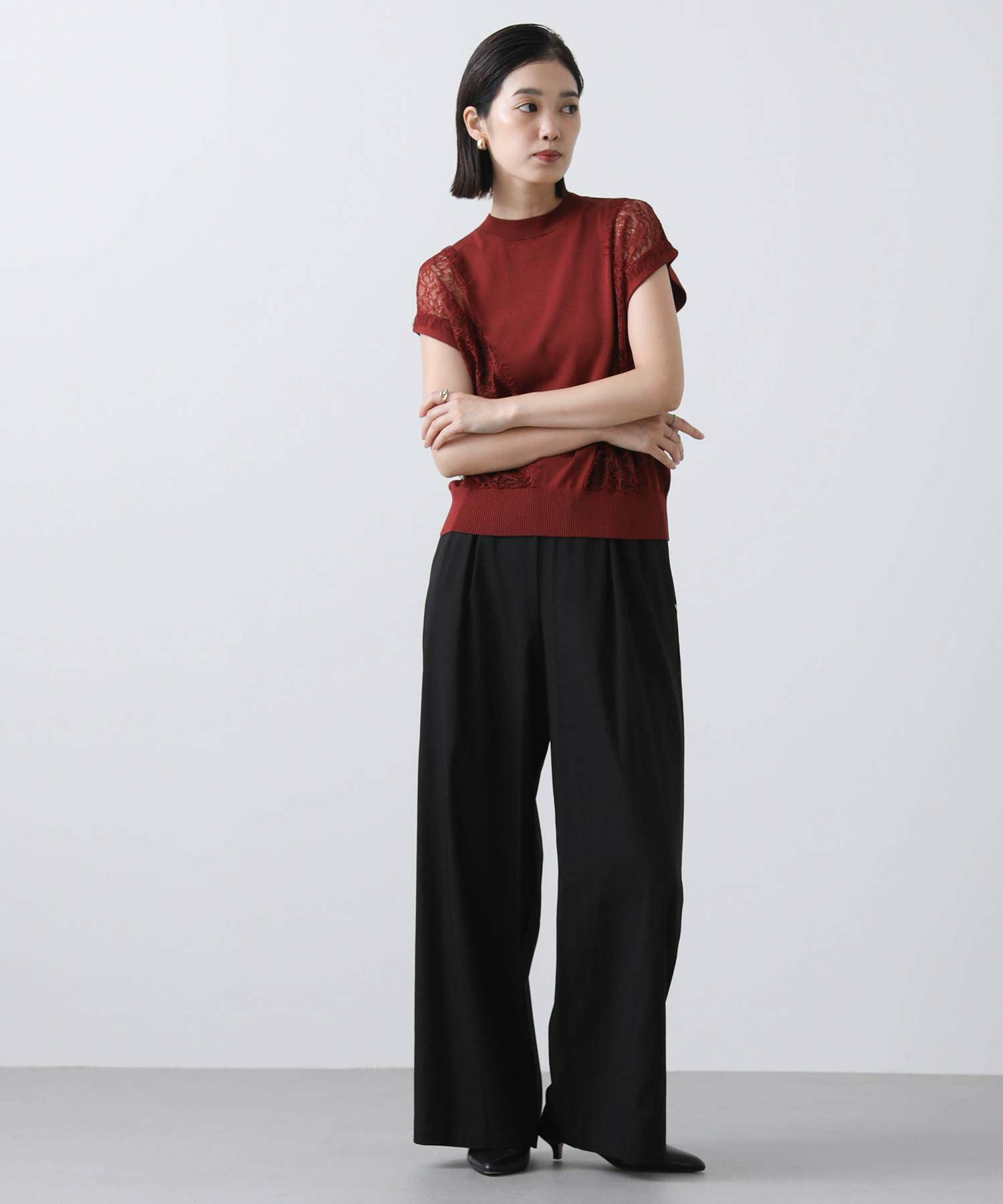 繊細な柄を表現したレースを重ねたニットプルオーバー、シックなカラー展開で色味だけでも秋の先取りコーデが叶う一枚。