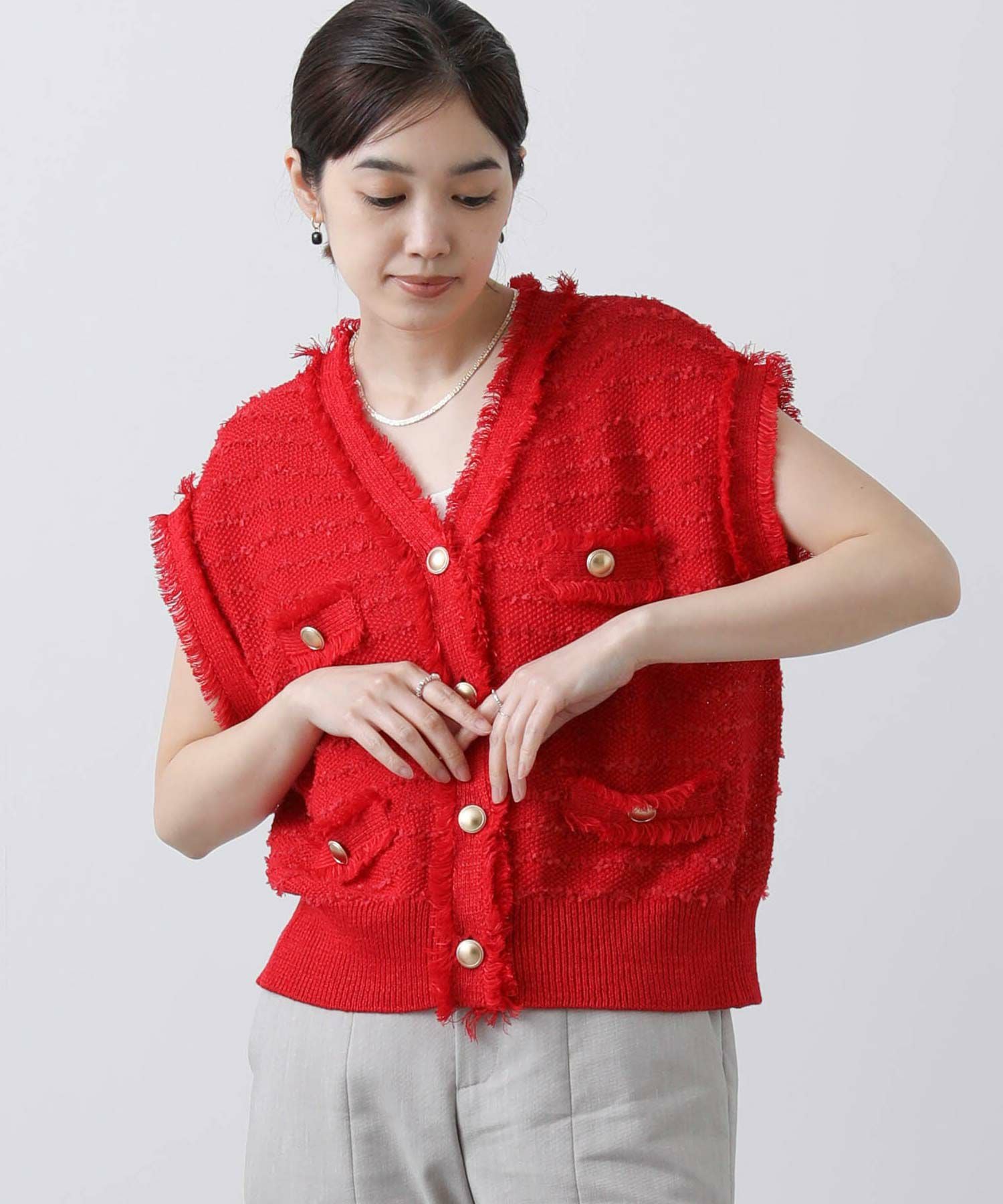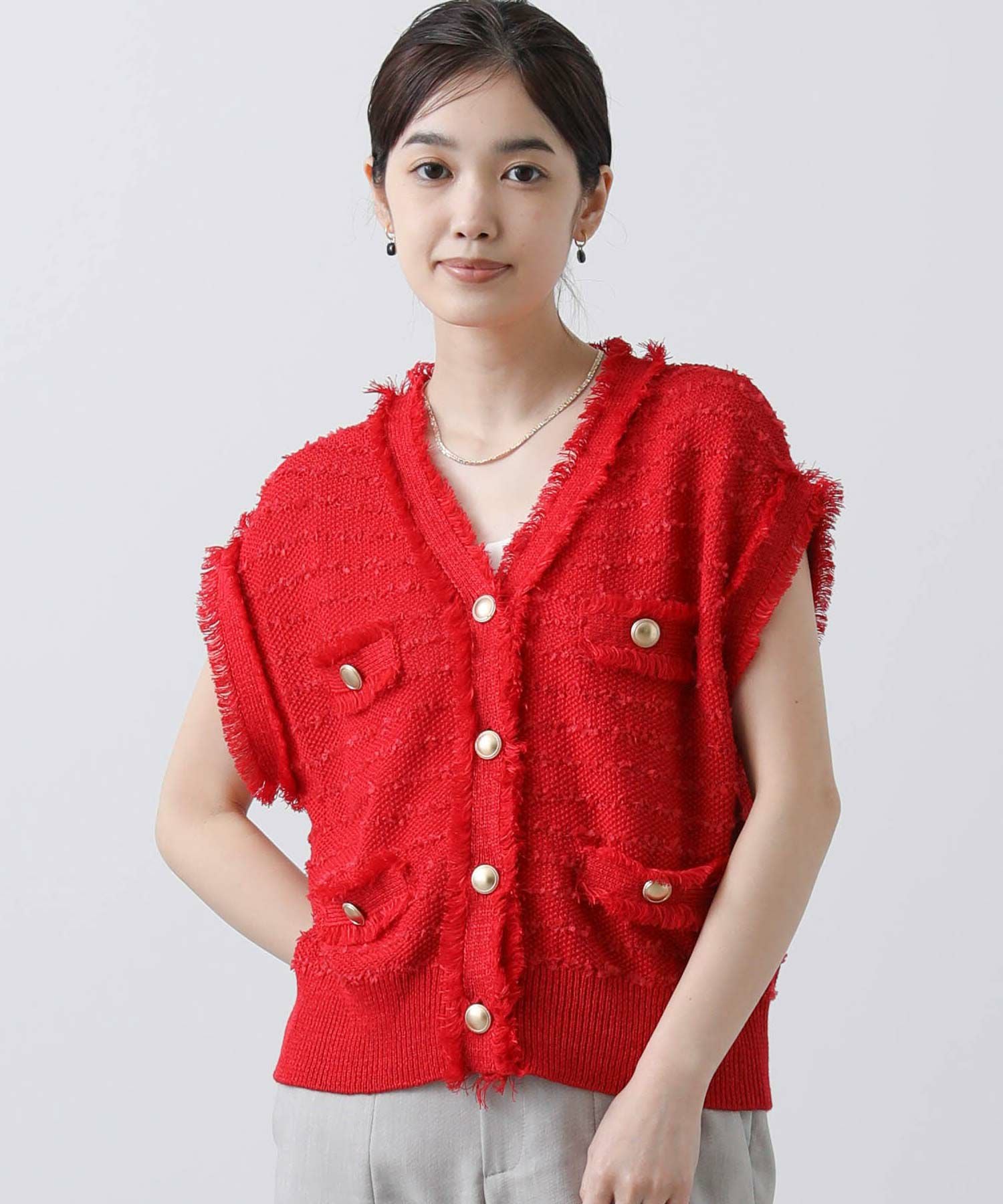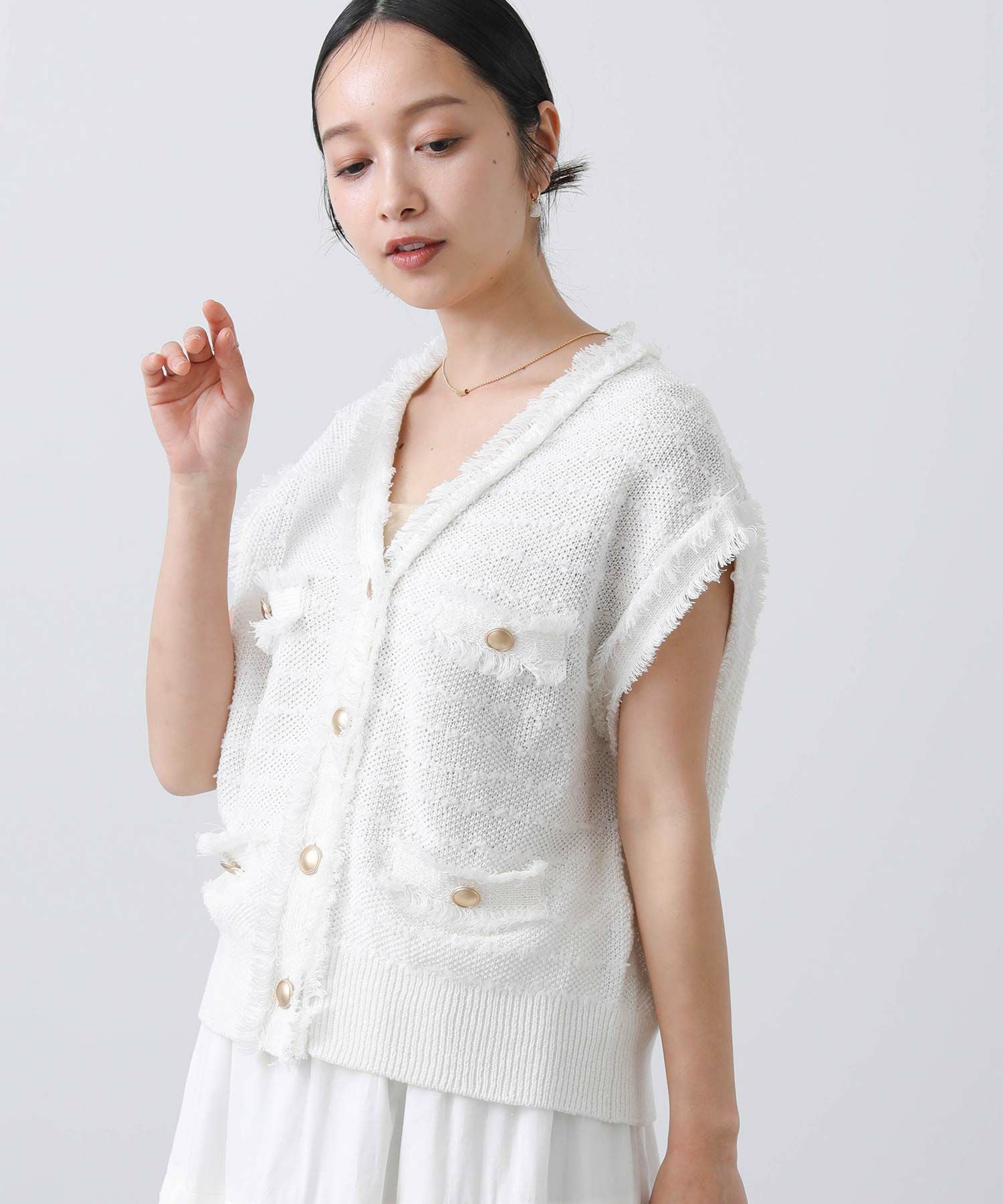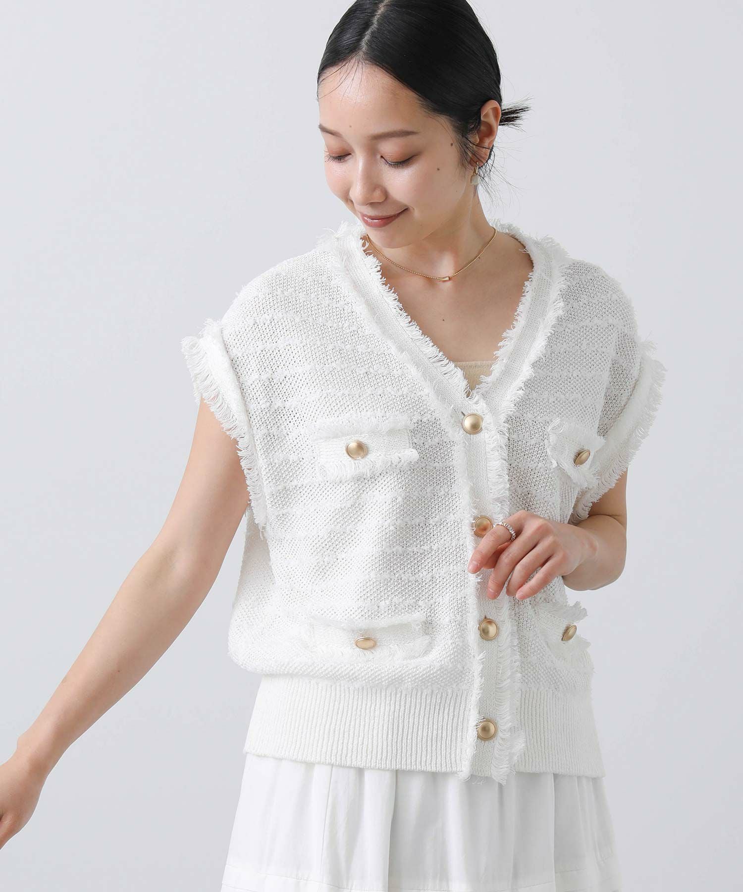 ボタンを止めて一枚着ベストとしてはもちろん、前を開けてワンピなどとレイヤードするのも◎