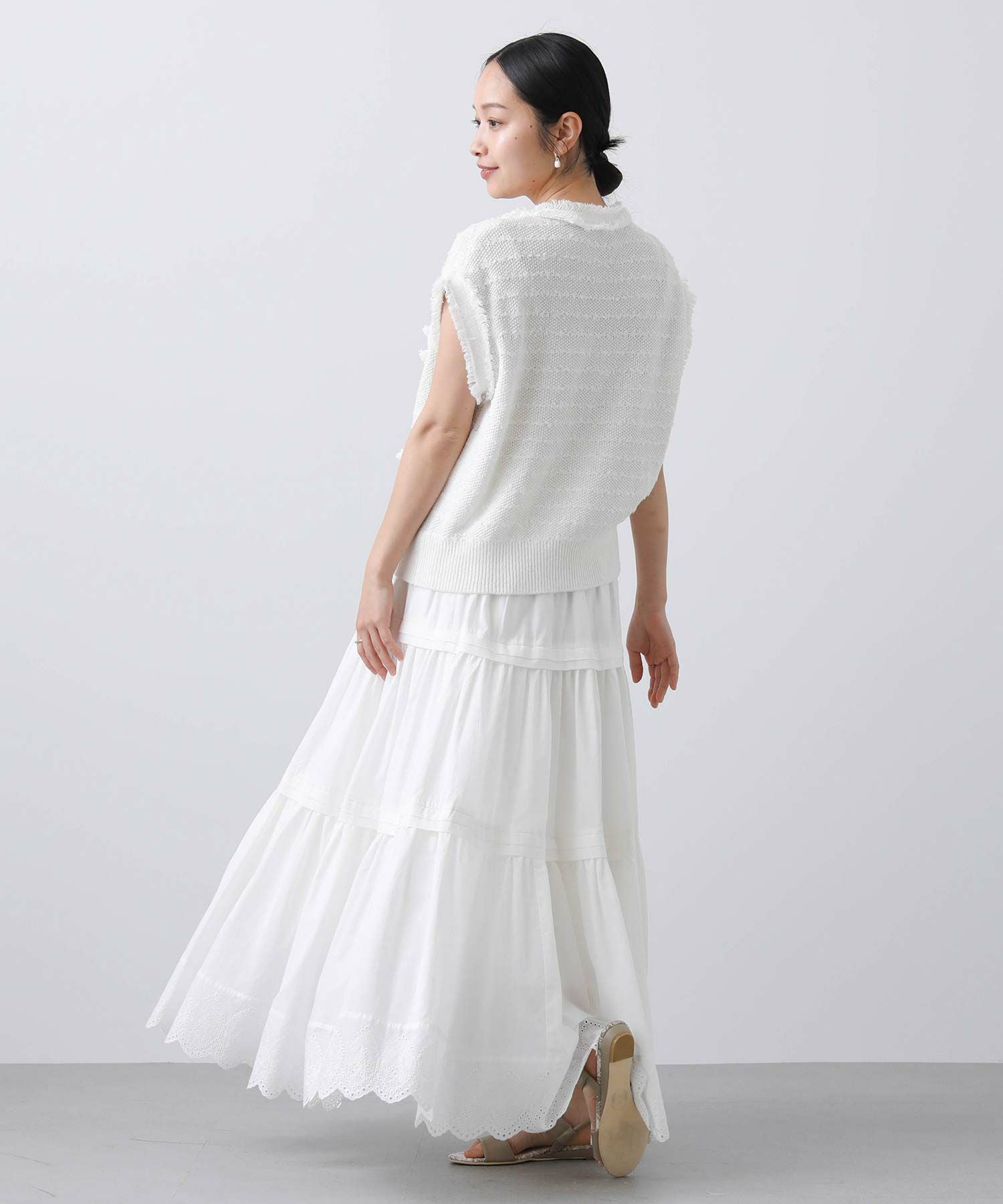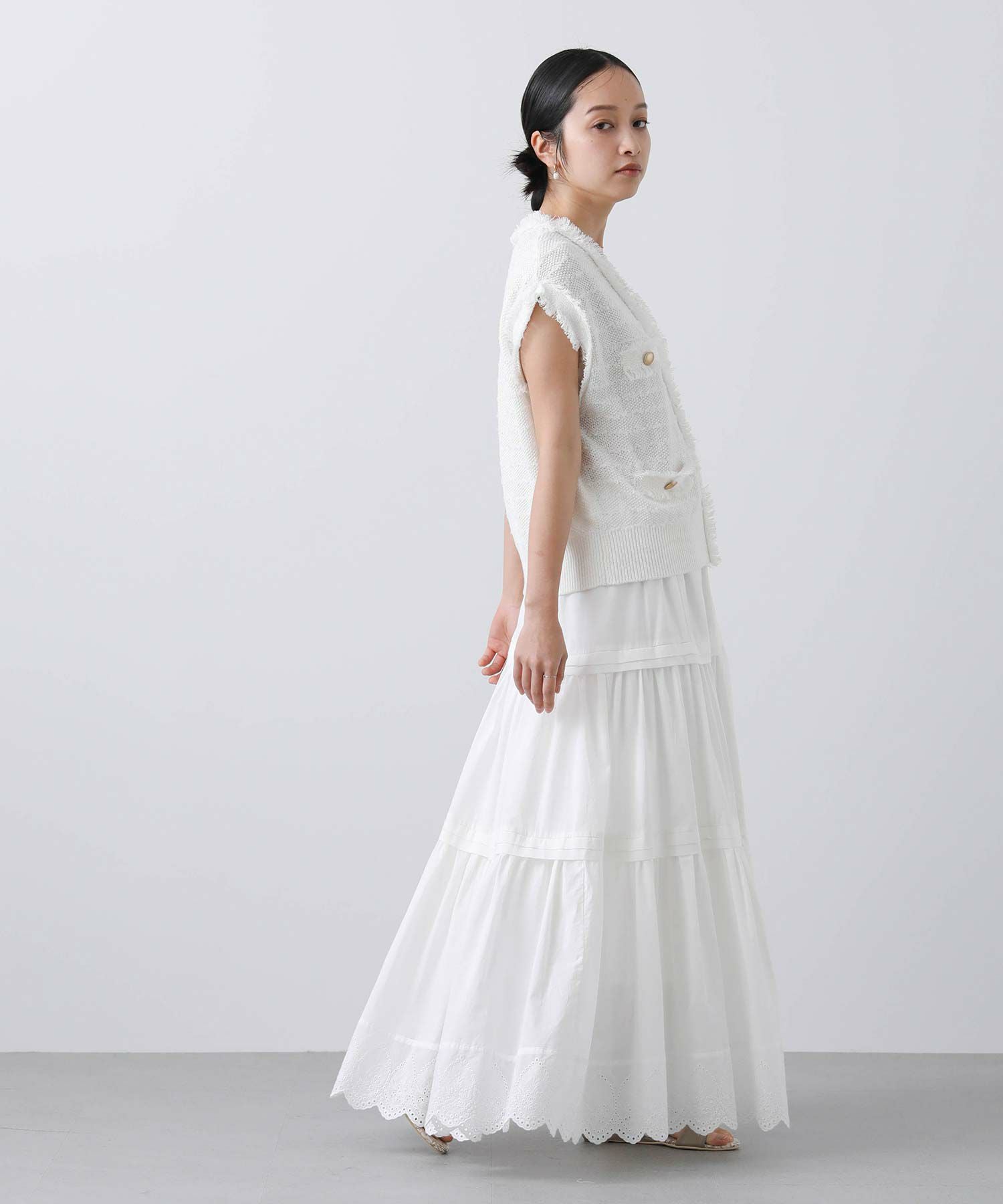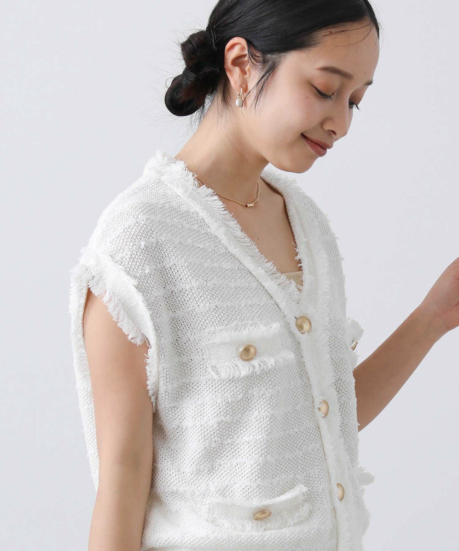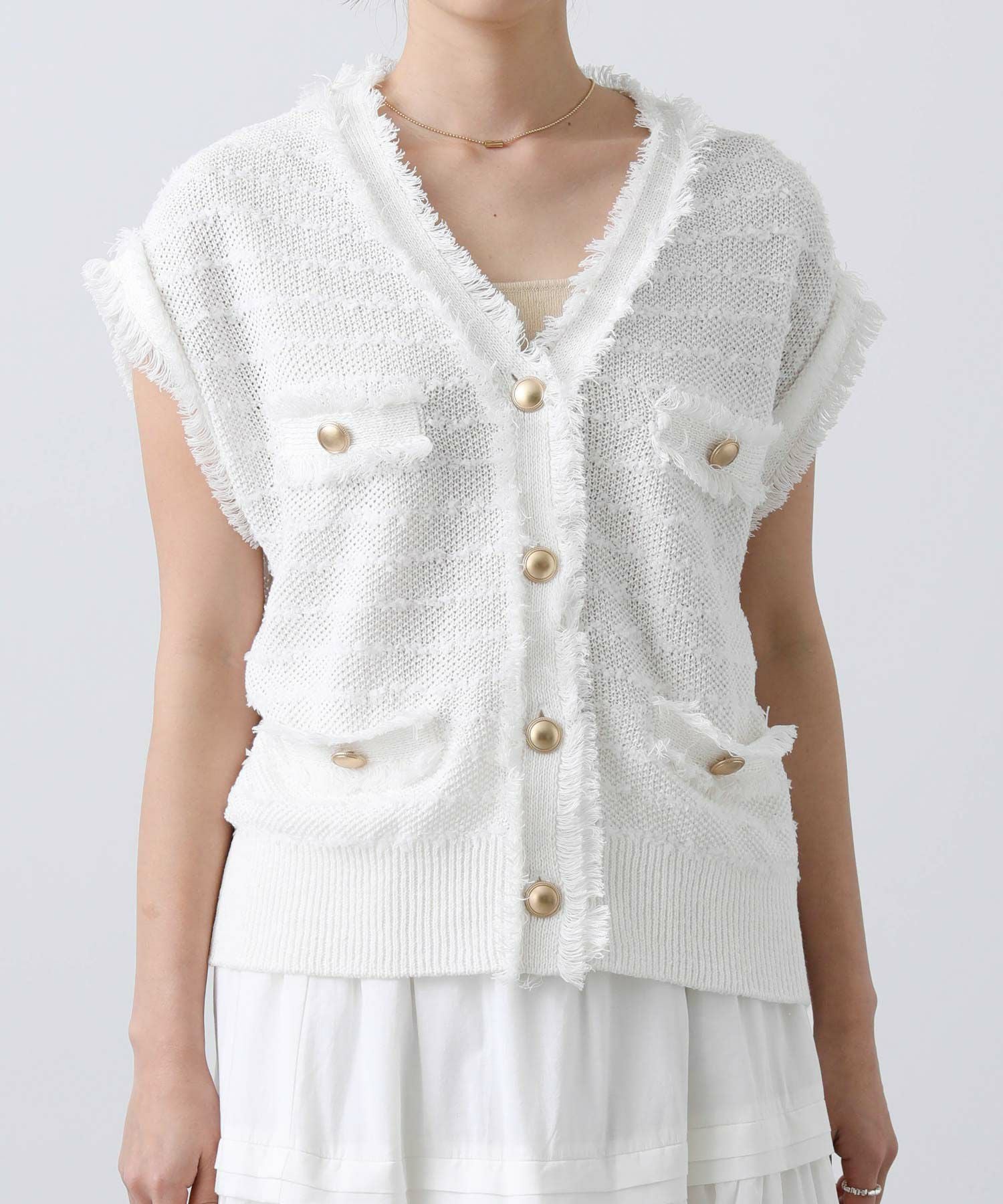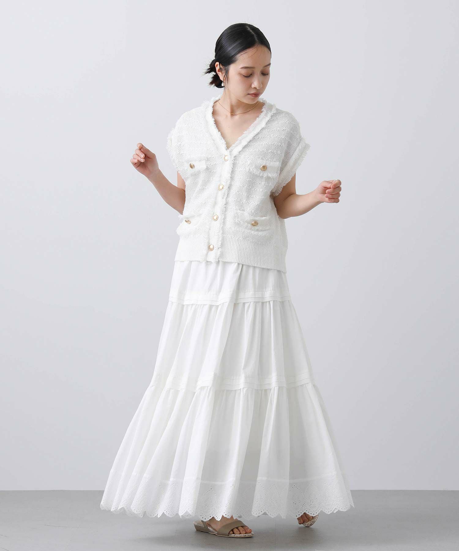 ボタンを止めて一枚着ベストとしてはもちろん、前を開けてワンピなどとレイヤードするのも◎