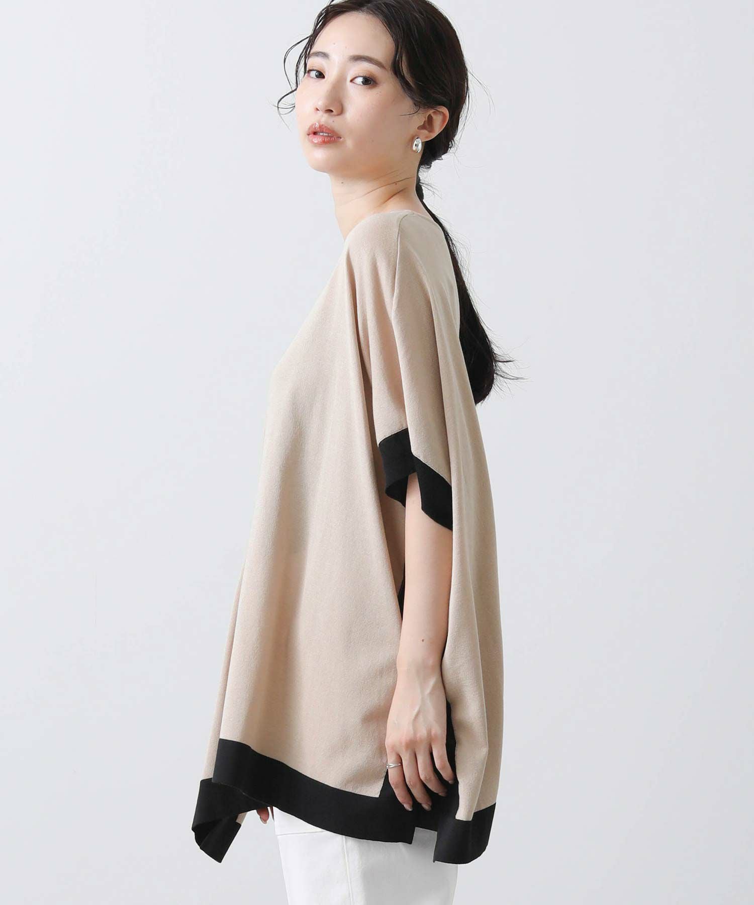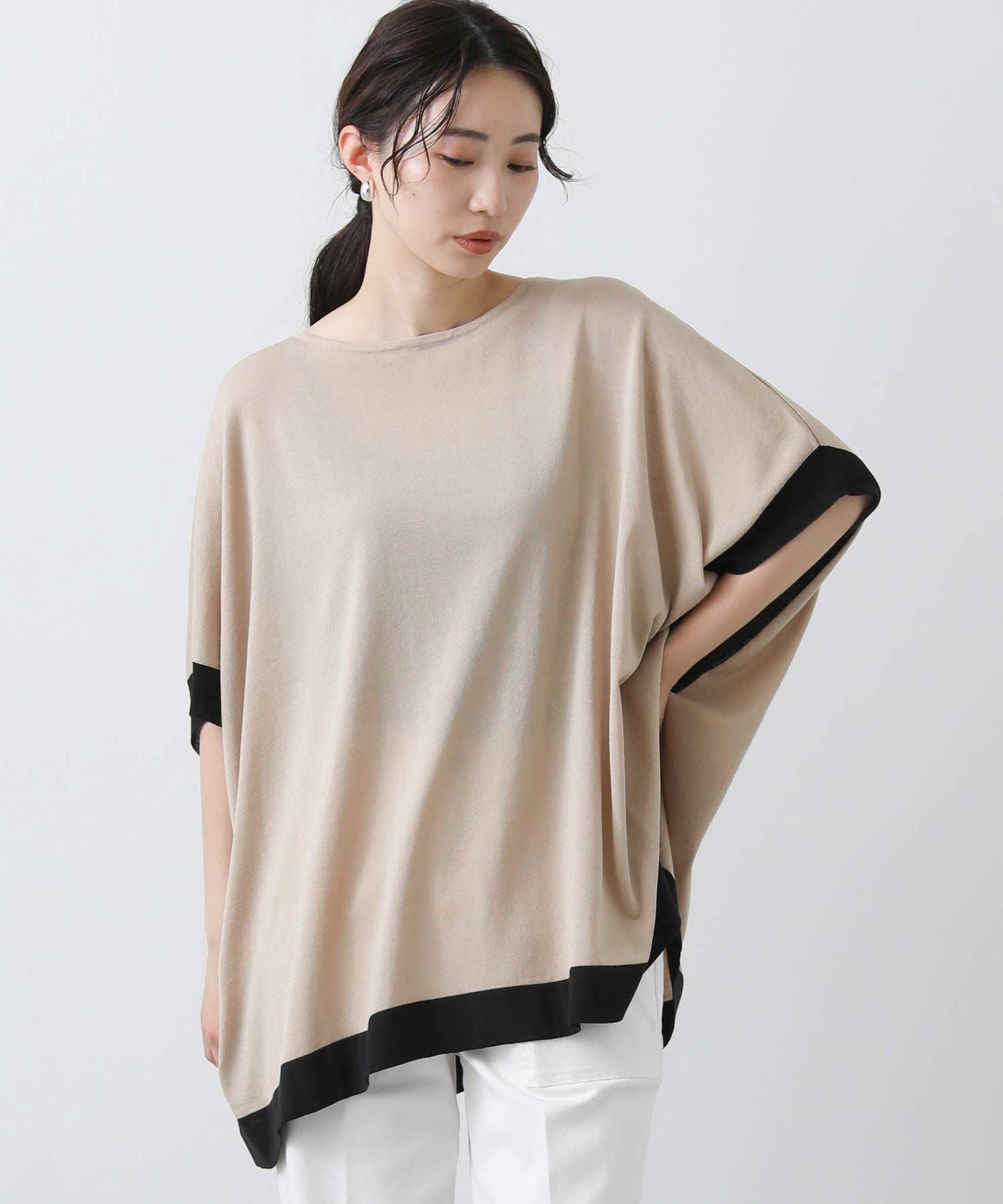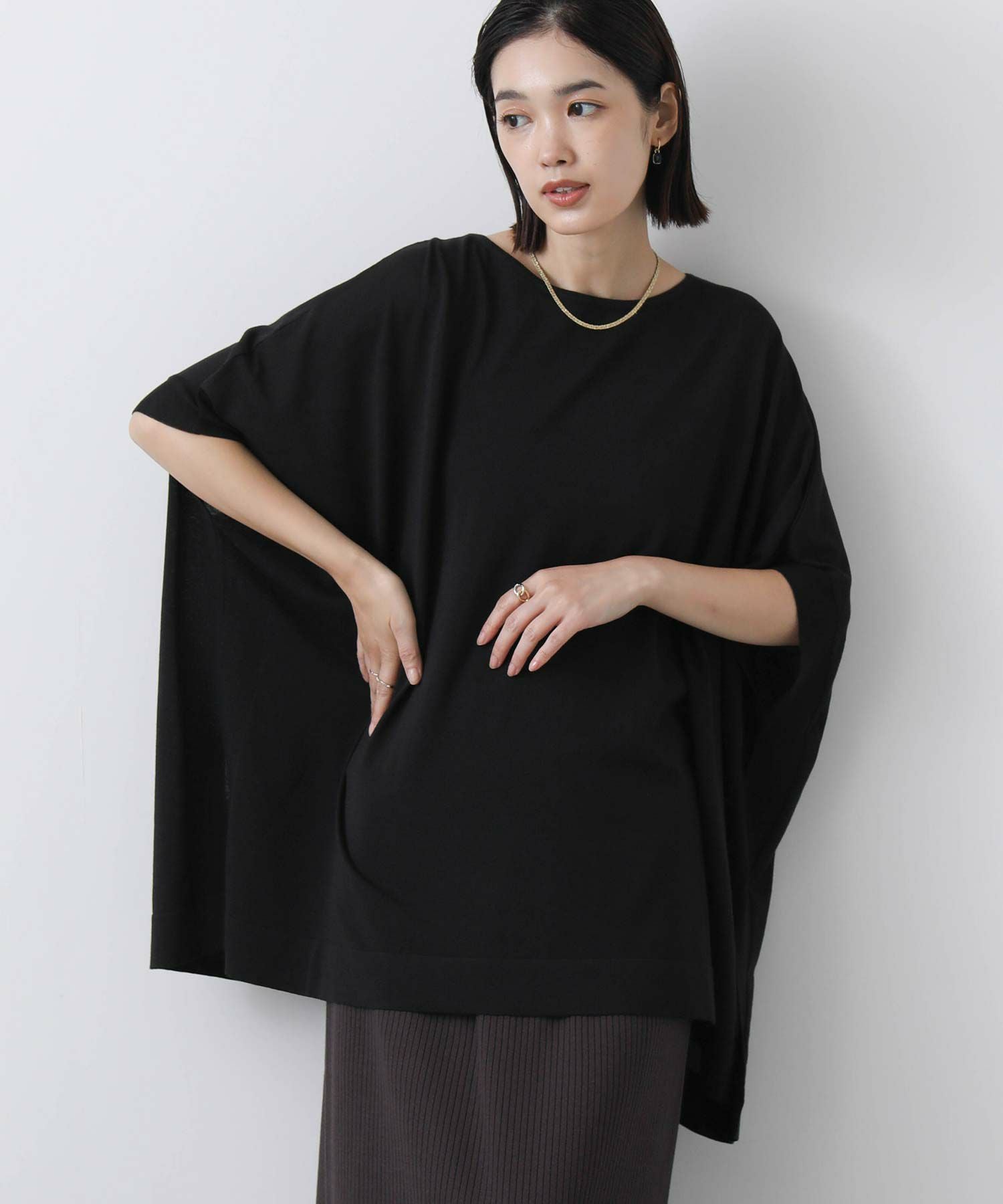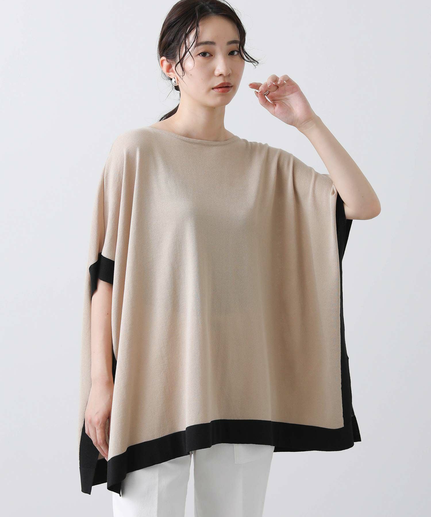 ポンチョシルエットで身体のラインを拾わず、二の腕周りを優しくカバー。
