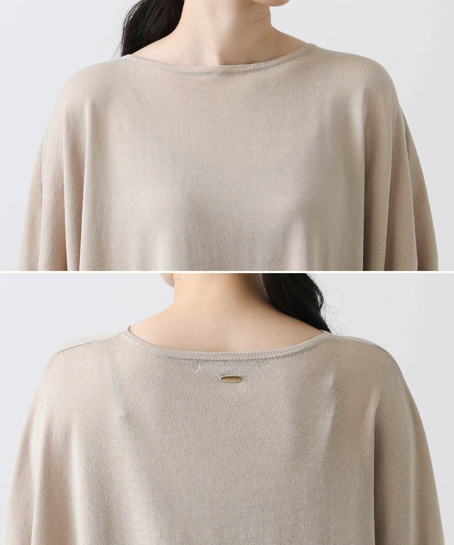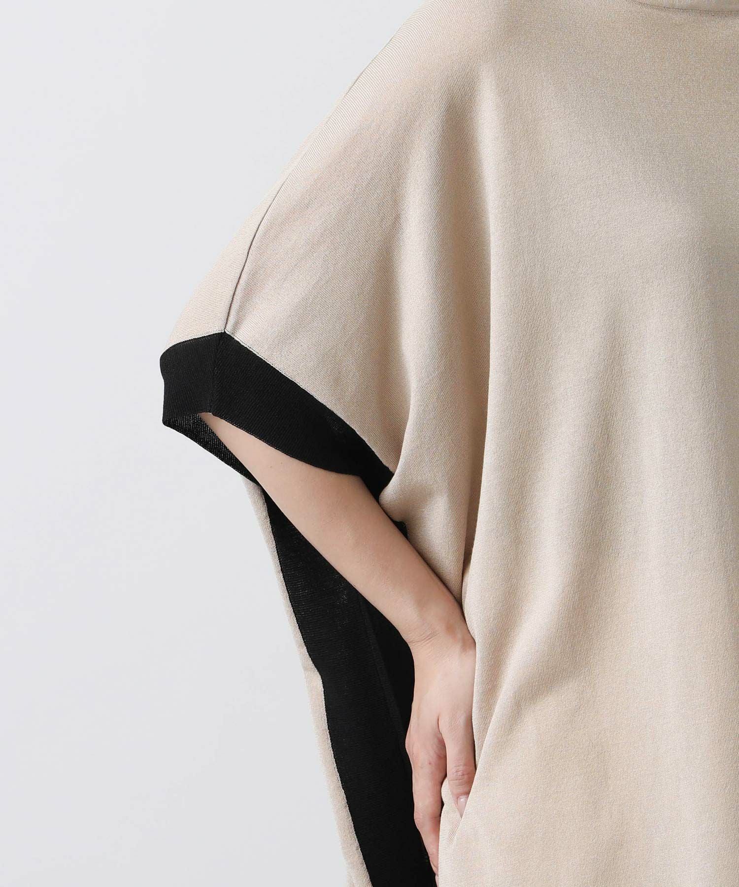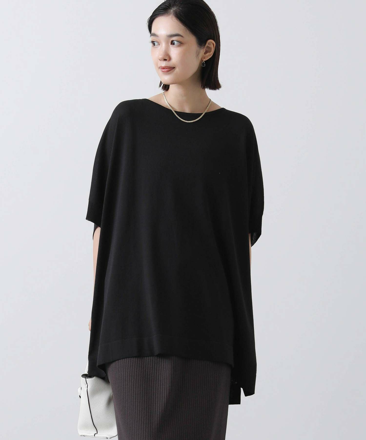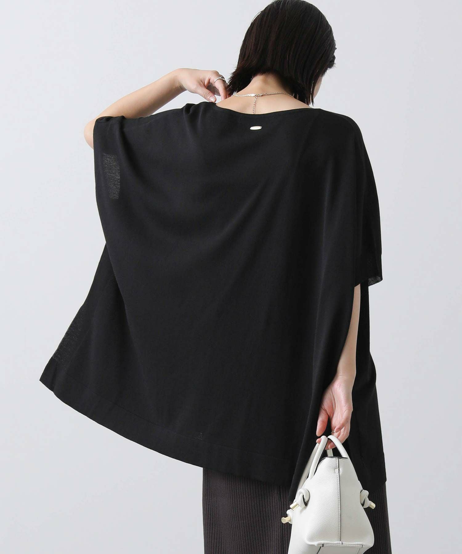 ポンチョシルエットで身体のラインを拾わず、二の腕周りを優しくカバー。