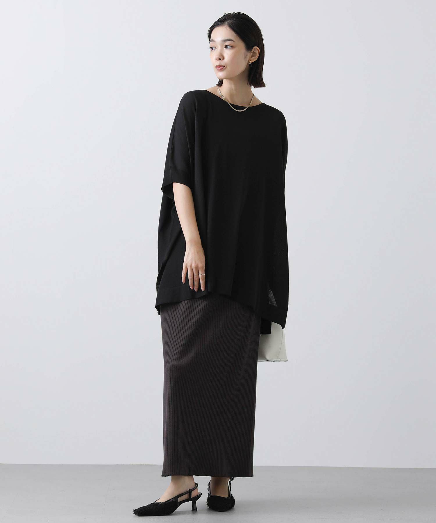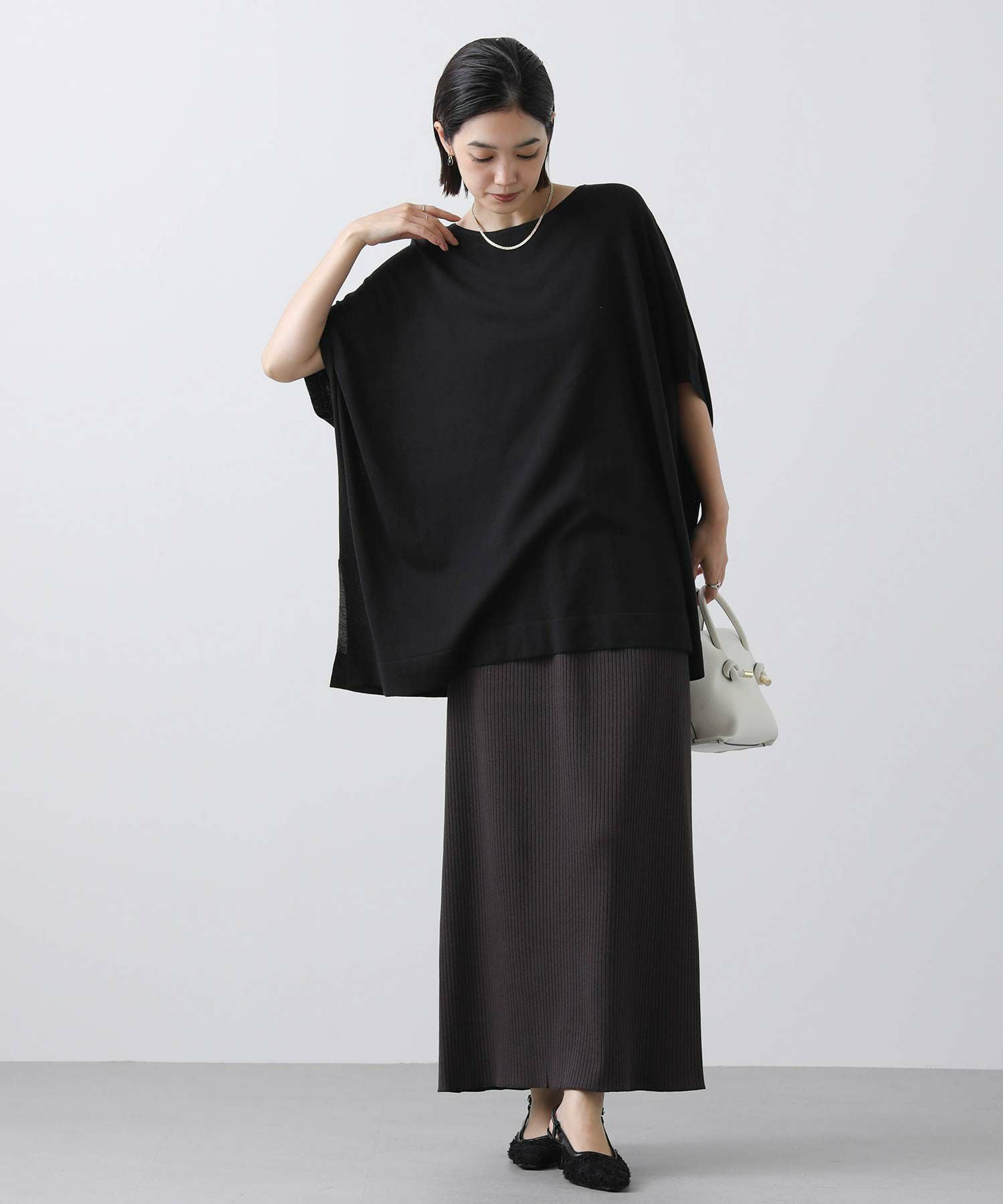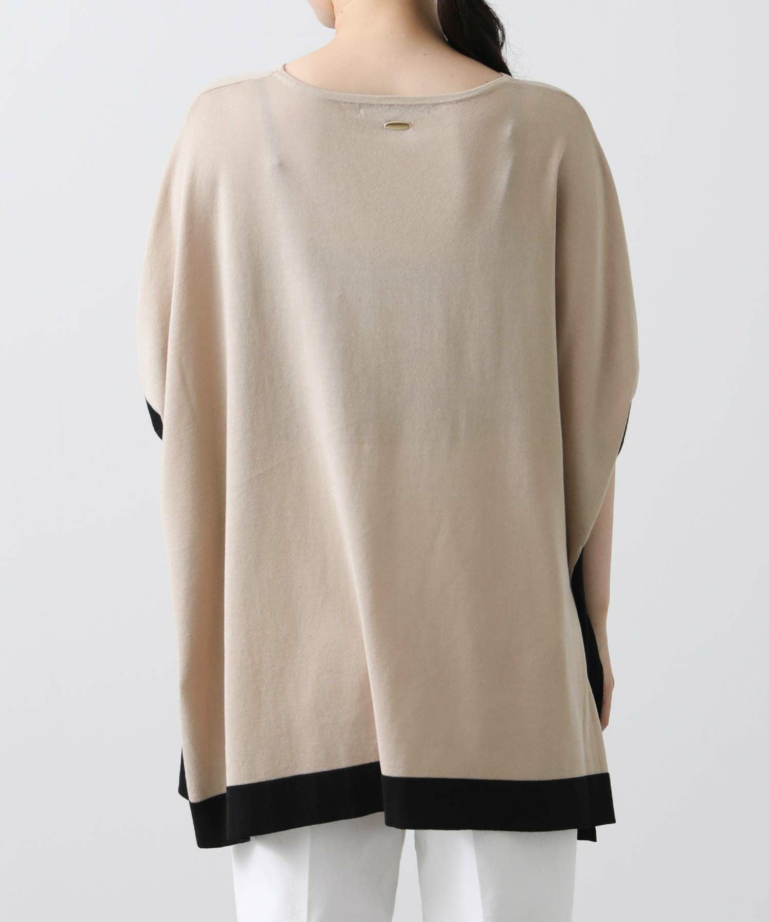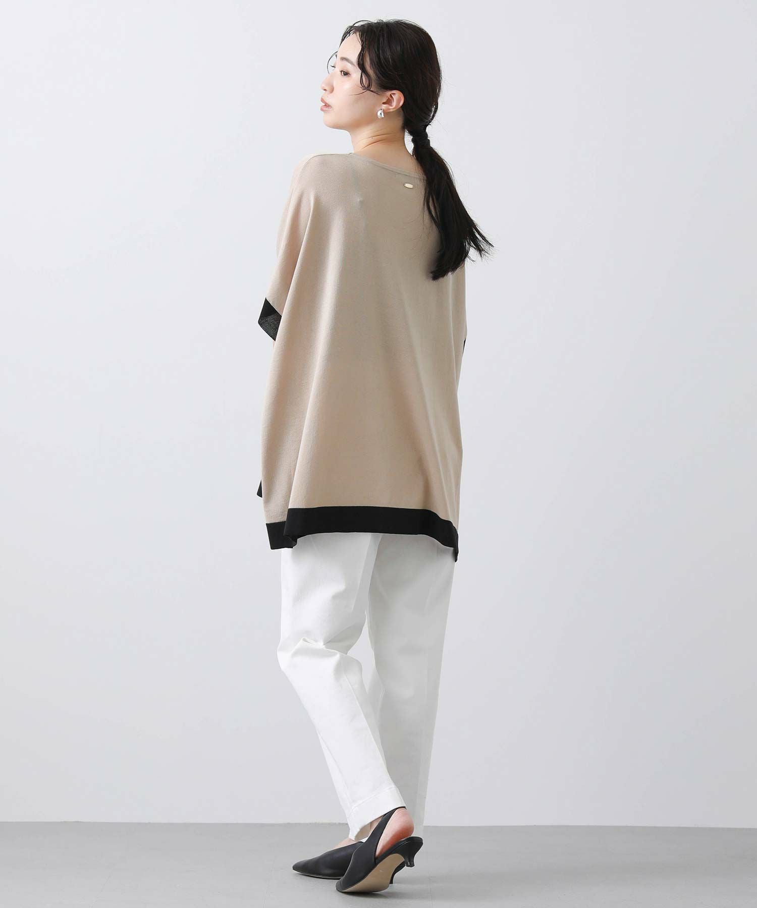 ポンチョシルエットで身体のラインを拾わず、二の腕周りを優しくカバー。