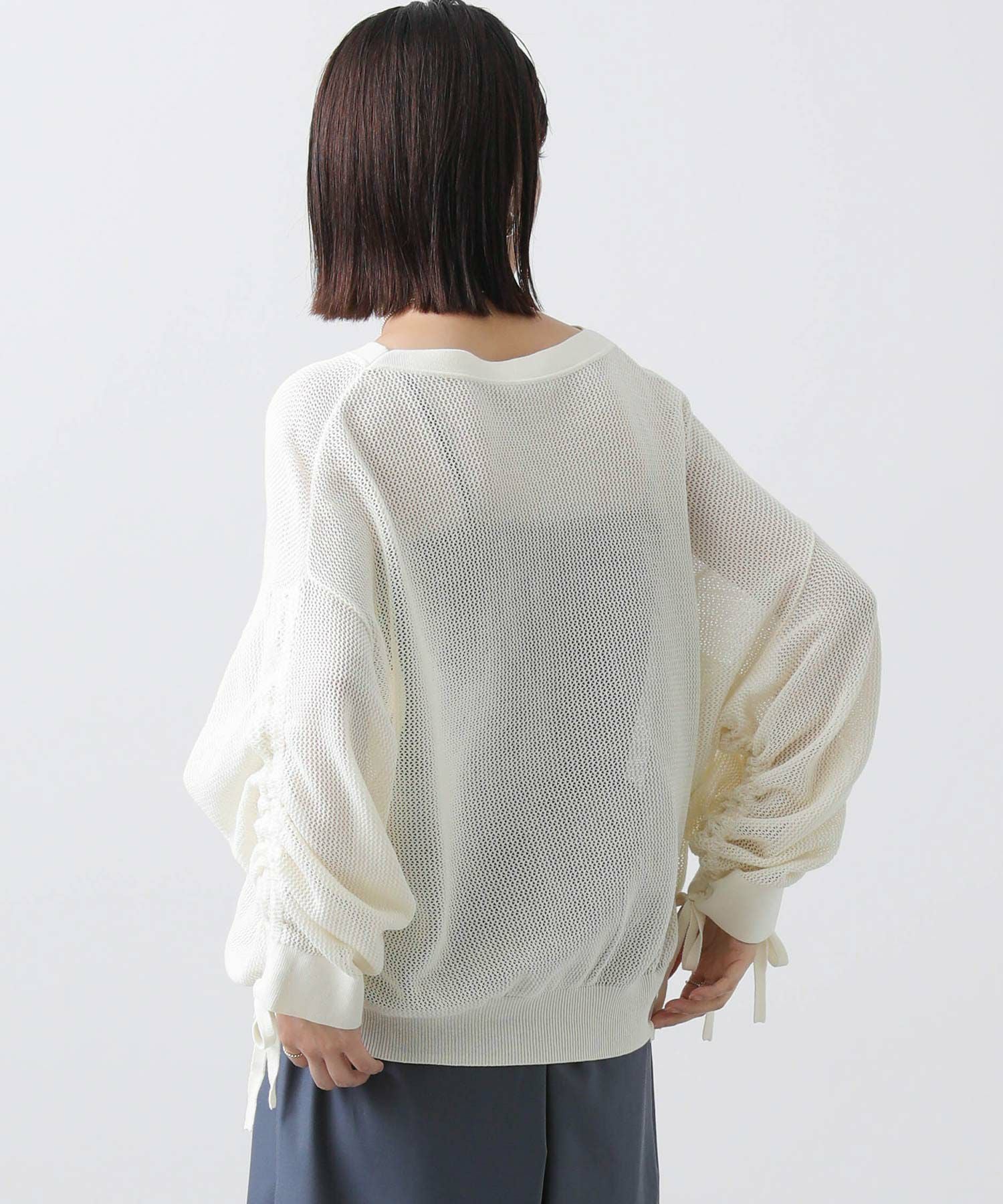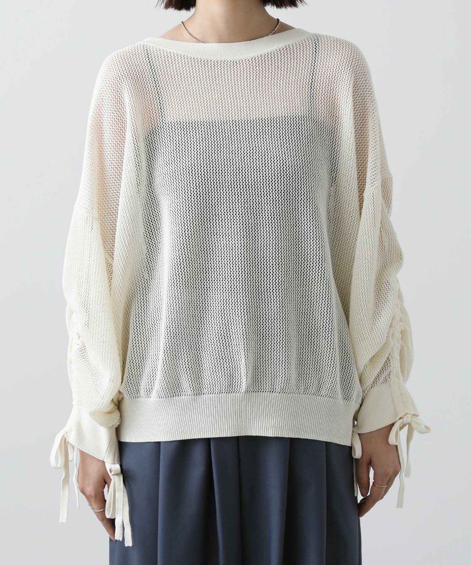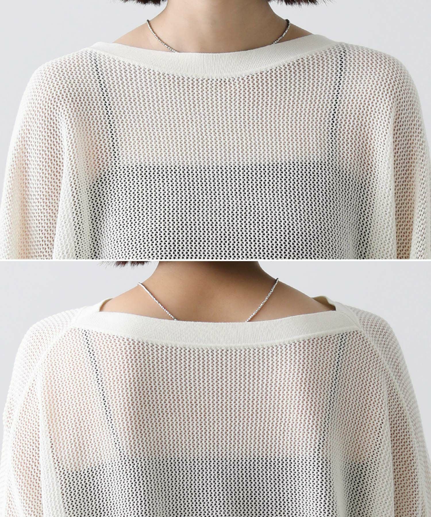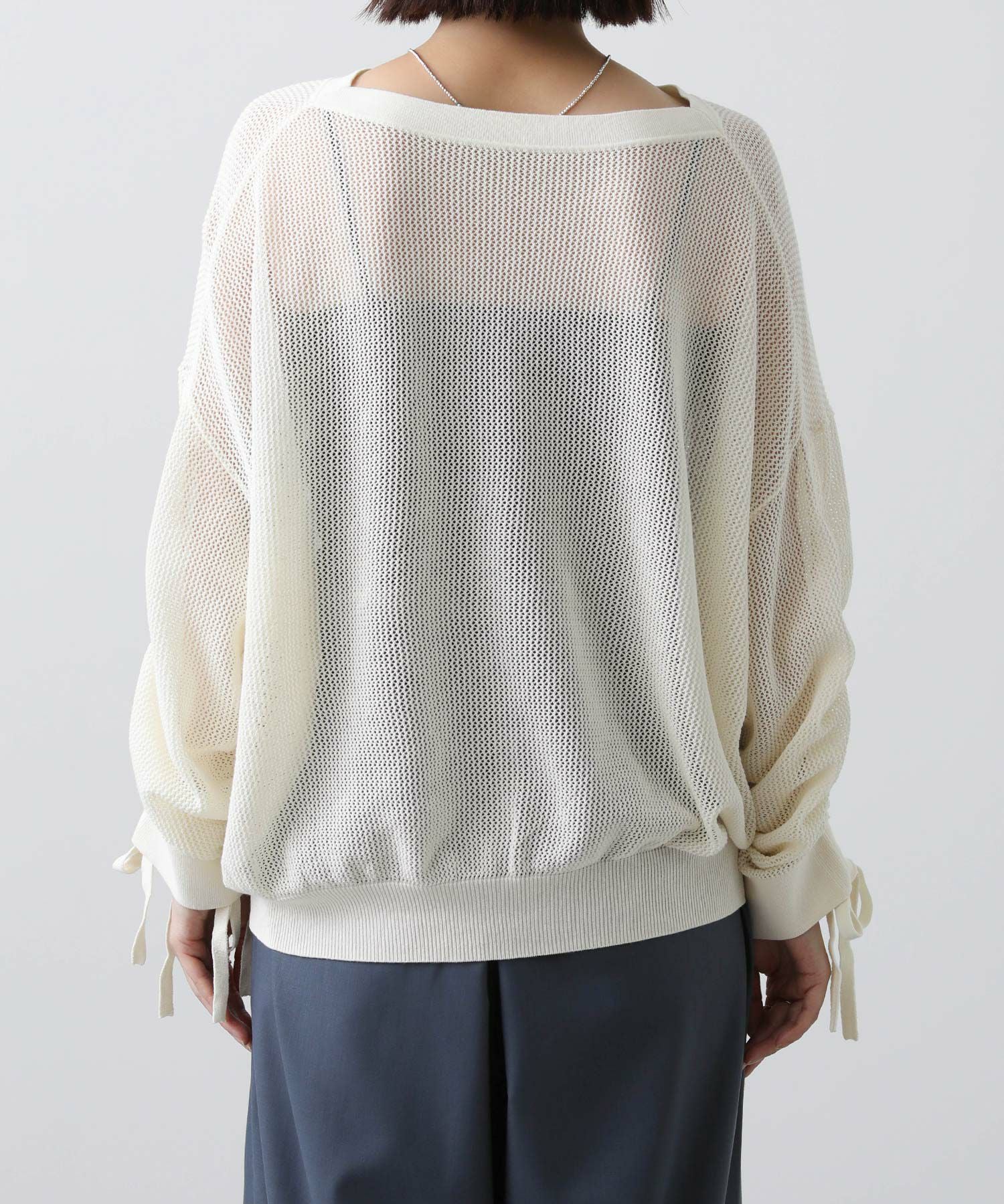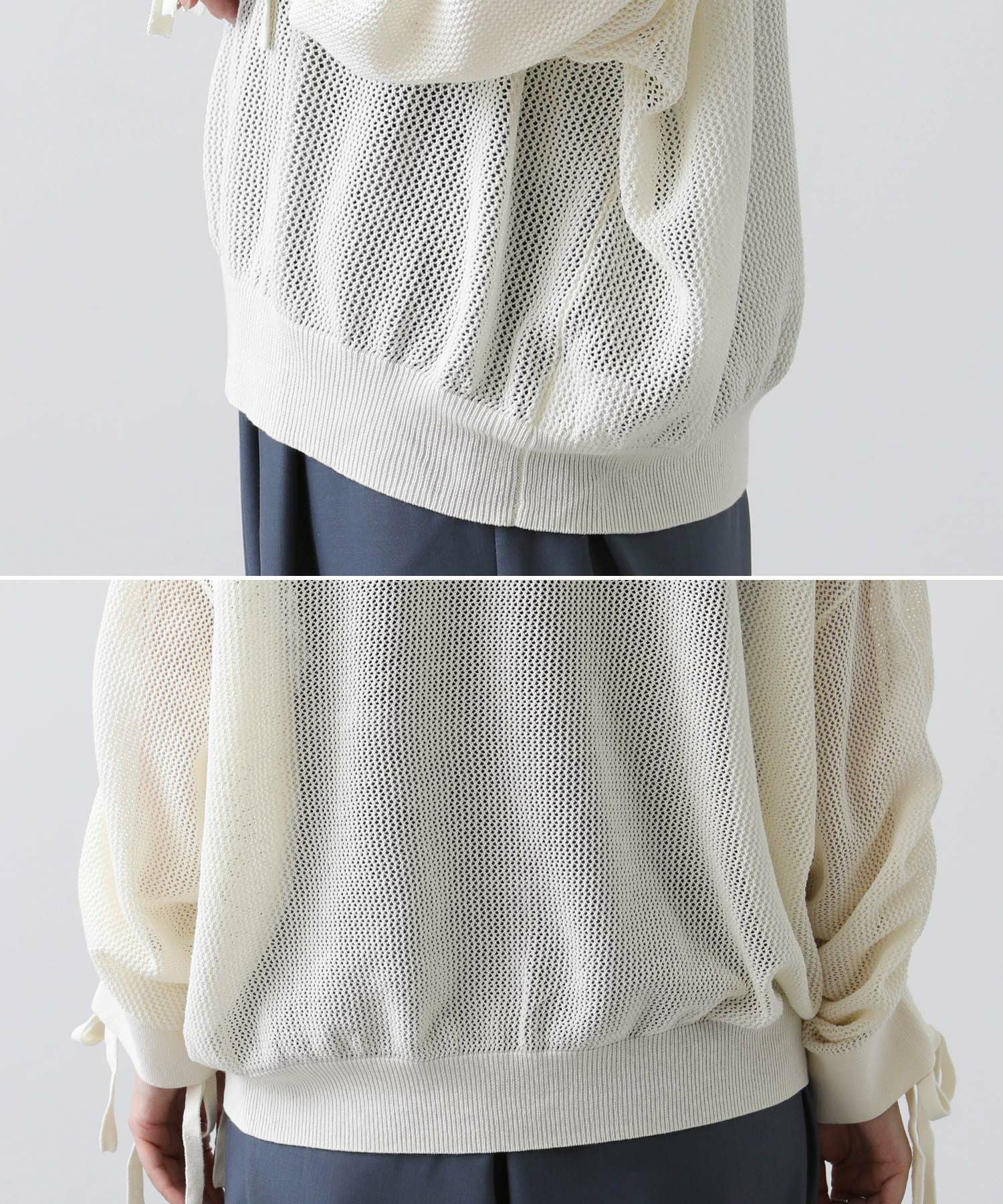 ワイドシルエットのメッシュ編みニット。