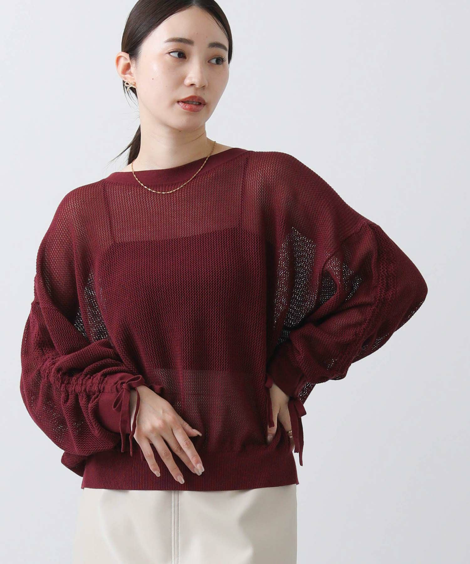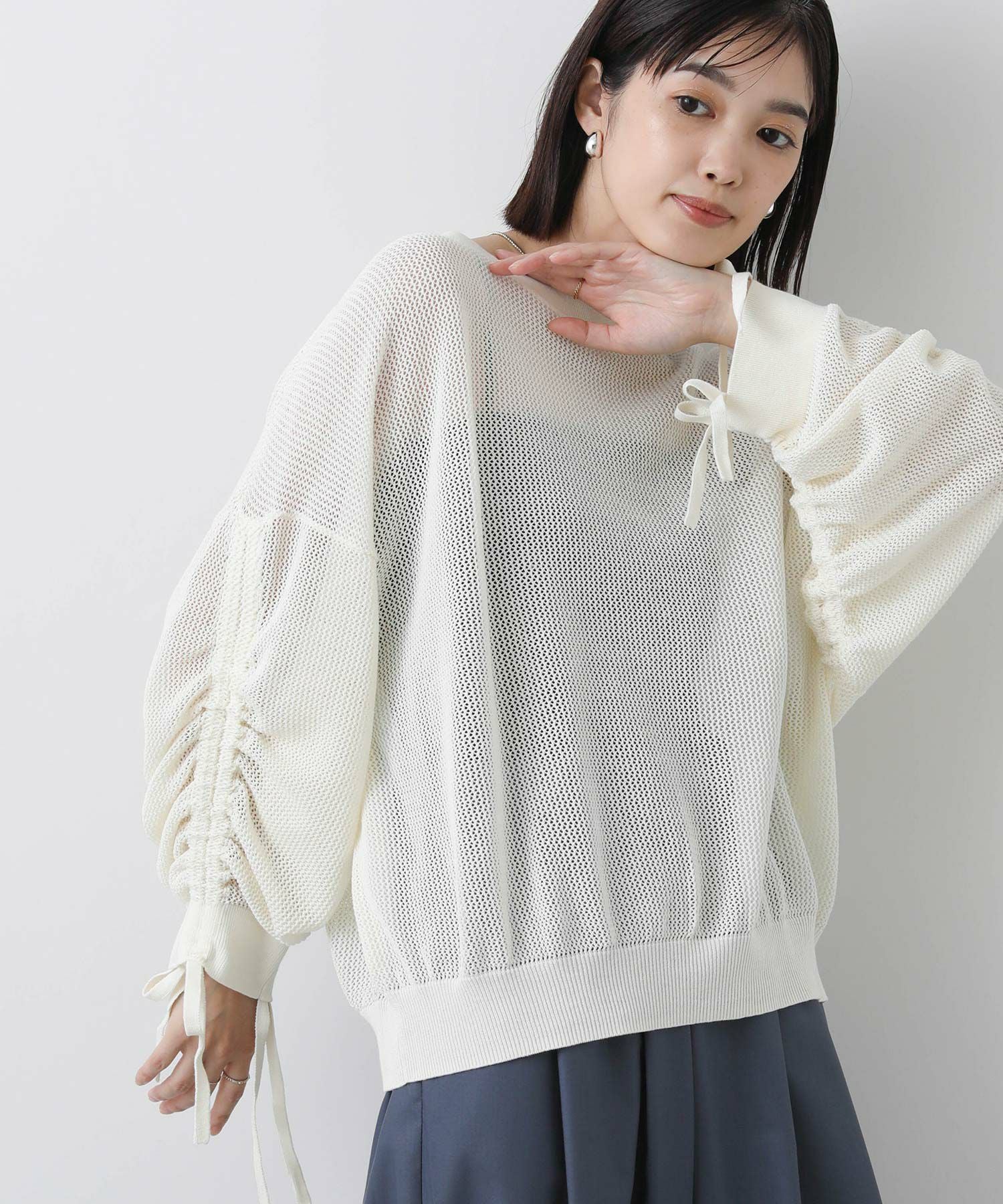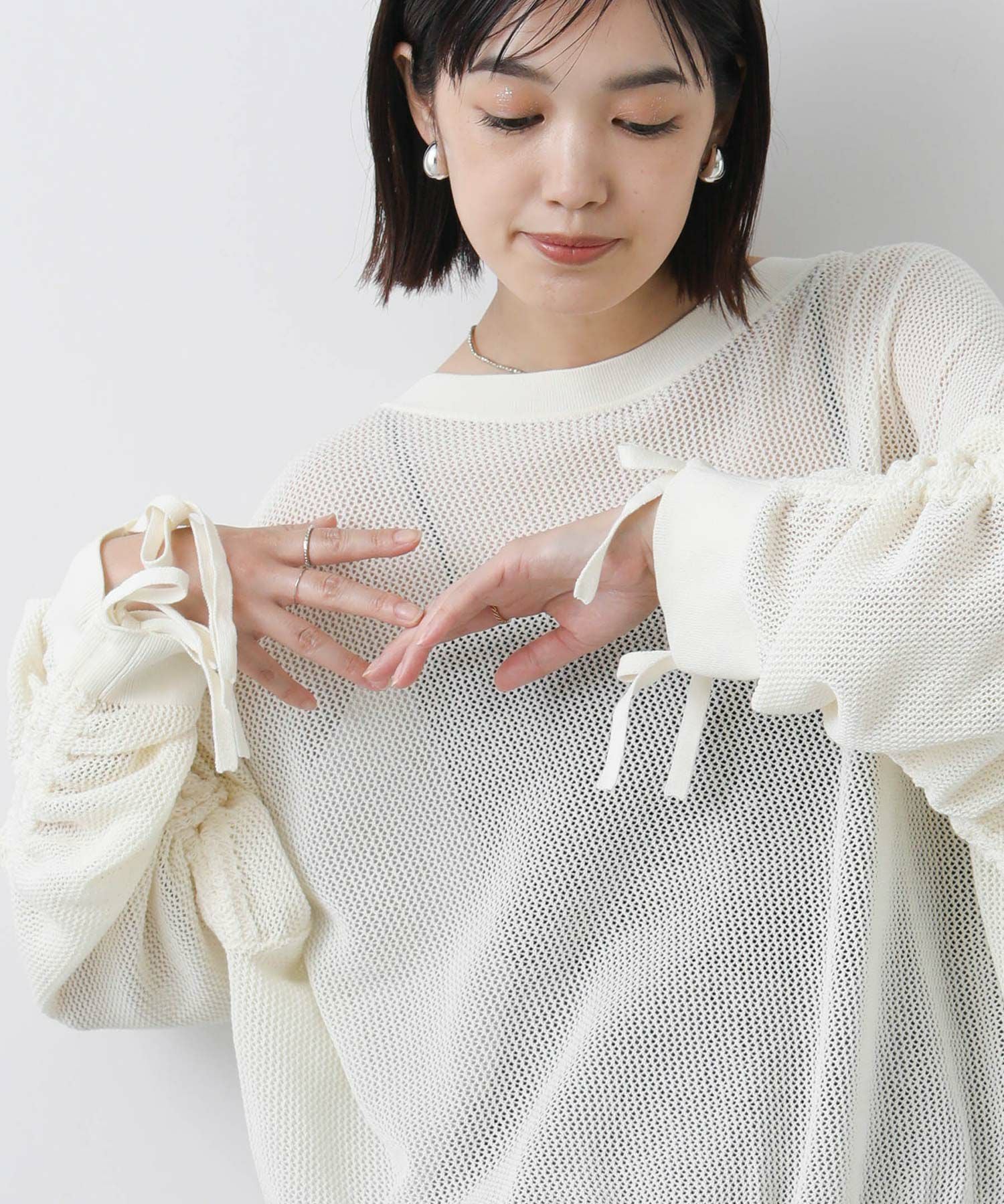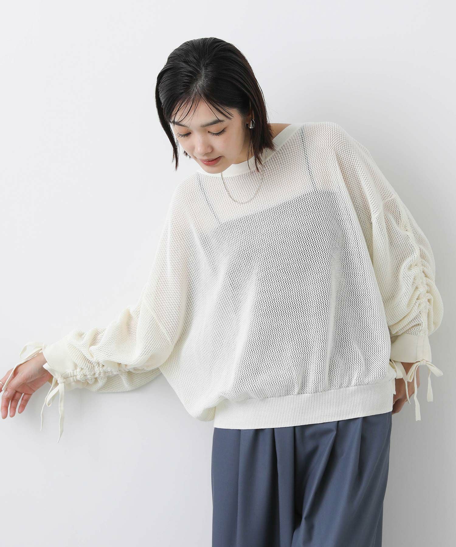 ワイドシルエットのメッシュ編みニット。